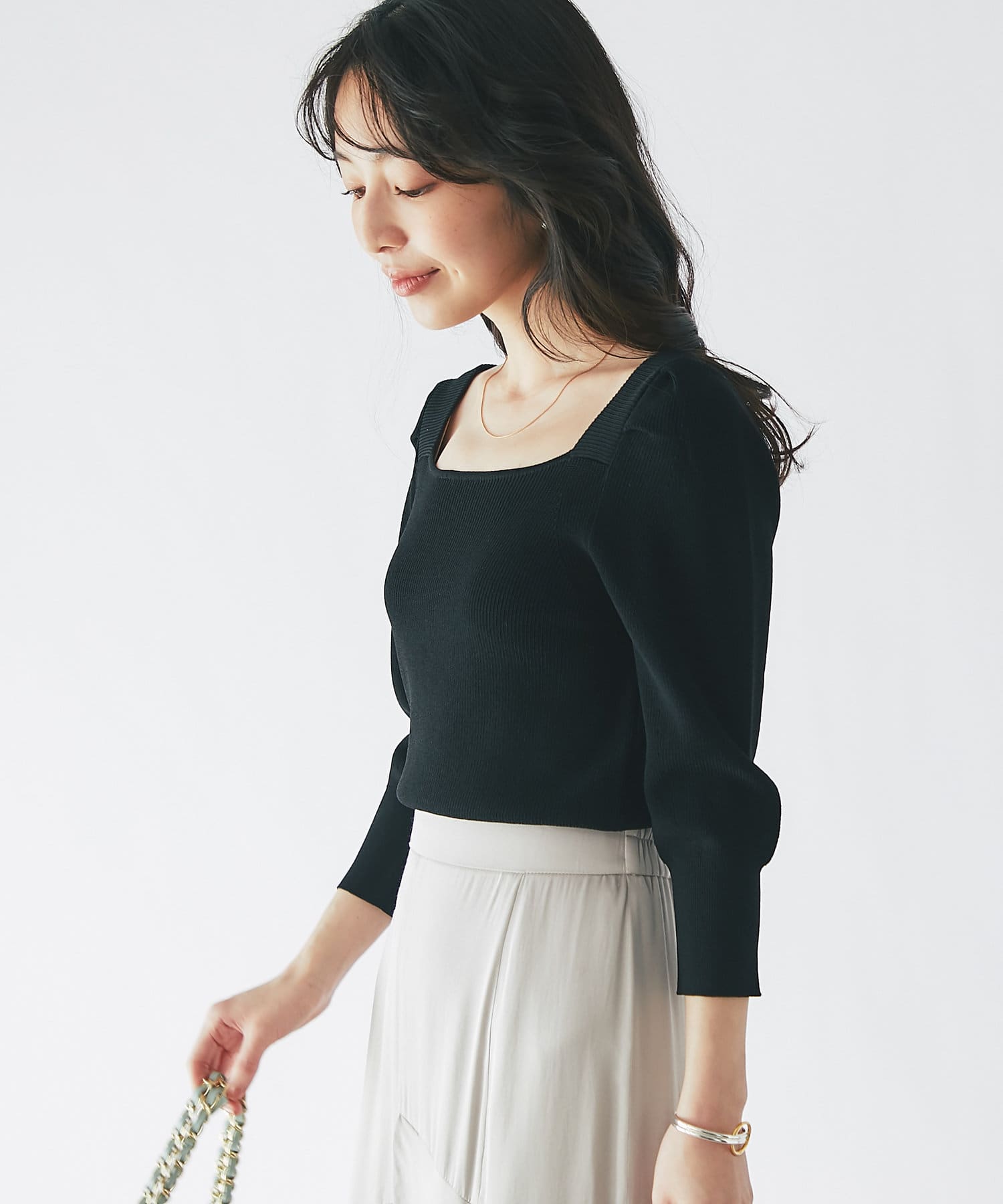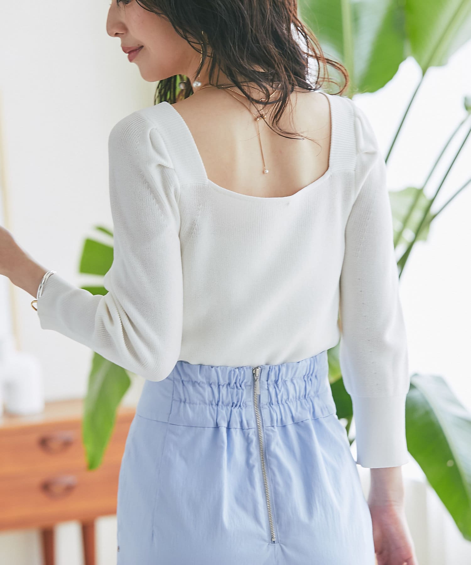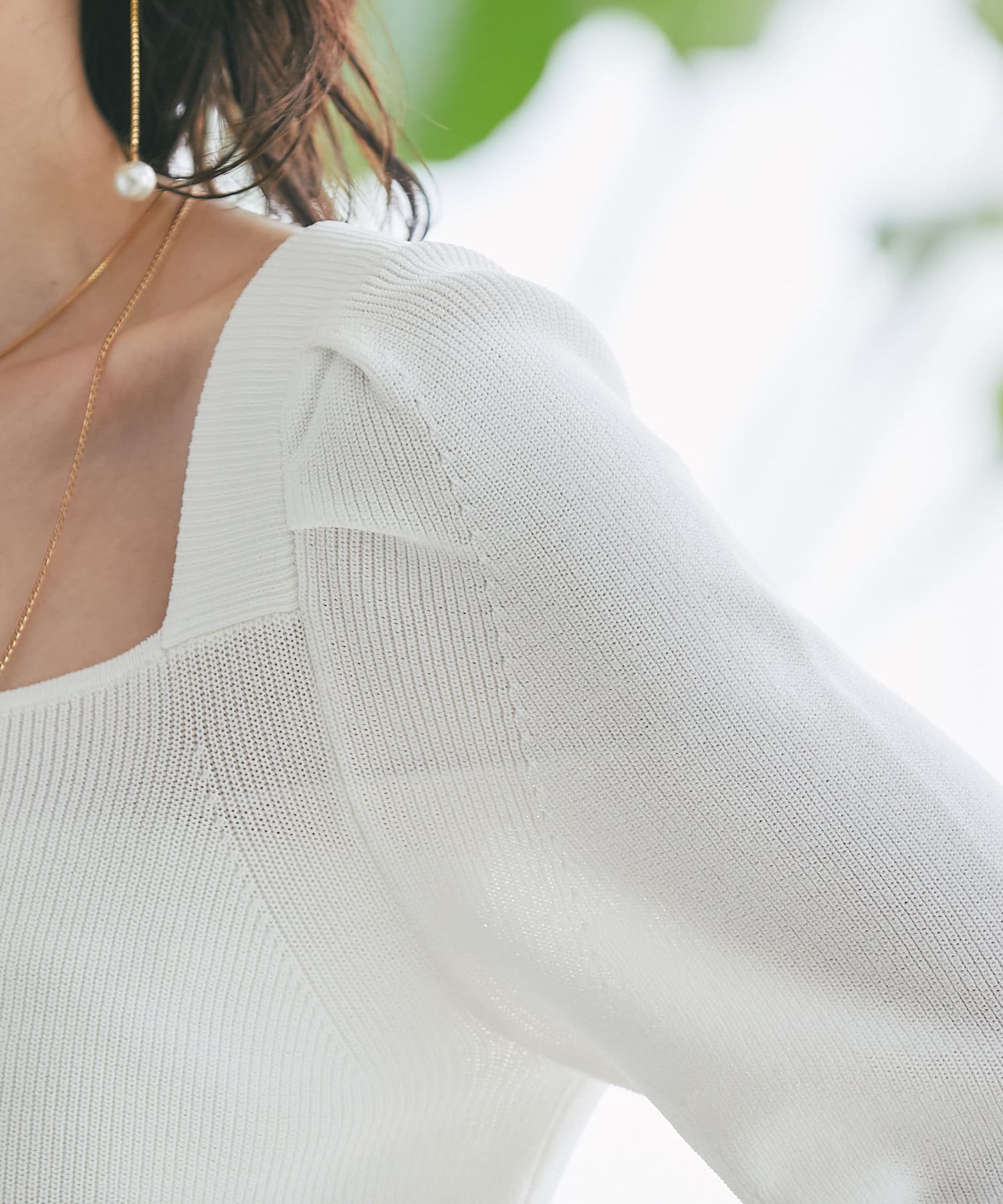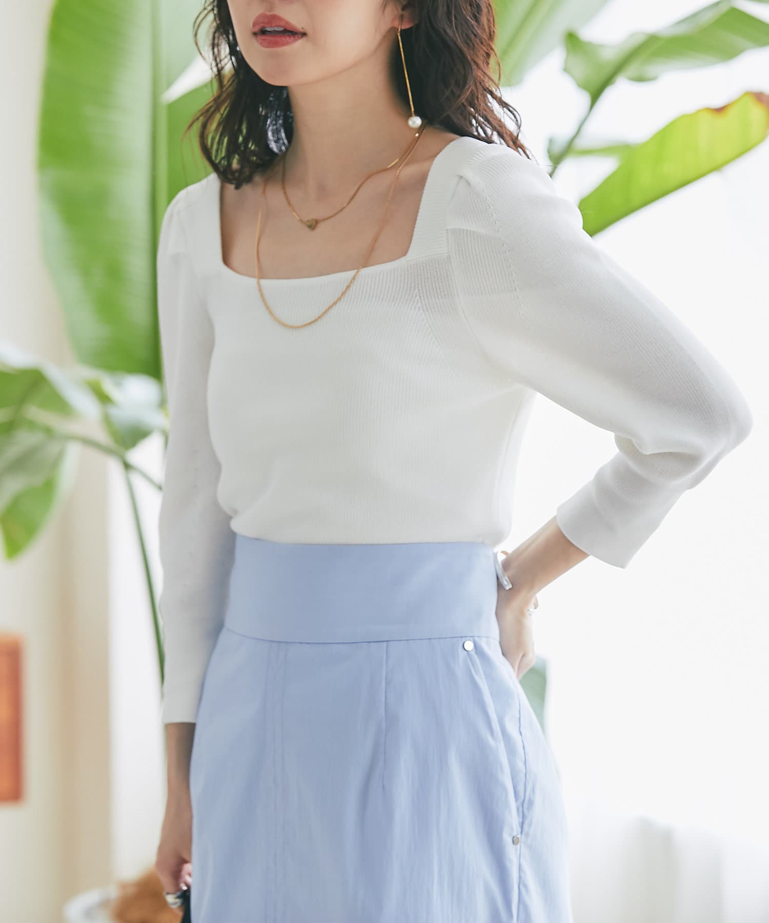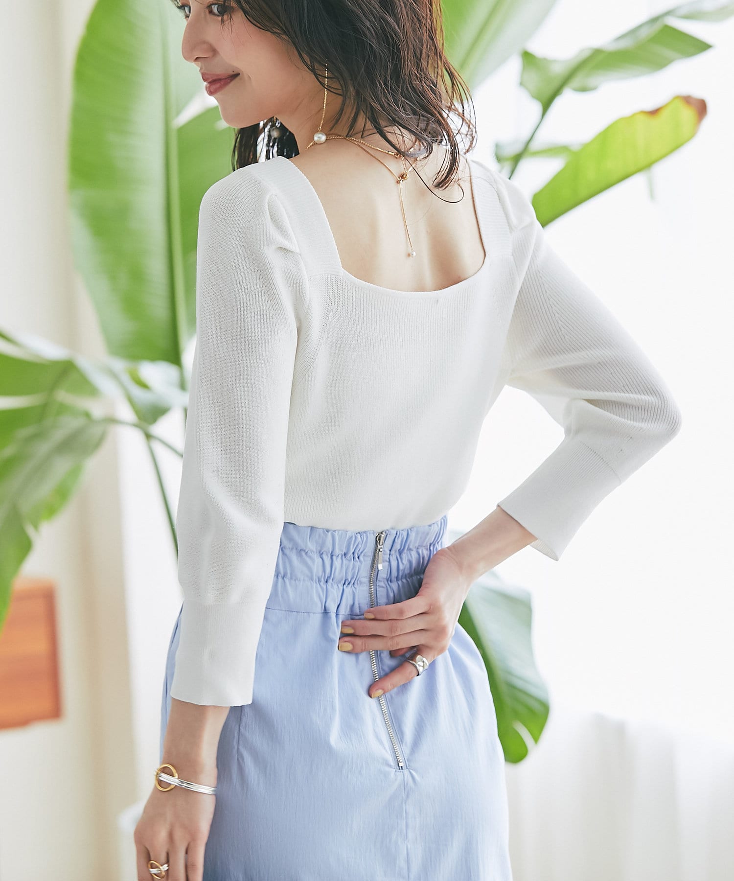 デコルテラインをきれいに見せるスクエアネックのニットです。