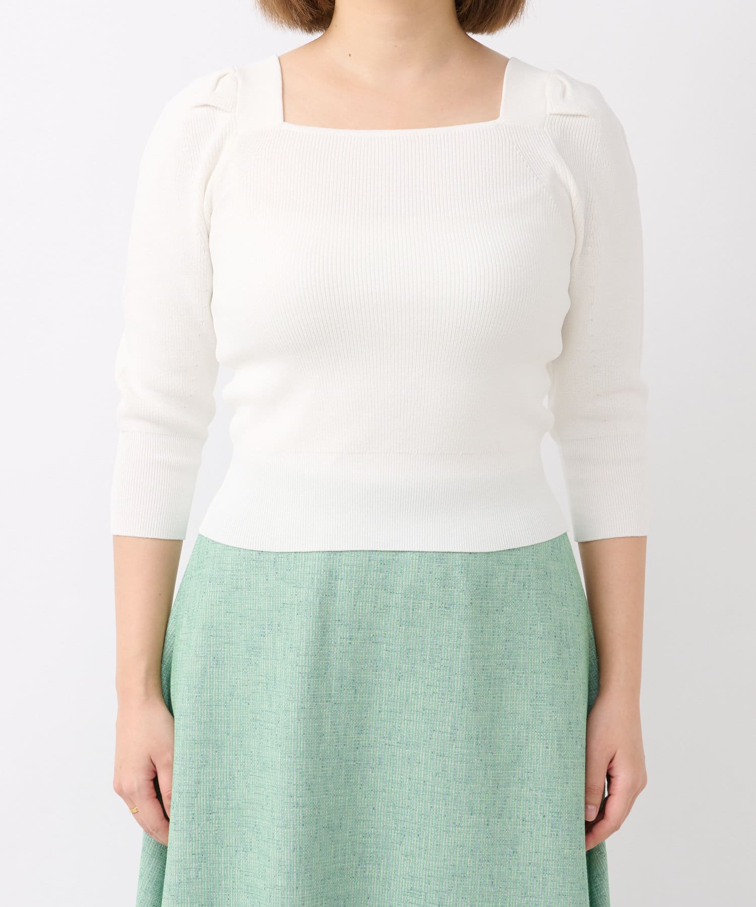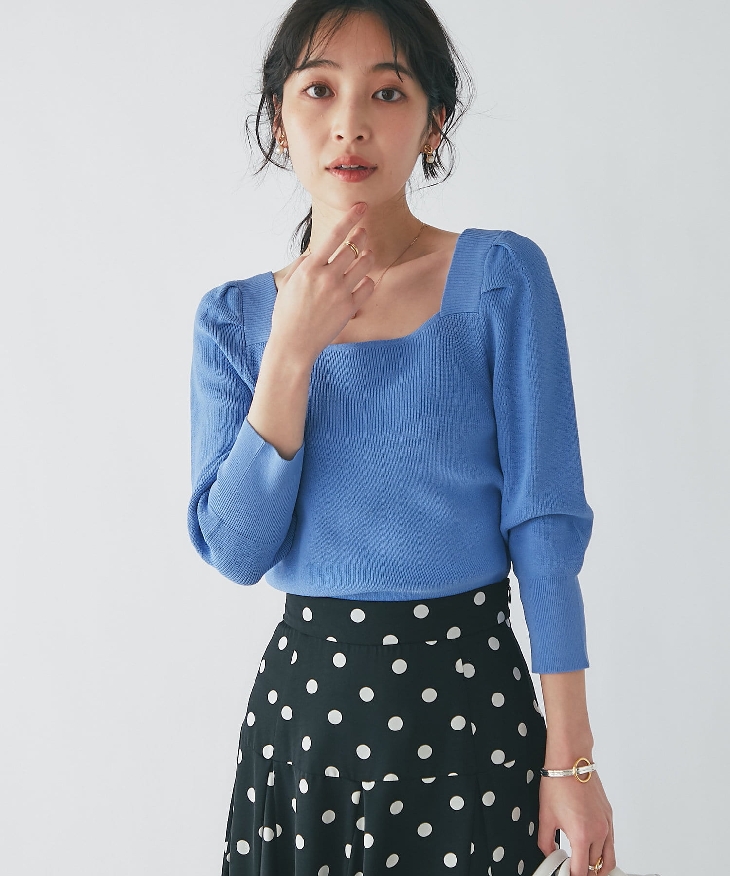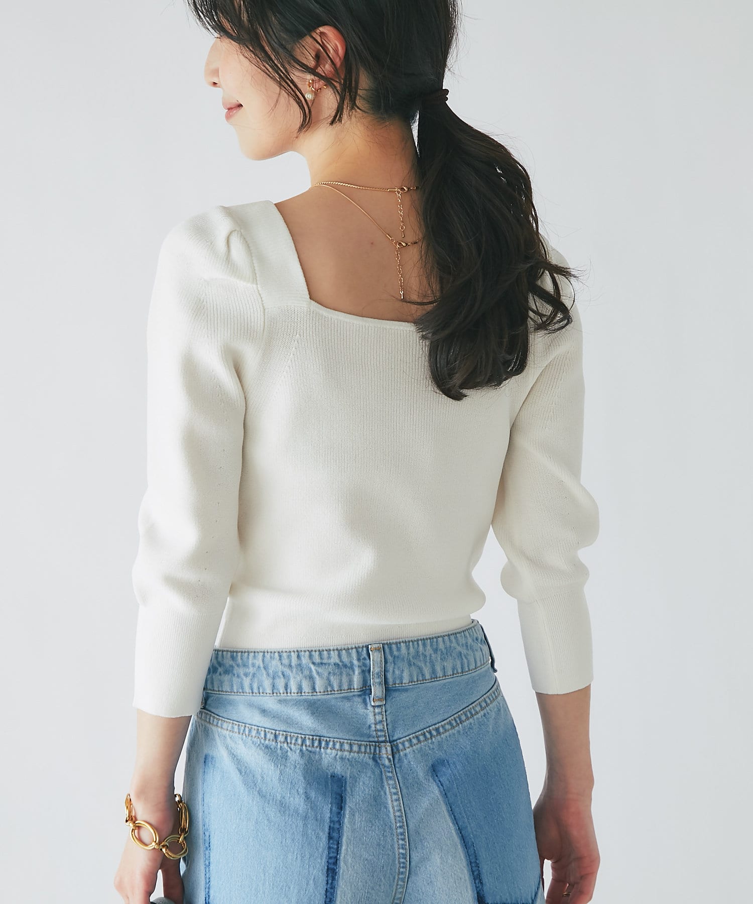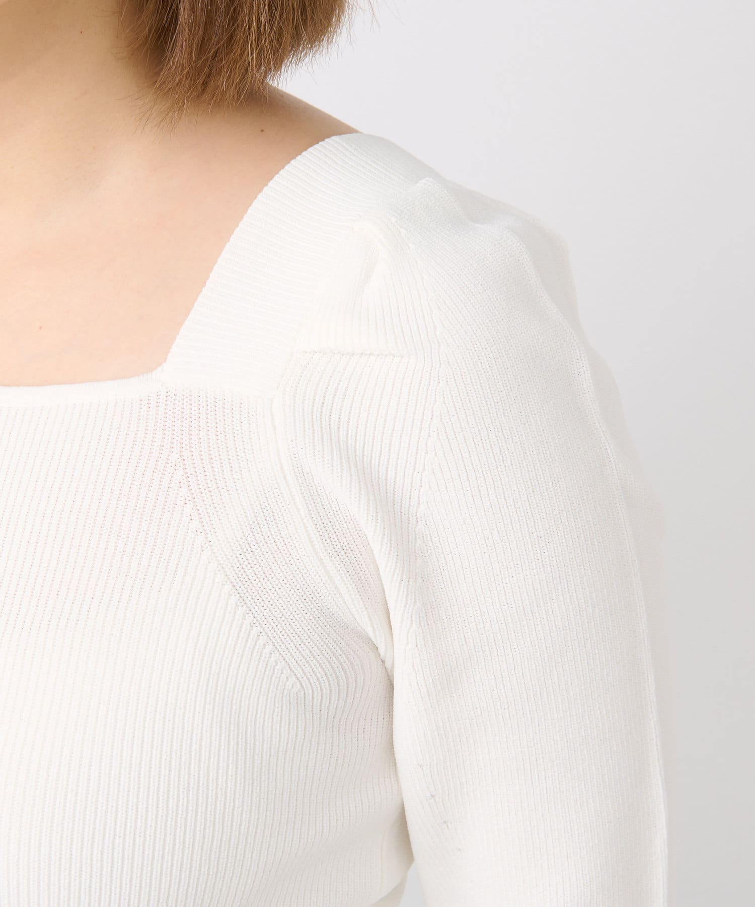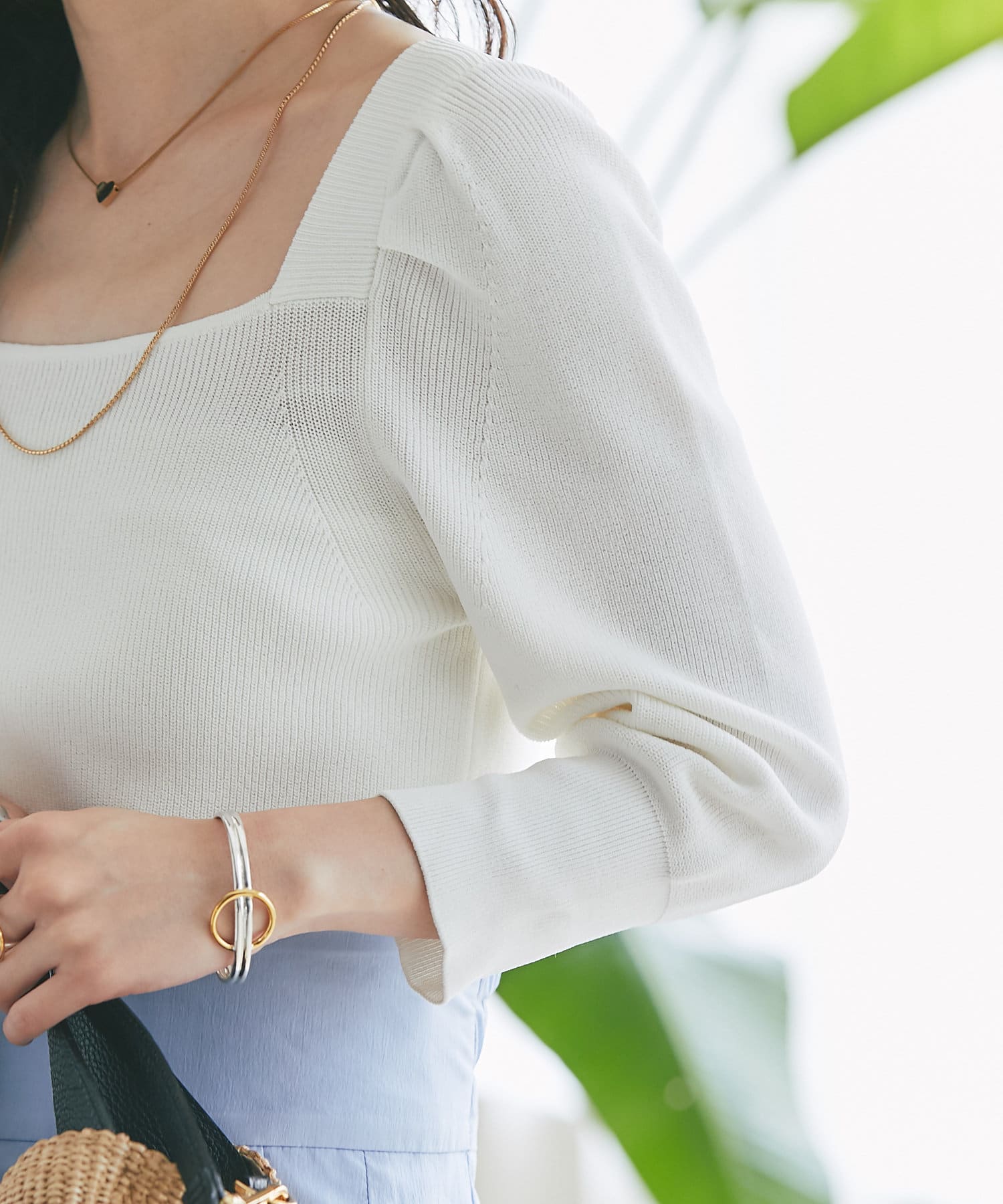 デコルテラインをきれいに見せるスクエアネックのニットです。