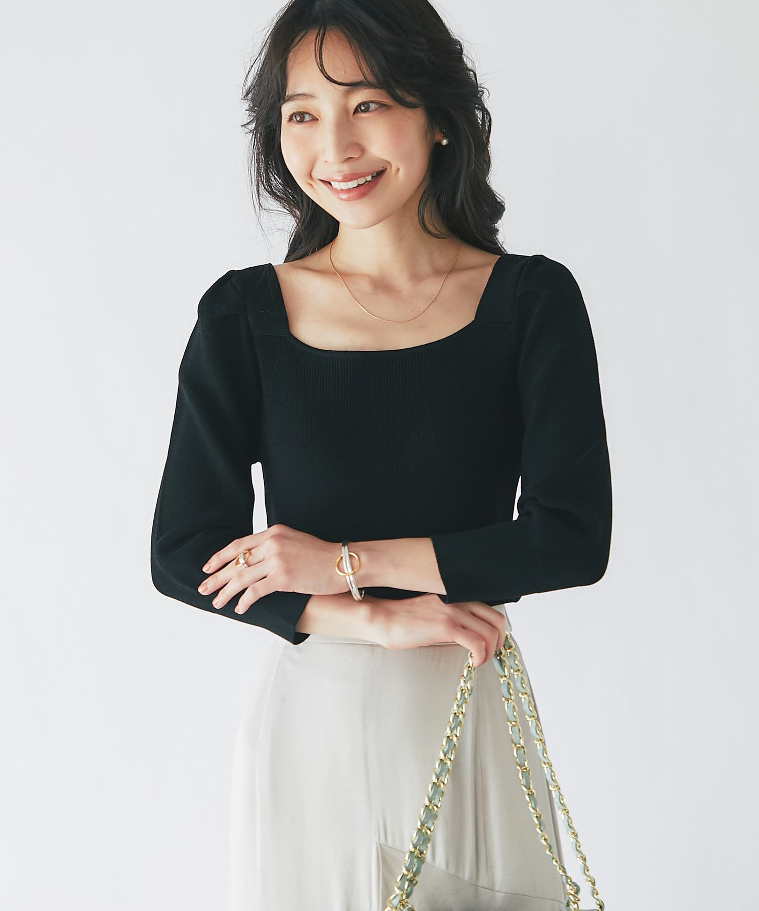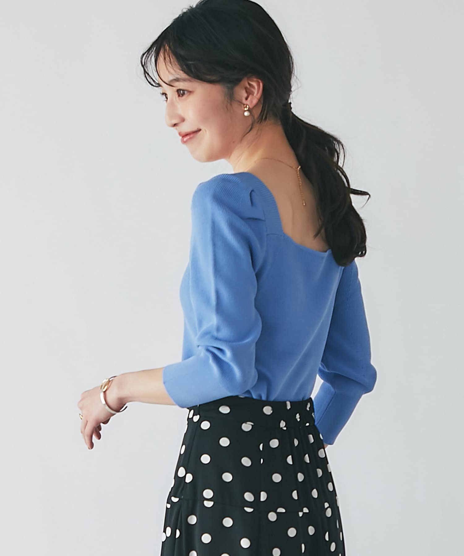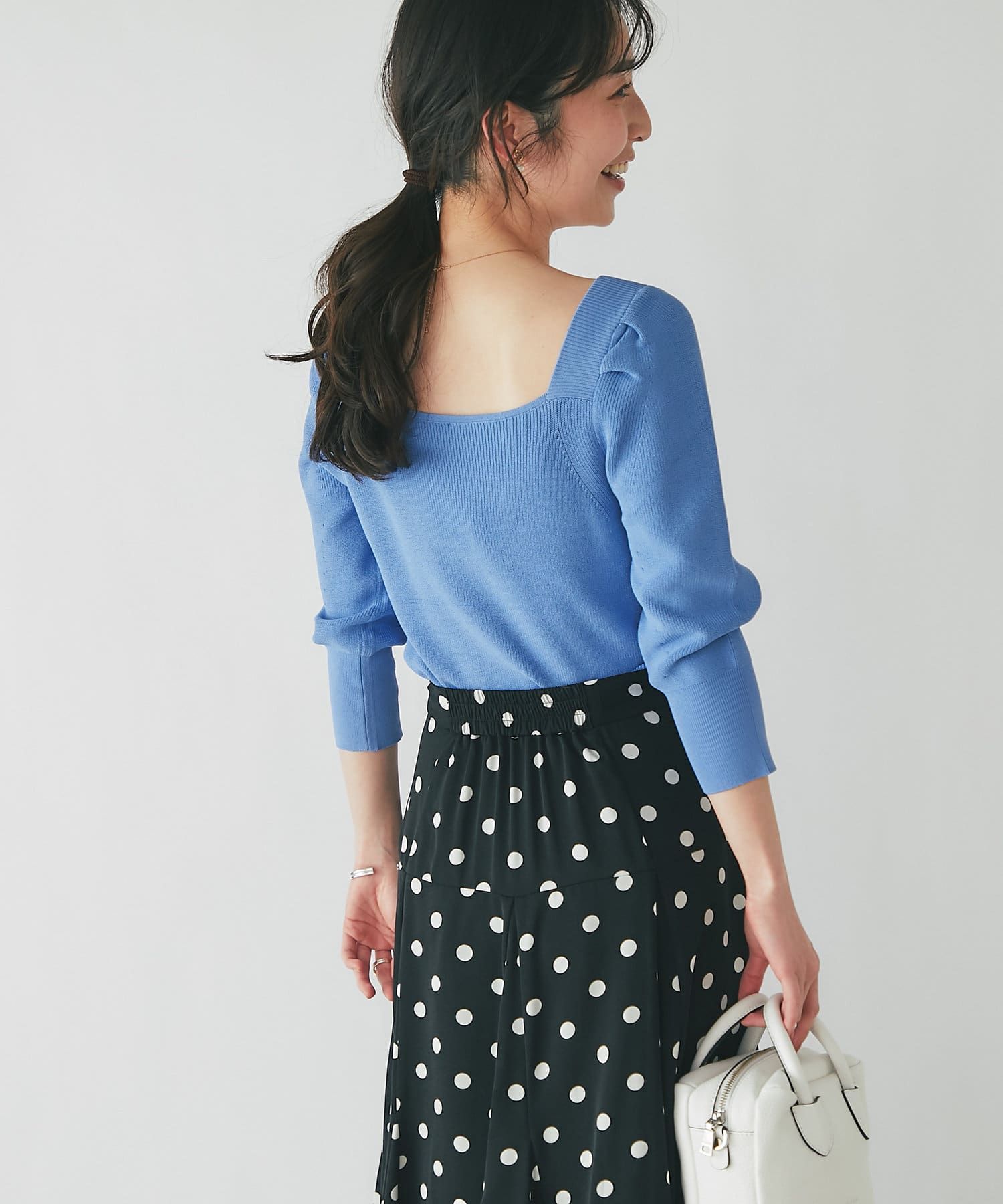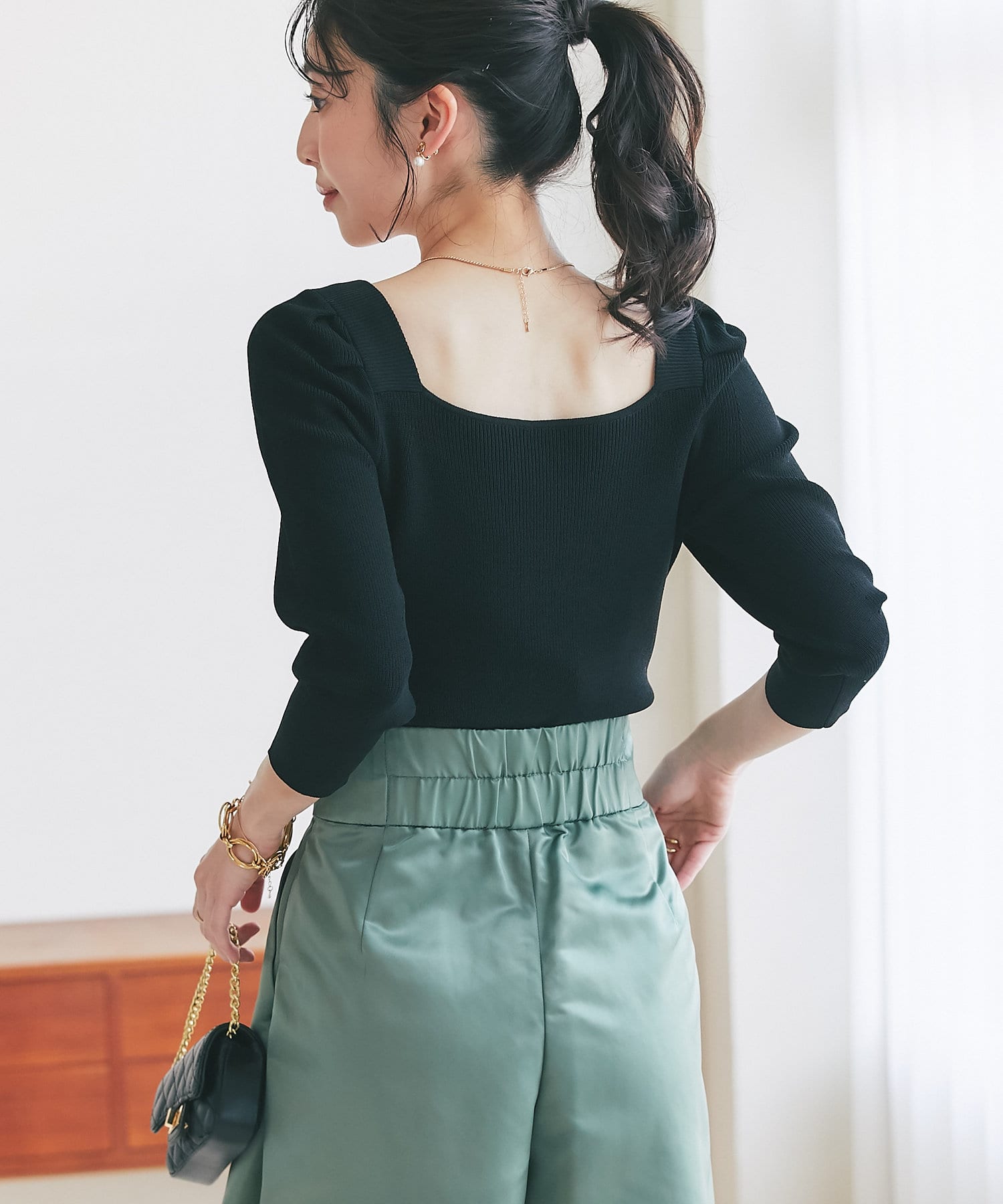 デコルテラインをきれいに見せるスクエアネックのニットです。