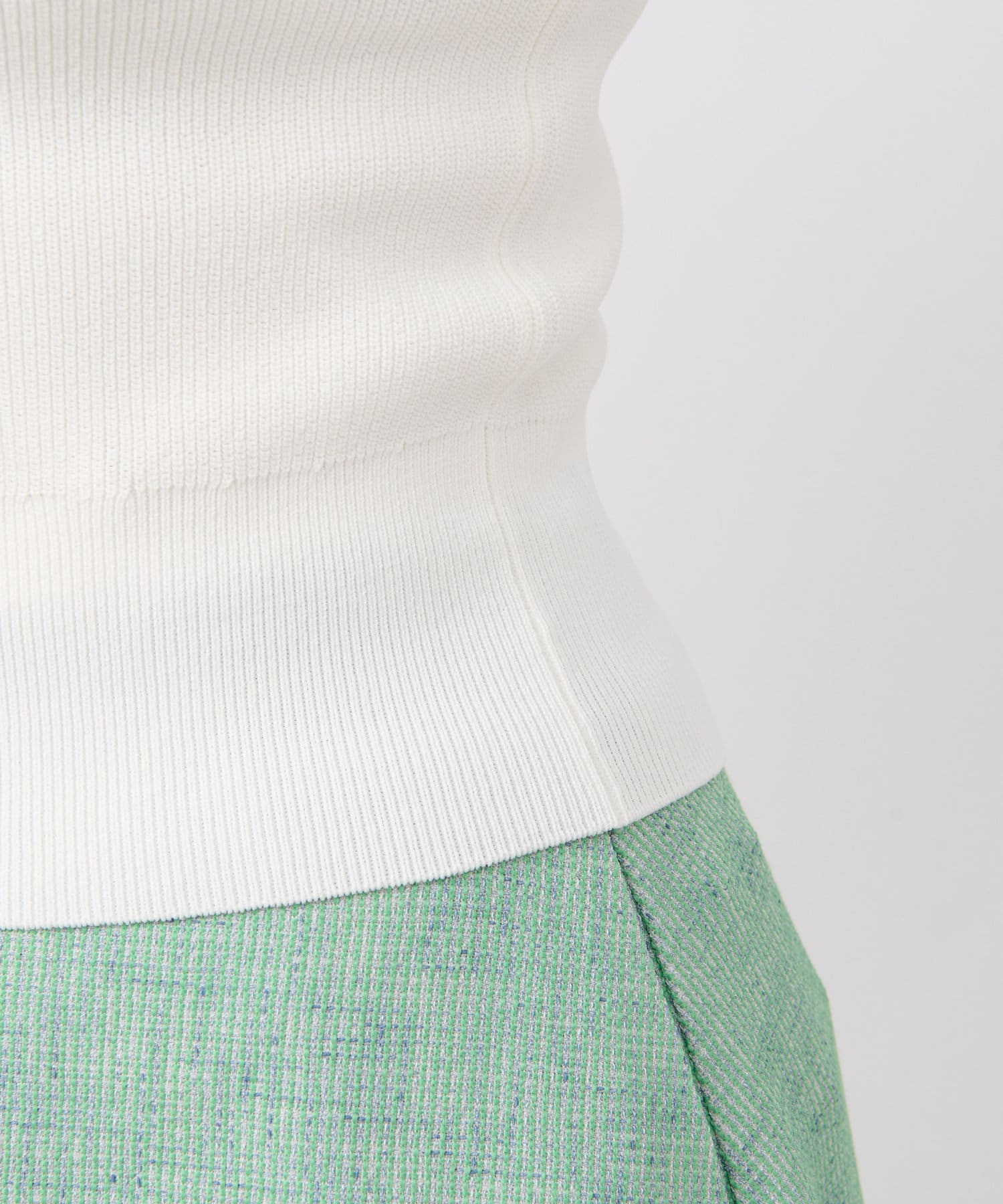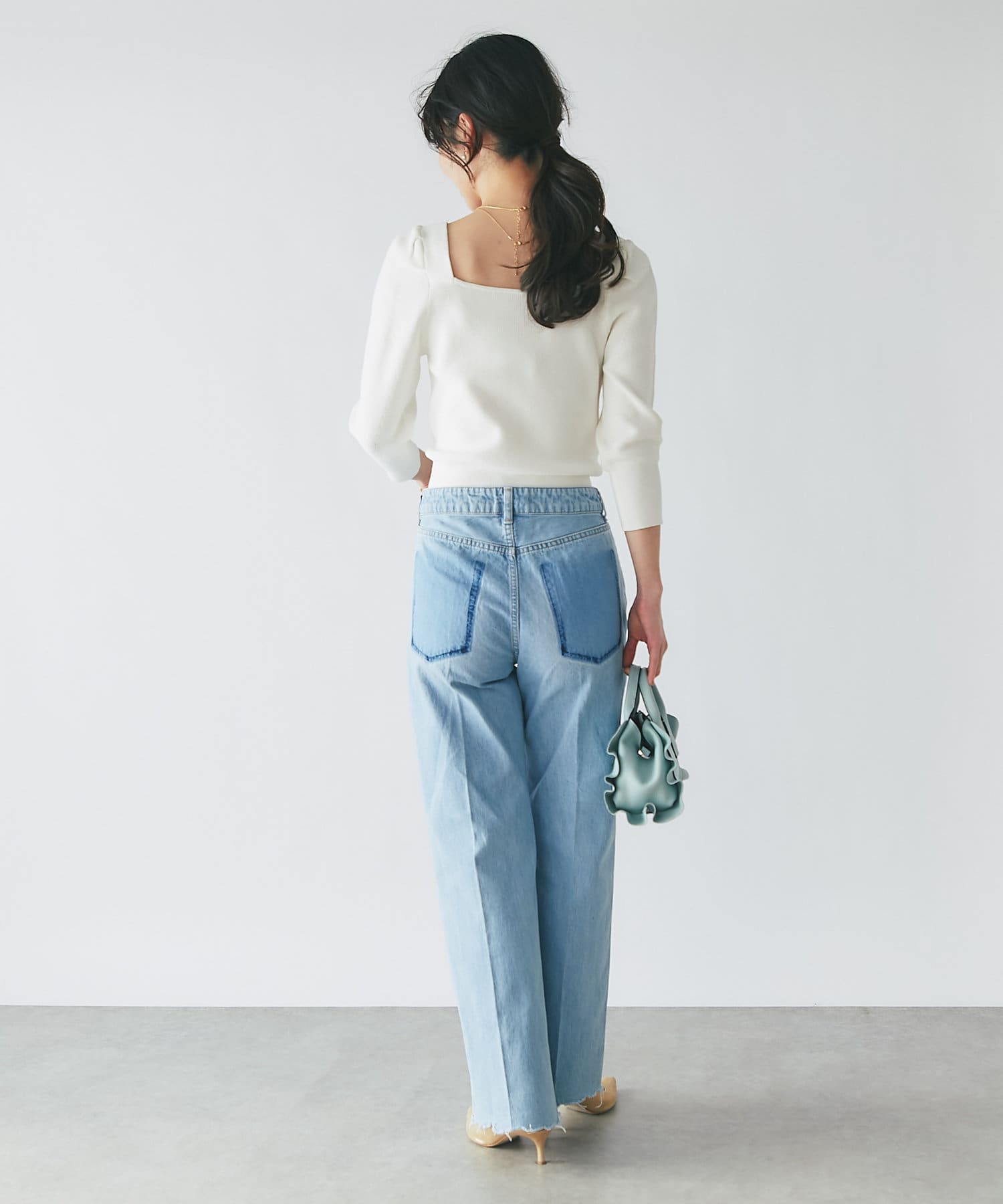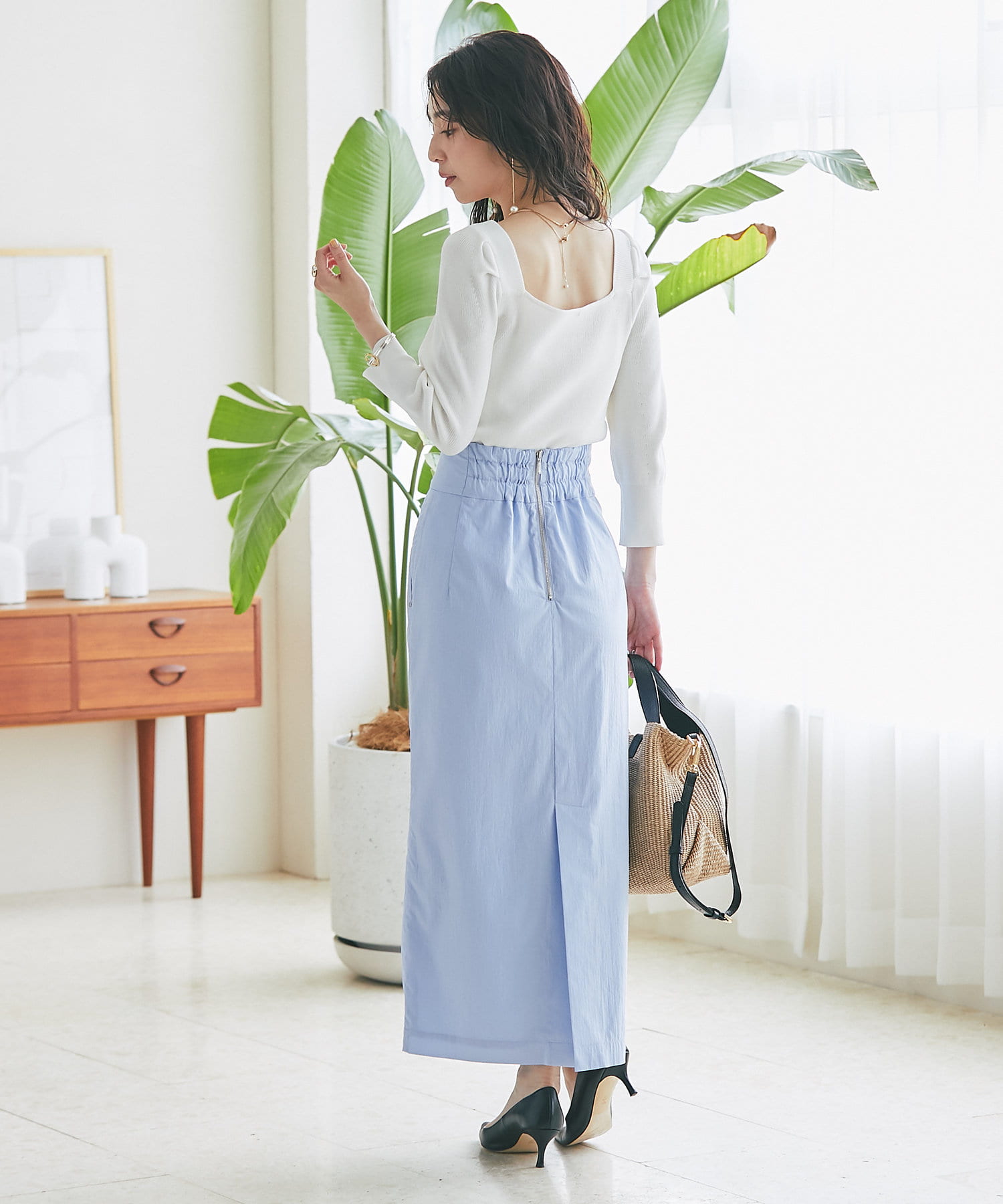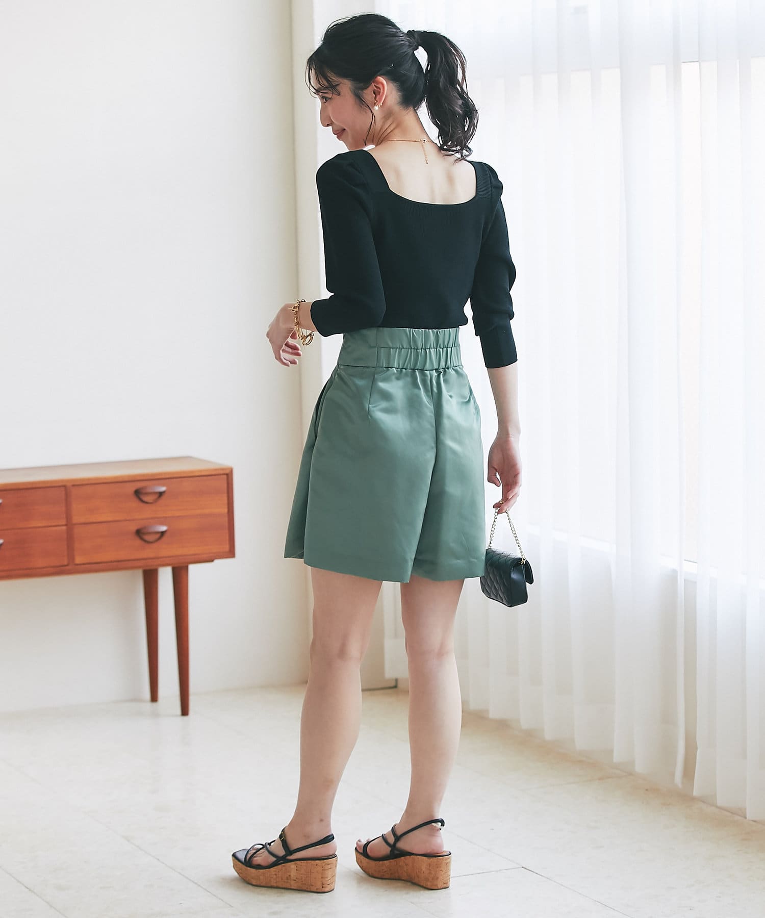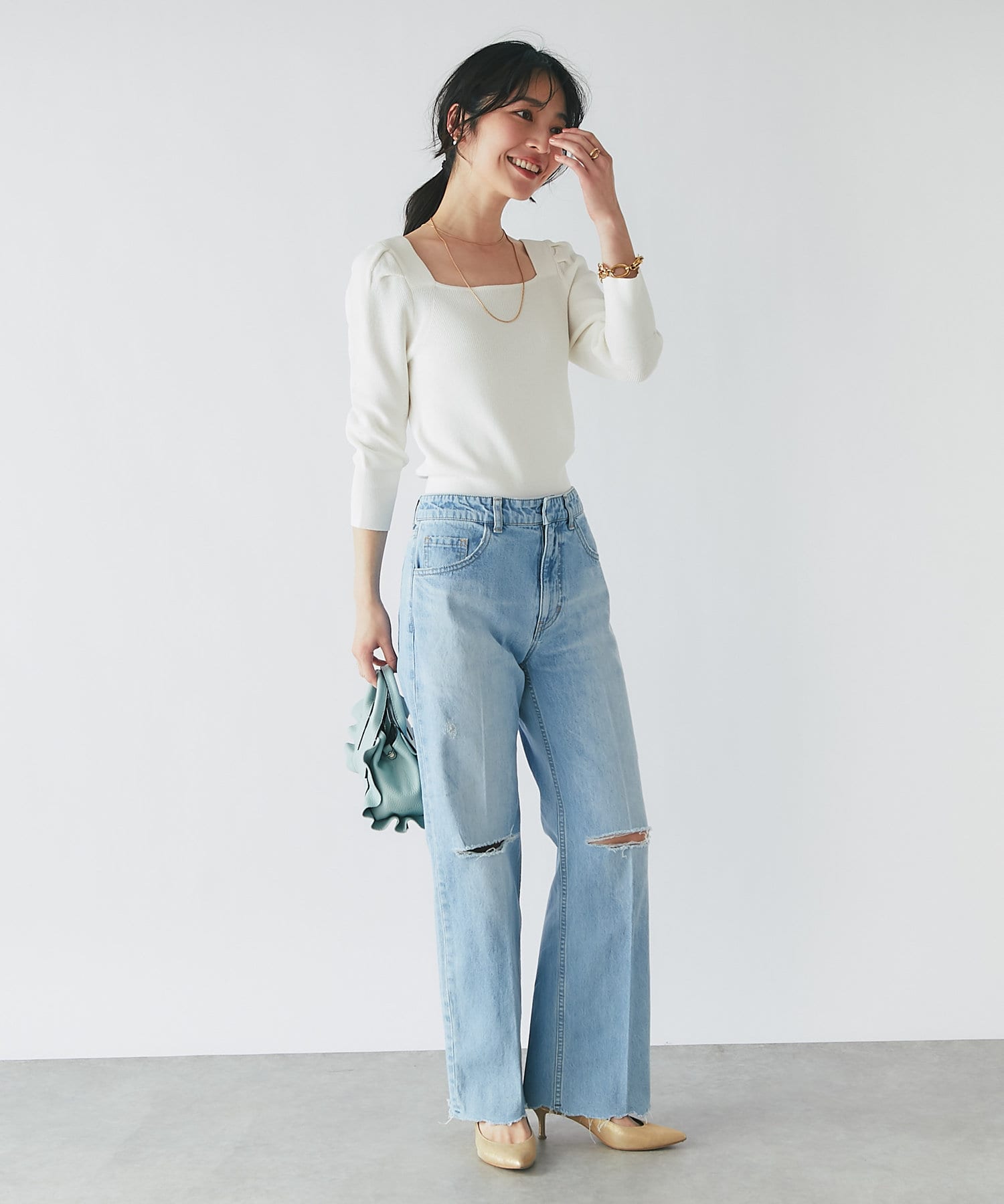 デコルテラインをきれいに見せるスクエアネックのニットです。