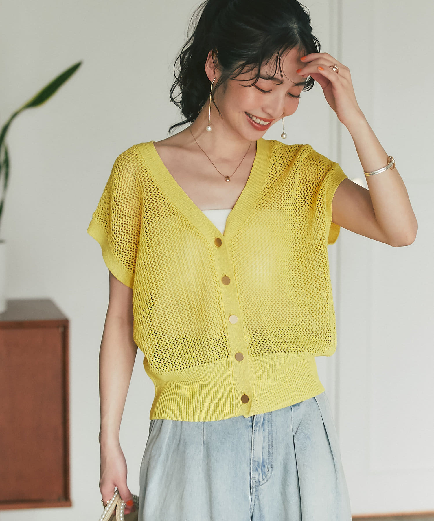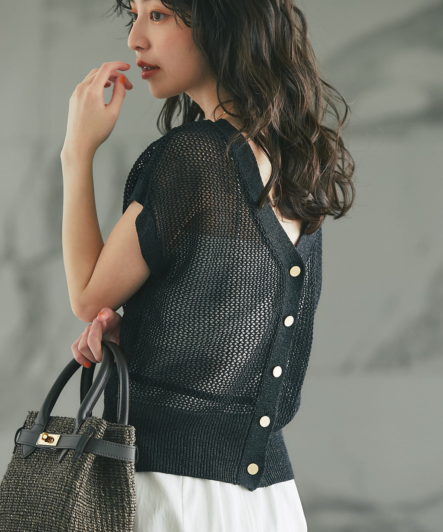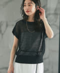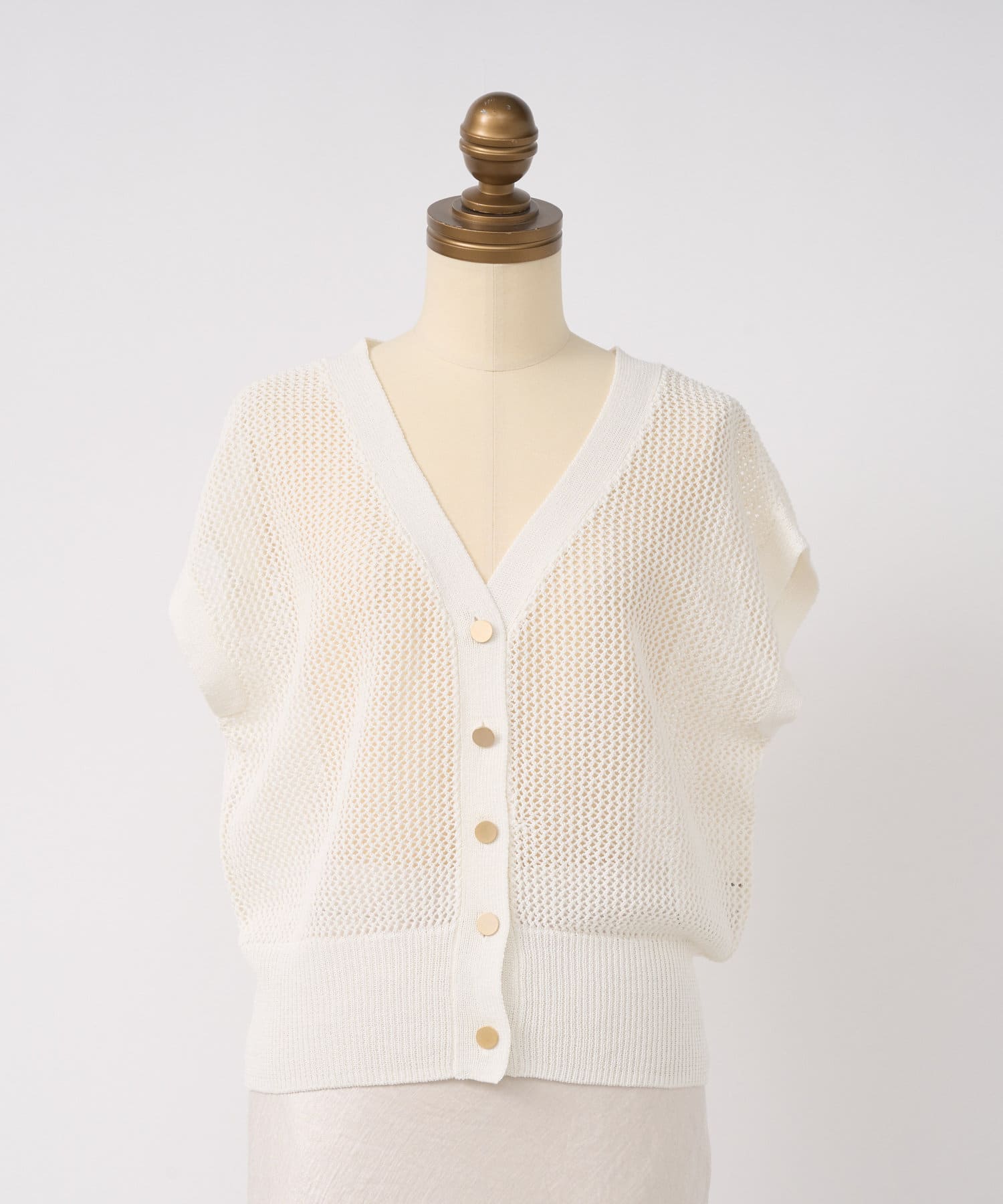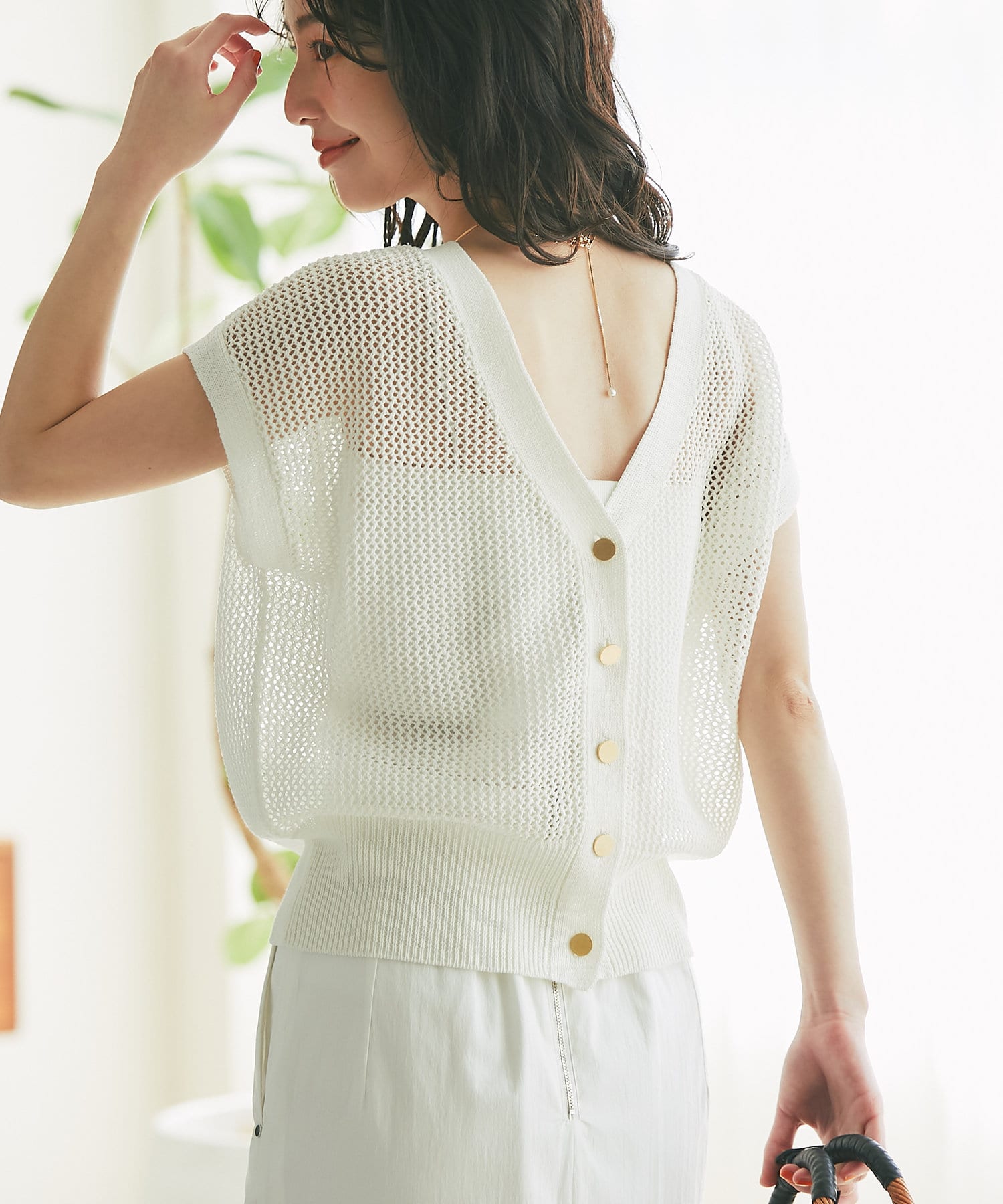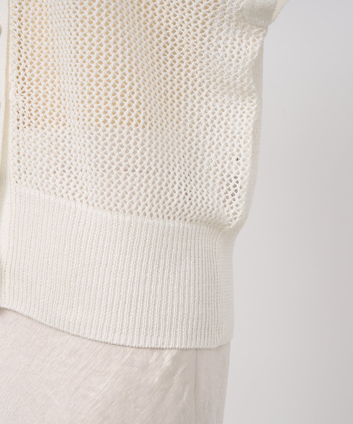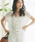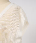 旬のこなれ感のあるメッシュ編みのベスト型カーディガン。