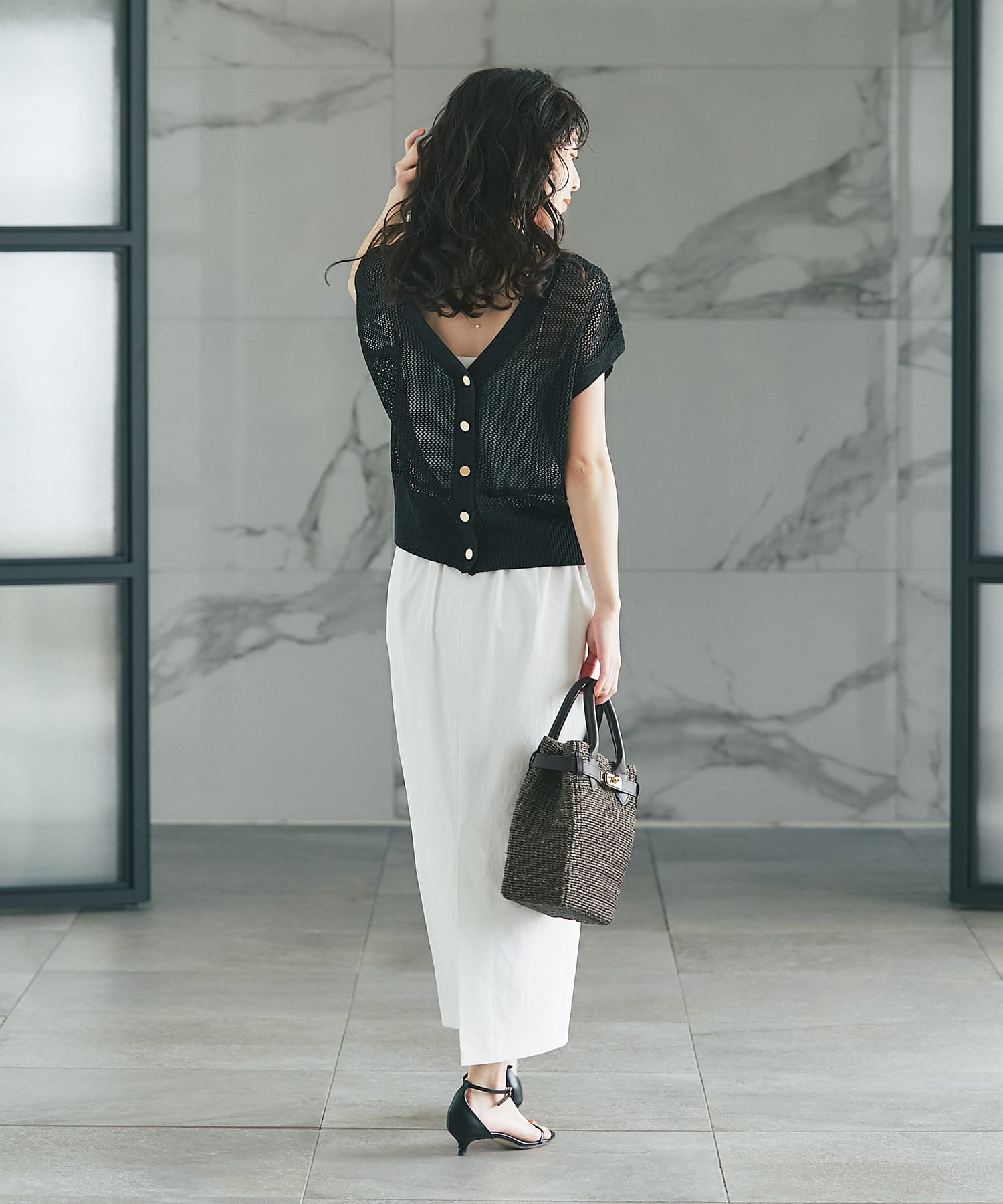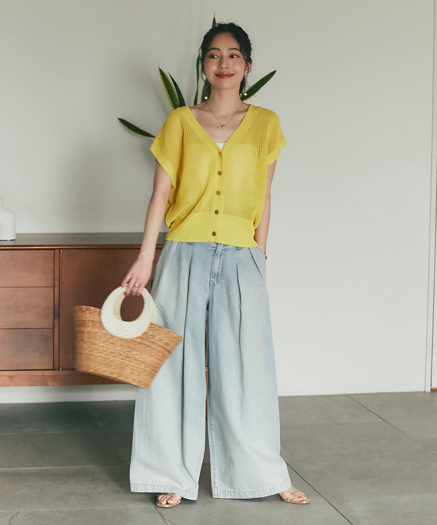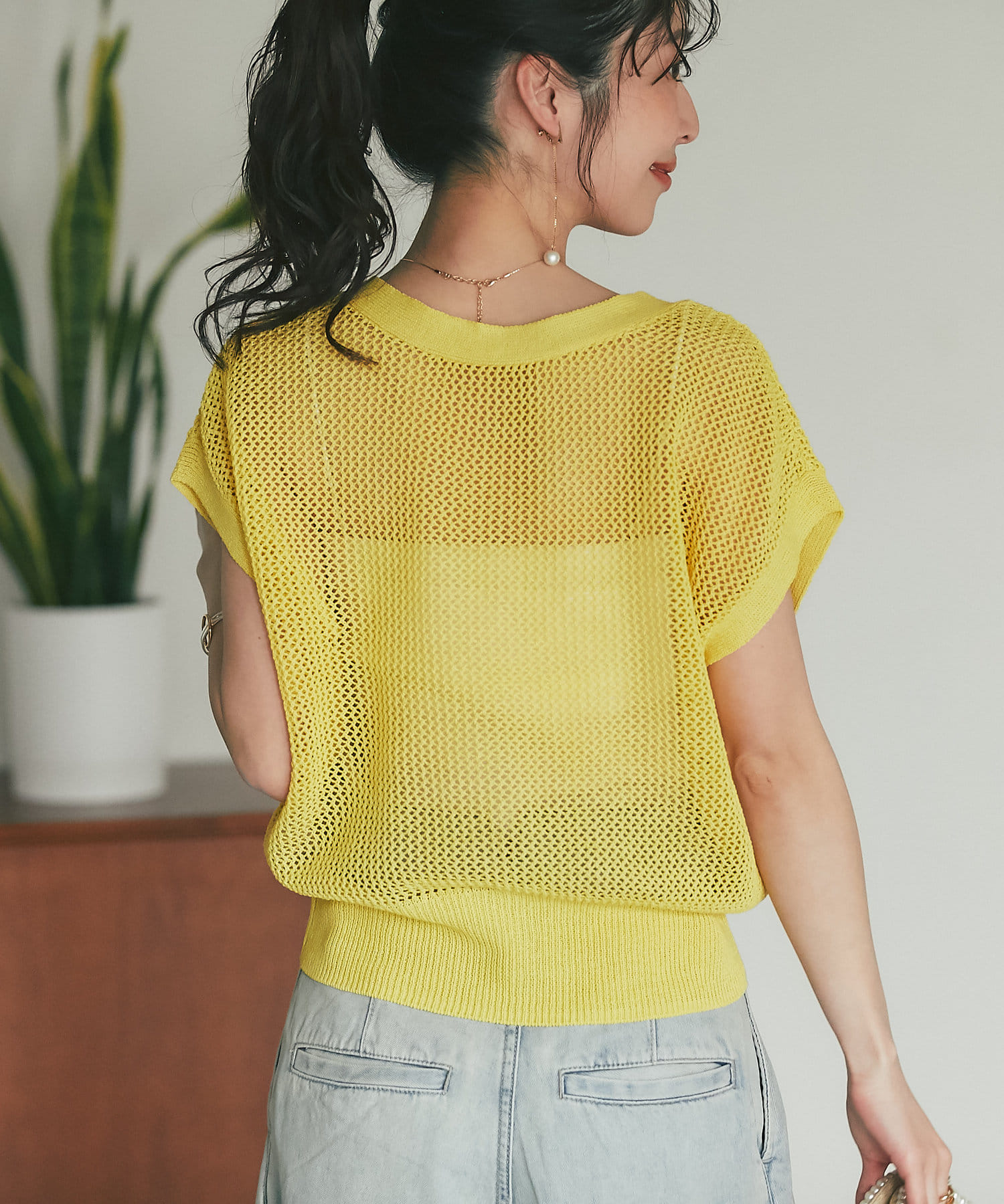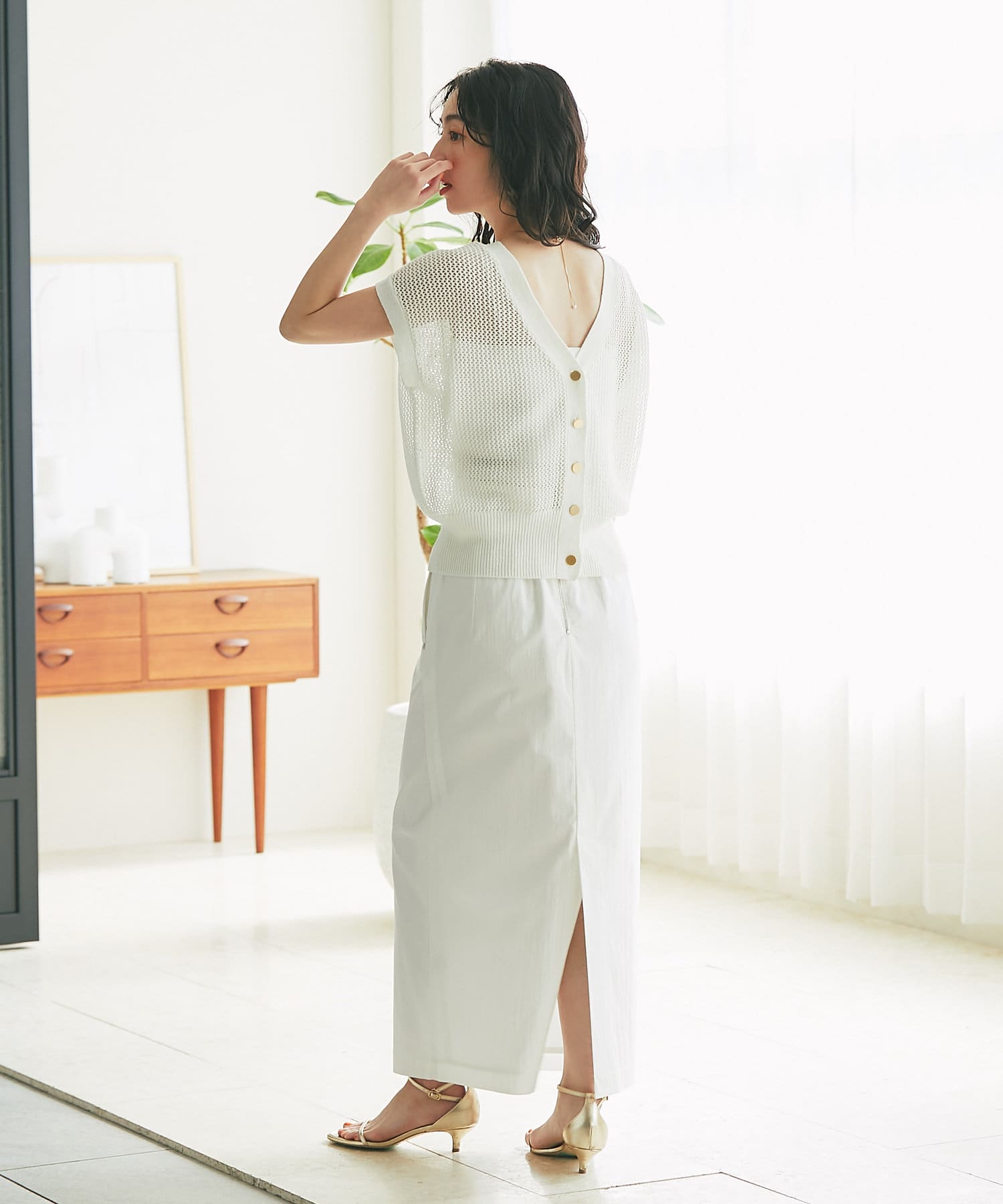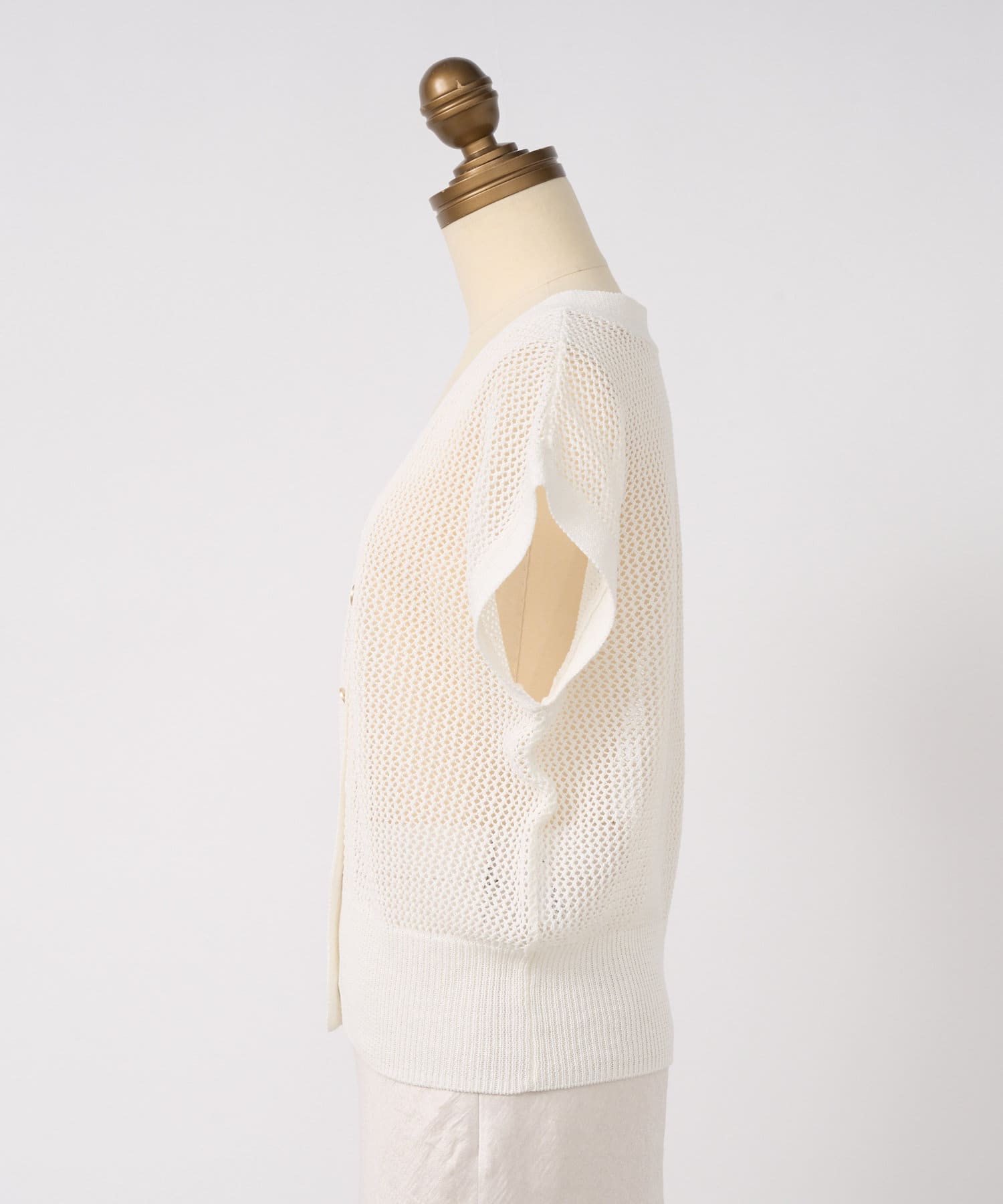 旬のこなれ感のあるメッシュ編みのベスト型カーディガン。
