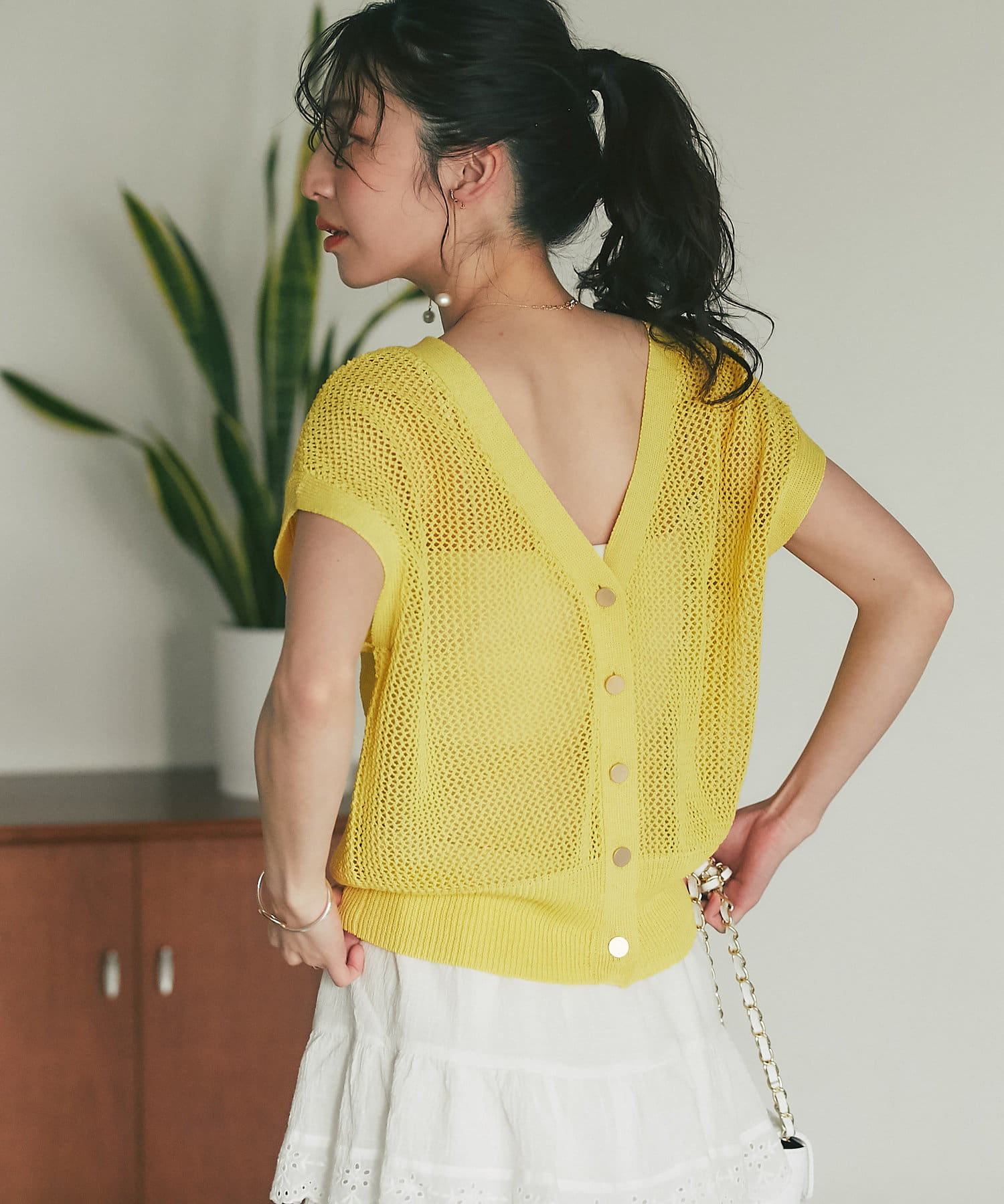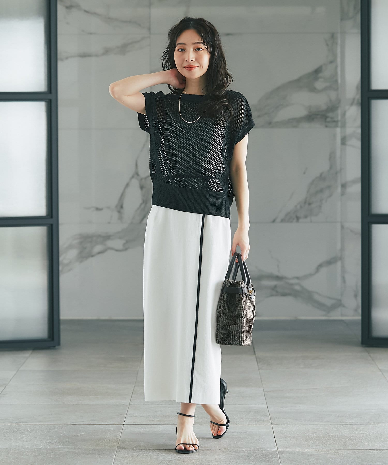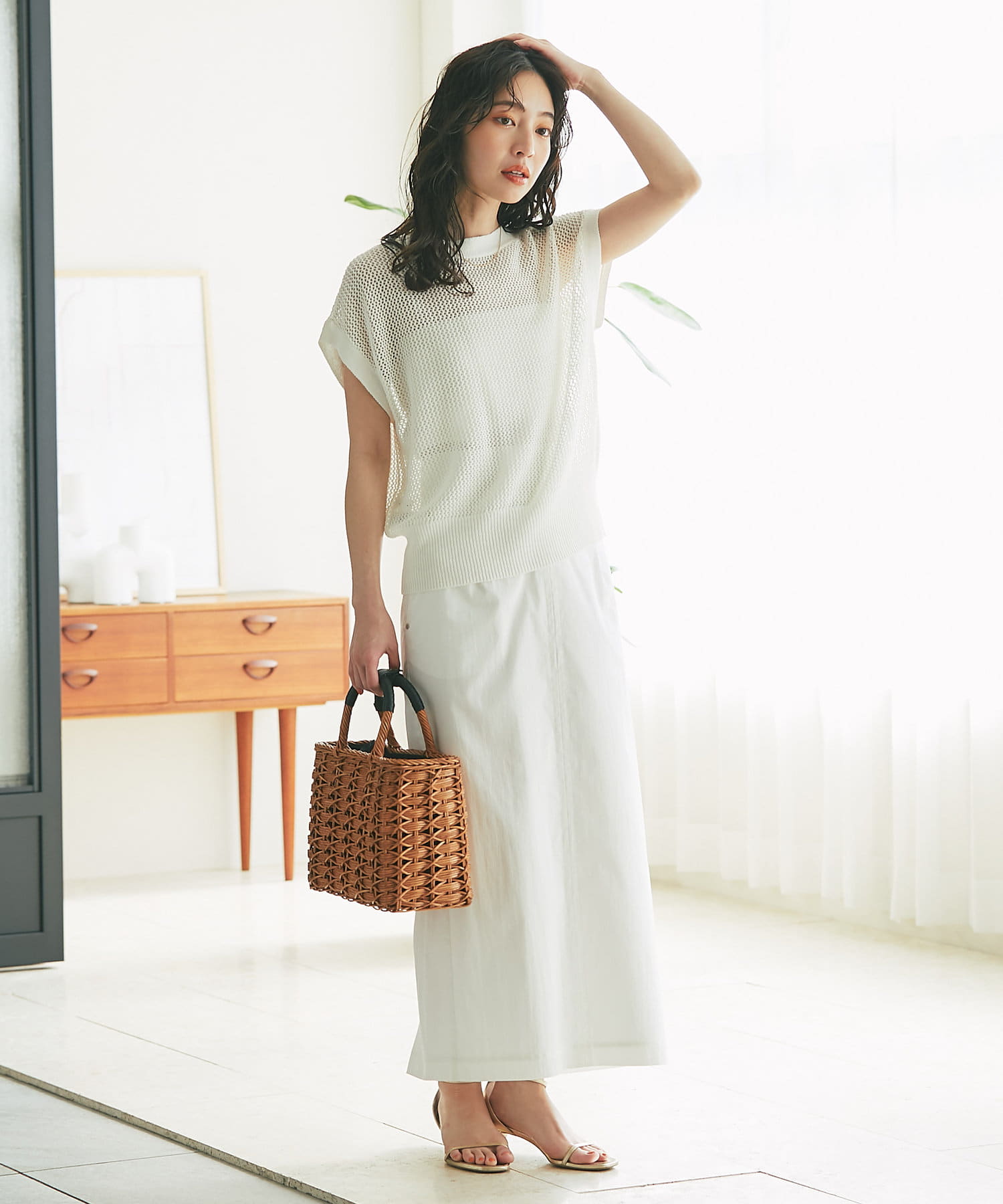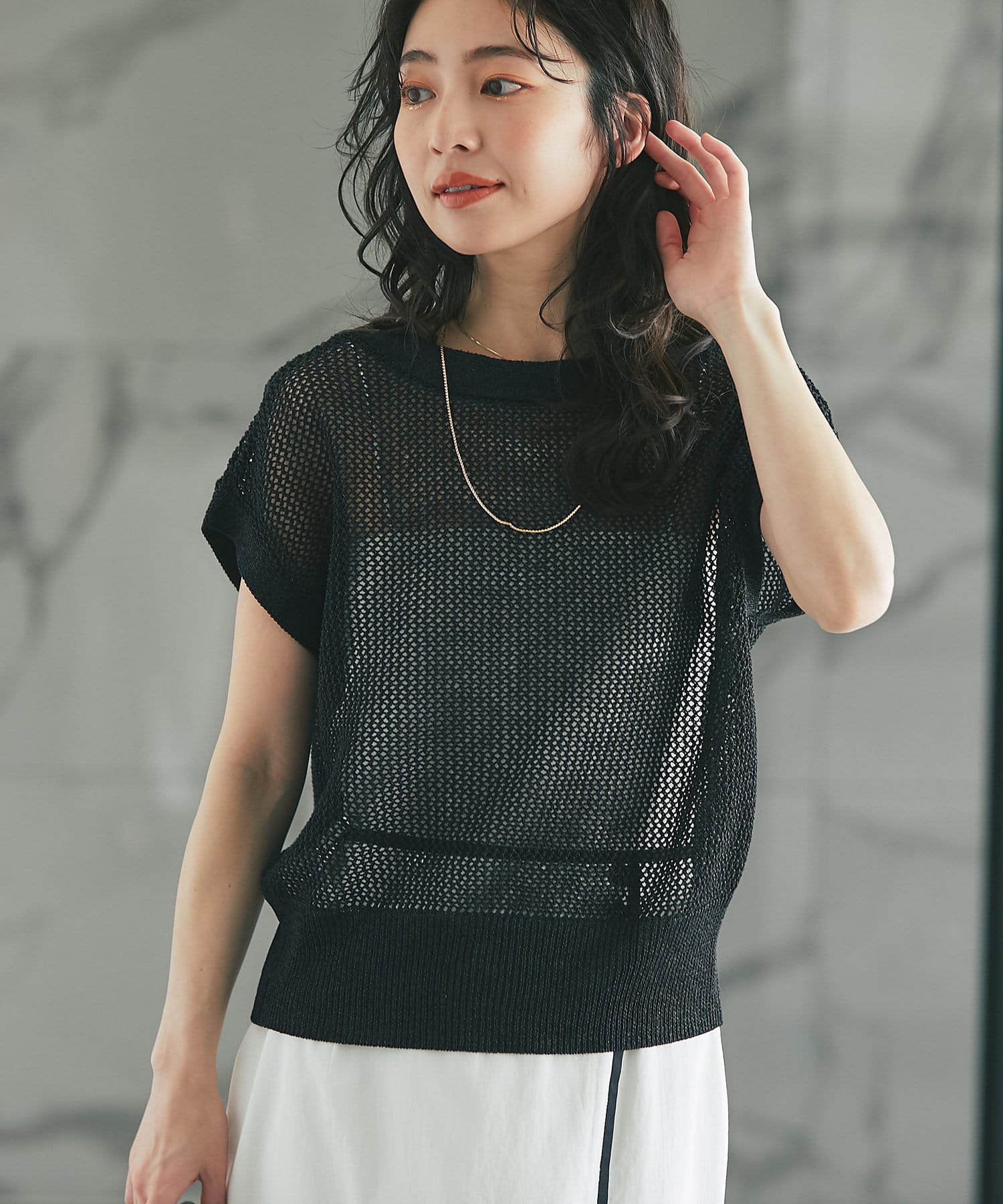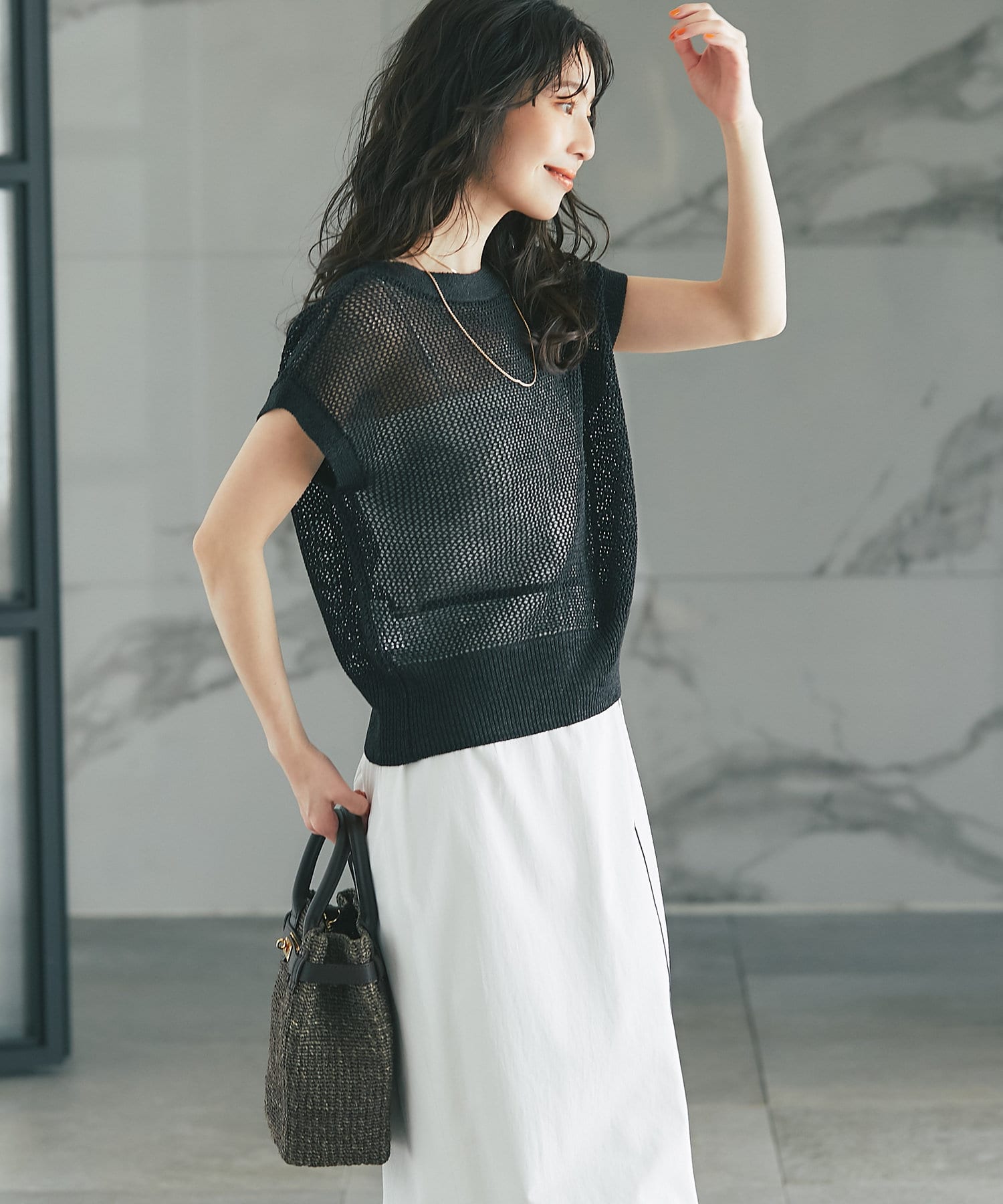 メッシュ柄の編地にシーズンムード高まる一着