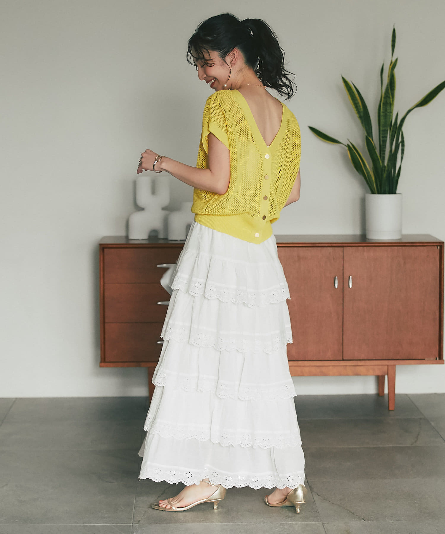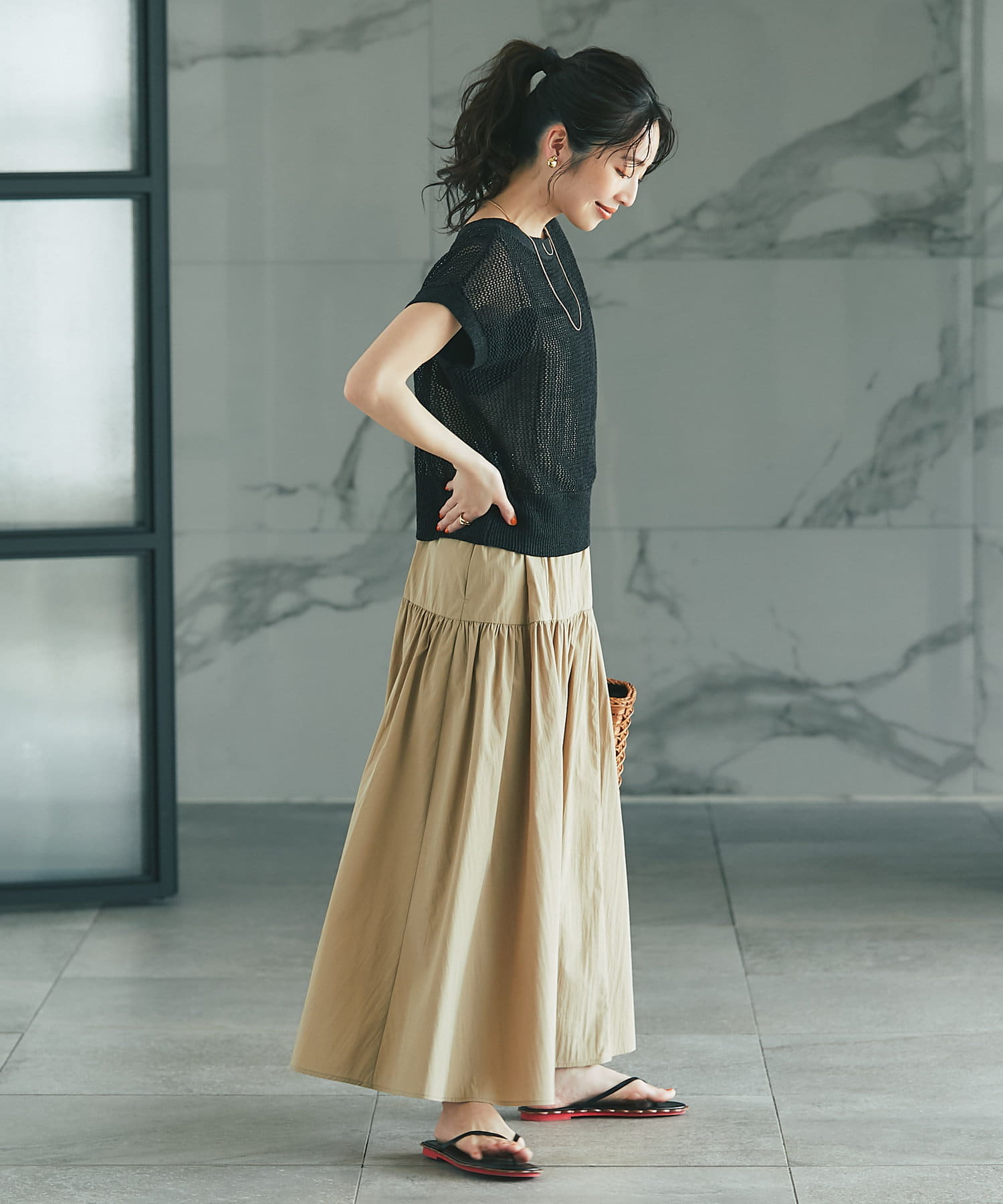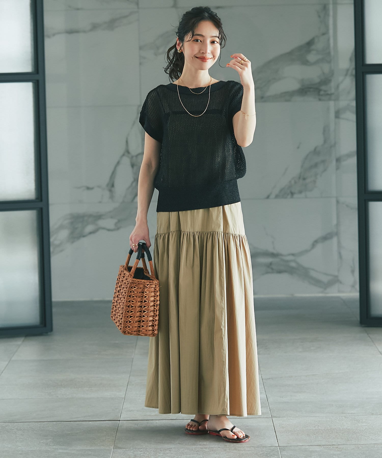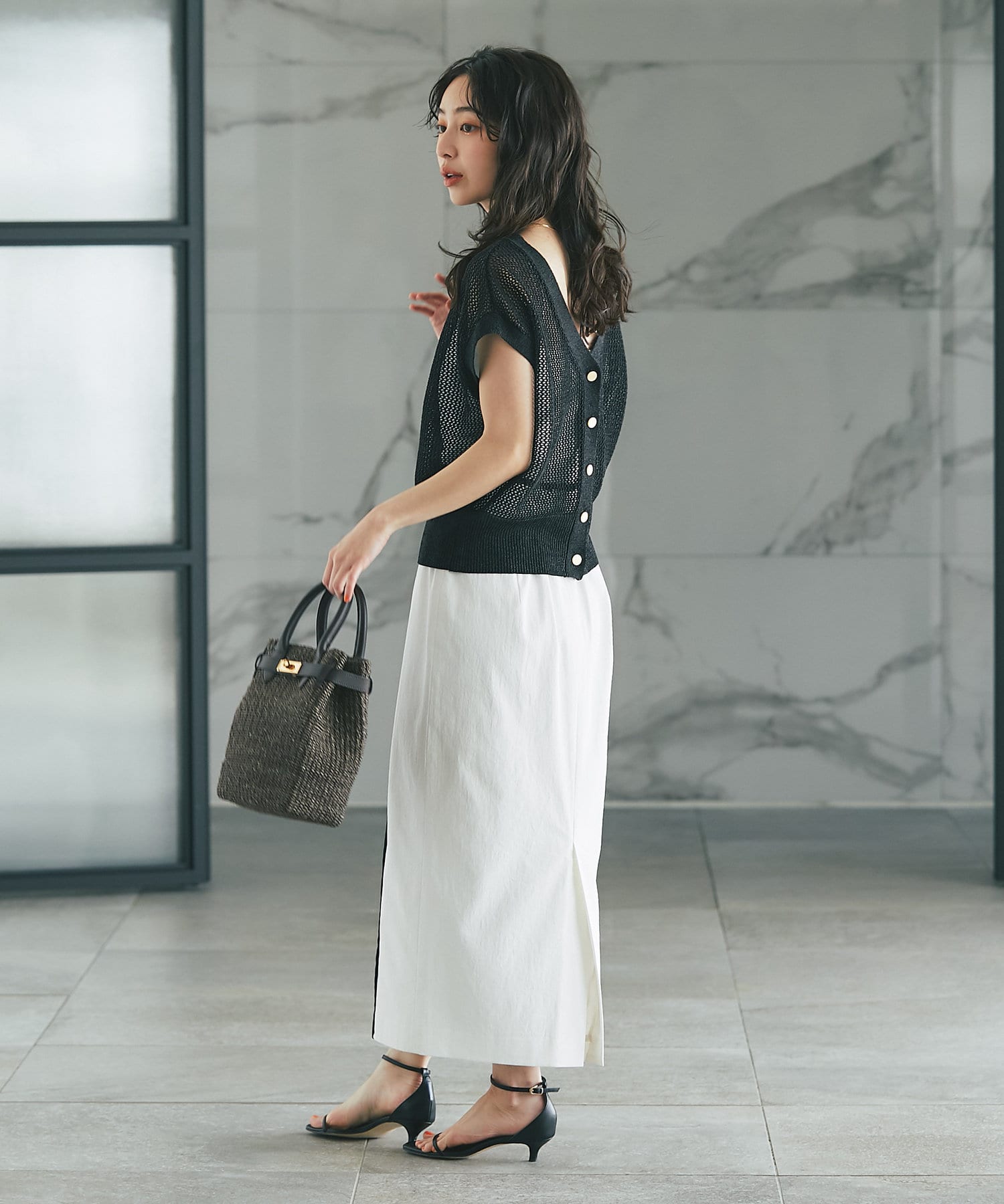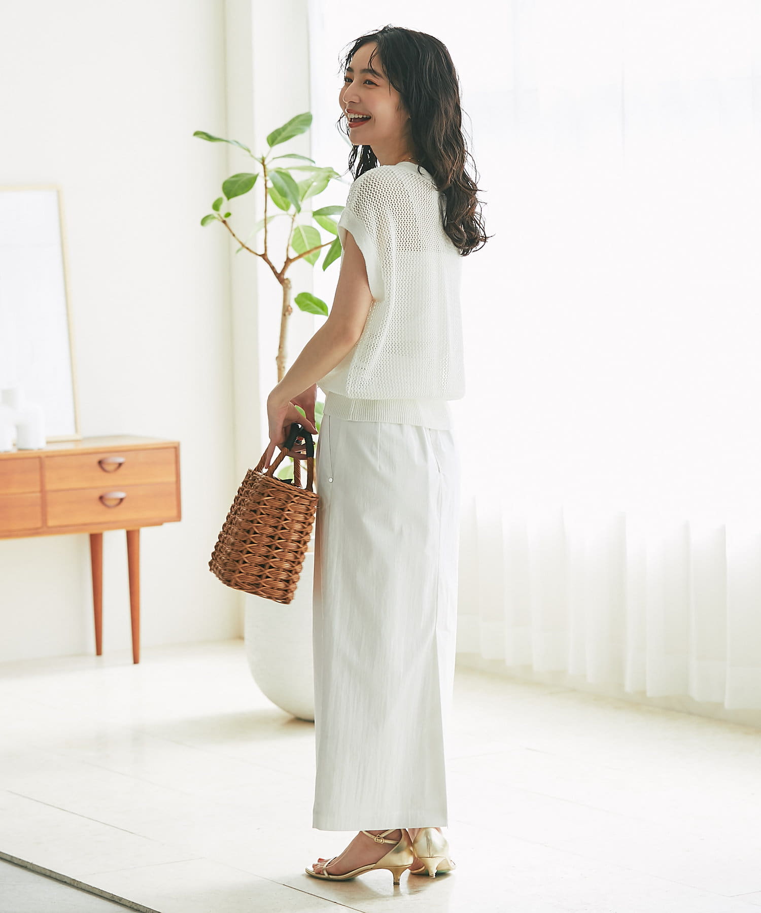 メッシュ柄の編地にシーズンムード高まる一着