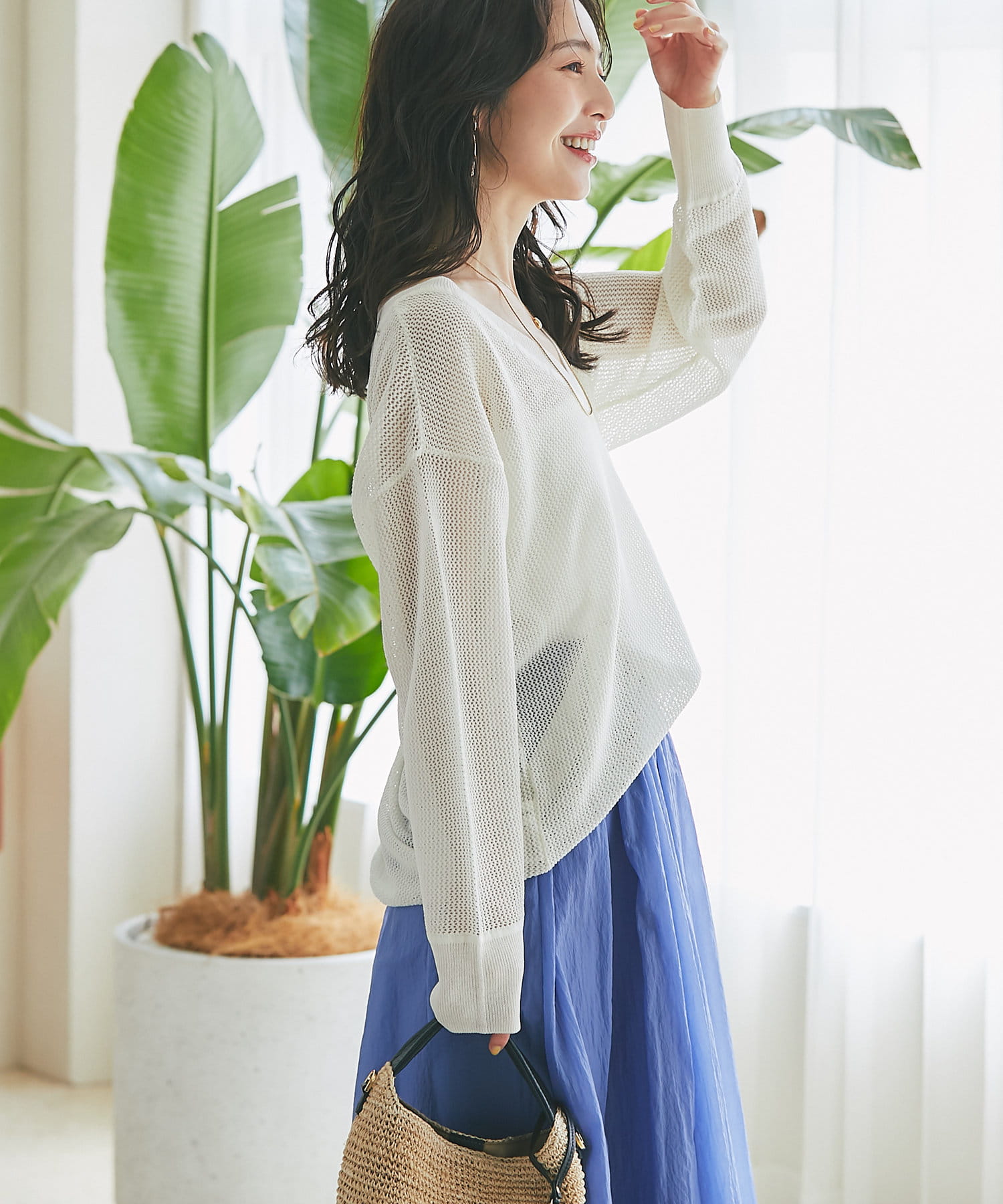 さらっとした質感と体の泳ぐシルエットで、梅雨時期も着やすい一枚です。