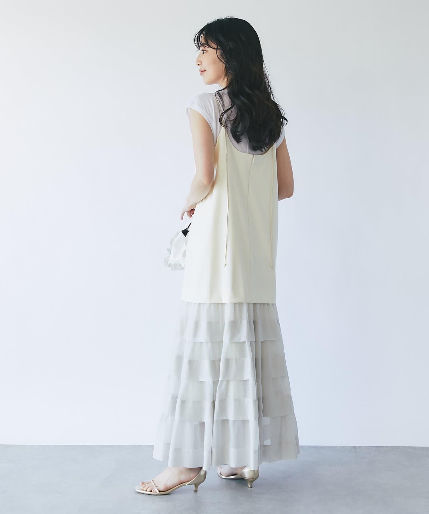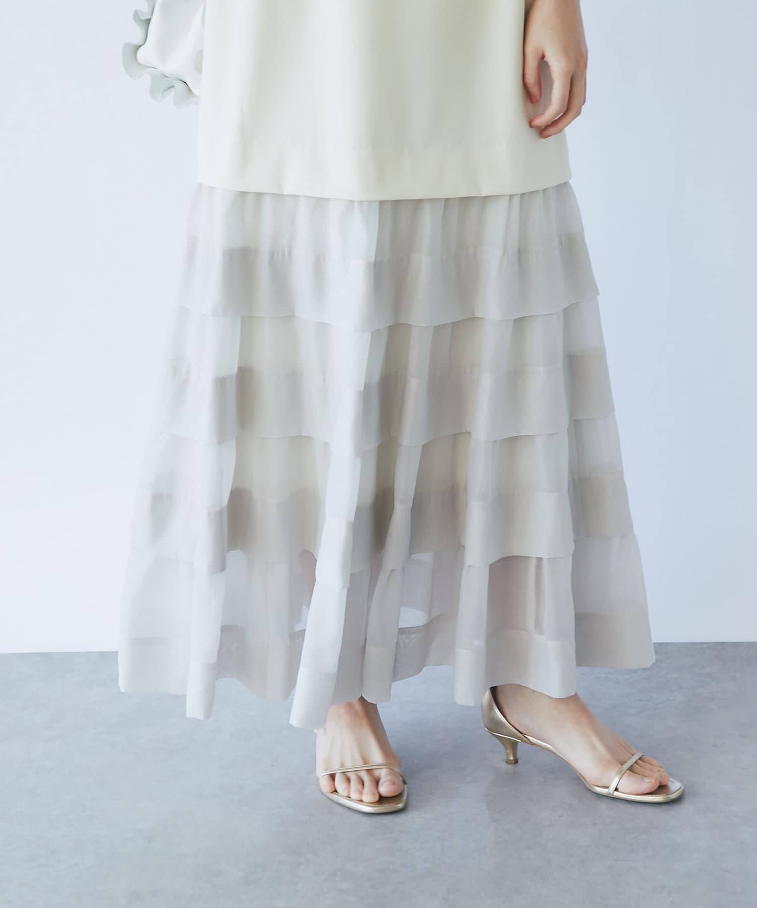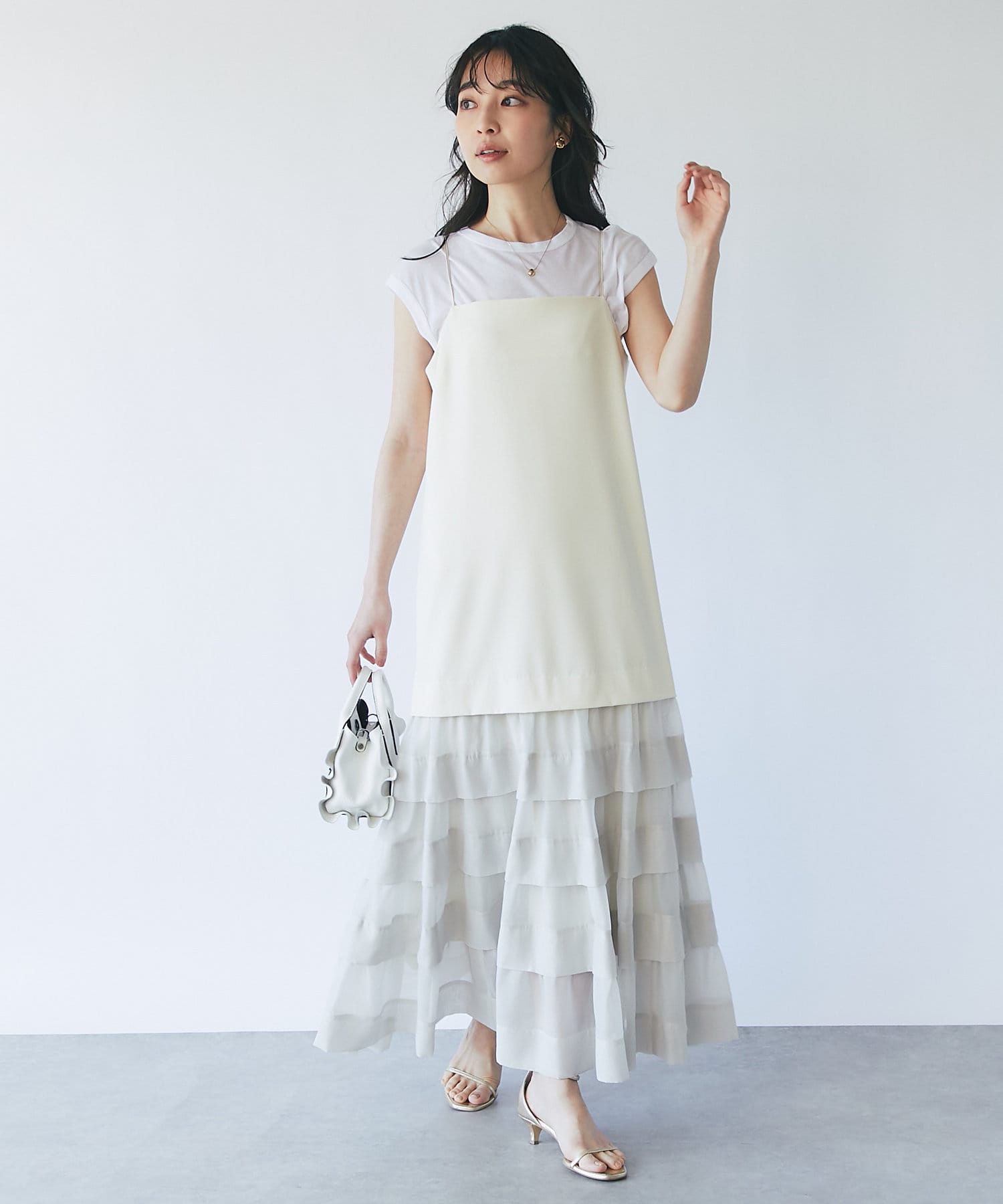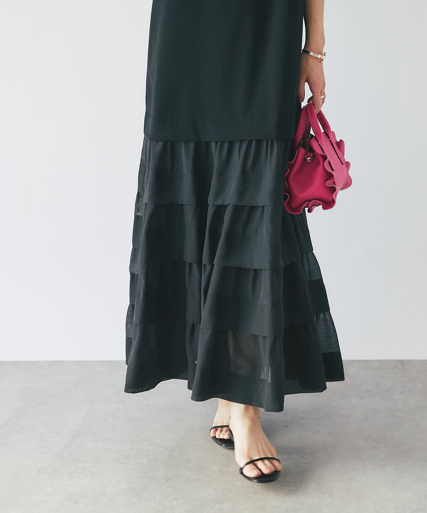 ティアードのふわっと広がる裾は上品でフェミニンな印象に。