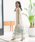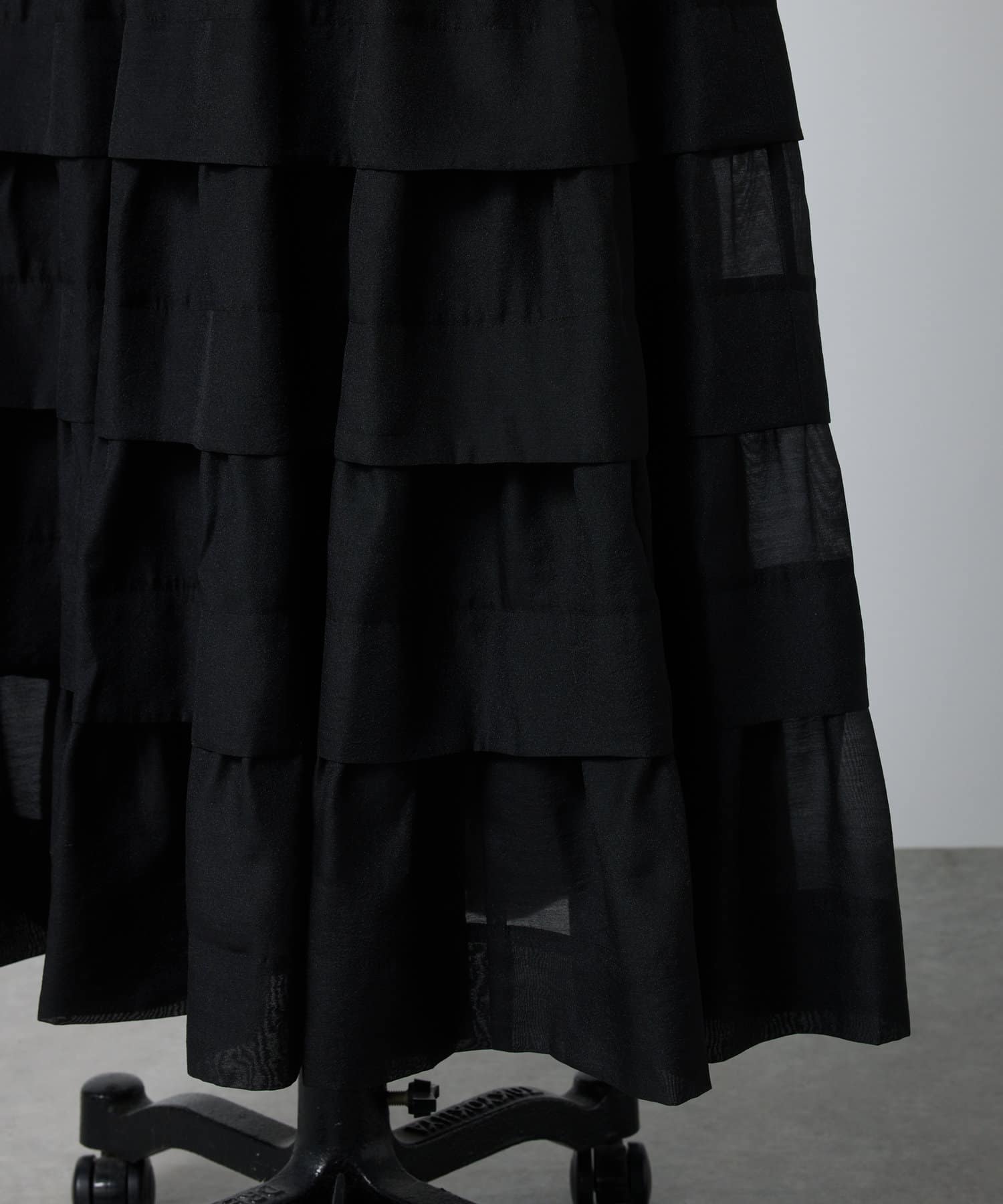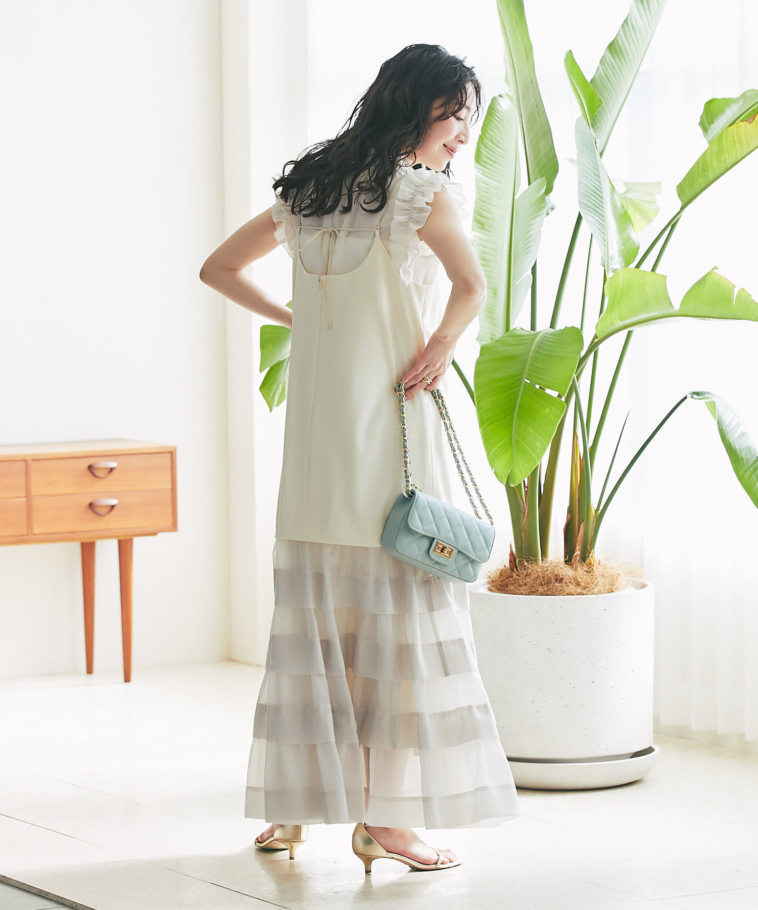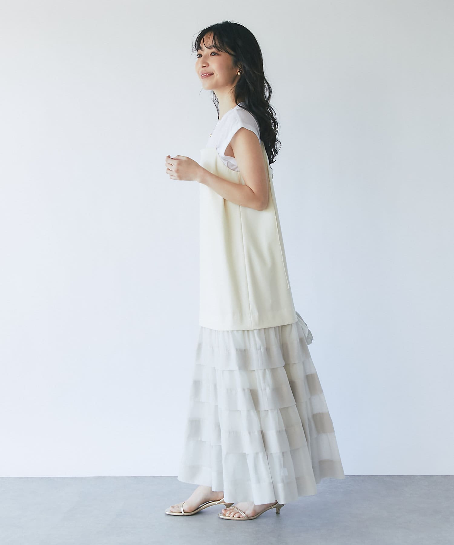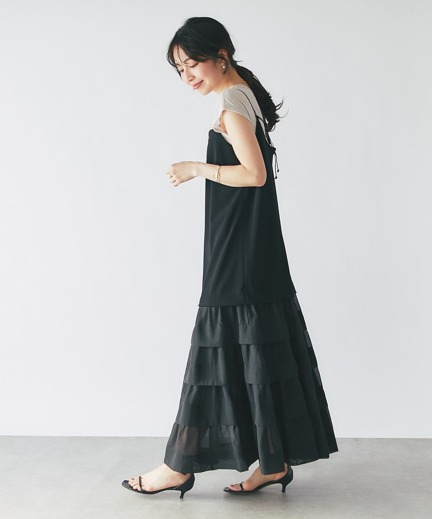 ティアードのふわっと広がる裾は上品でフェミニンな印象に。