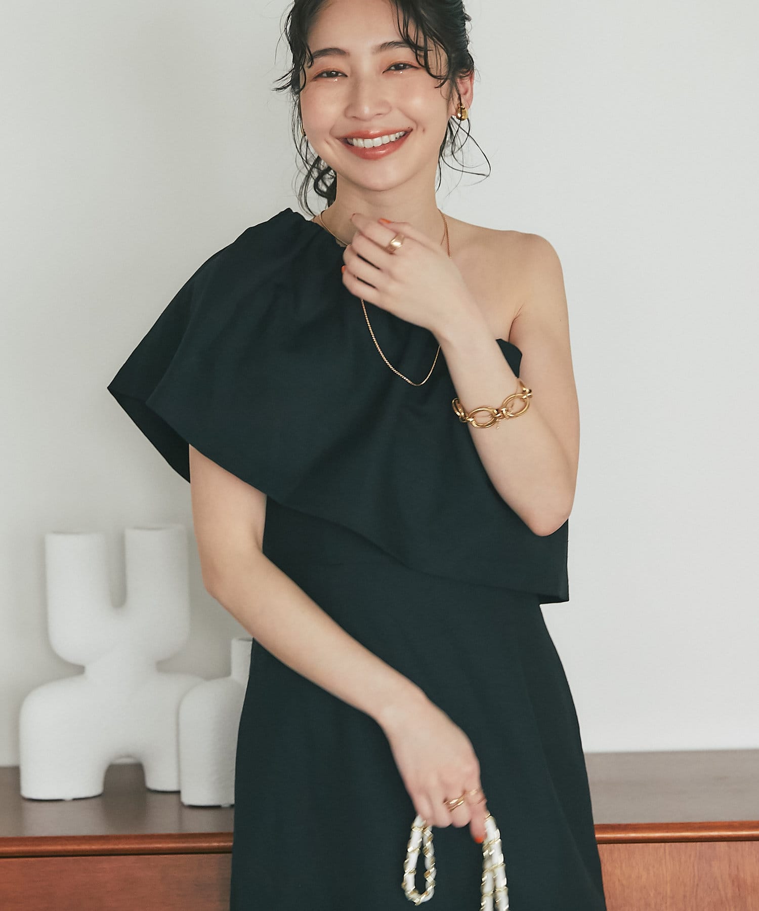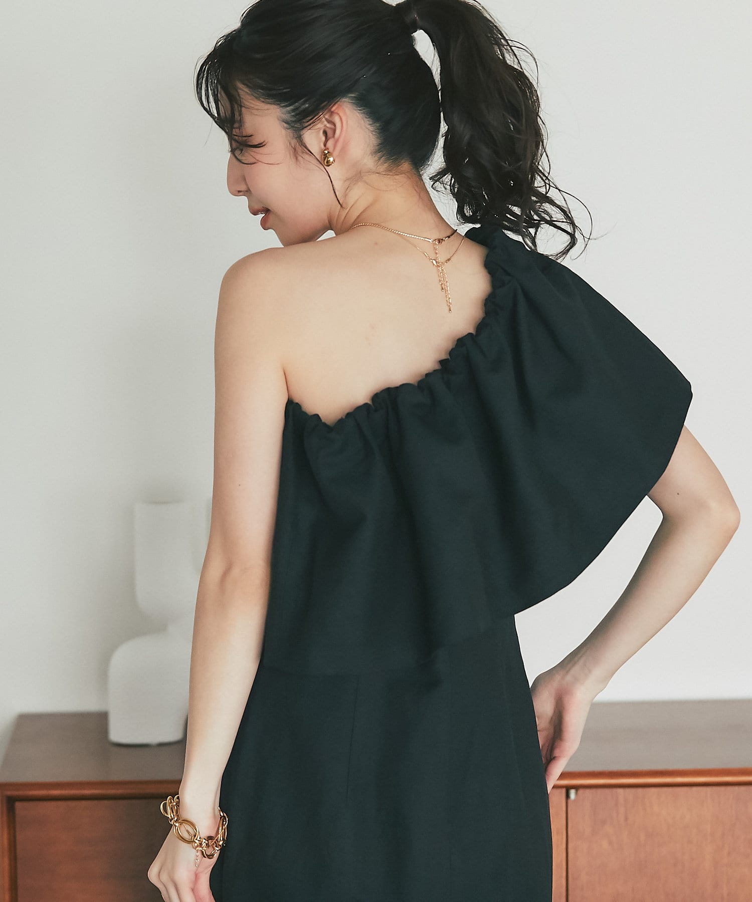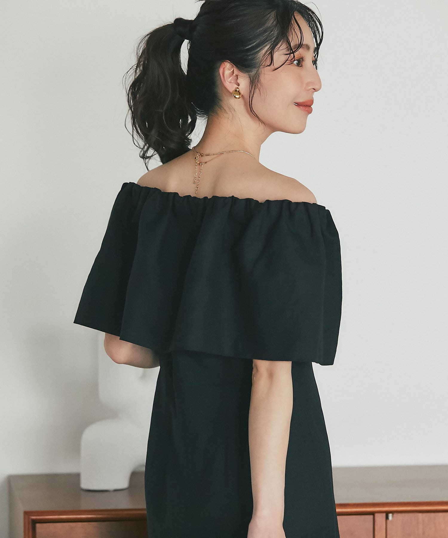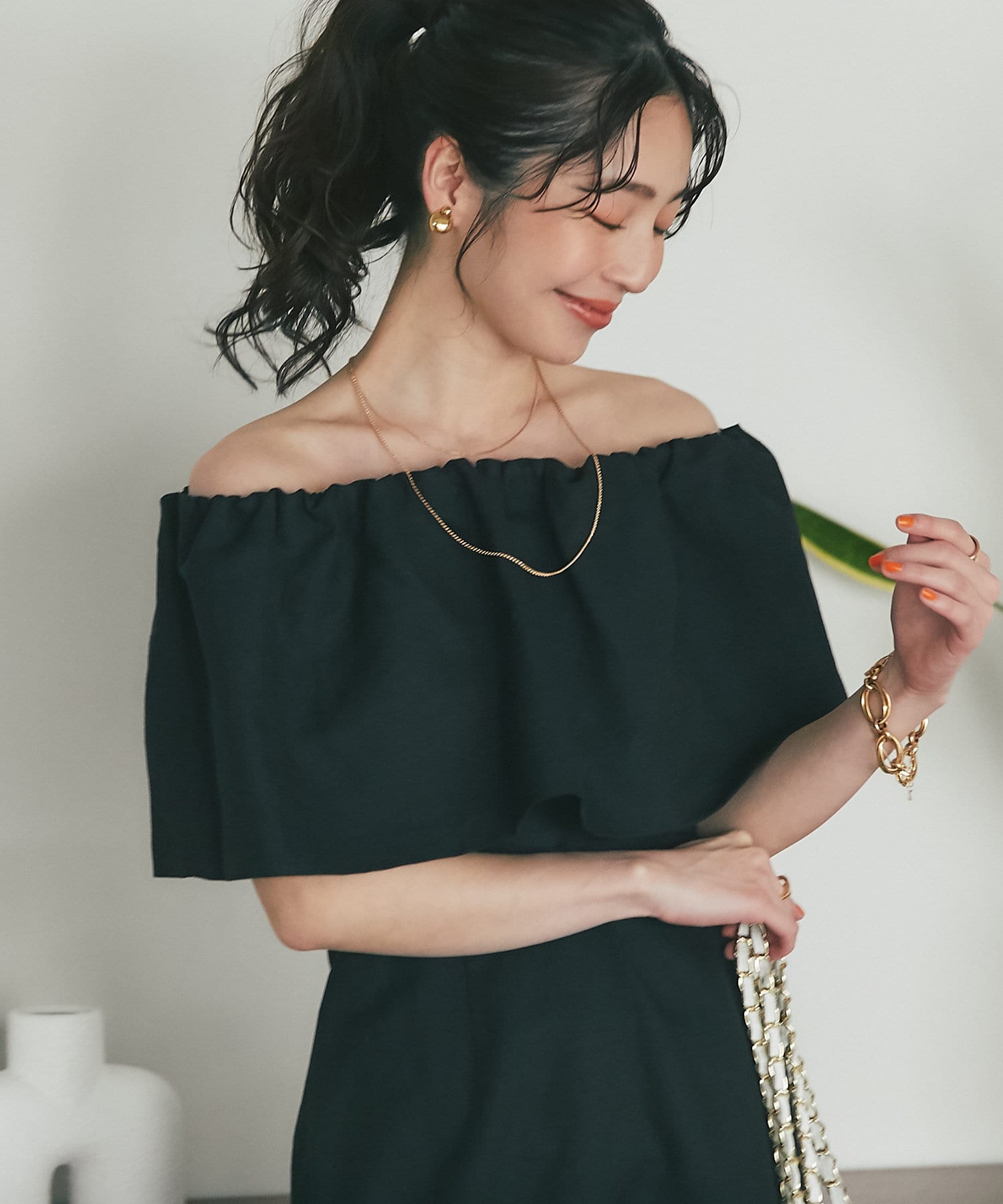 フリルはゴム入りなのでオフショルにしたりワンショルダーにしたり、