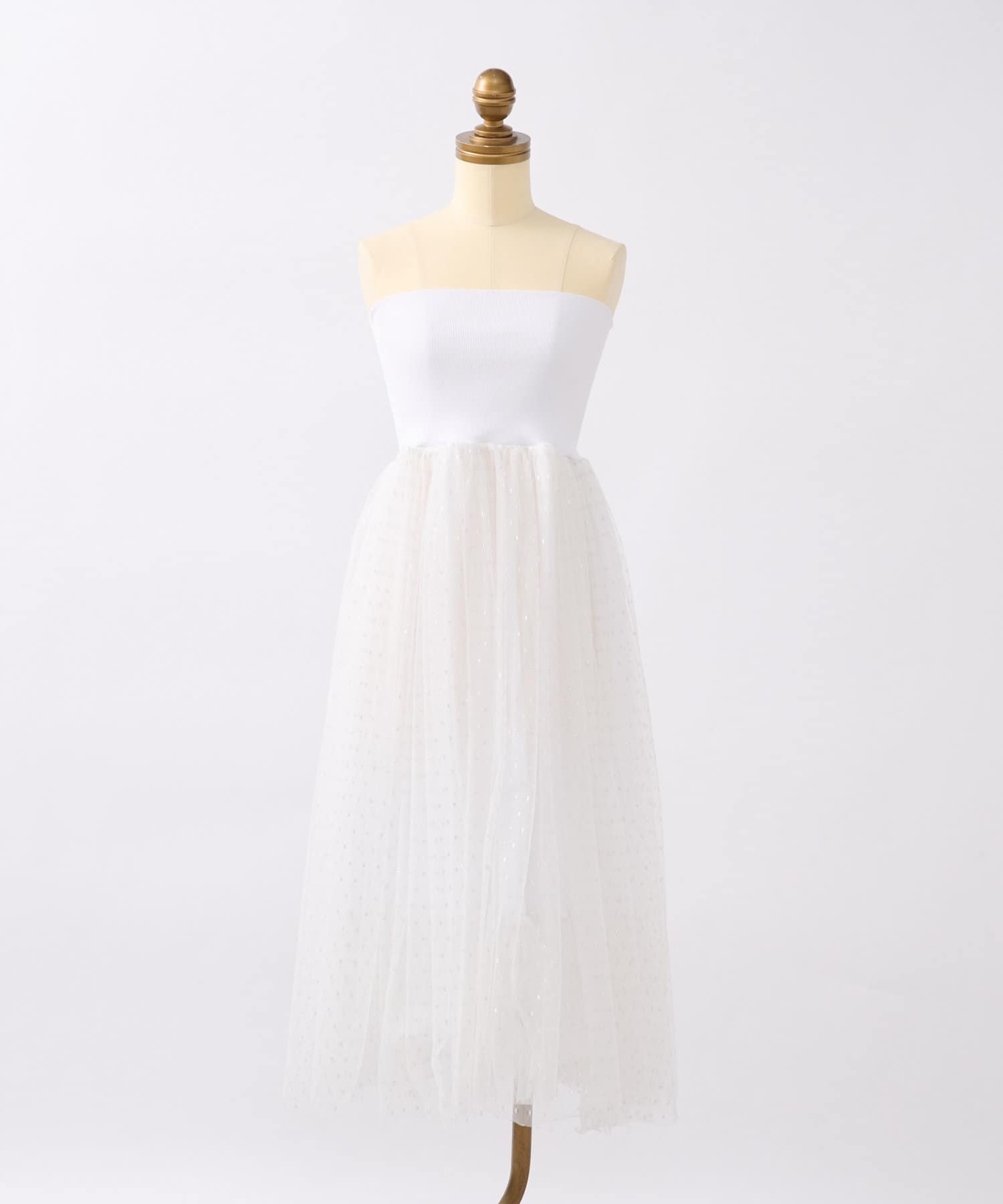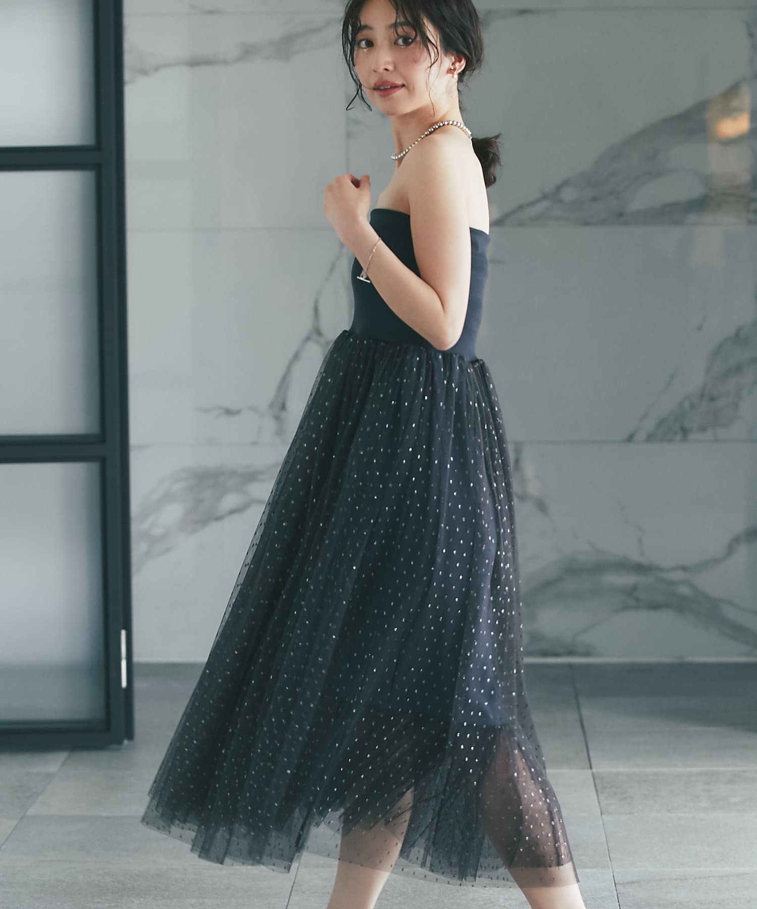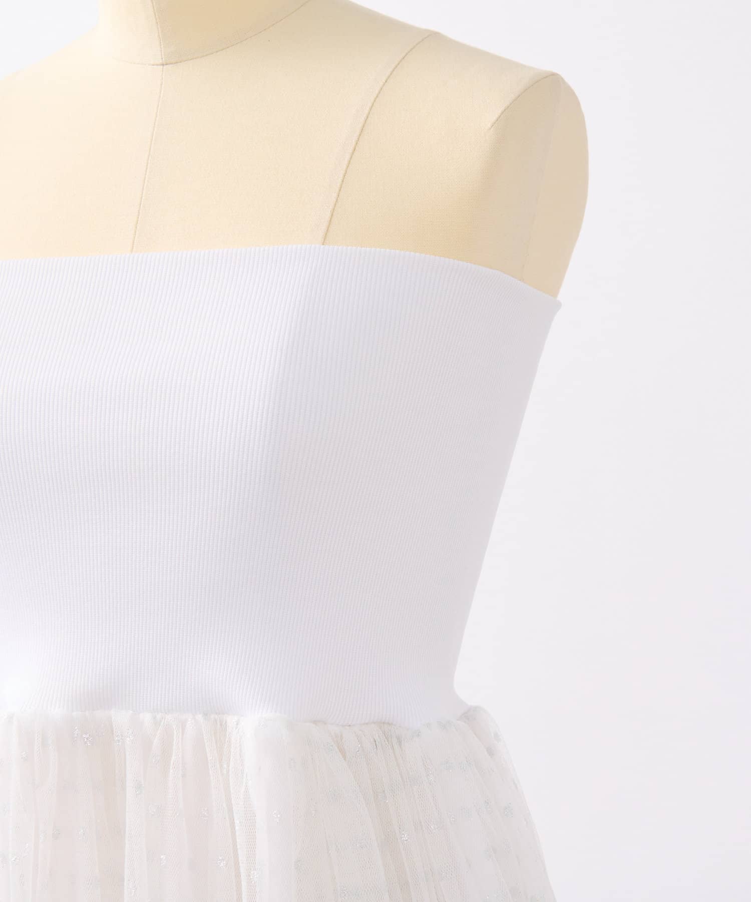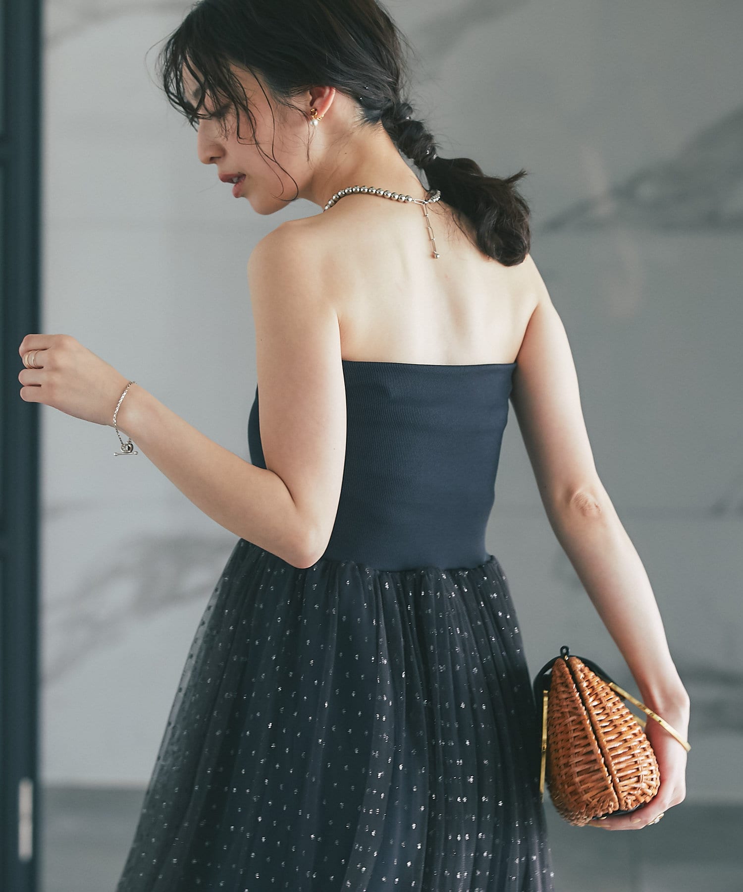 シアー感のあるチュール素材とビスチェを着ているようなベアトップデザインが女性らしいベアトップワンピースです。