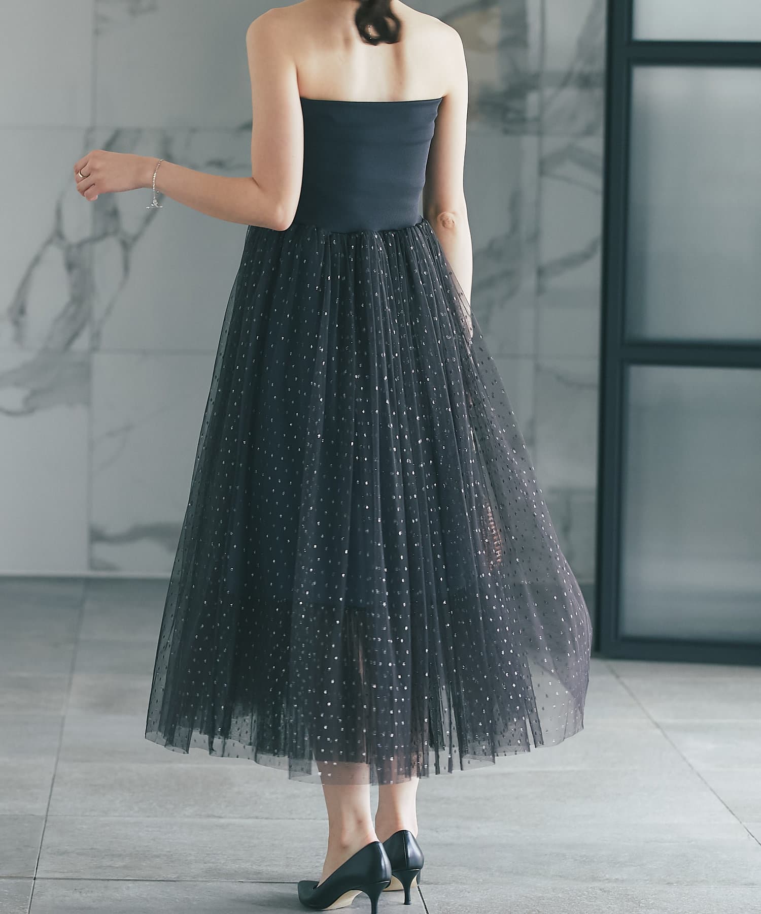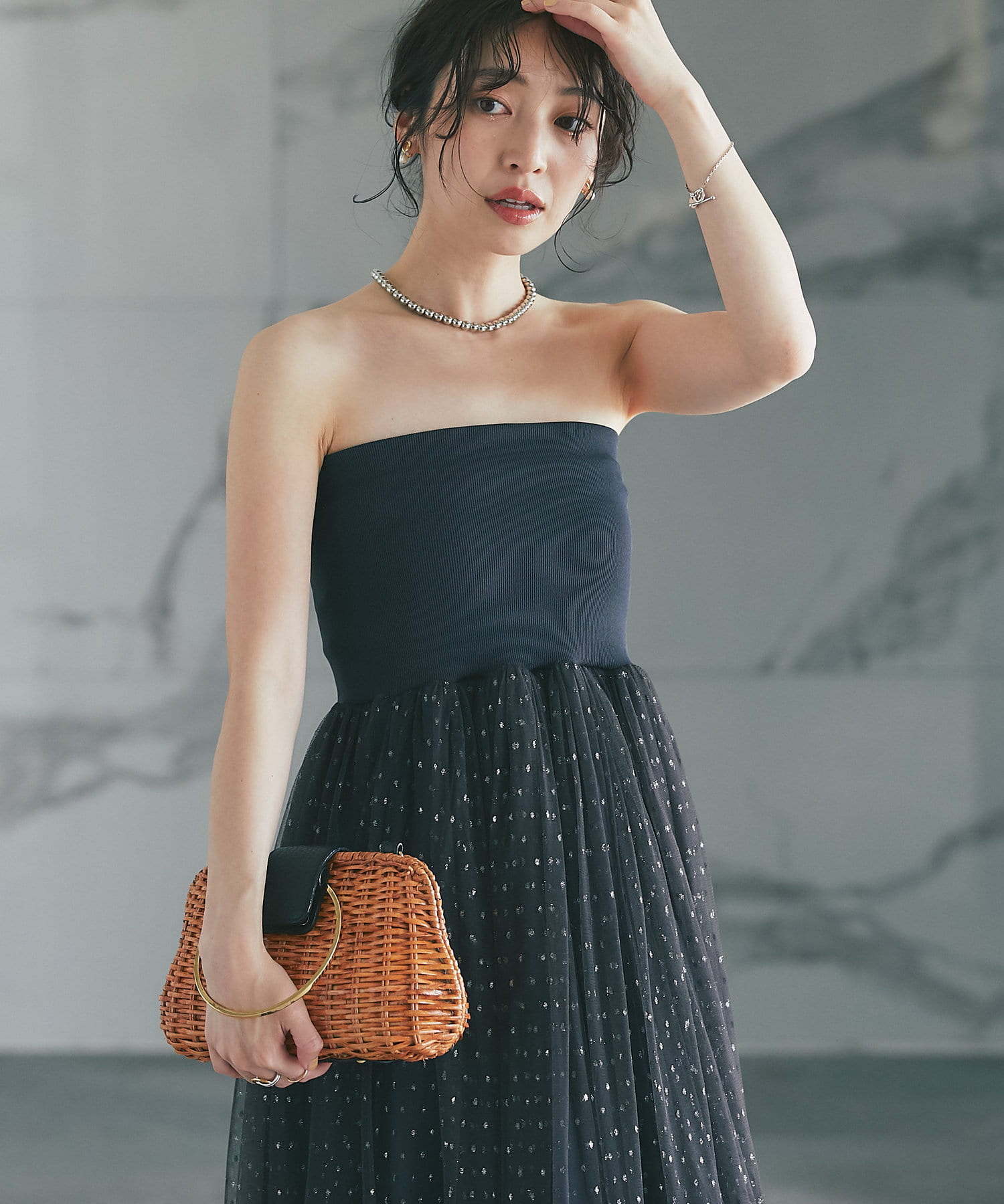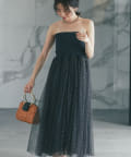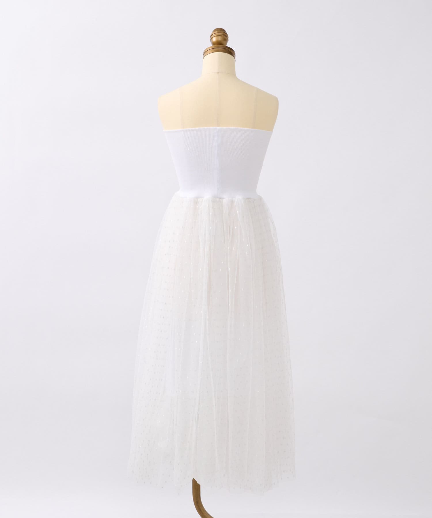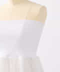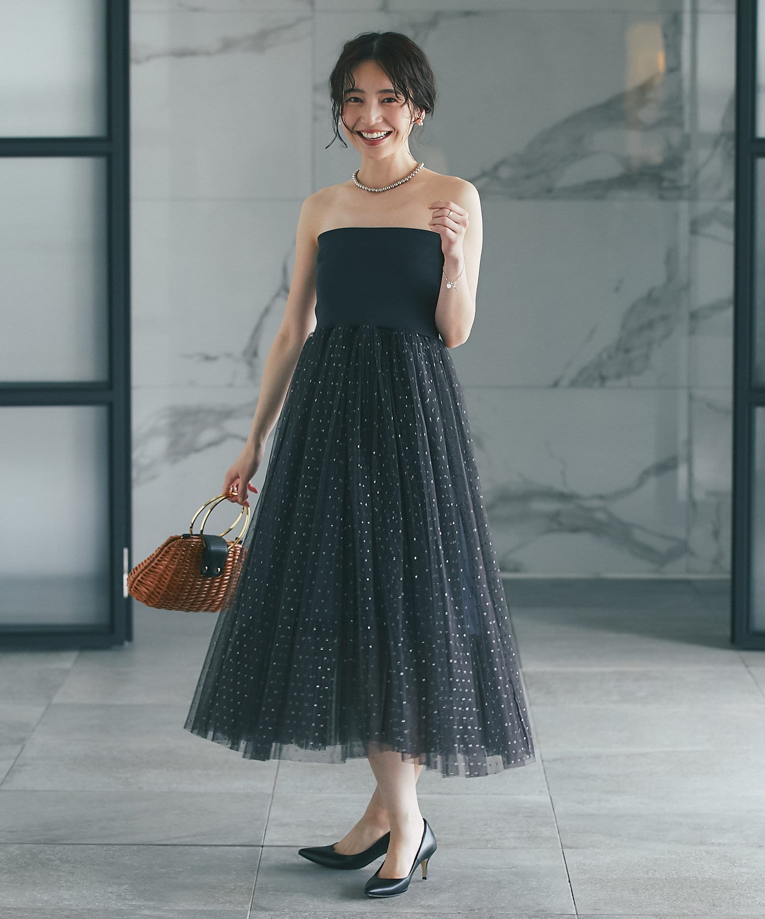 シアー感のあるチュール素材とビスチェを着ているようなベアトップデザインが女性らしいベアトップワンピースです。