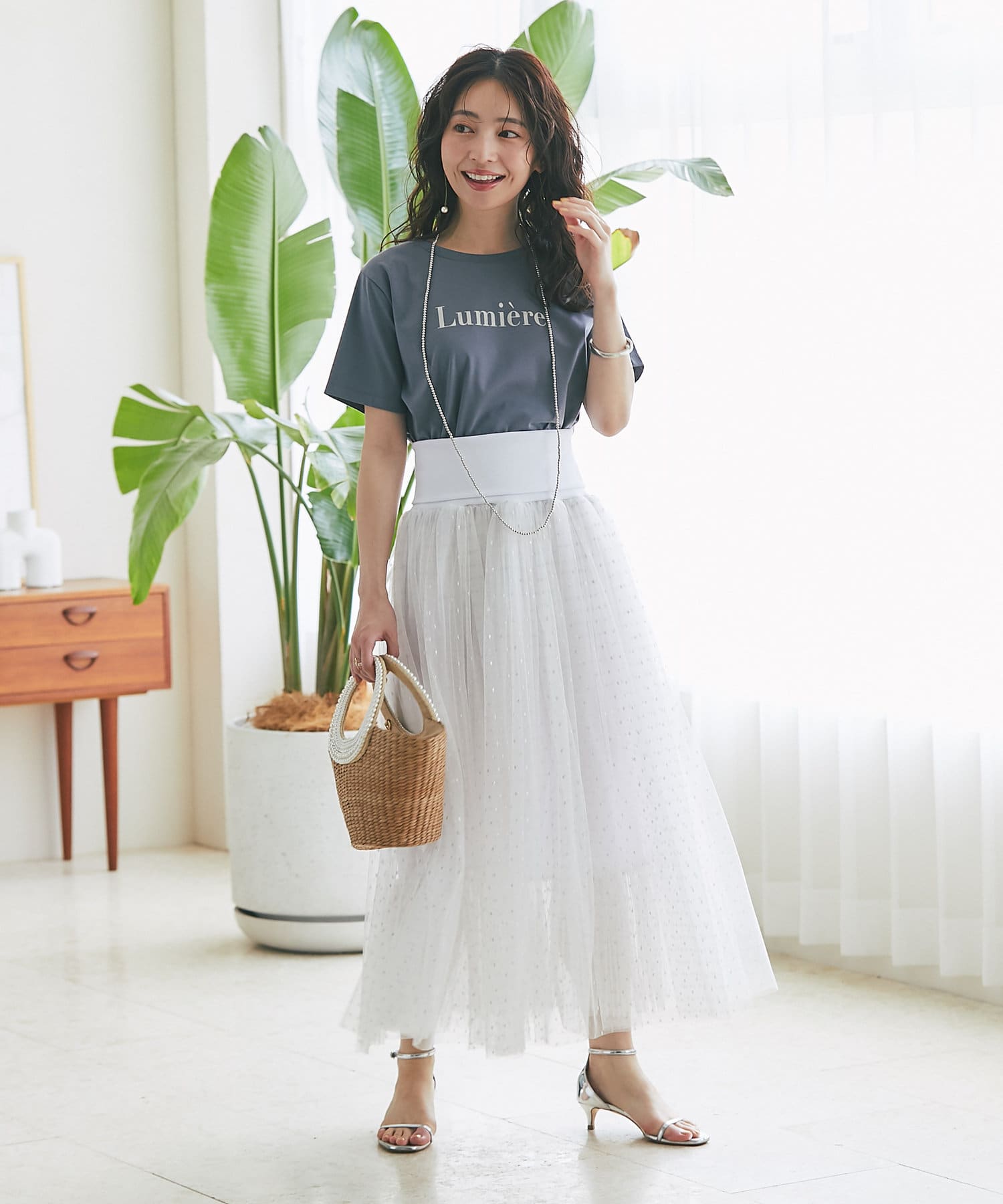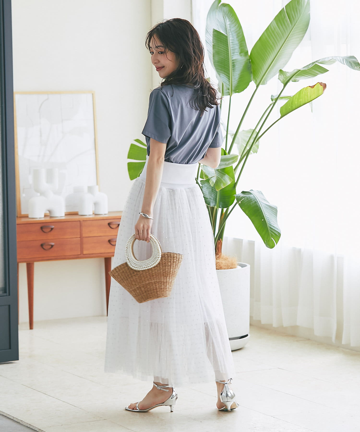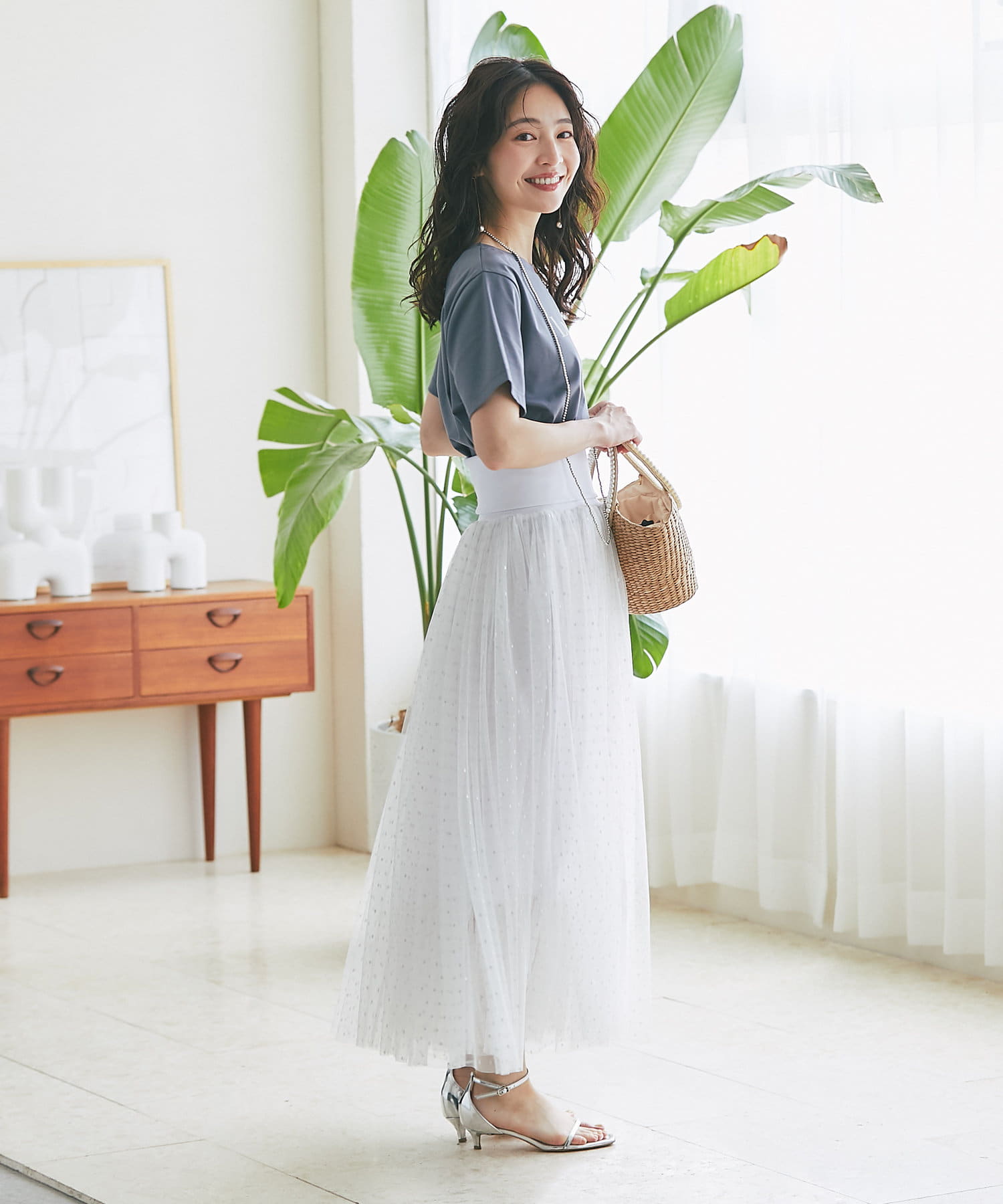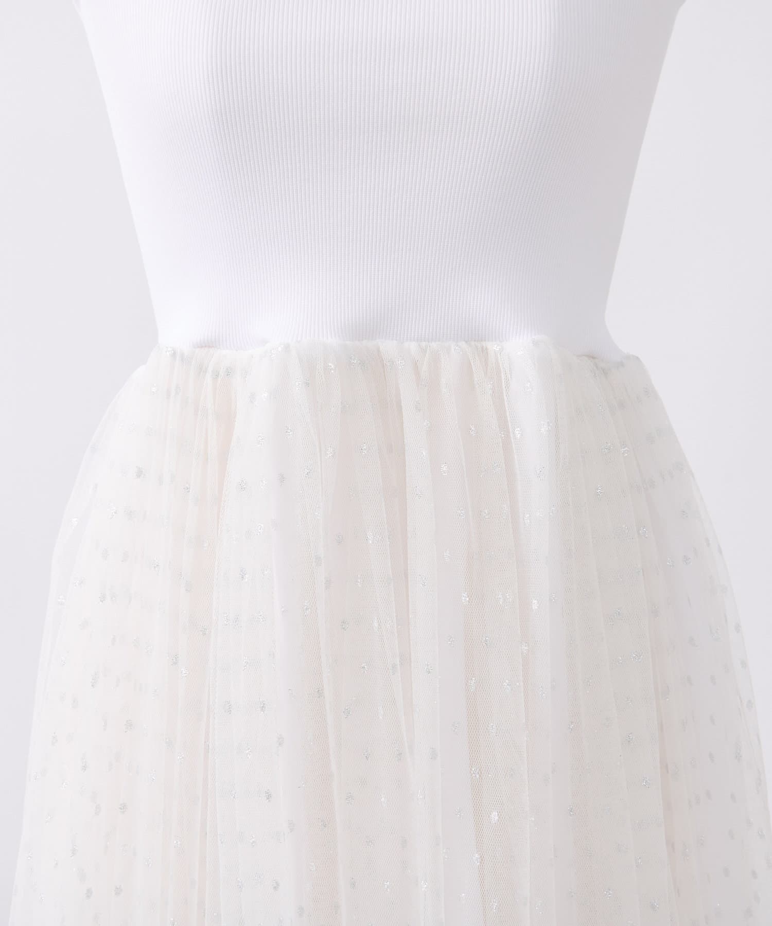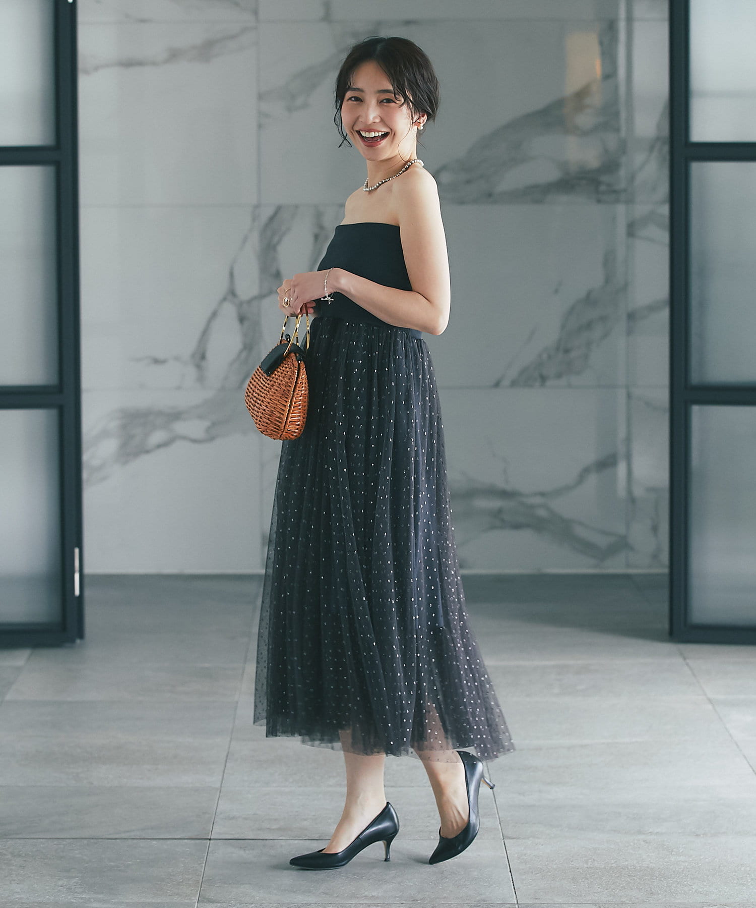 ラメ糸でドット刺繍を施したスカートは上品にきらめいて存在感抜群。