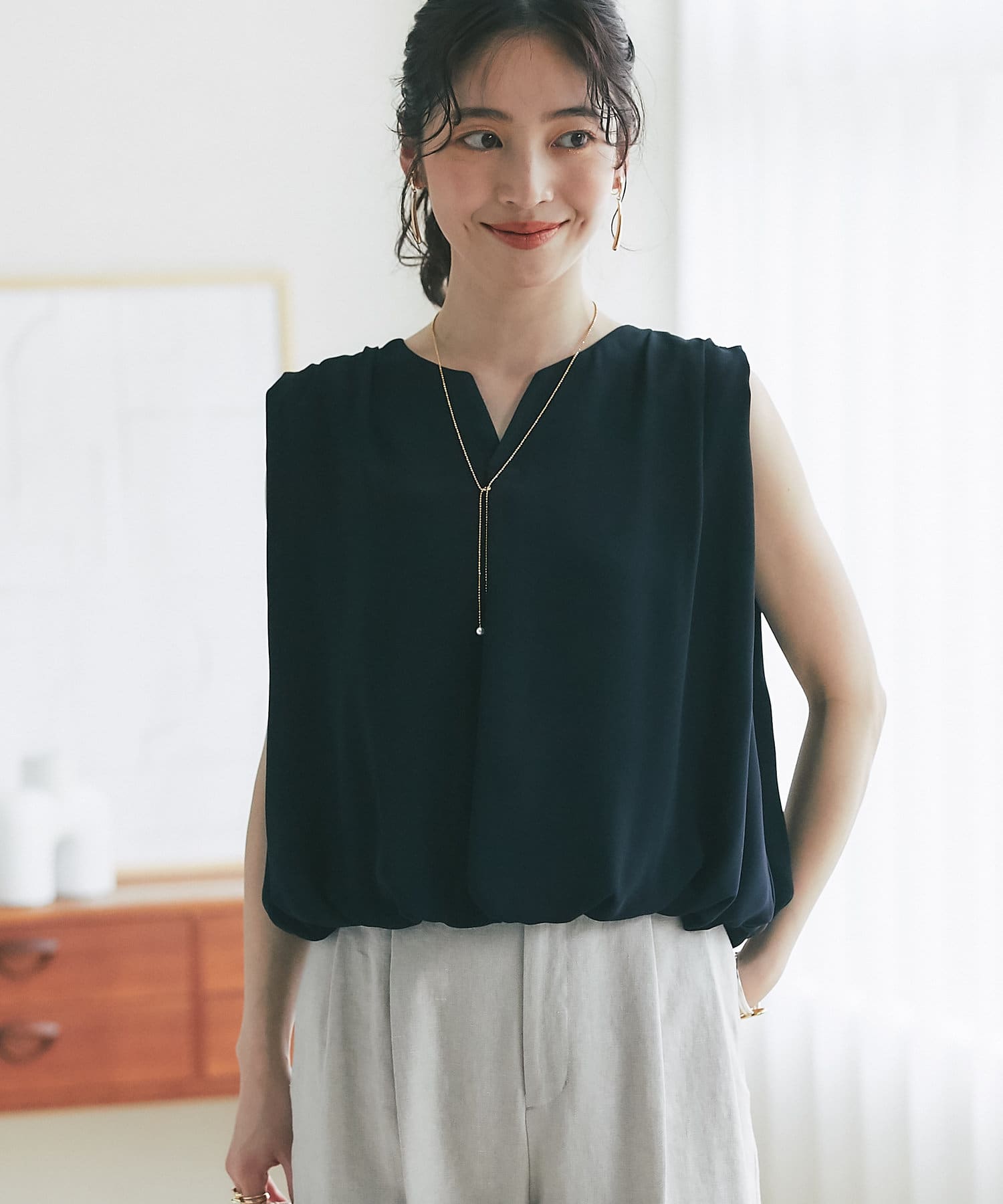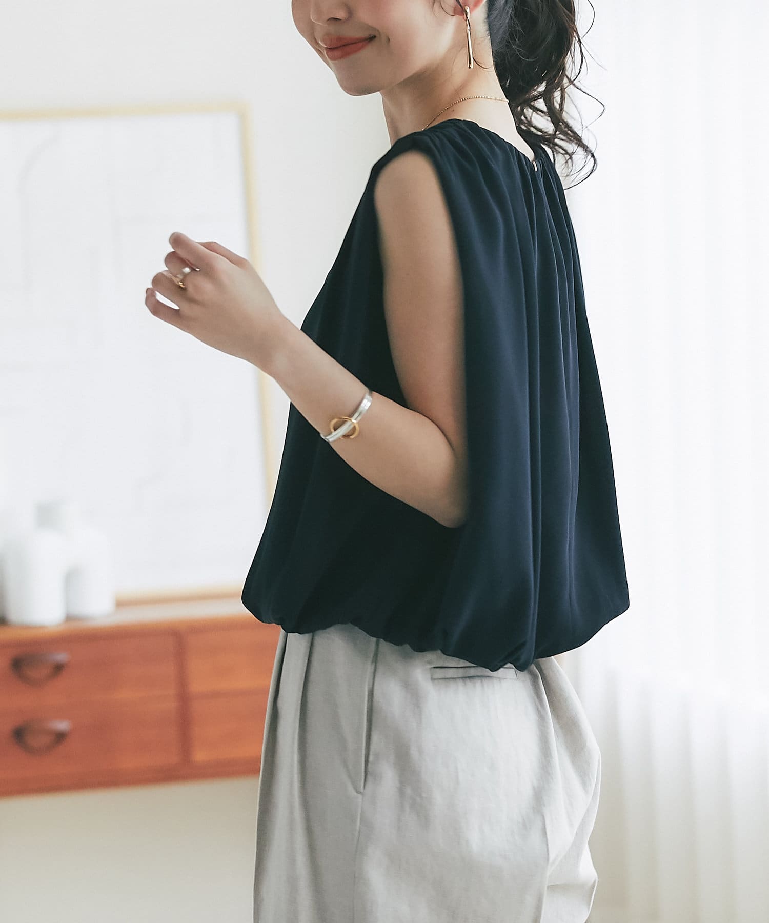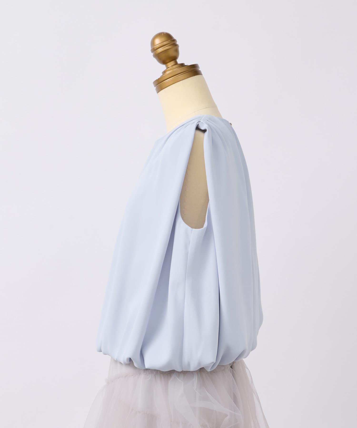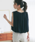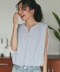 ふんわりと立体的なバルーンシルエットが華やかなノースリーブブラウス