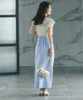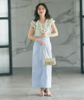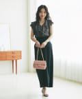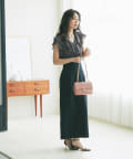 胸元から肩先まであしらったフリルが、華やかな印象だけでなく体型カバーにも貢献。