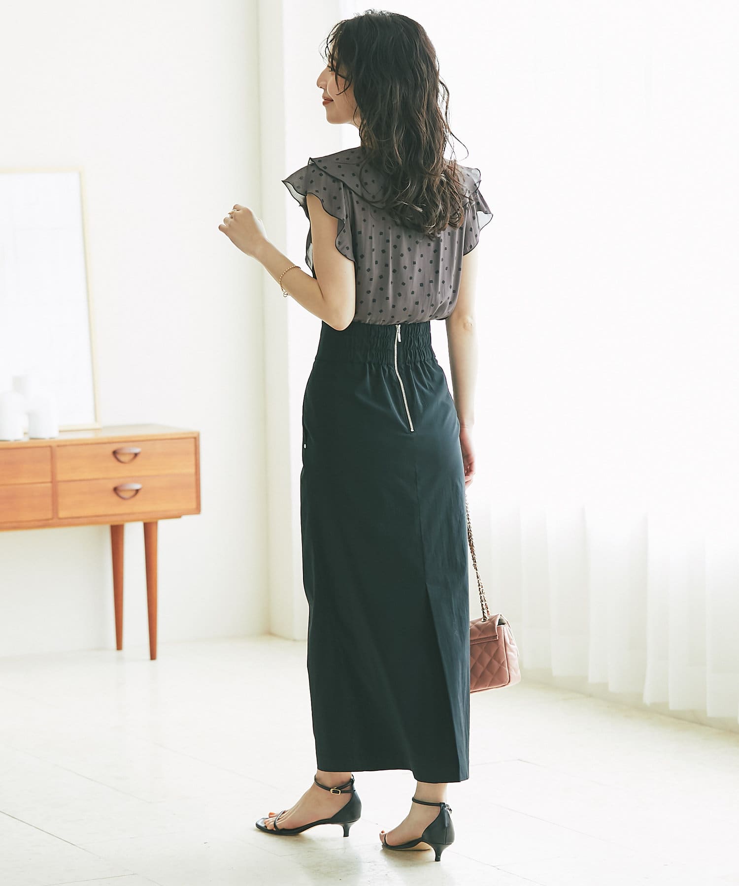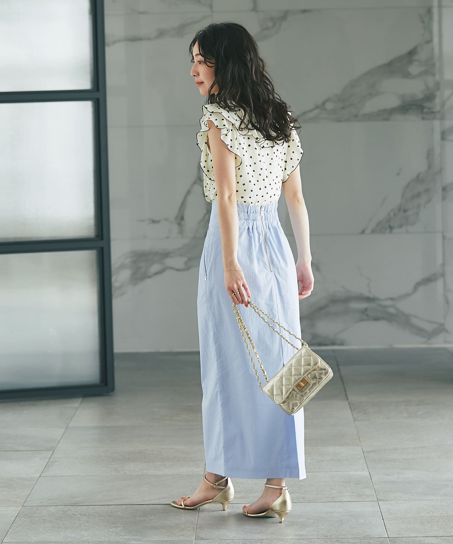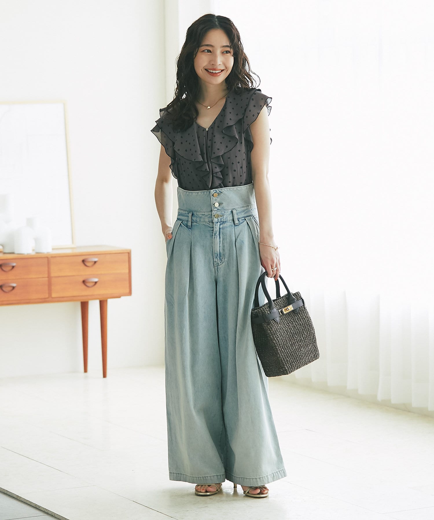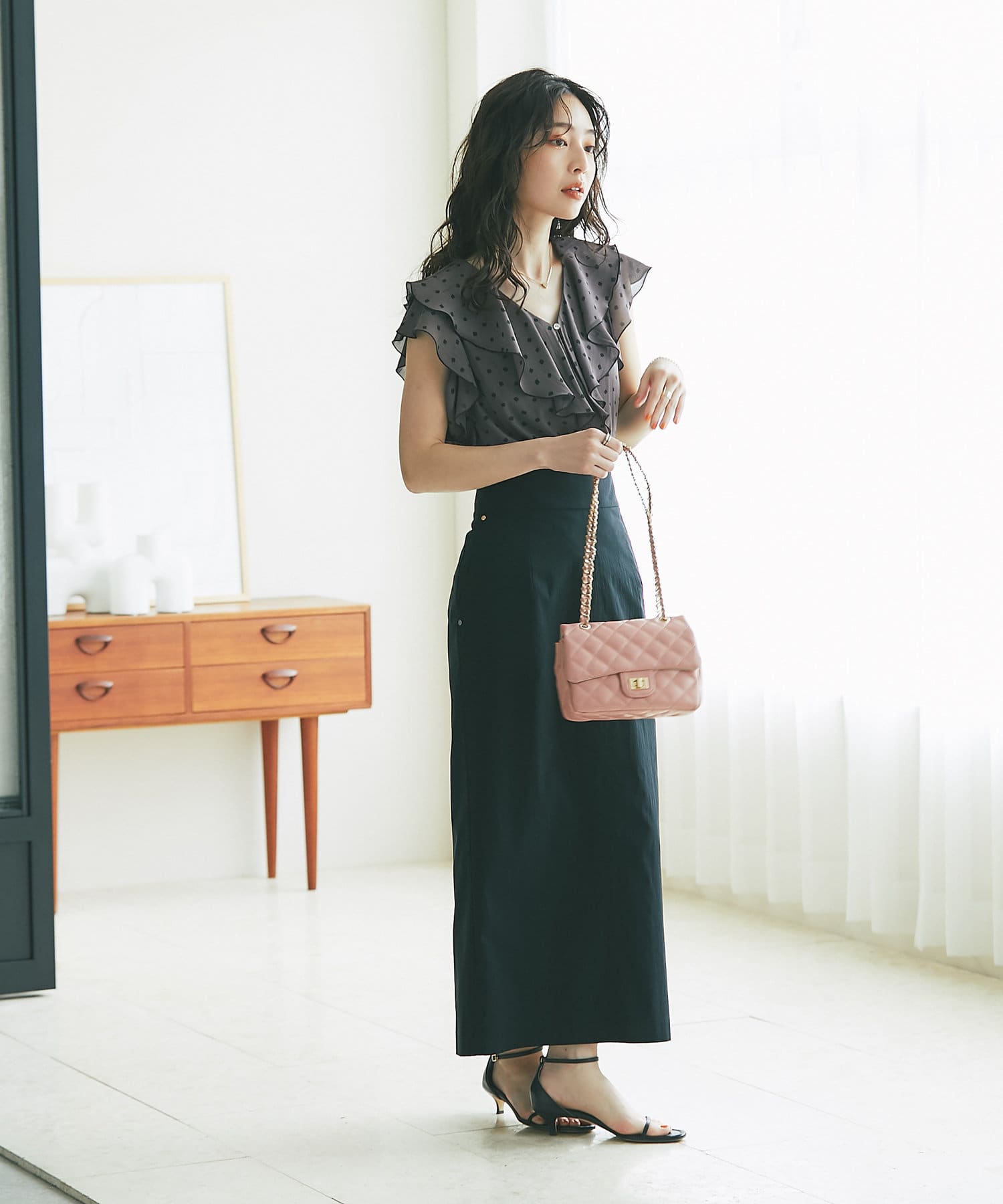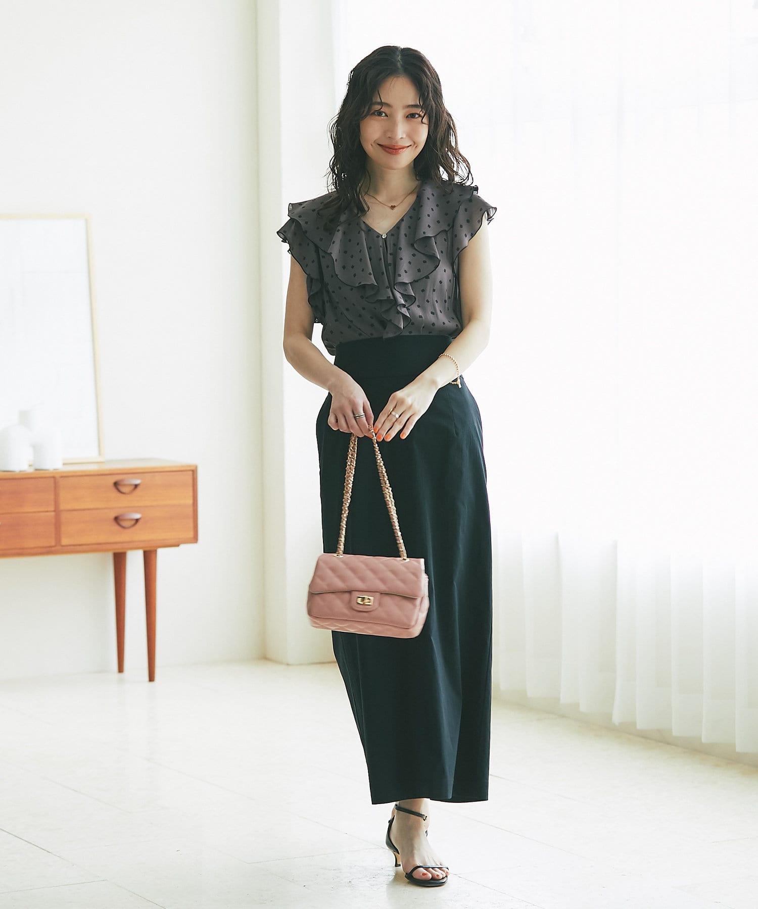 女性らしい華やぎを添えるフリルブラウス