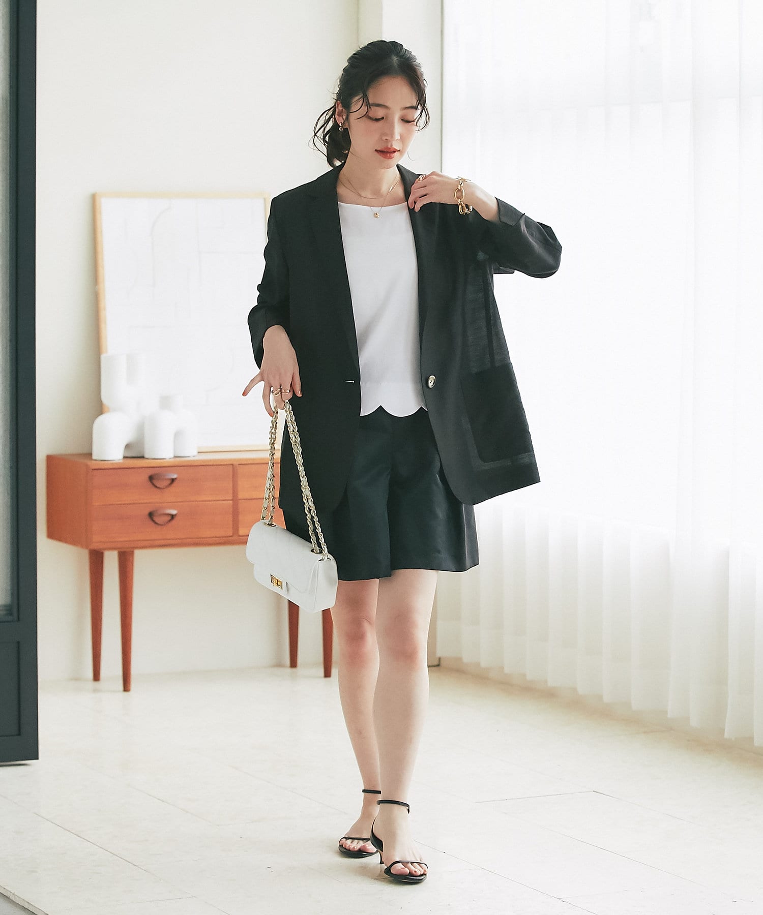 大人の女性が着こなしやすいよう、クロップト丈ながらウエストがしっかり隠れるバランスに調節しています。