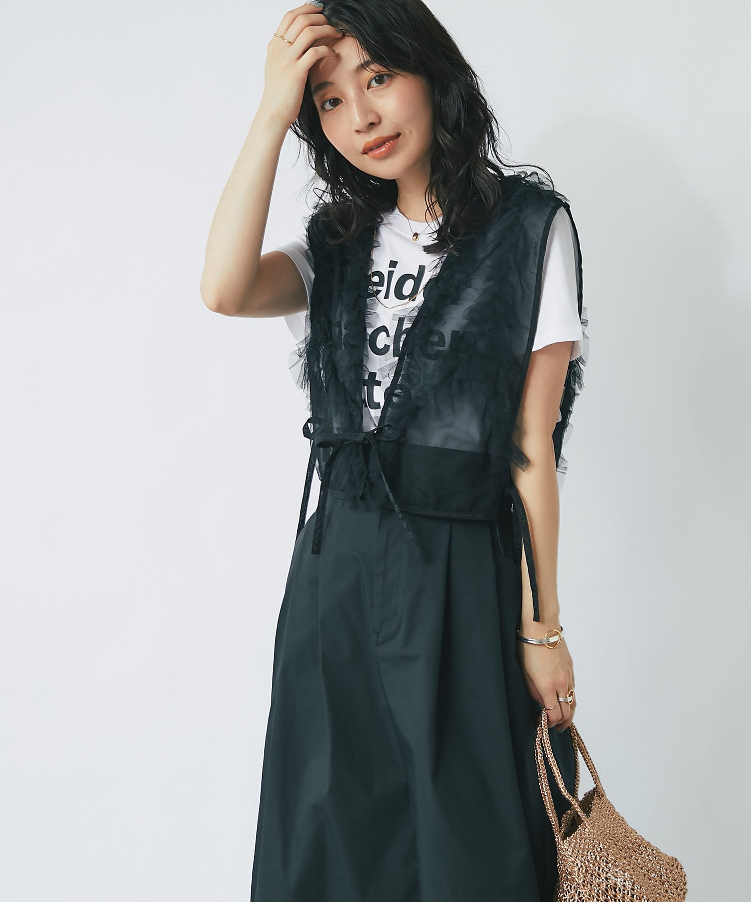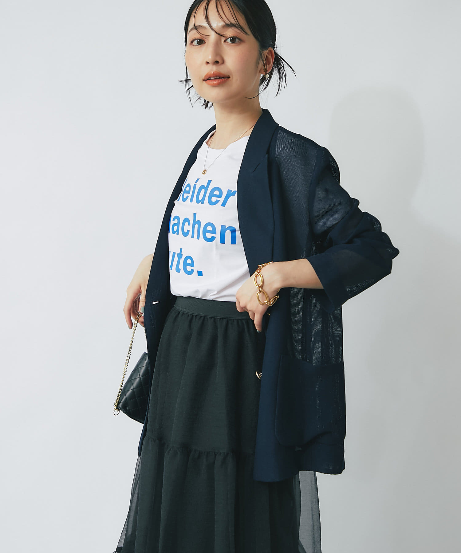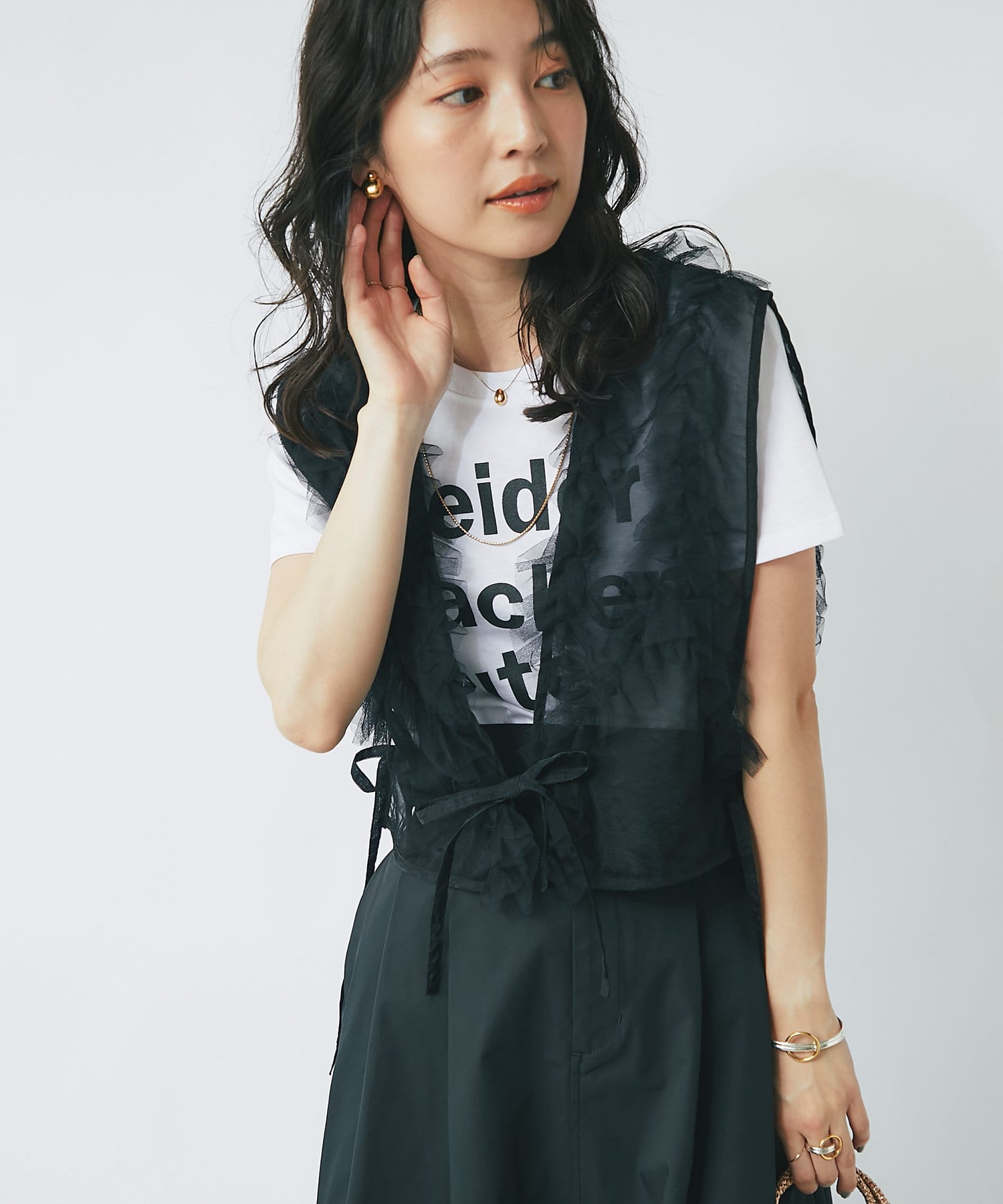 スカートなど、フェミニンなボトム合わせのスタイリングに取り入れて