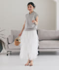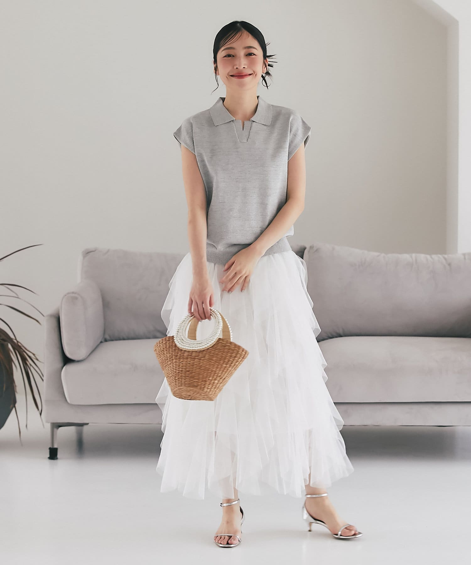 あえてフェミニンなボトムと合わせたバランスもおしゃれです。