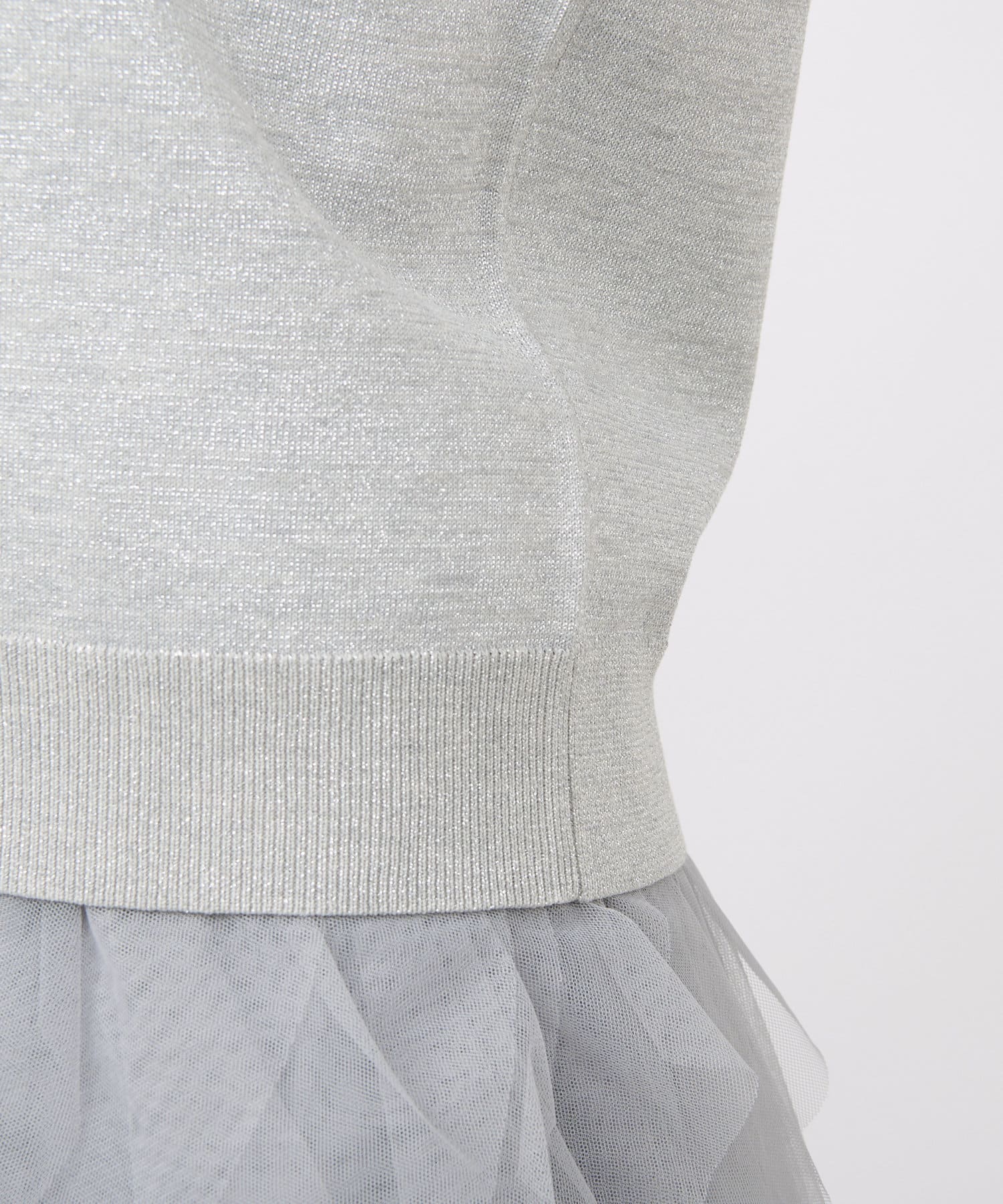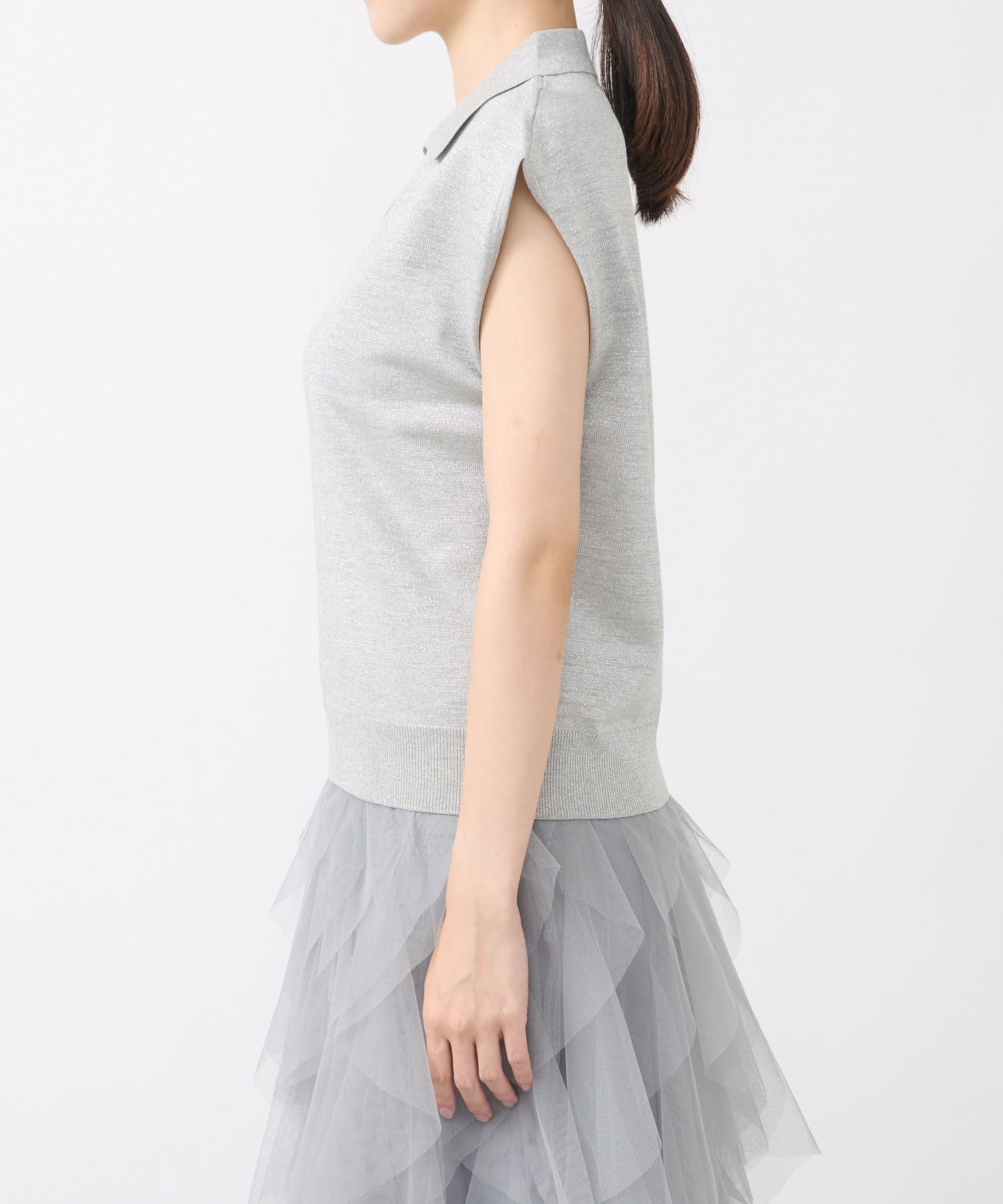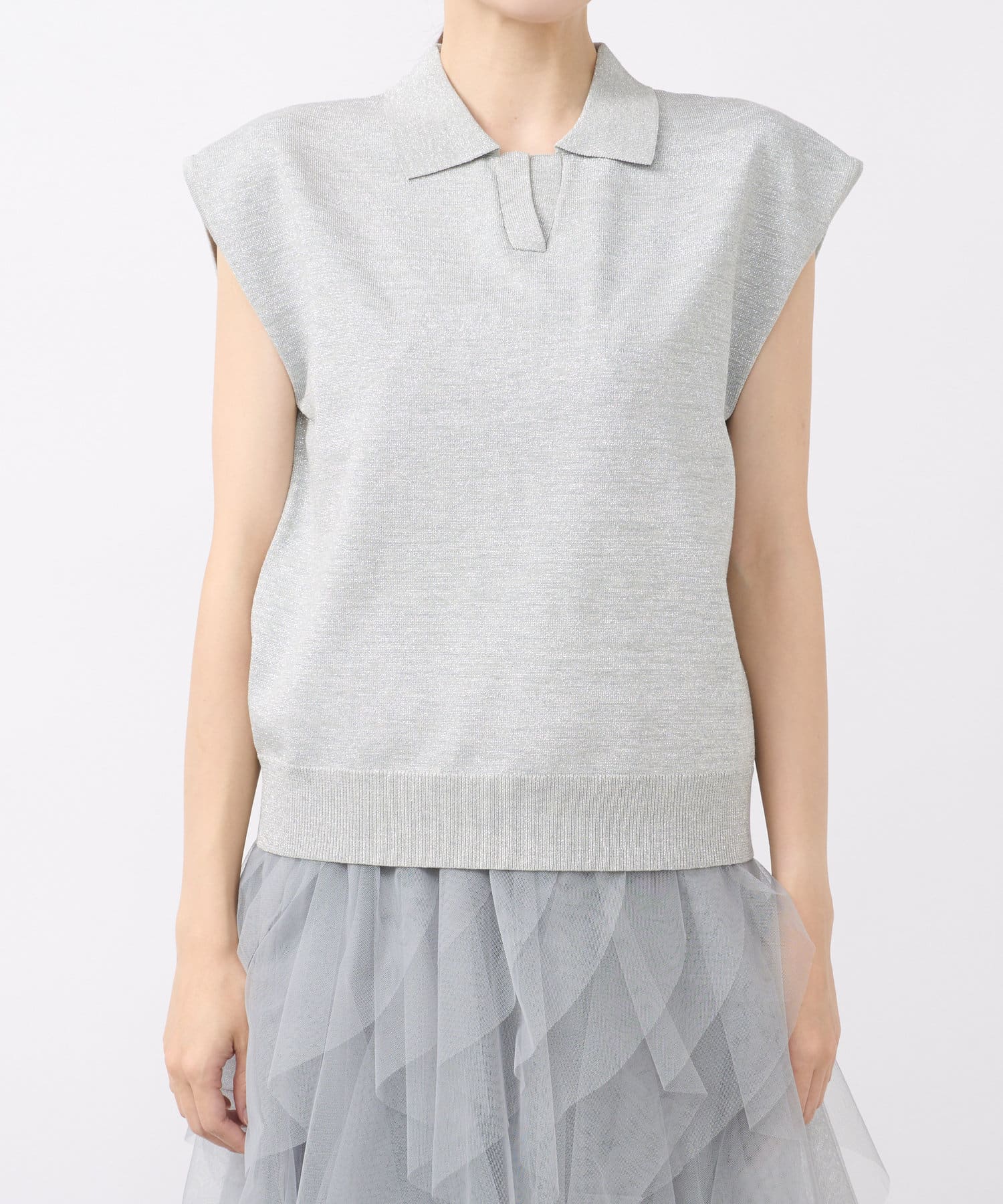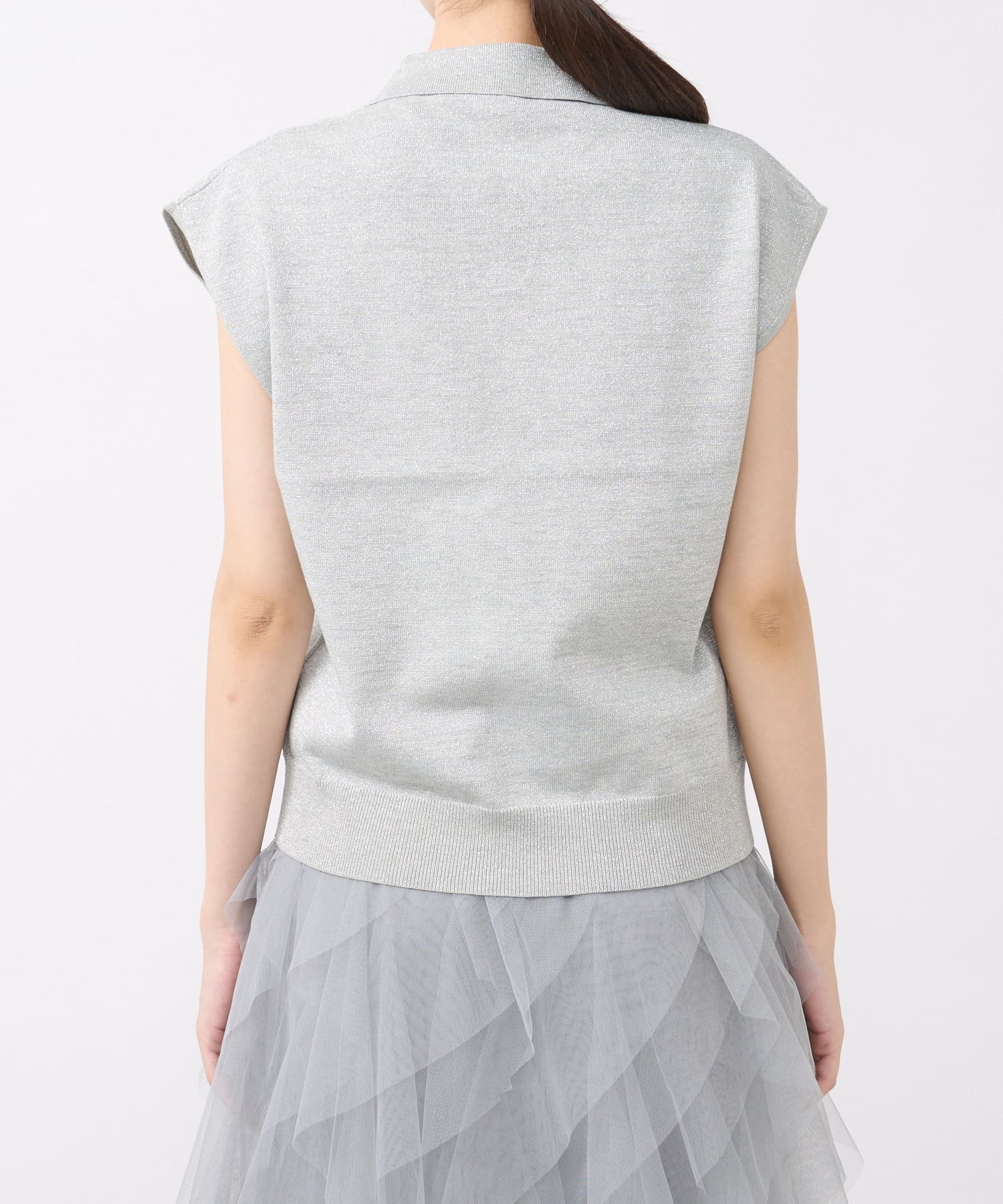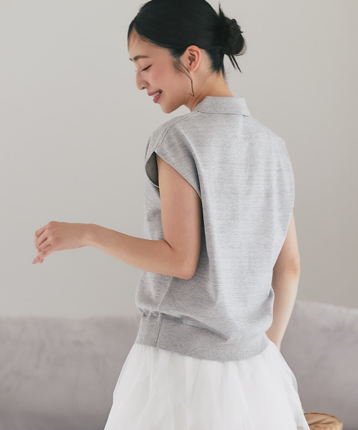襟元のすっきりしたデザインとラメの上品さで、カジュアルでもキレイ目に着こなせます。