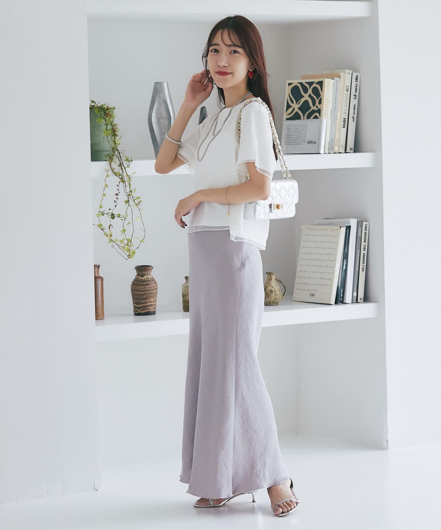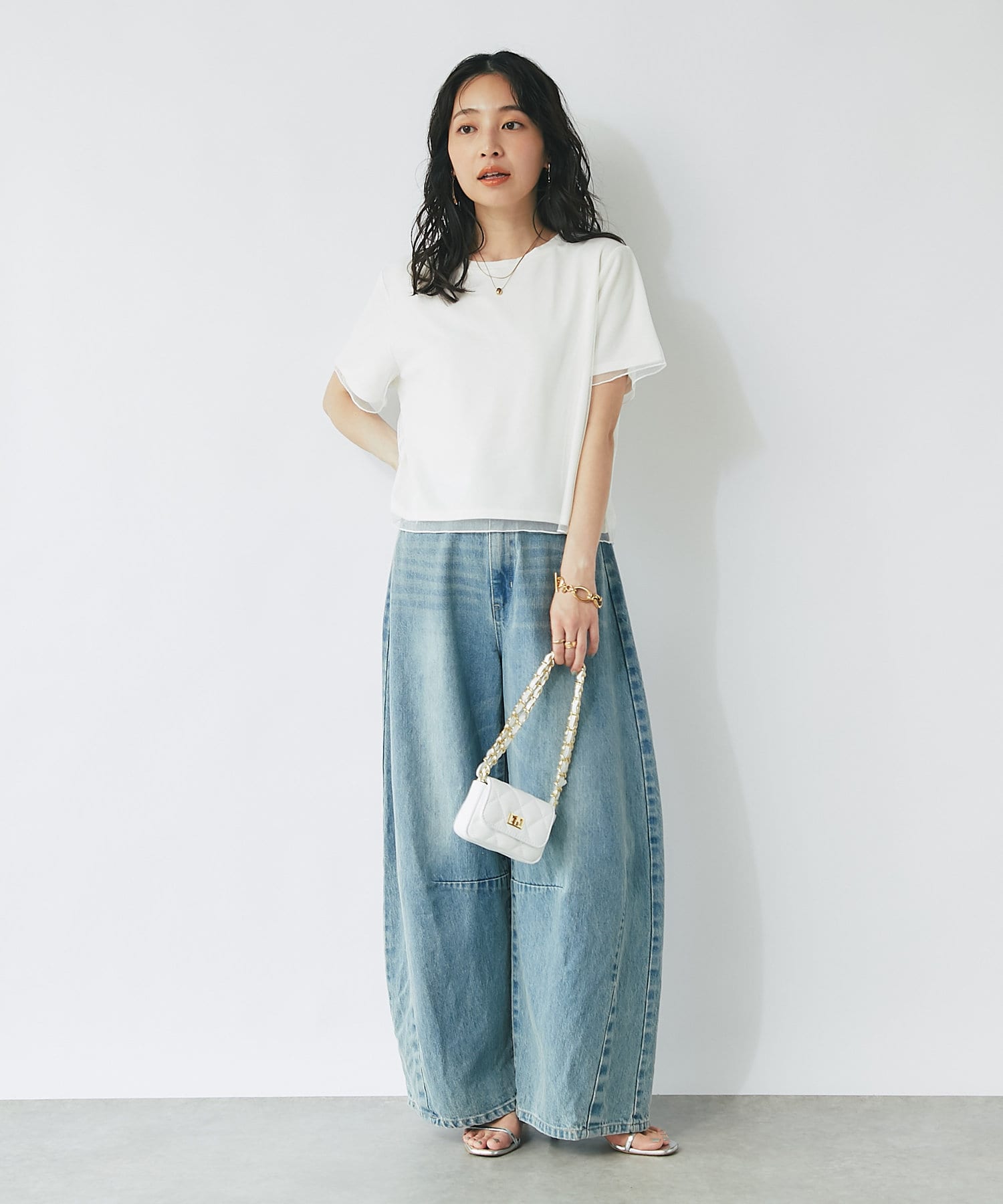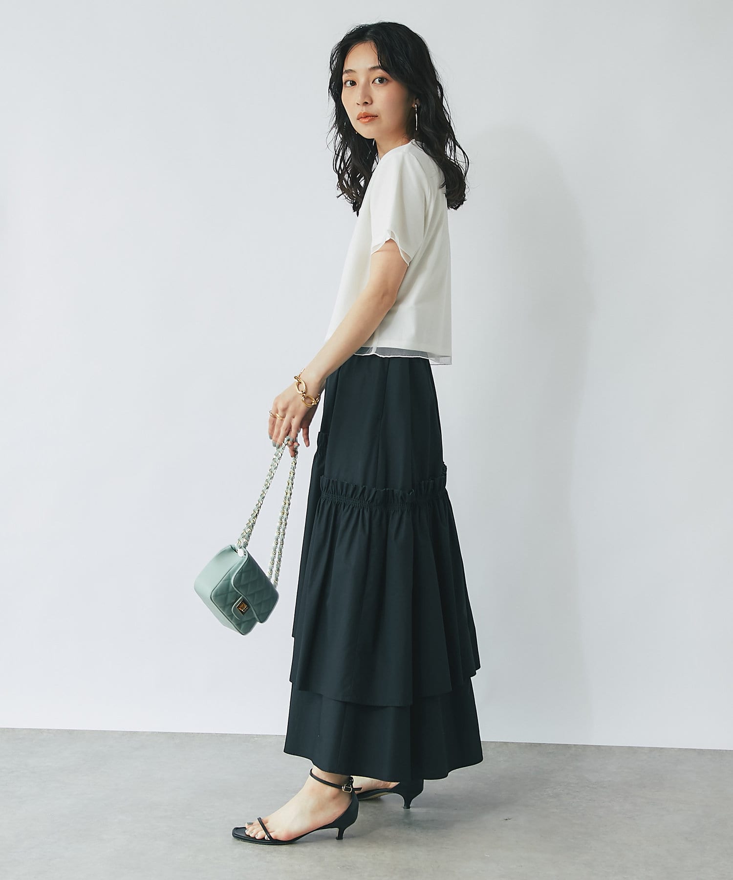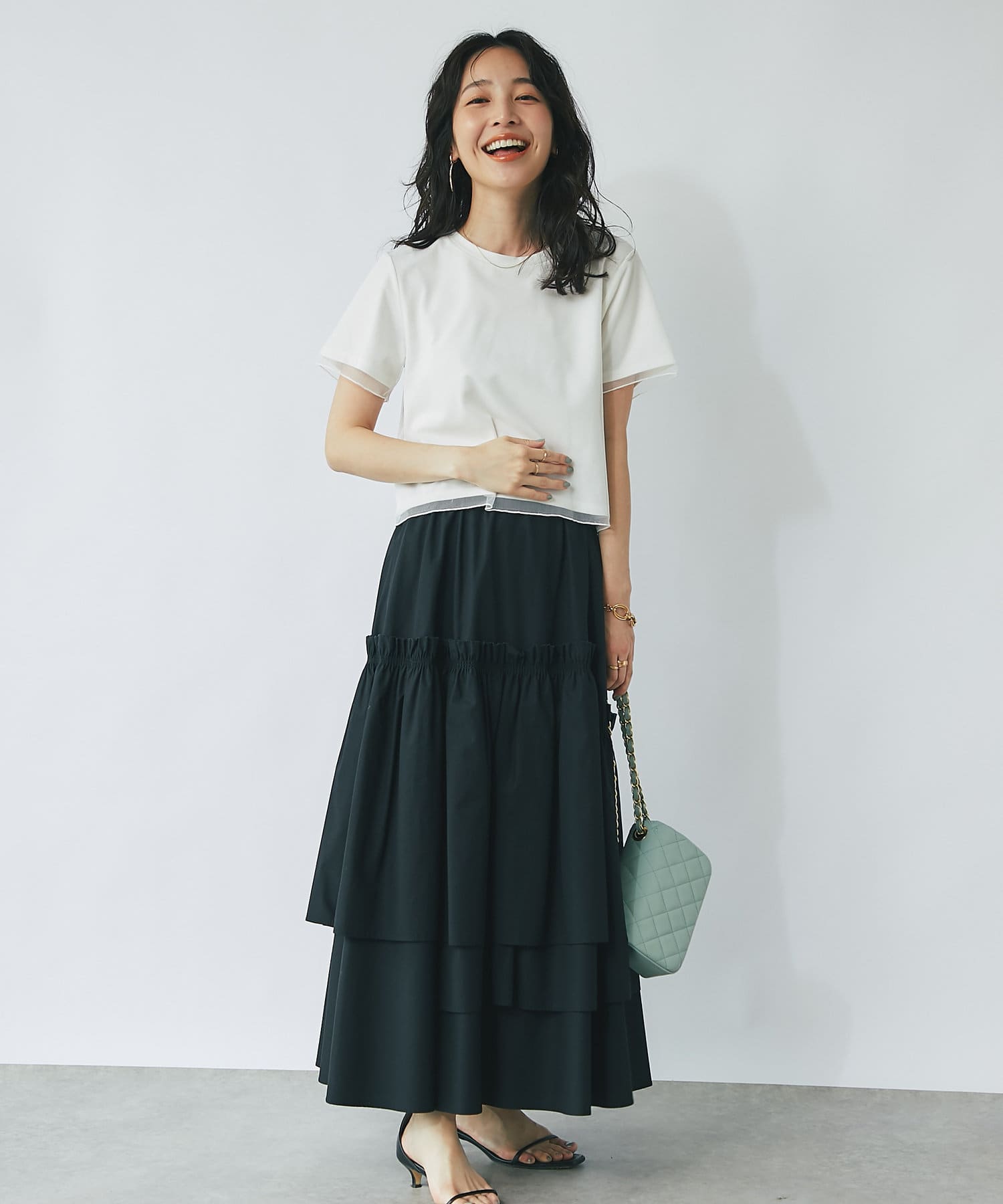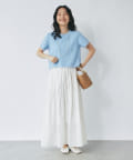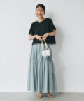 コンパクトなPSサイズにボリュームのあるスカートやパンツをを合わせるのがおすすめ。