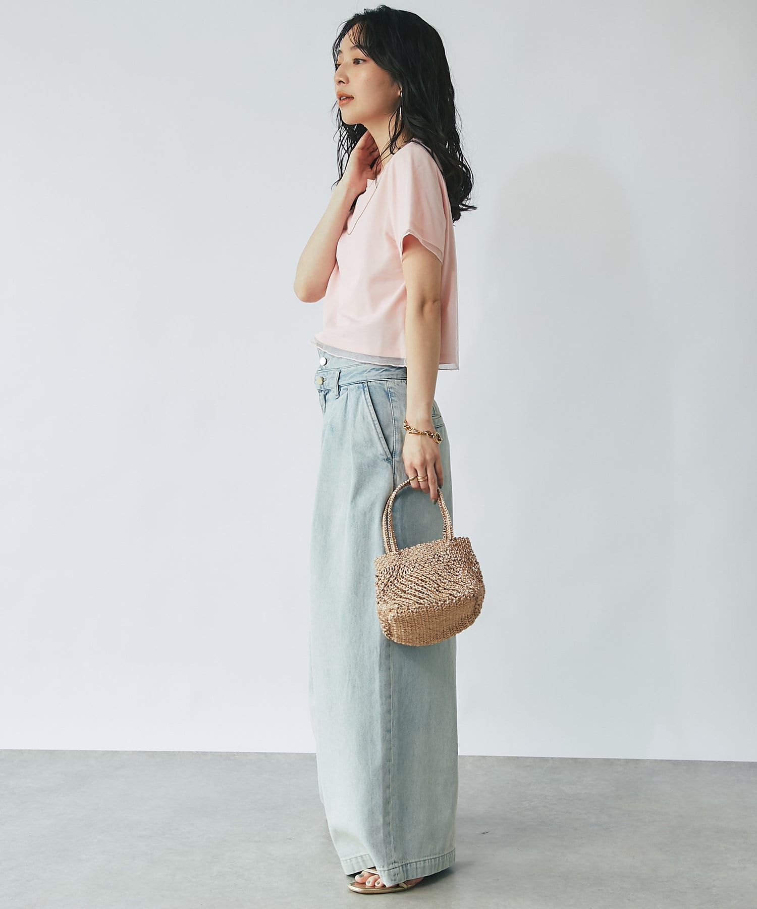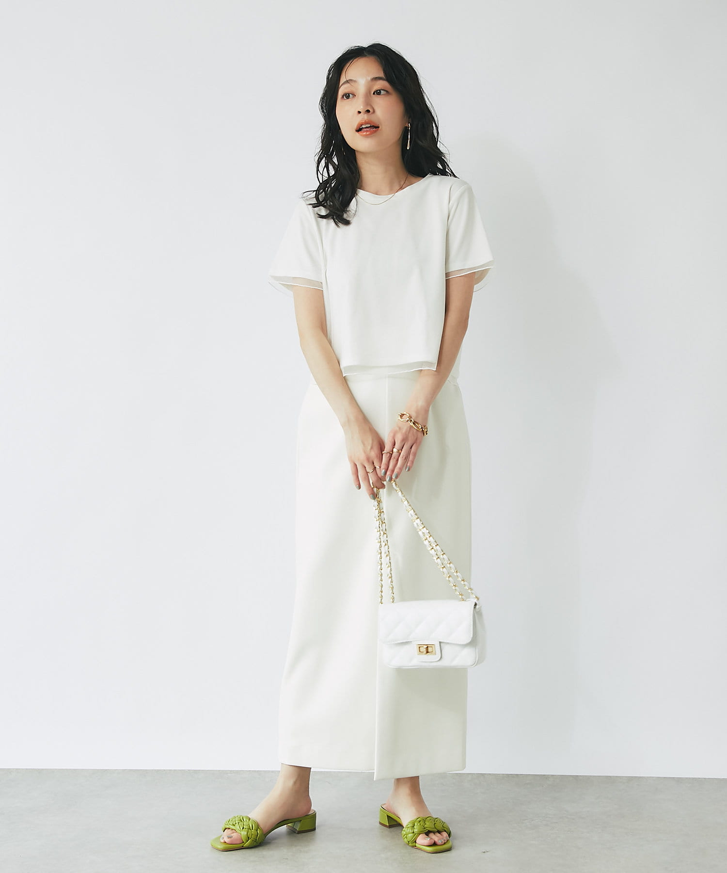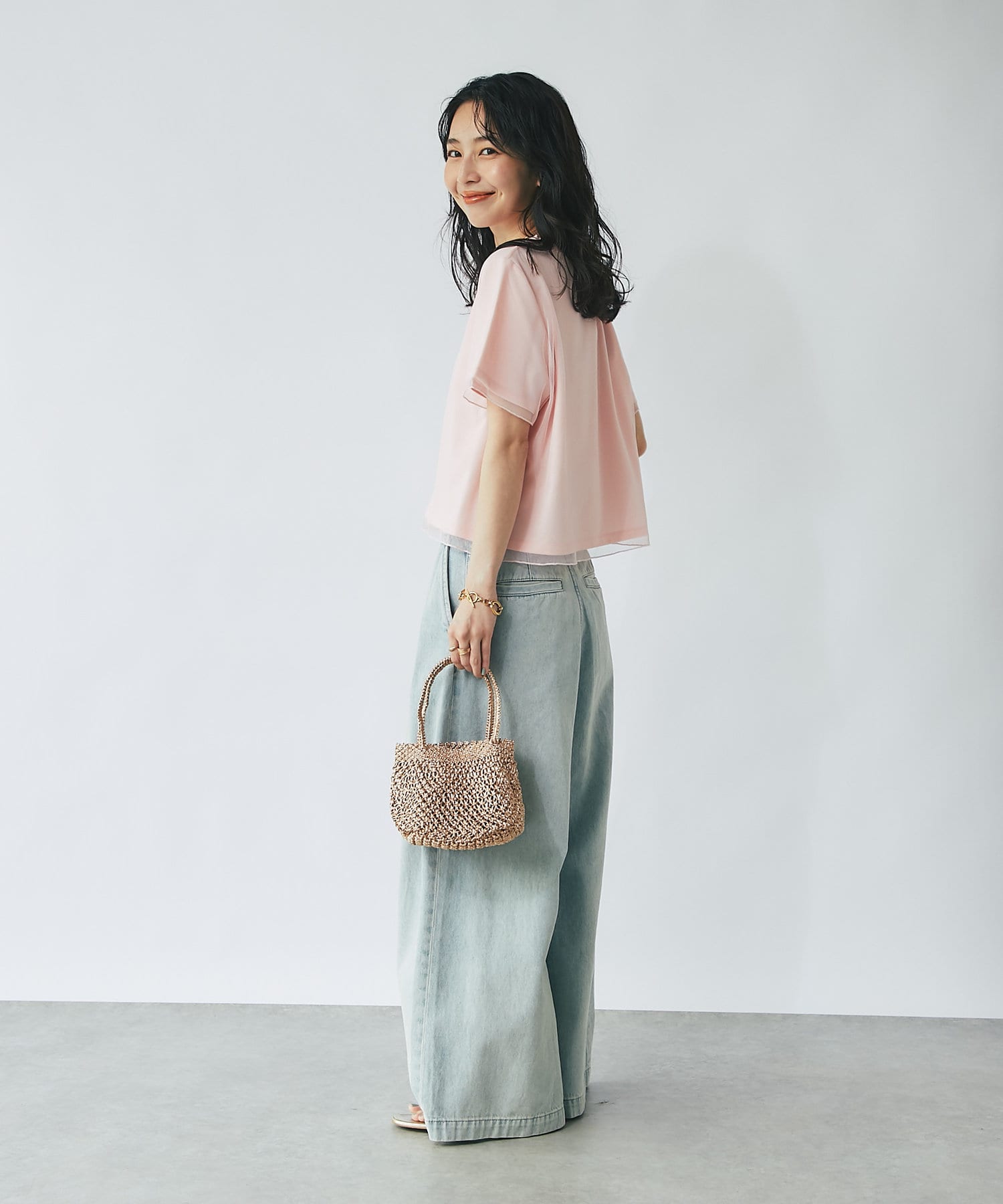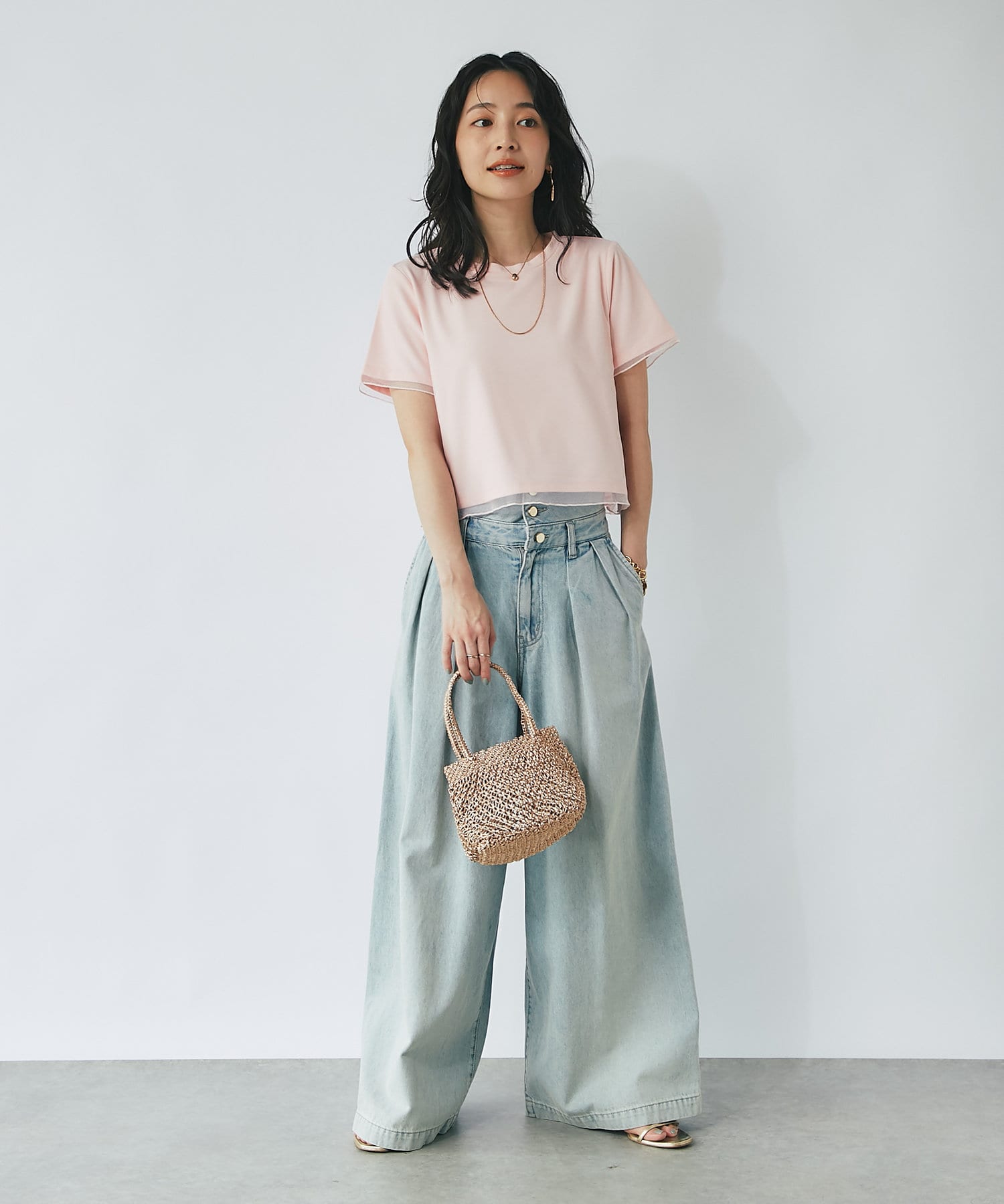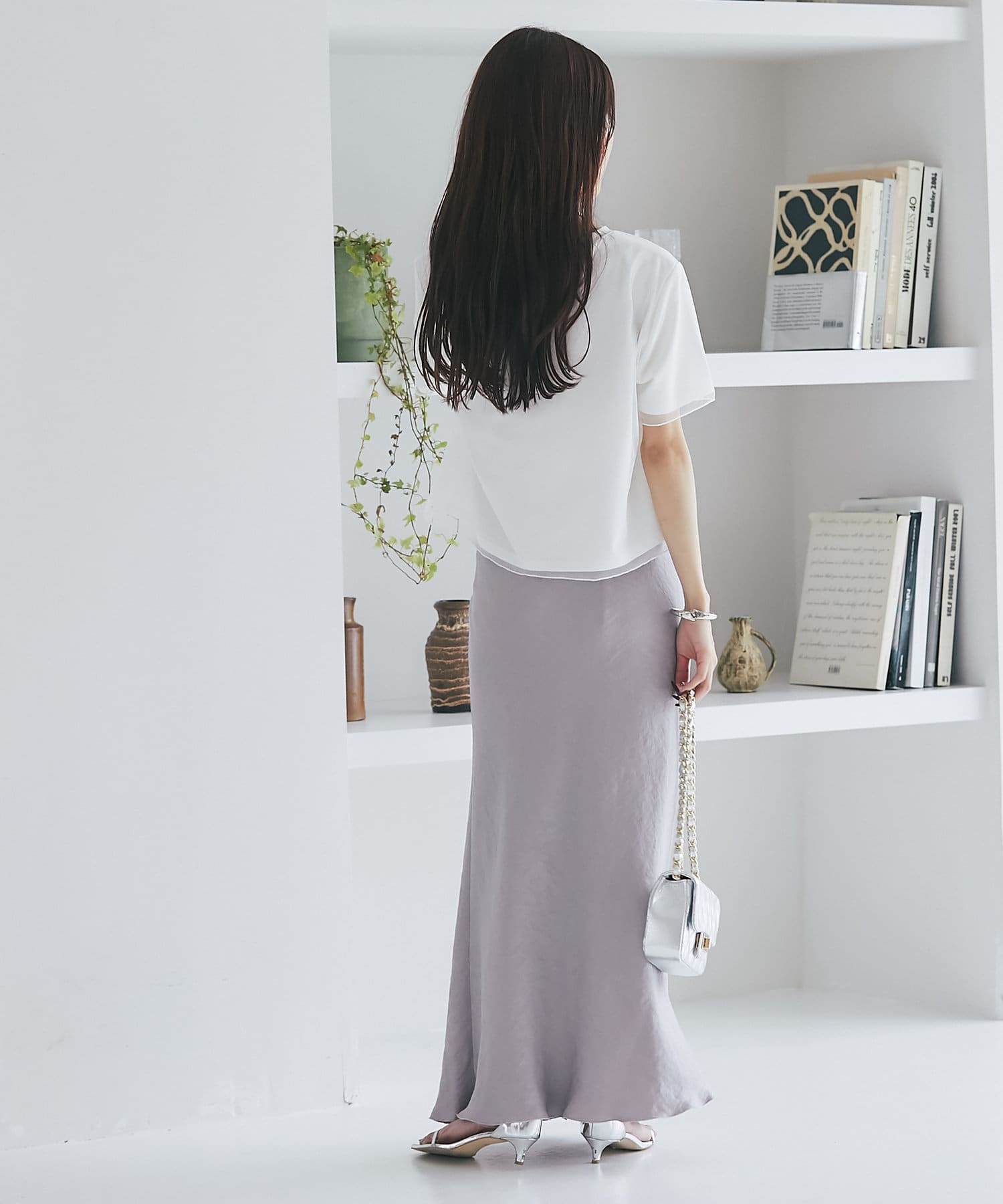 コンパクトなPSサイズにボリュームのあるスカートやパンツをを合わせるのがおすすめ。