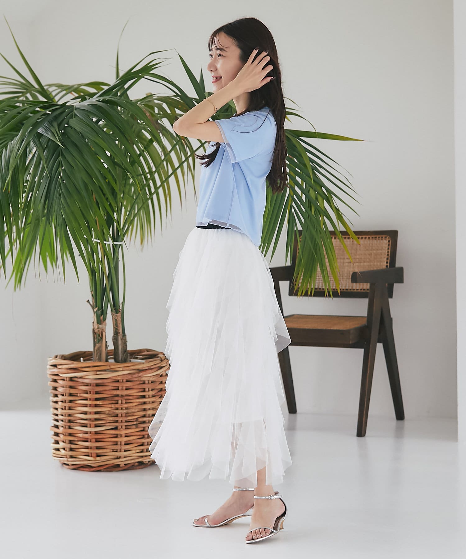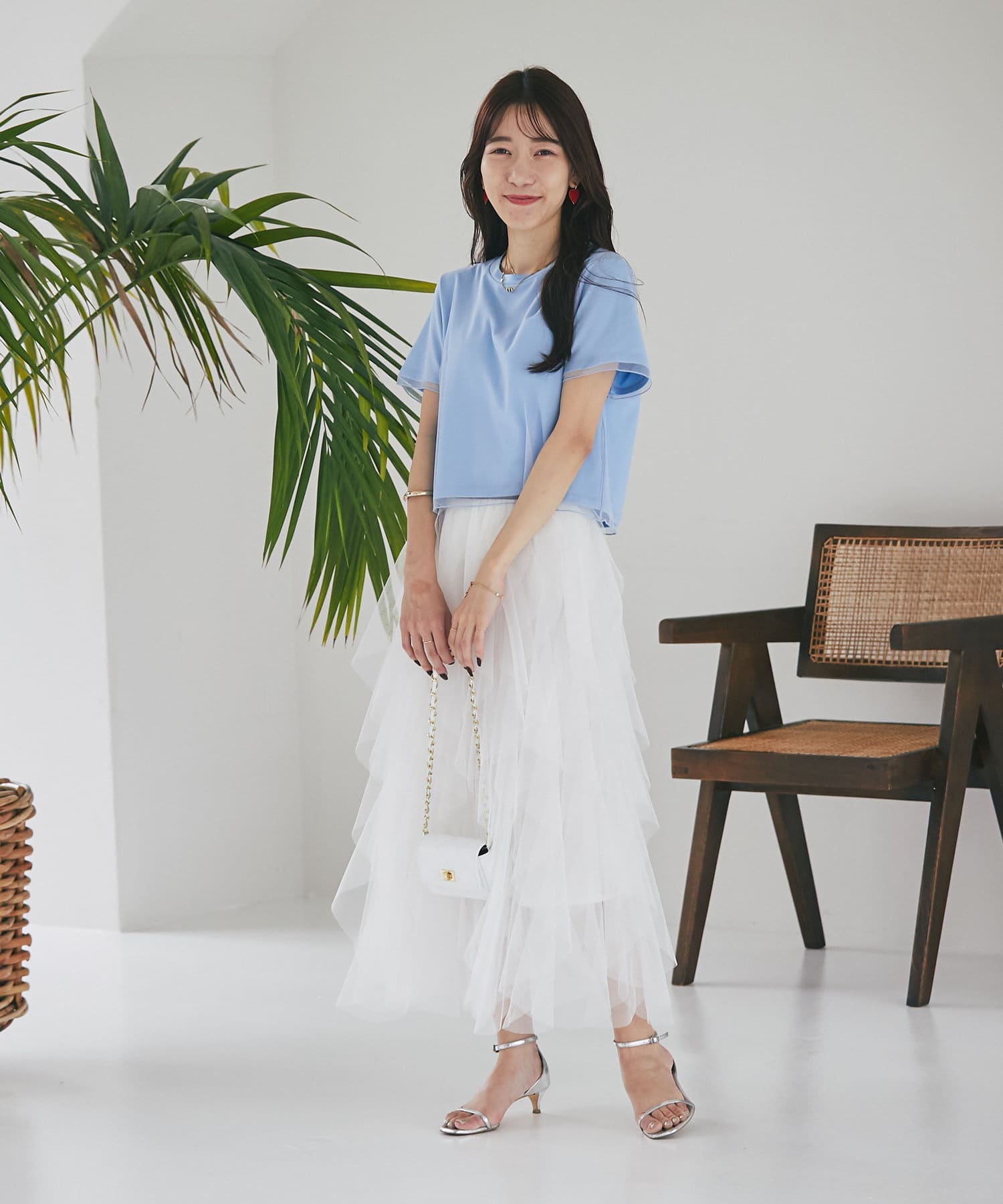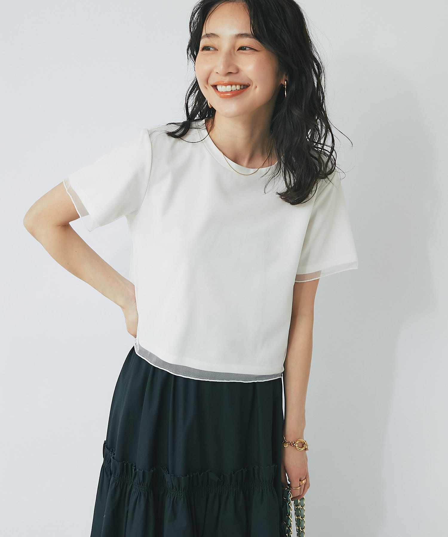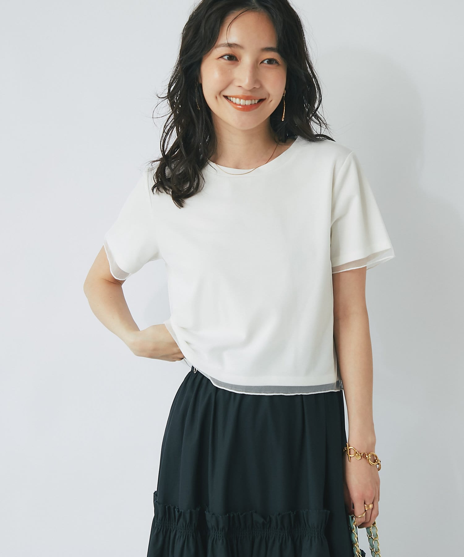 シンプルなカットソーにエアリーなチュールを重ね女性らしく仕上げたデザイン。