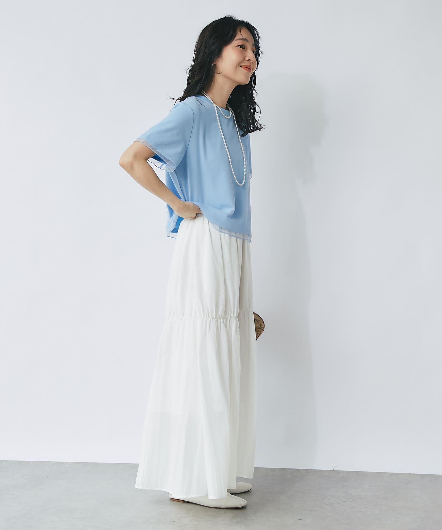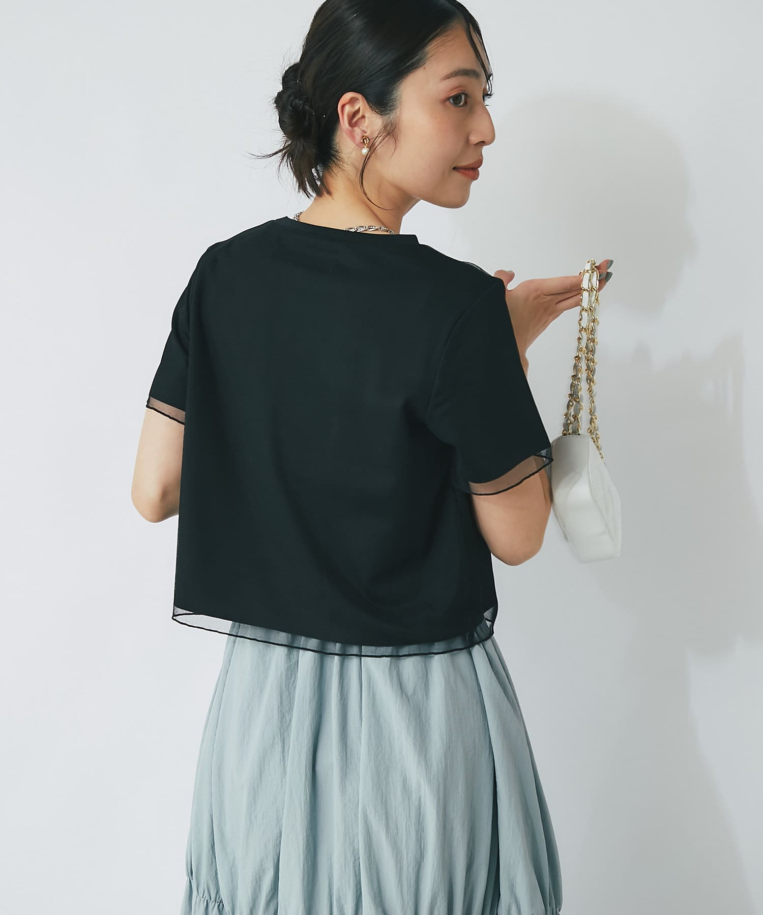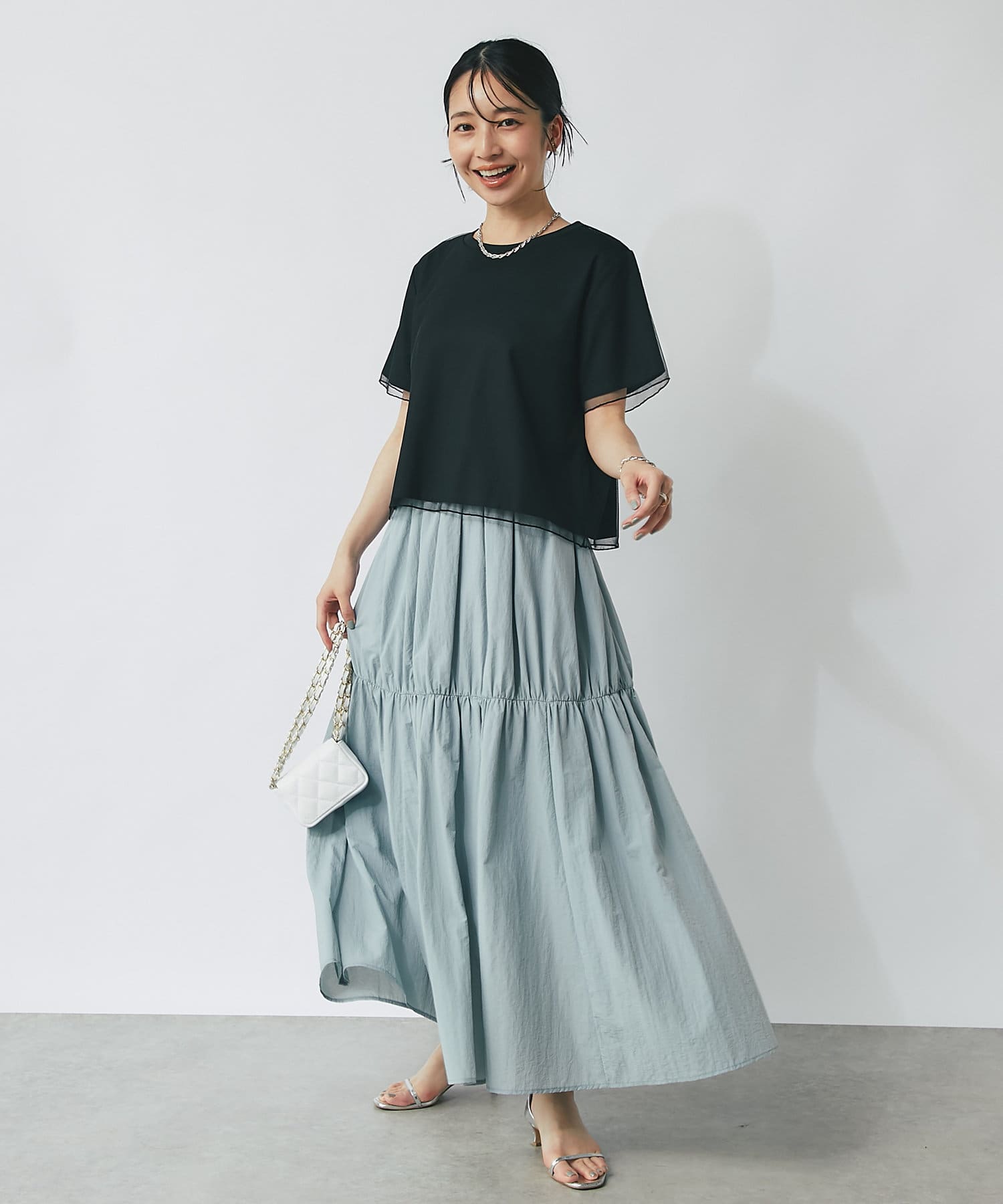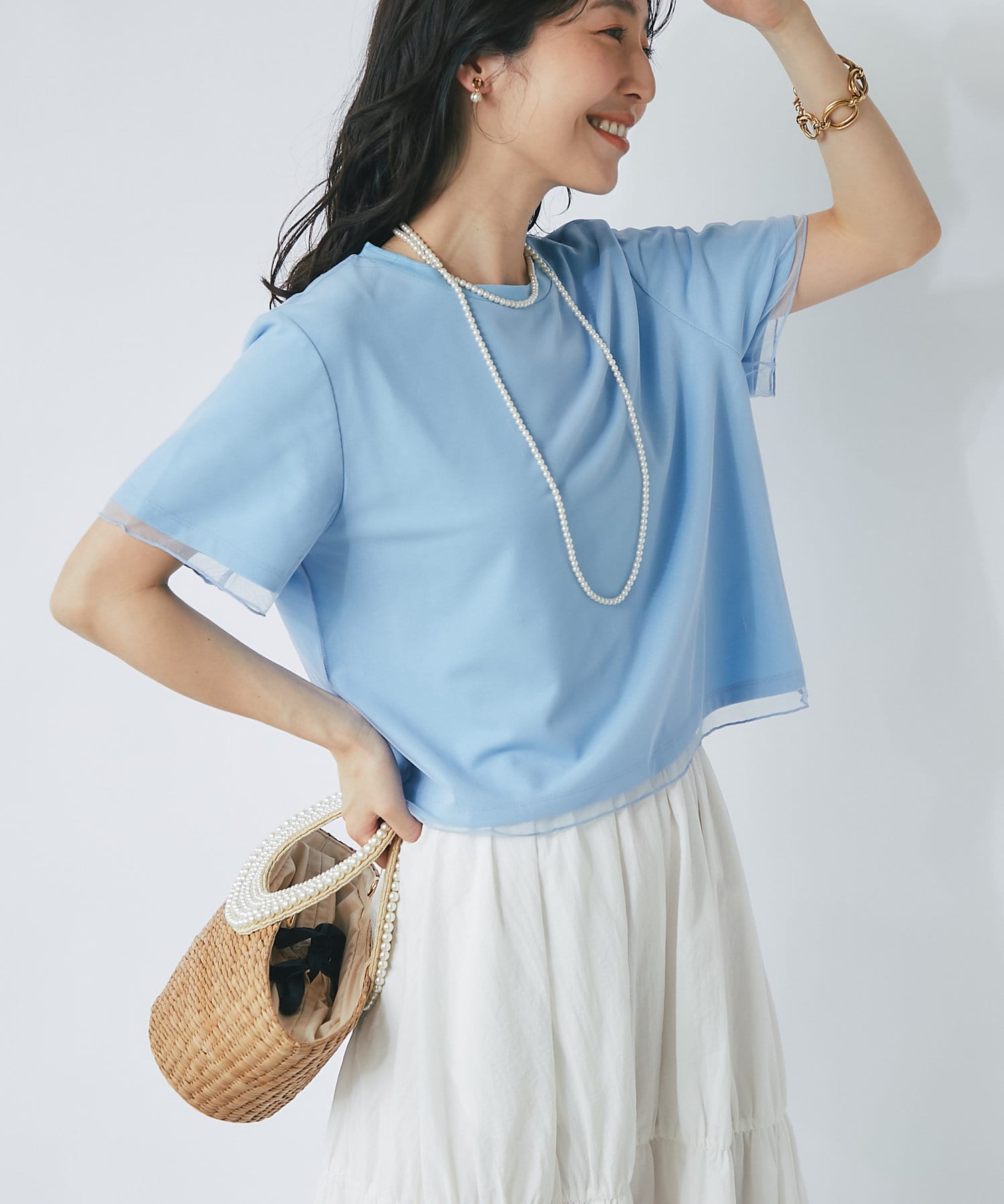 シンプルなカットソーにエアリーなチュールを重ね女性らしく仕上げたデザイン。