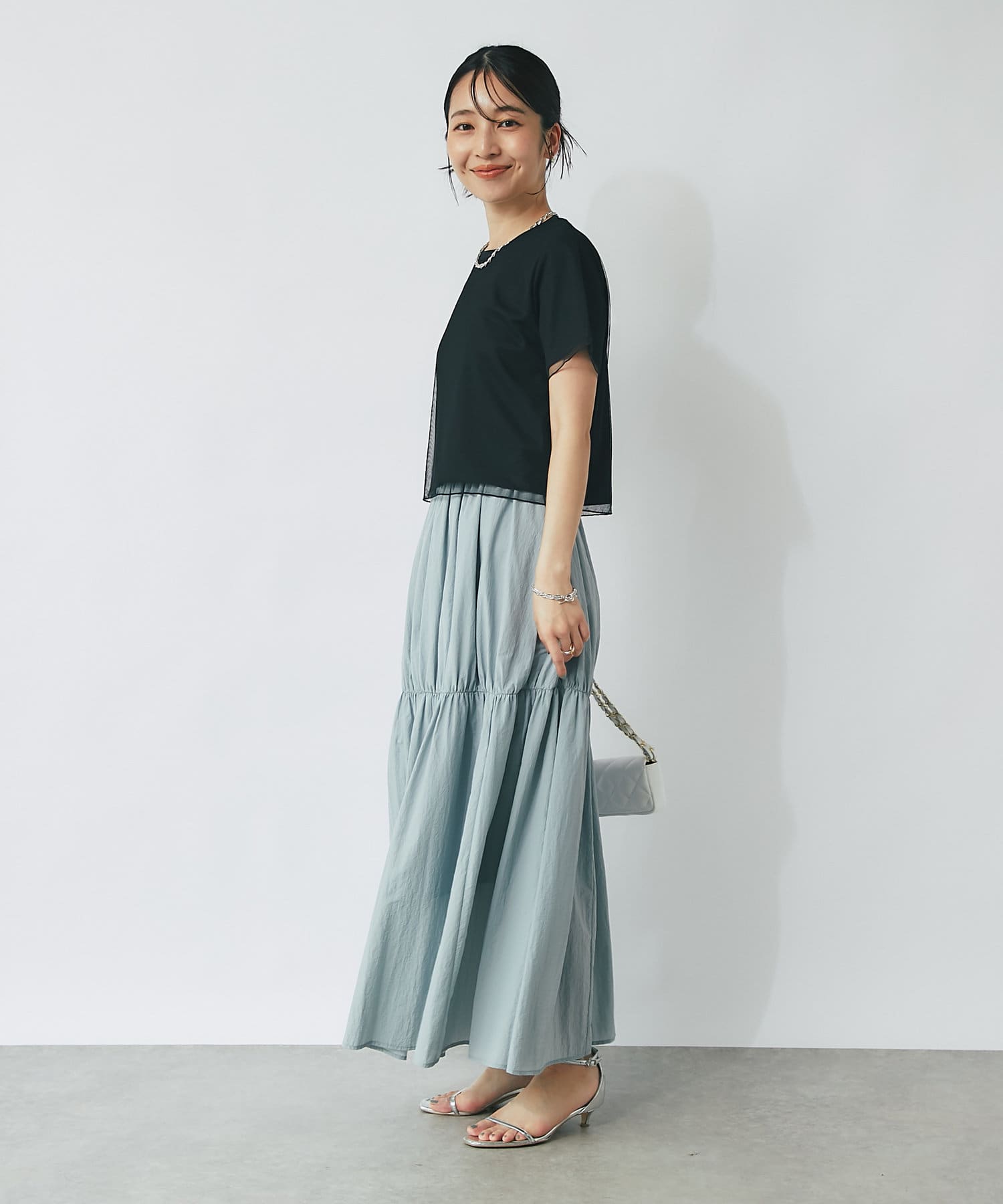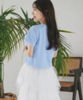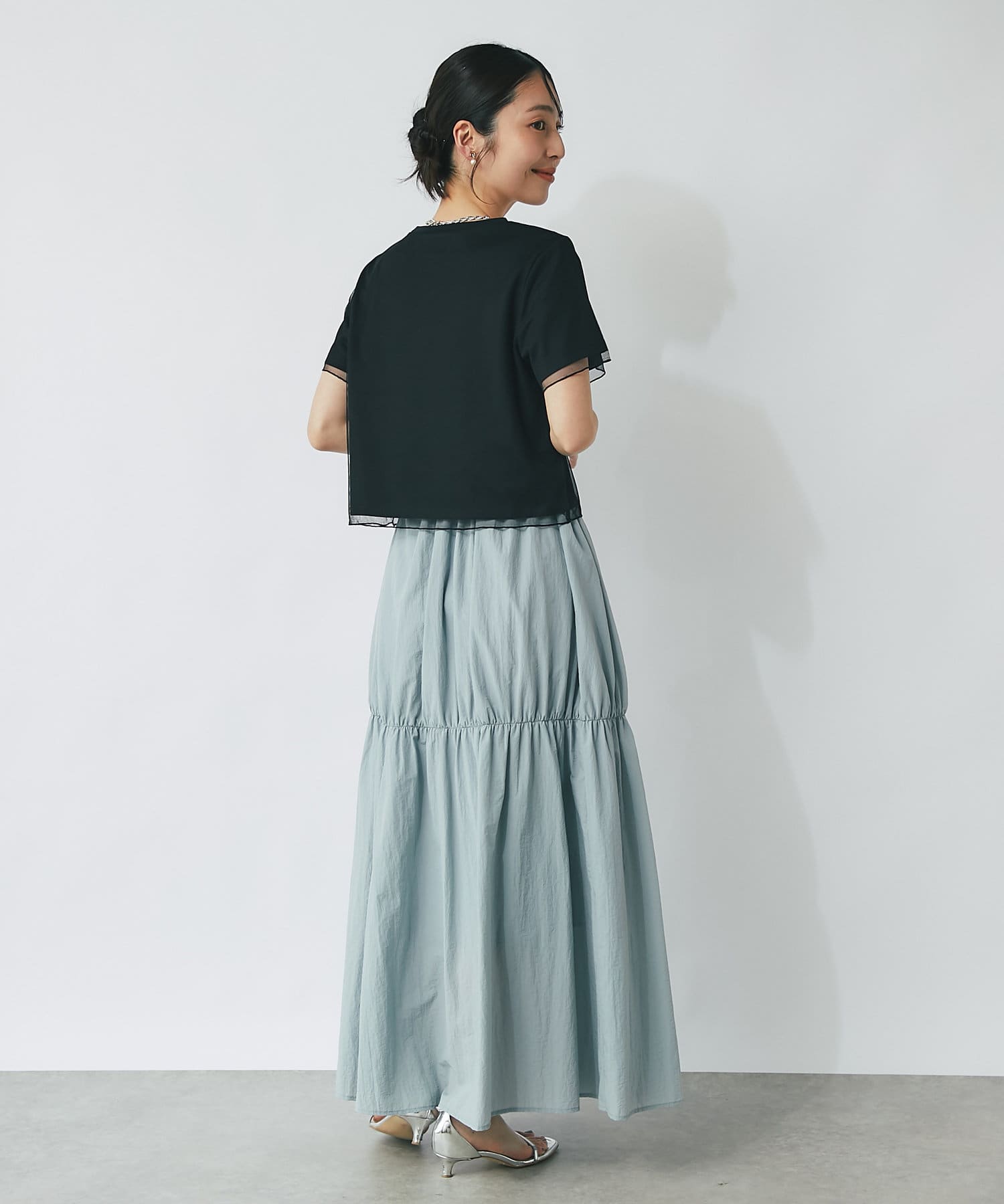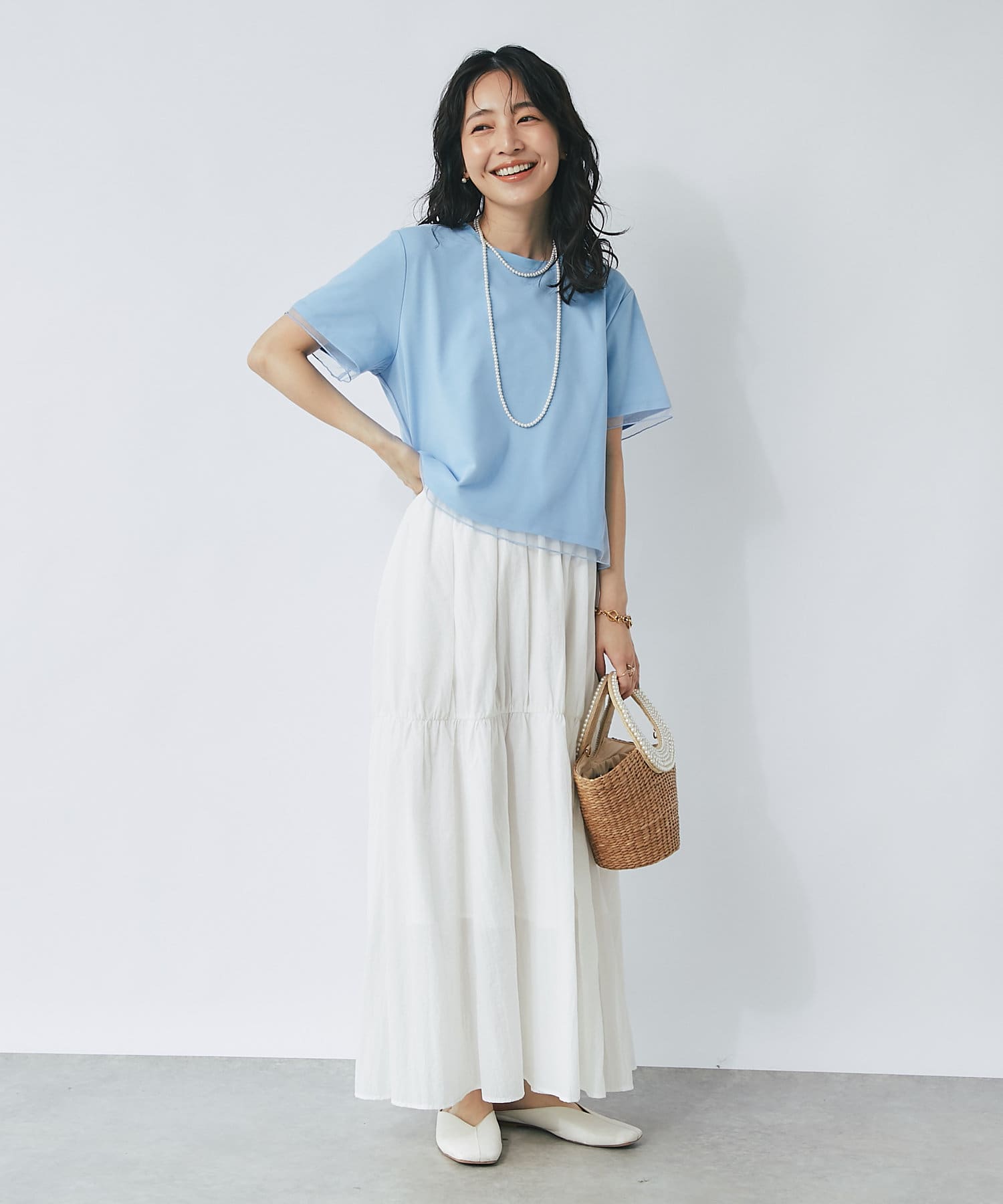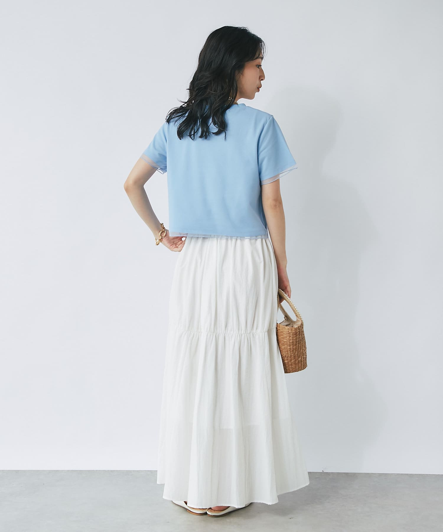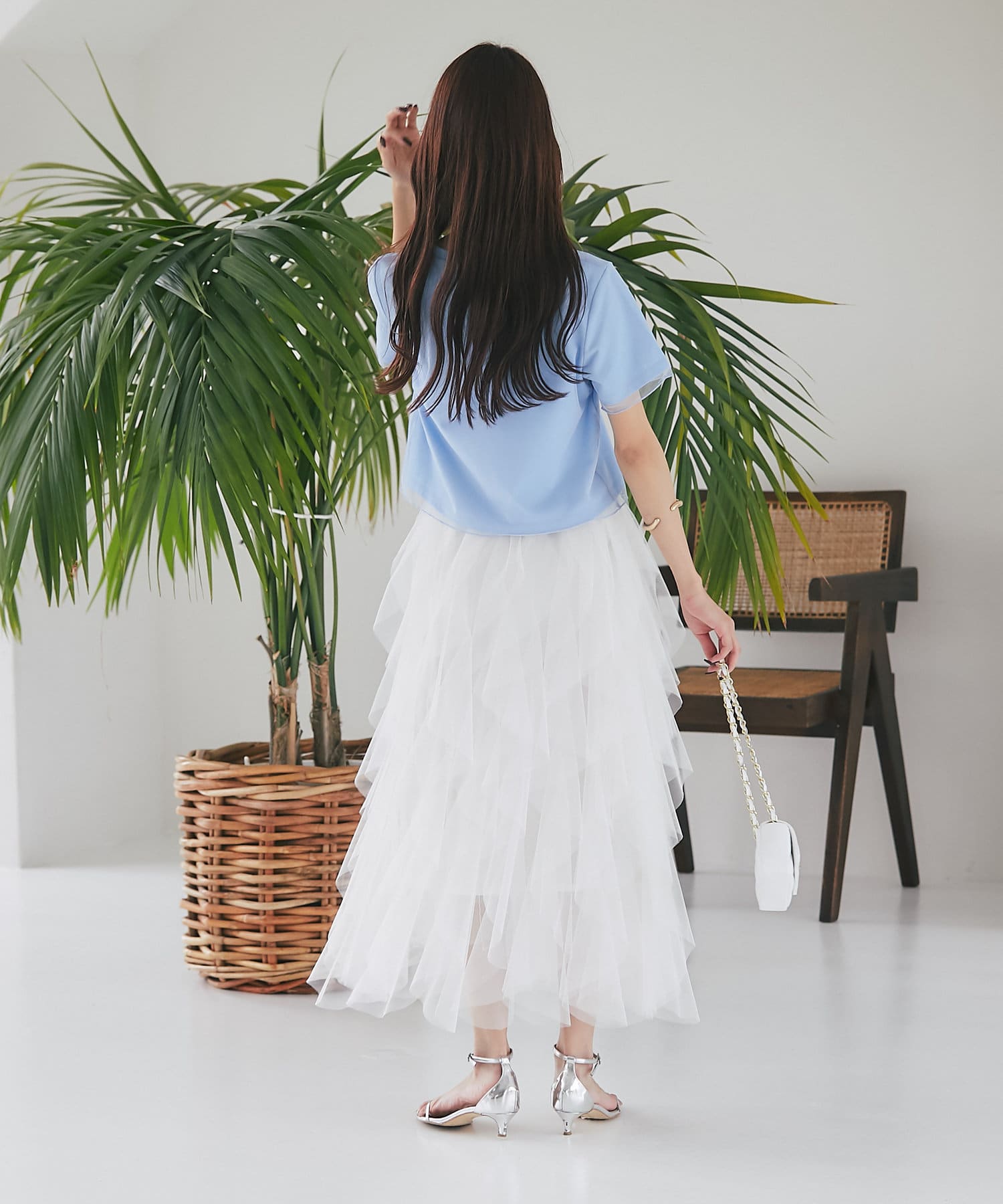 シンプルなカットソーにエアリーなチュールを重ね女性らしく仕上げたデザイン。