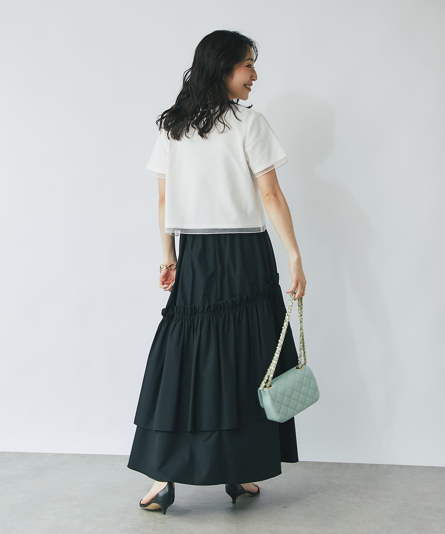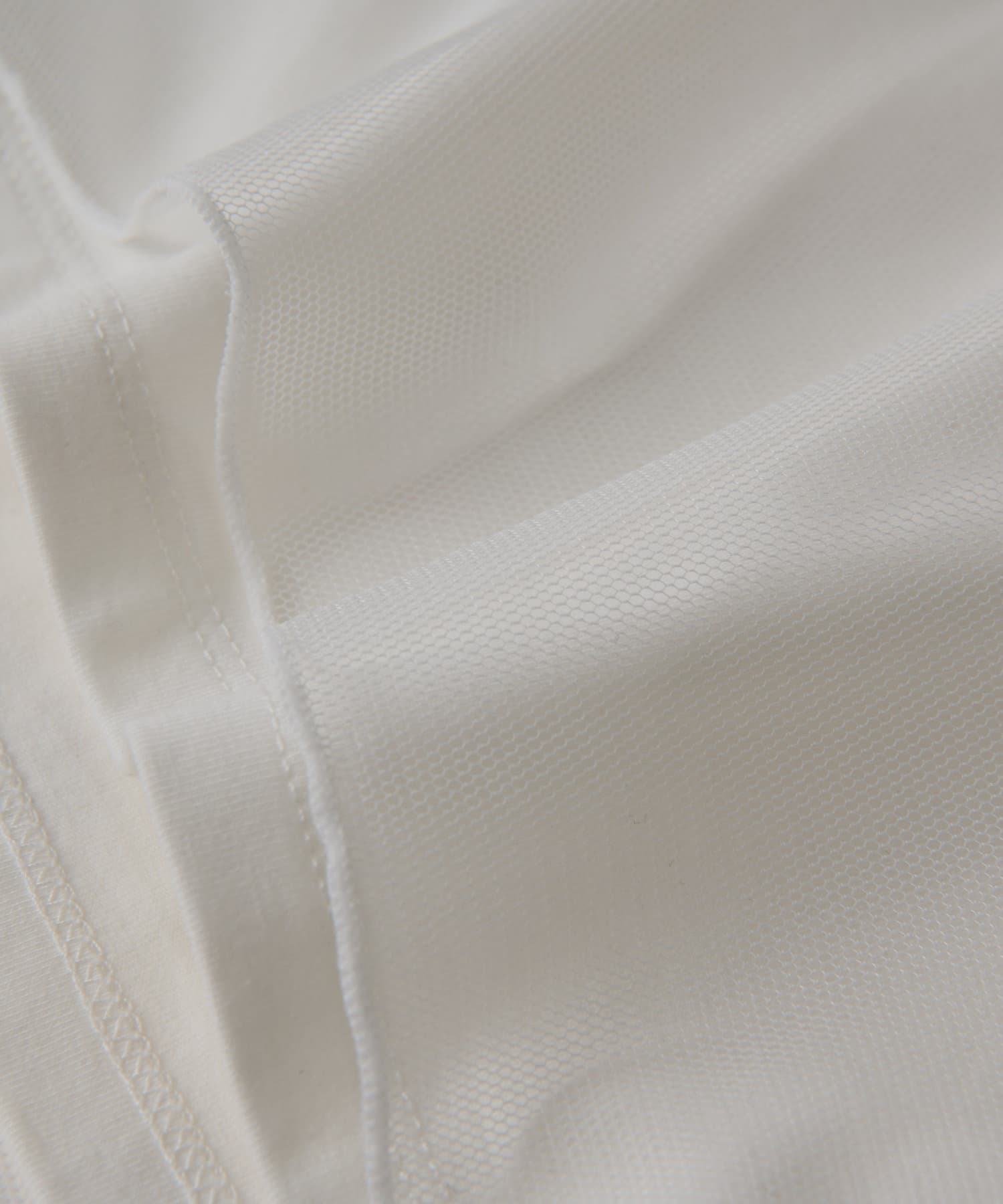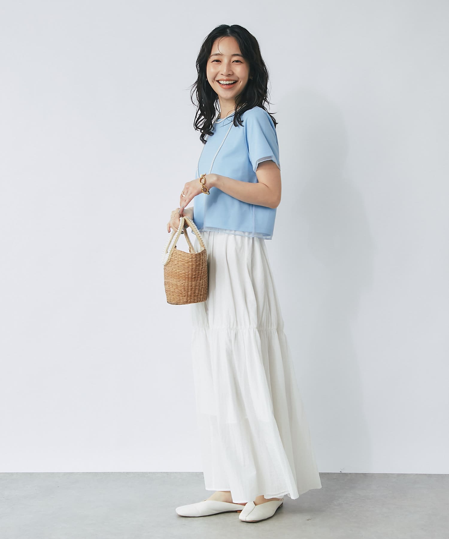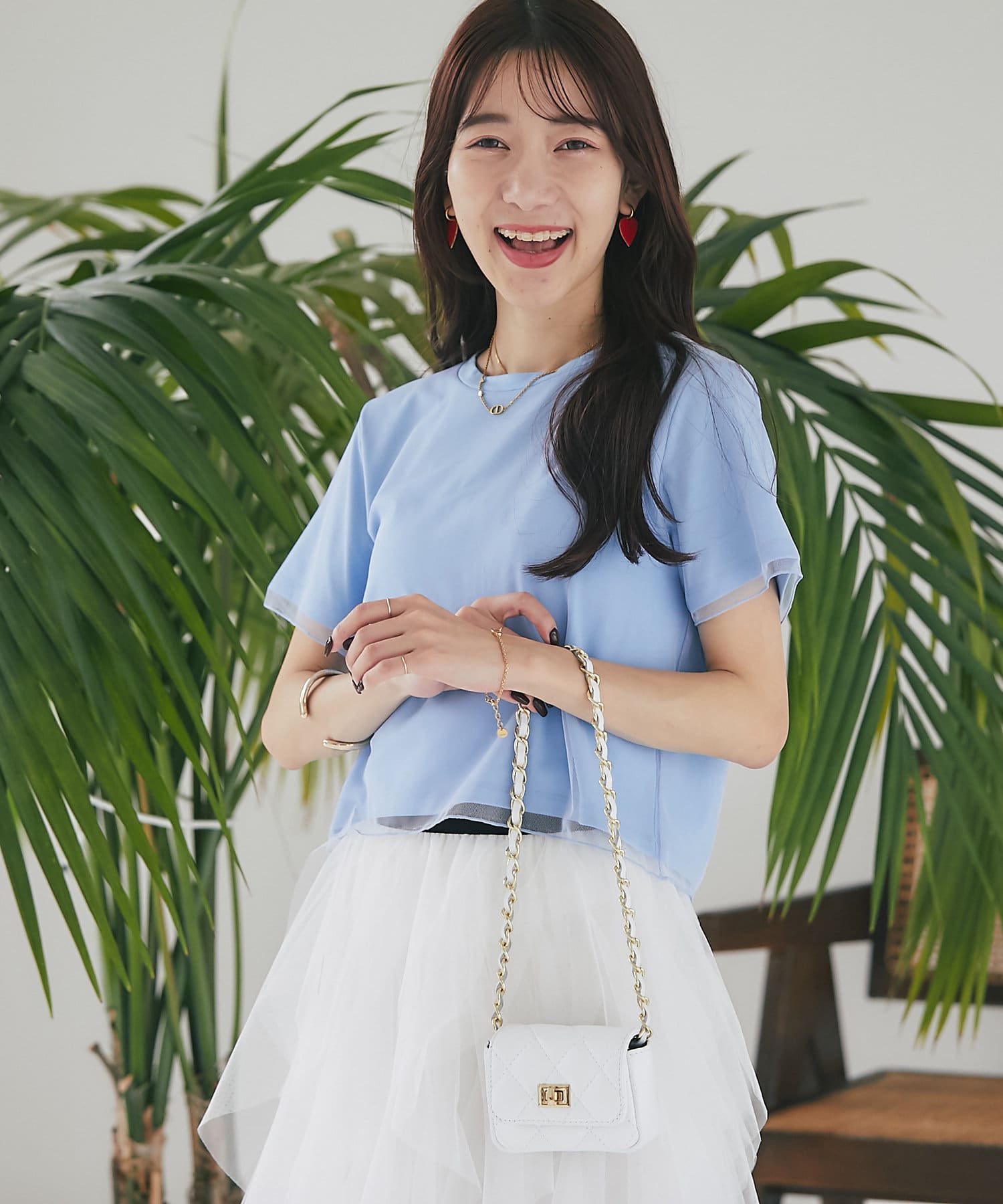 シンプルなカットソーにエアリーなチュールを重ね女性らしく仕上げたデザイン。