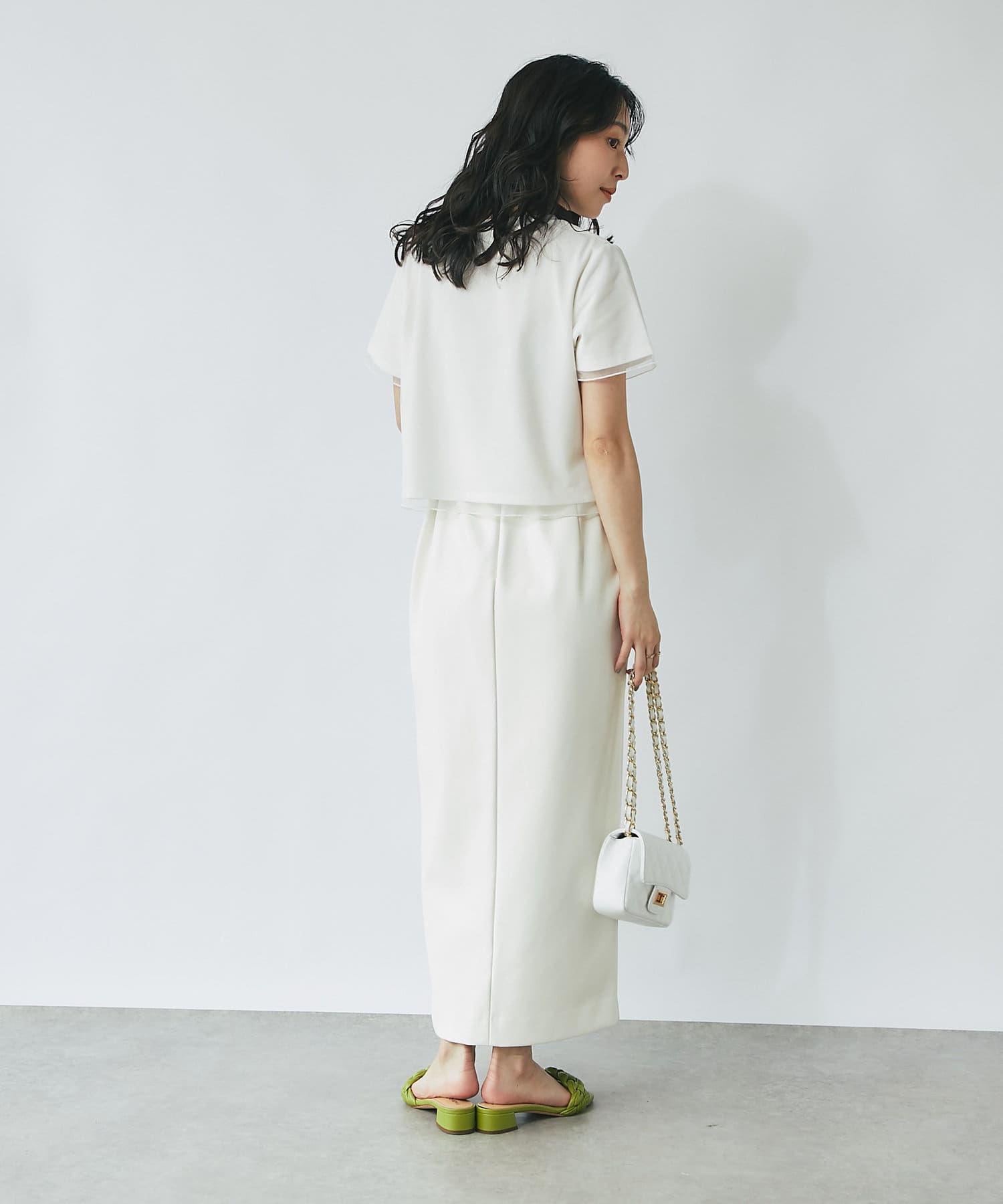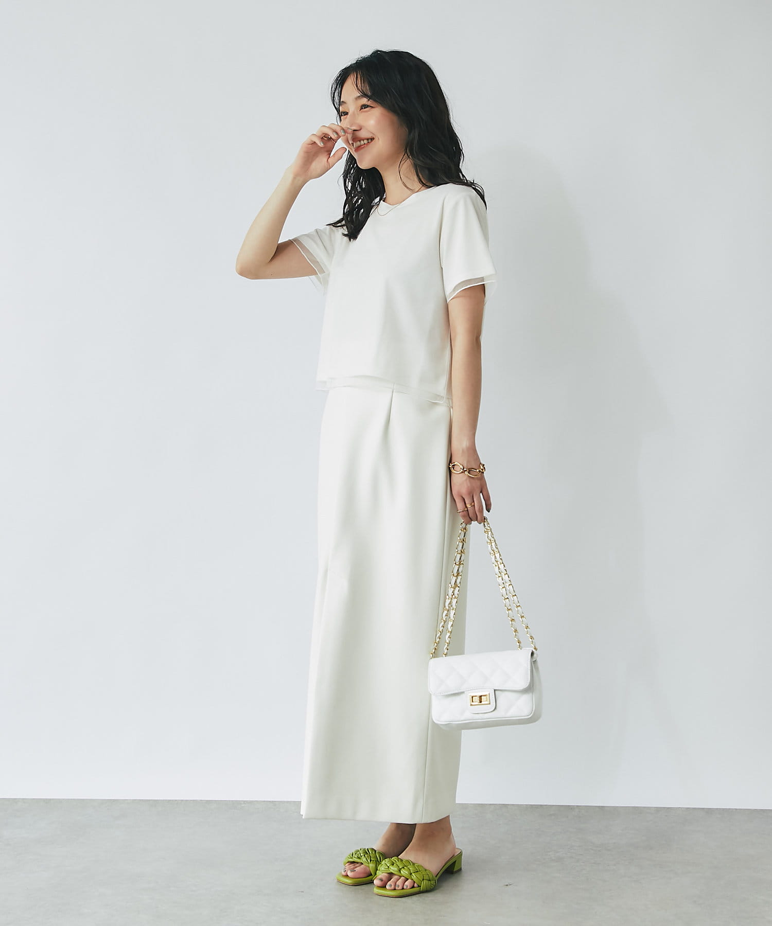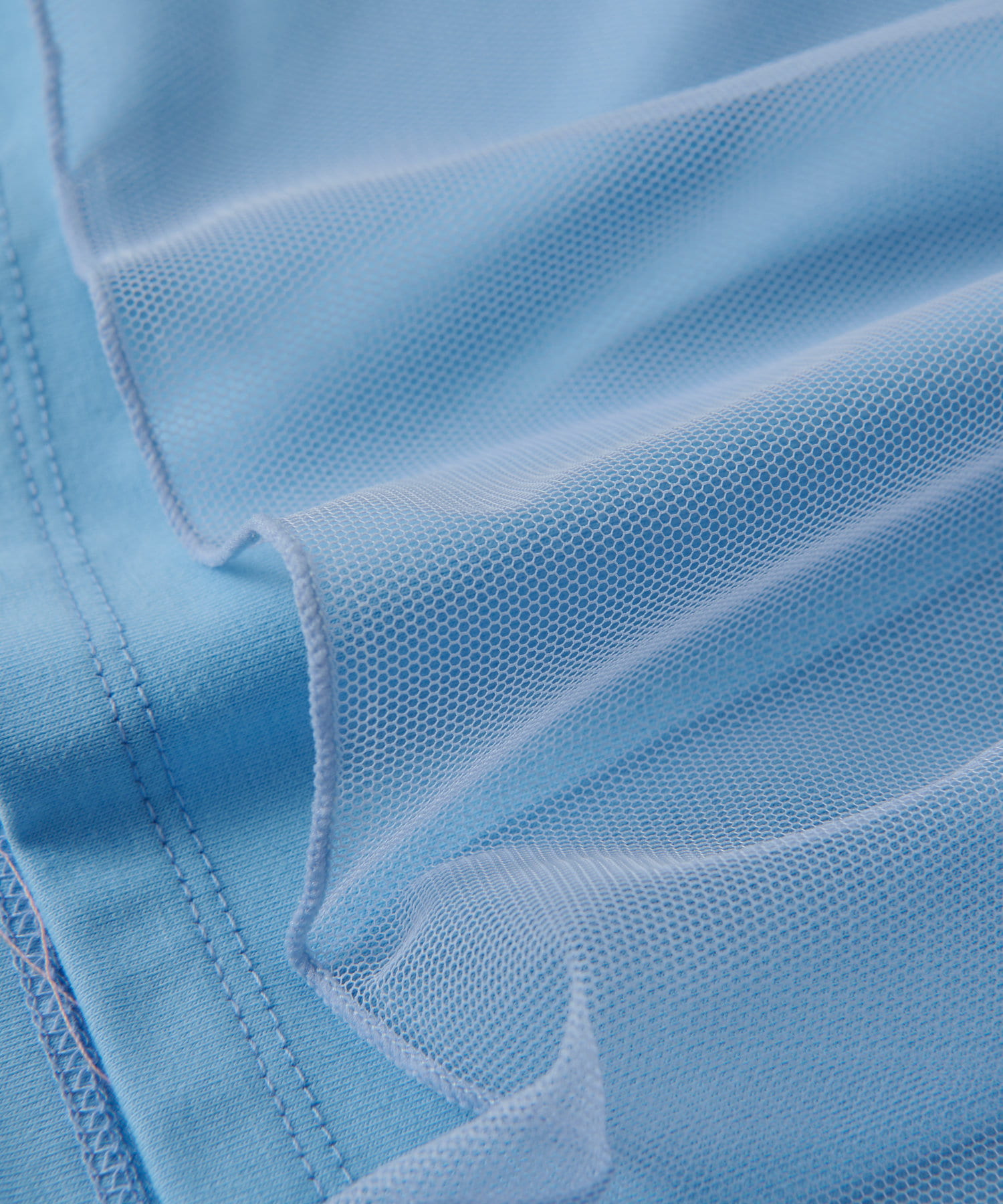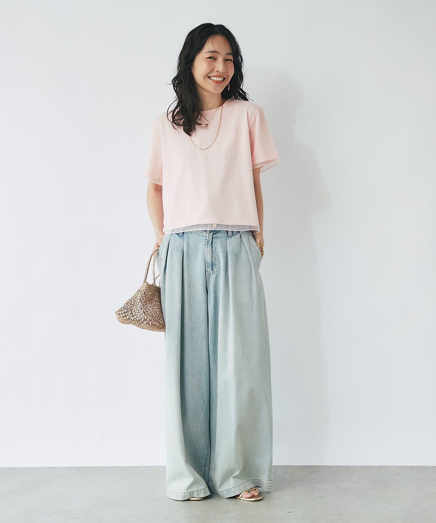 シンプルなカットソーにエアリーなチュールを重ね女性らしく仕上げたデザイン。