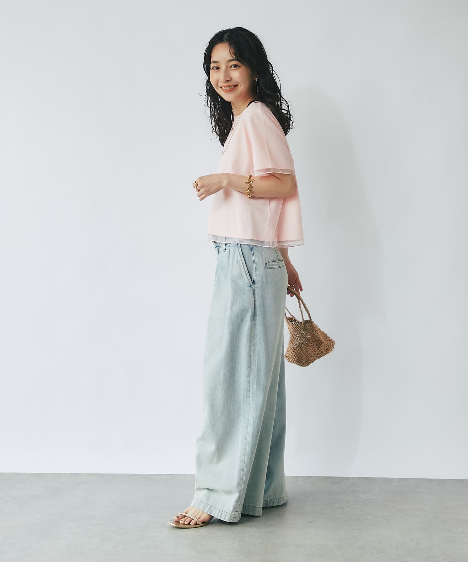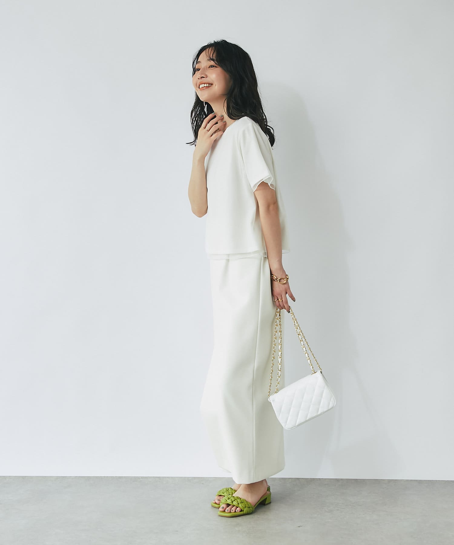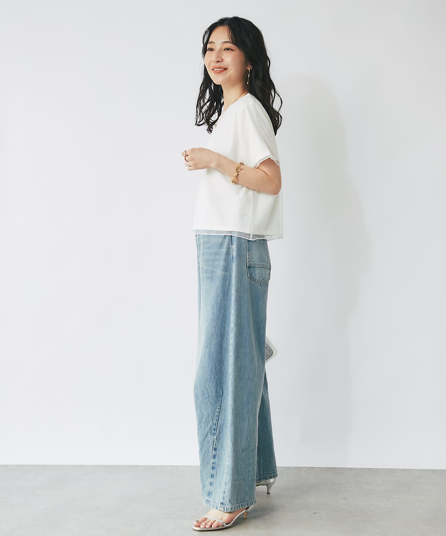 シンプルなので、オフィススタイルからデイリースタイルまでボトムを選ばず着用できます。