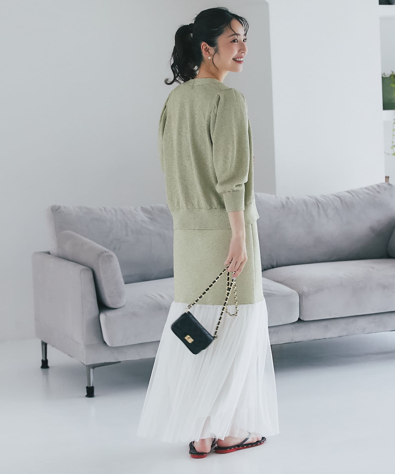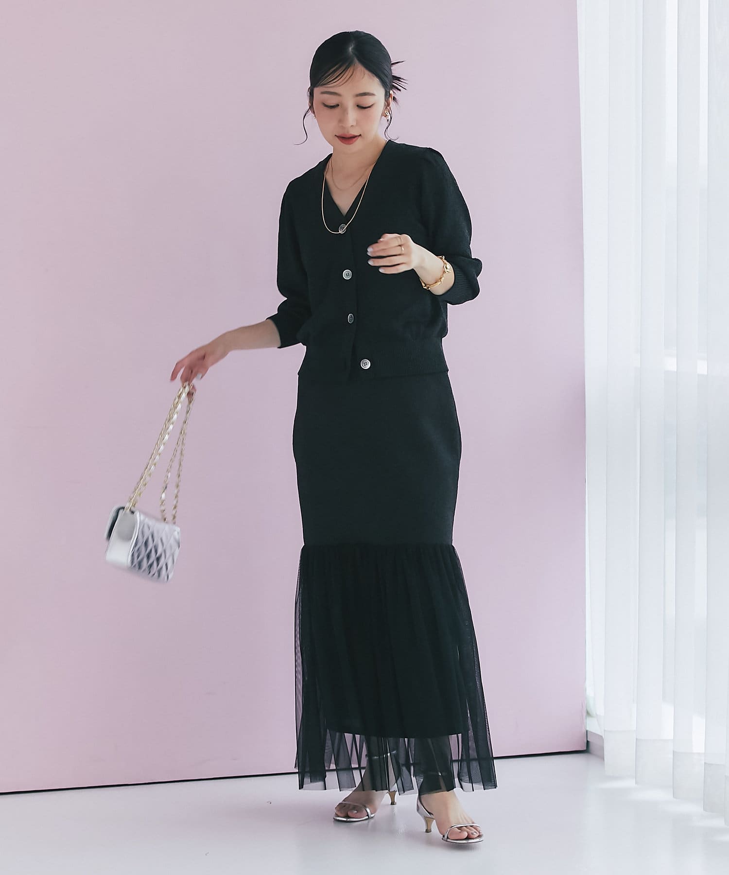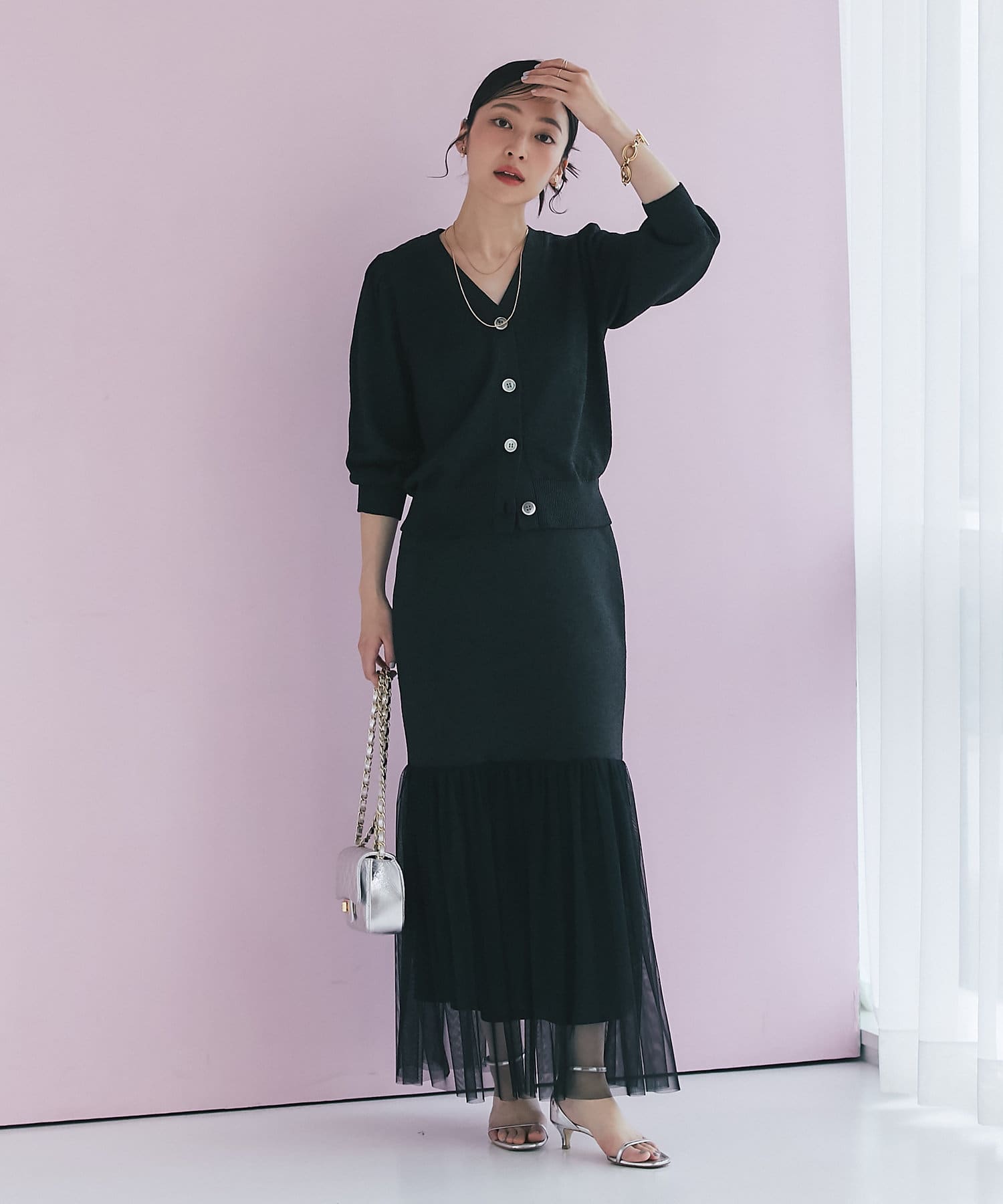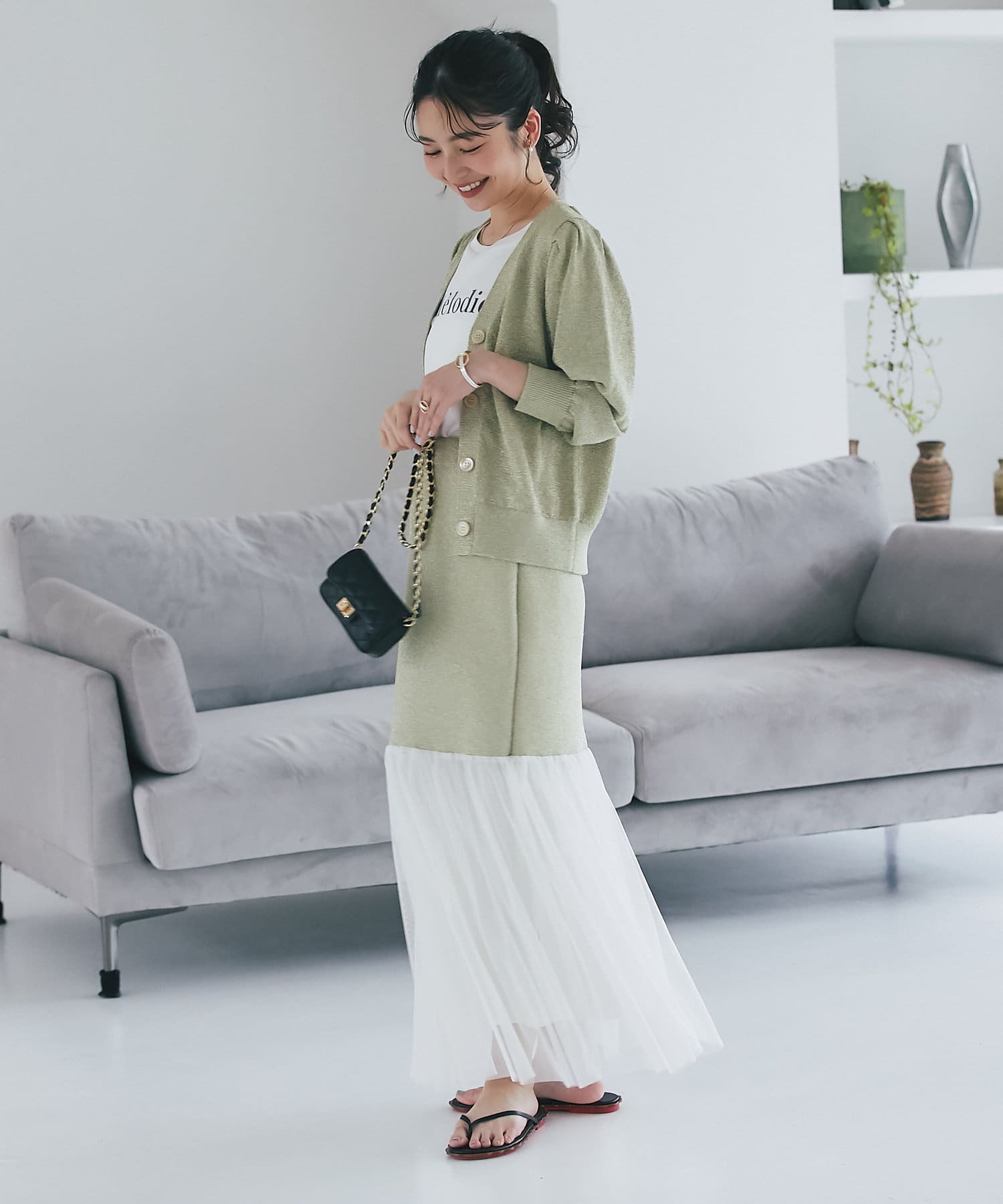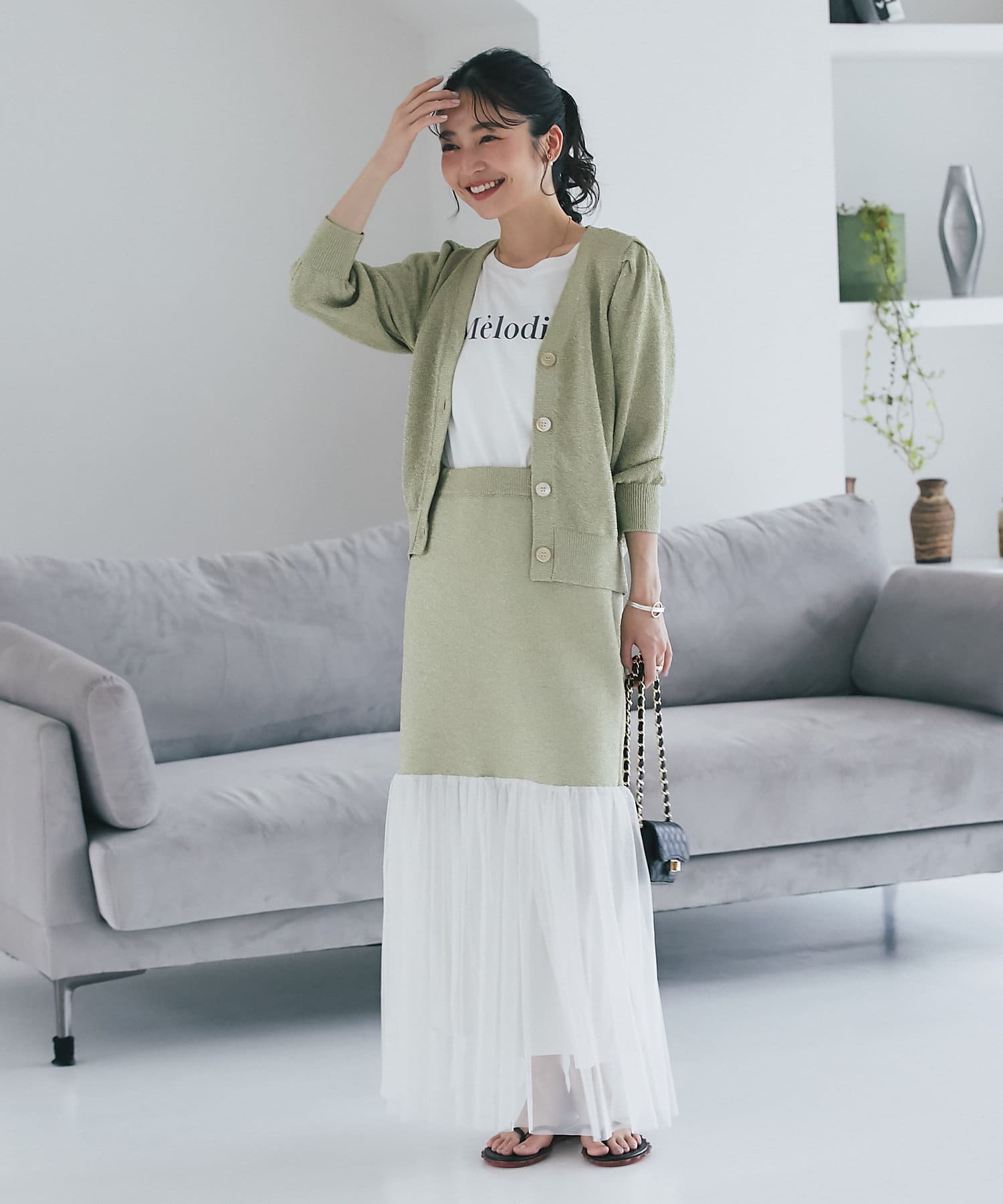 同素材のニットカーディガンと合わせてセットアップで着ることで、
