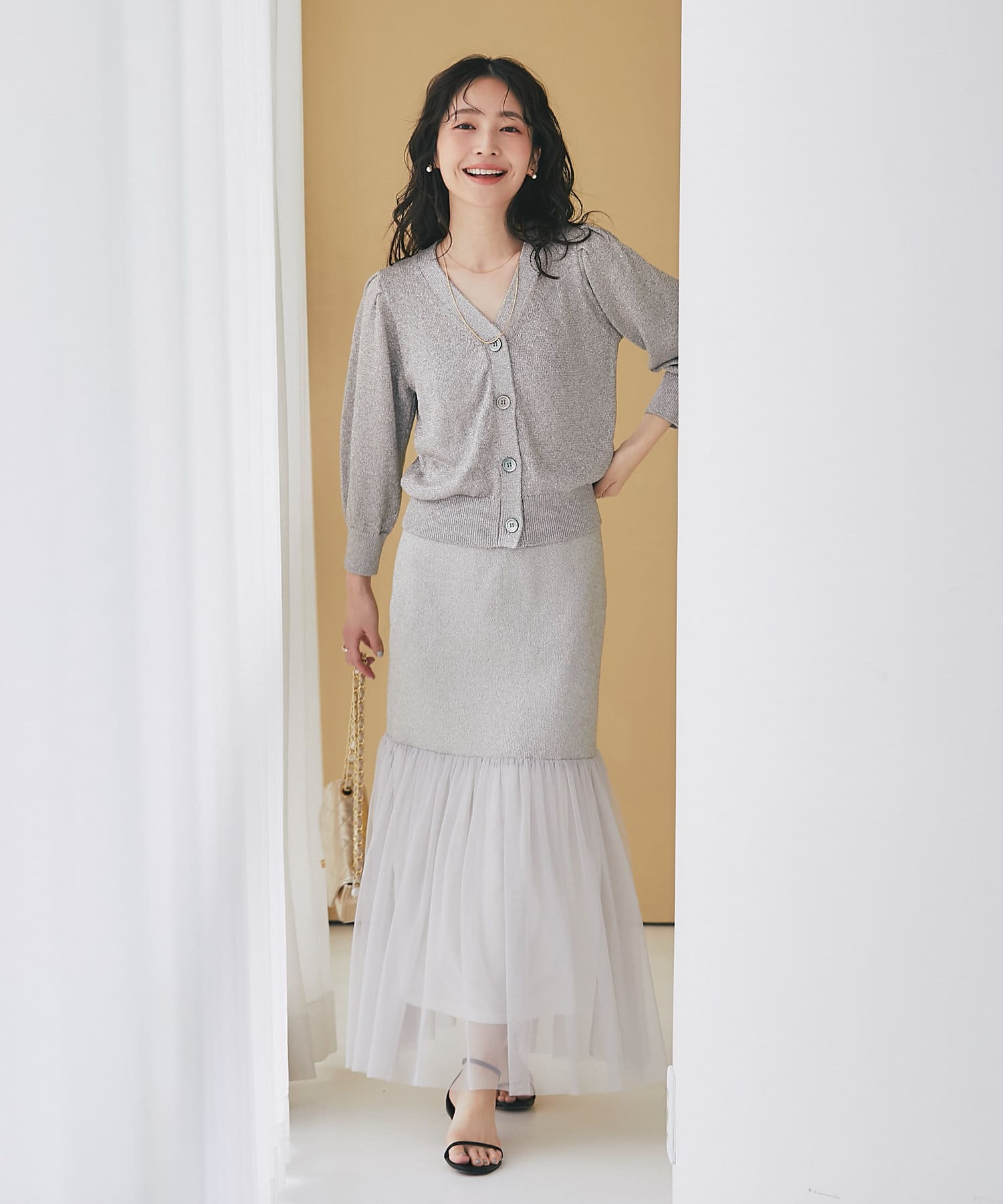 上身はトレンドのラメ入りニットで、体のラインを拾わない肉感に仕上げています。