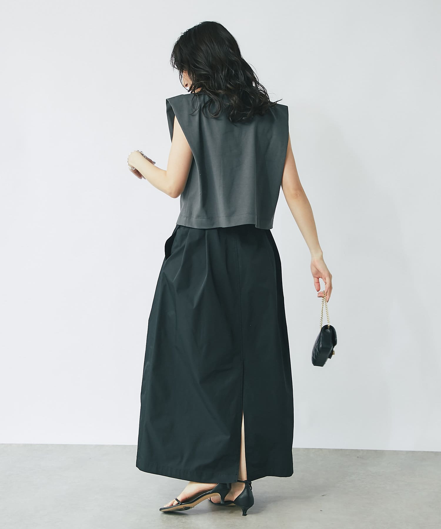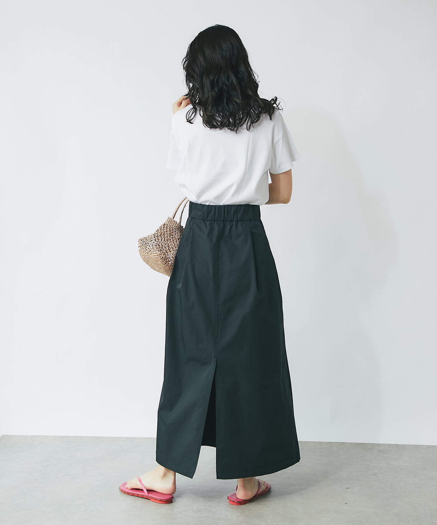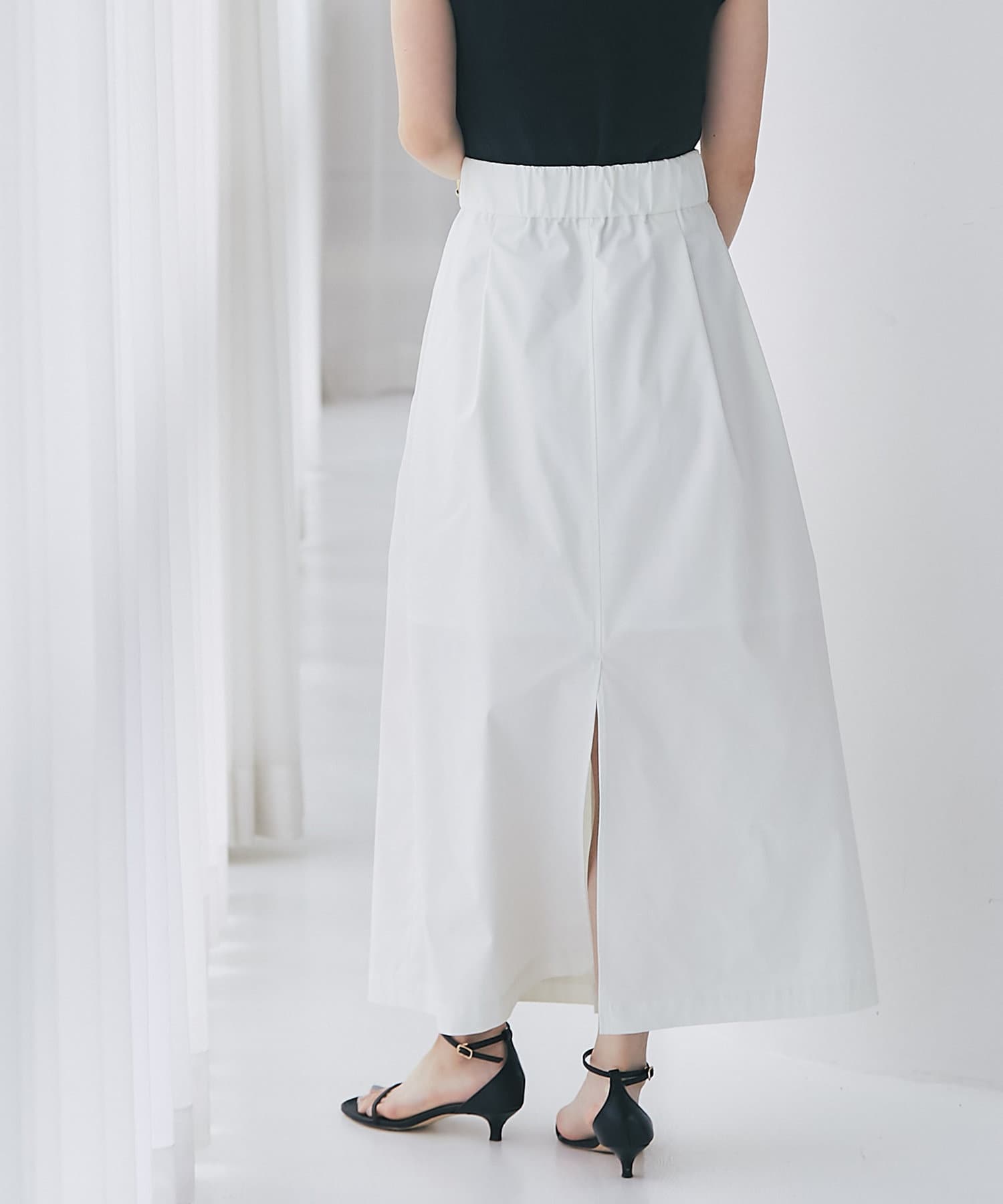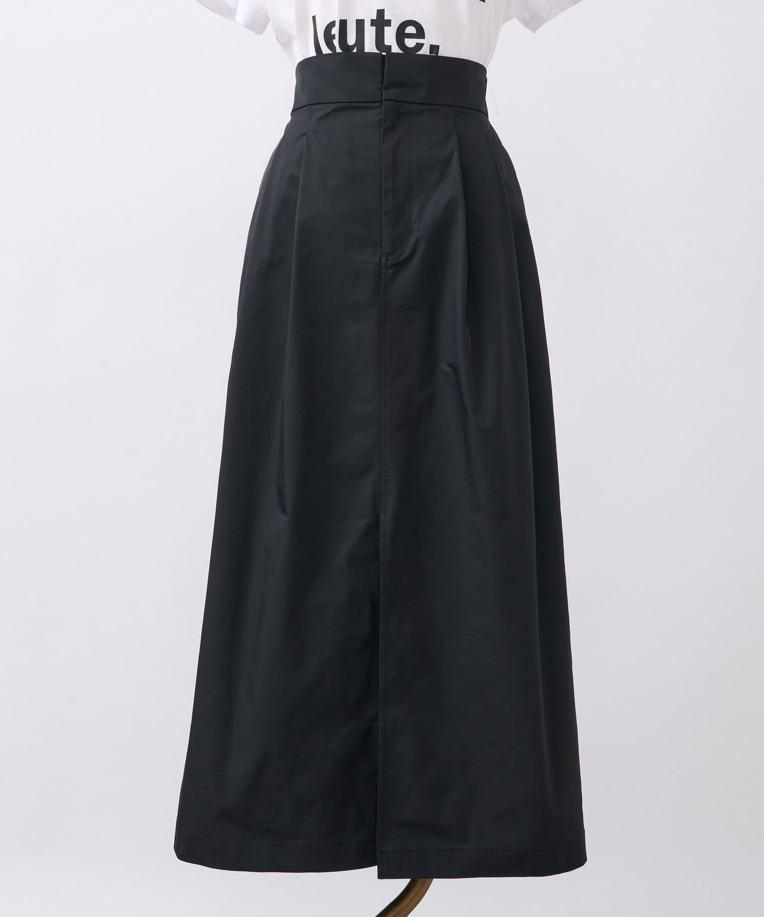 上品なハリのある生地感のマキシスカート。
