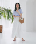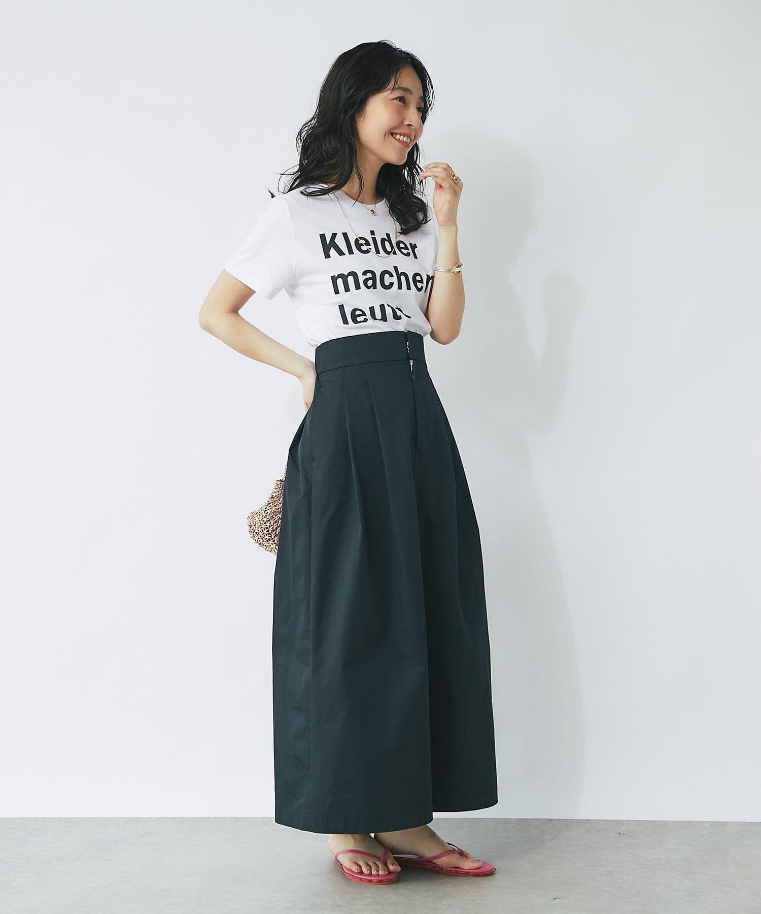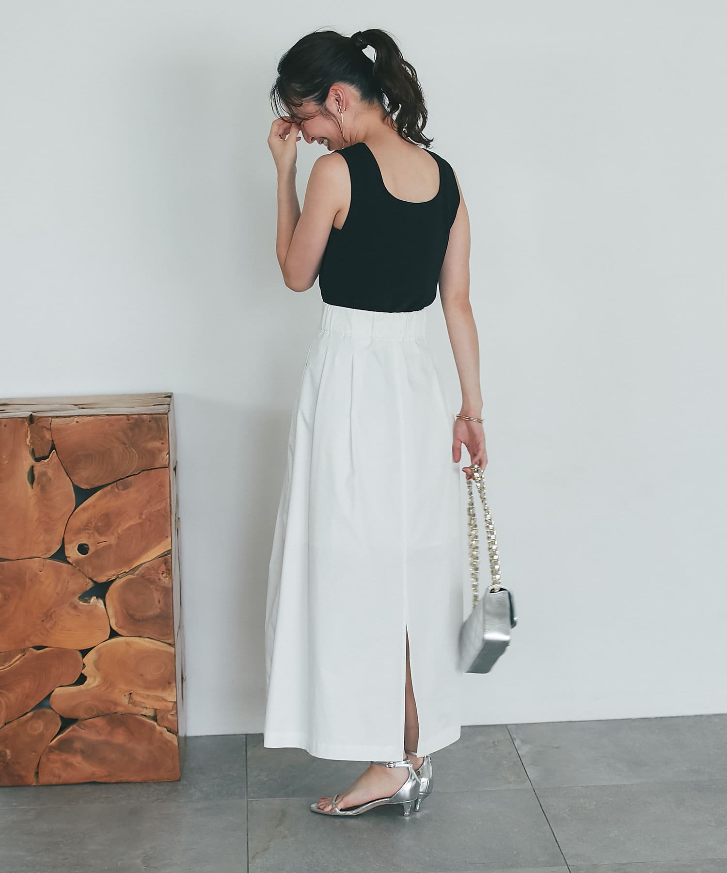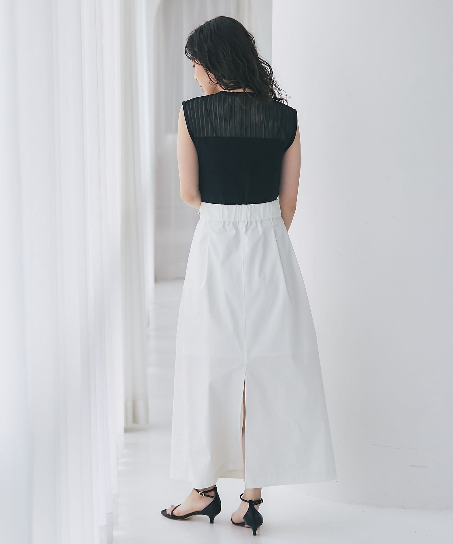 上品なハリのある生地感のマキシスカート。