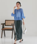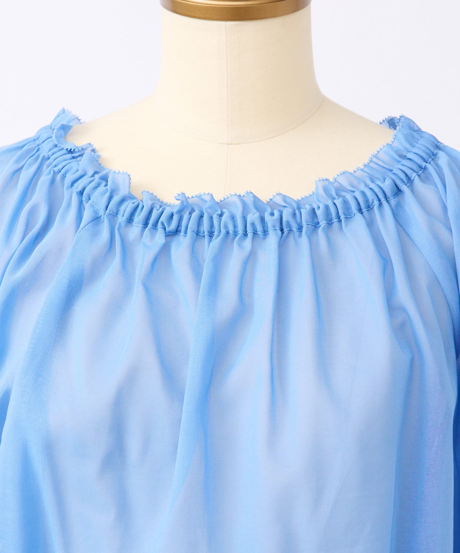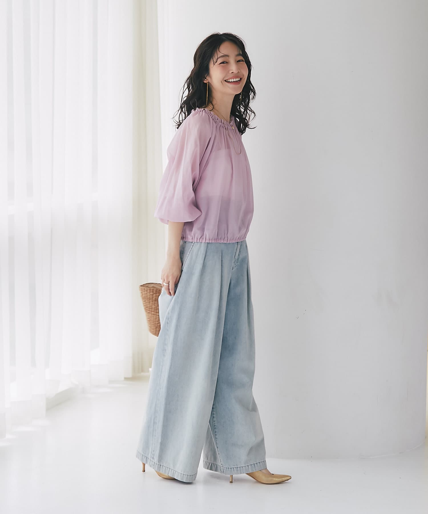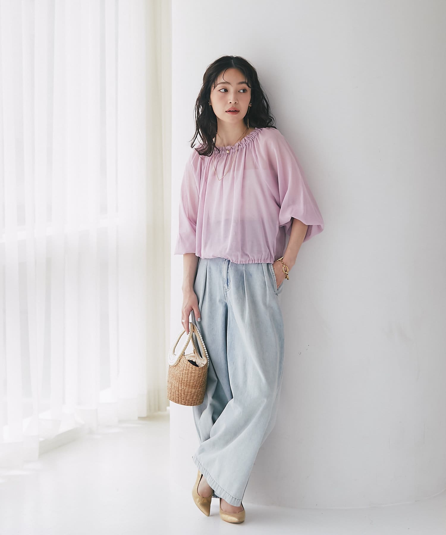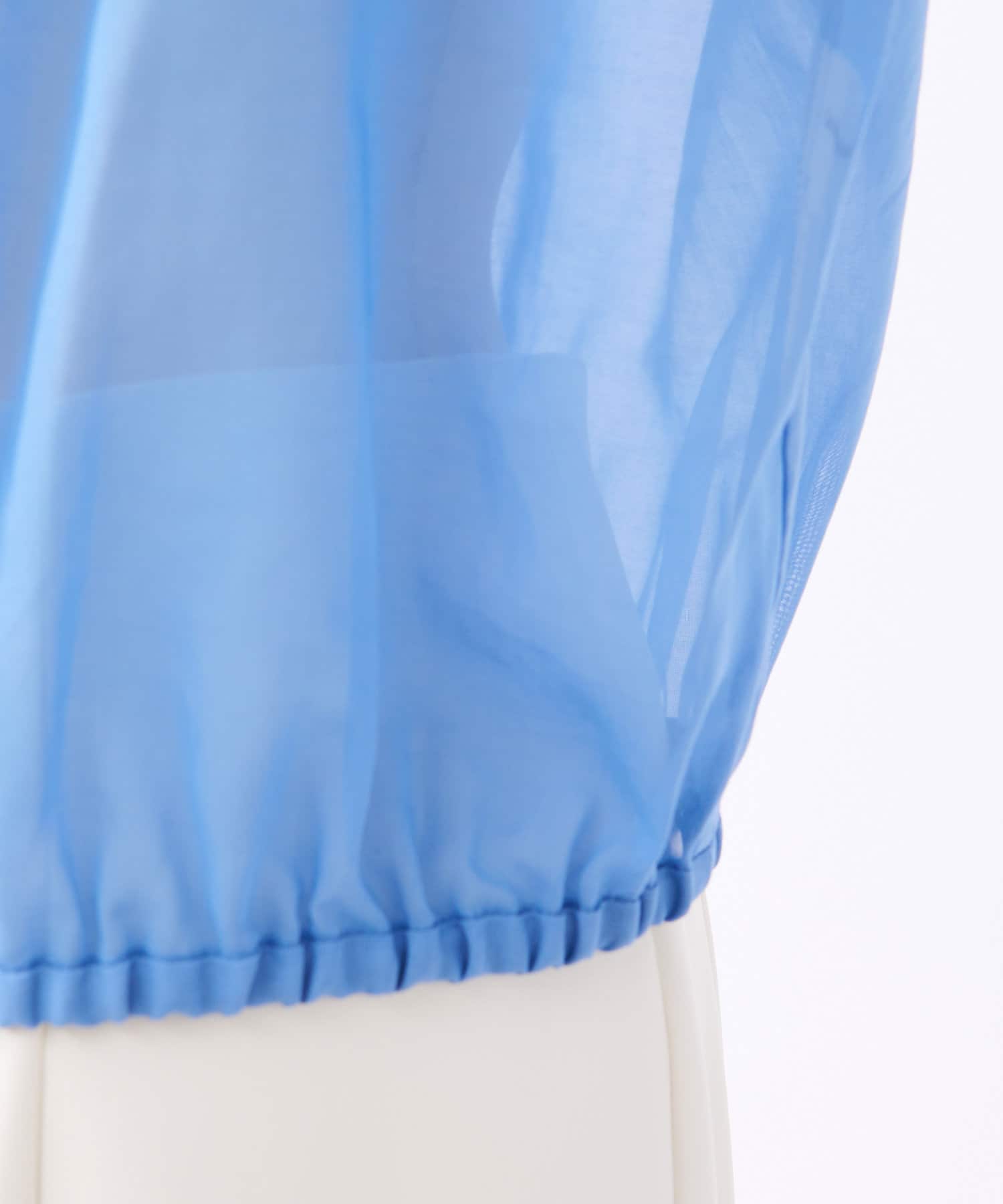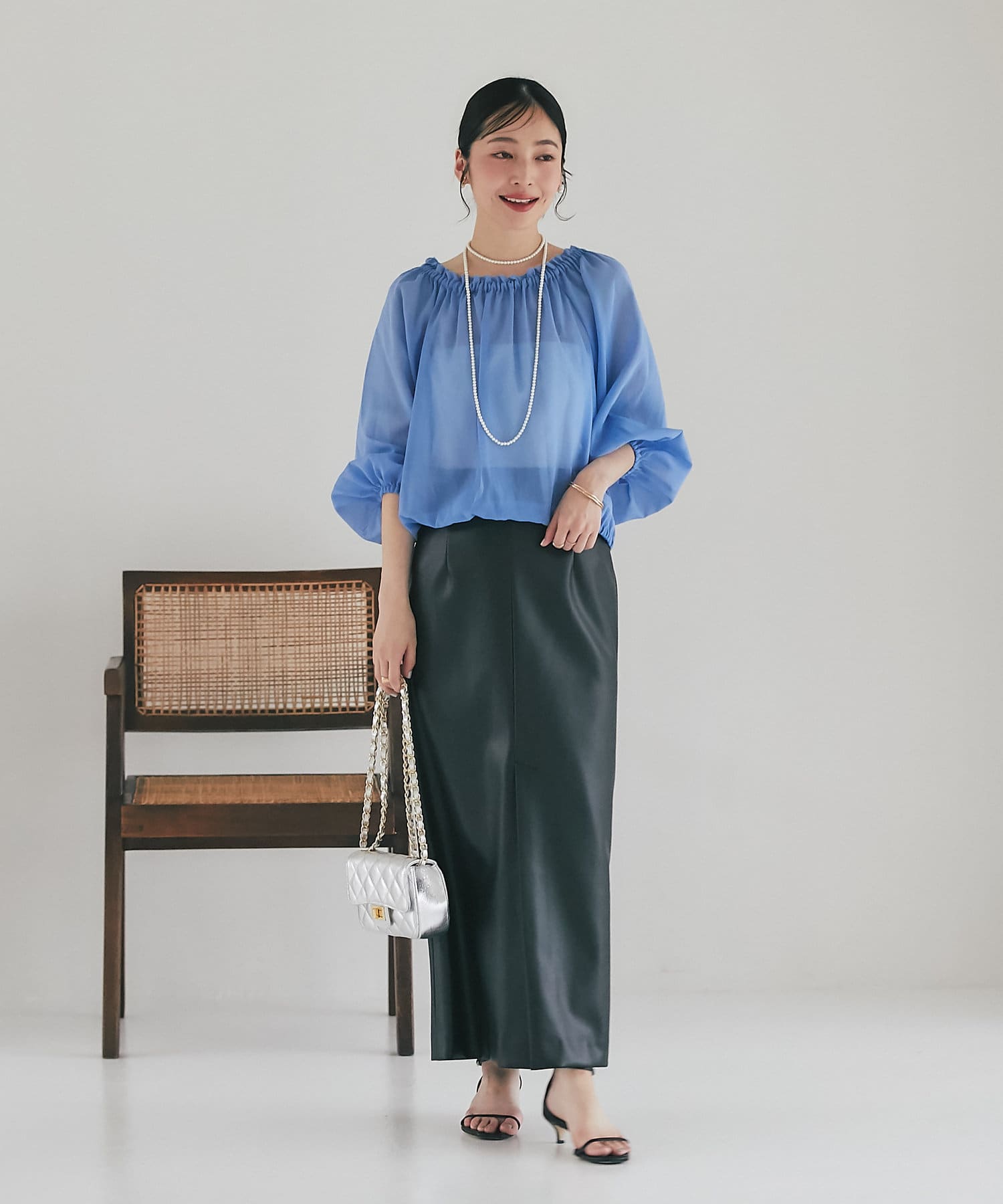 長袖でもシアー素材なので軽い印象で、袖口もゴム仕様でたくし上げて抜け感のある着こなしもできます。