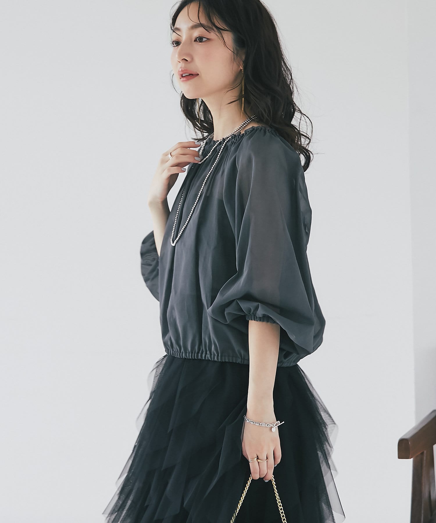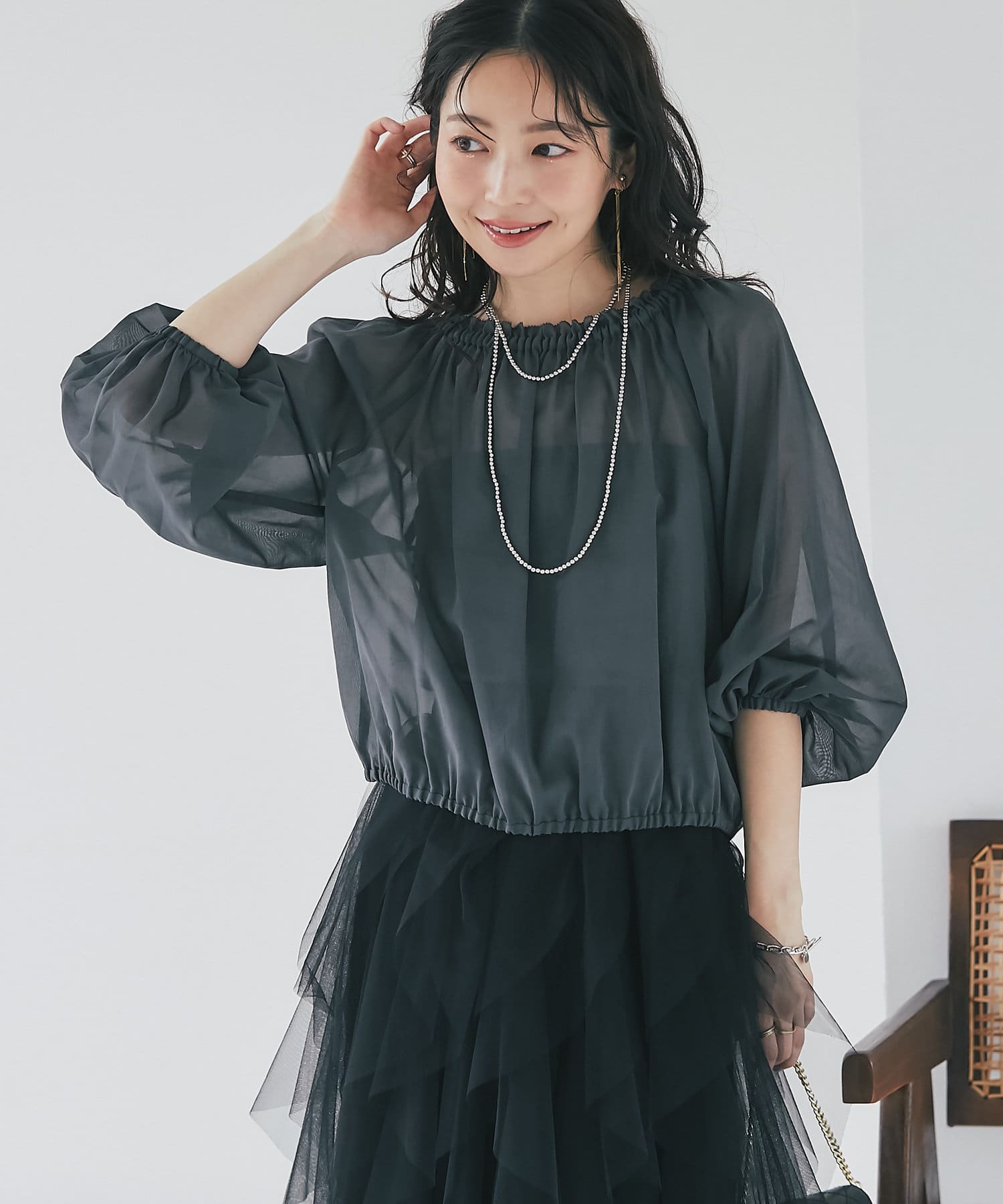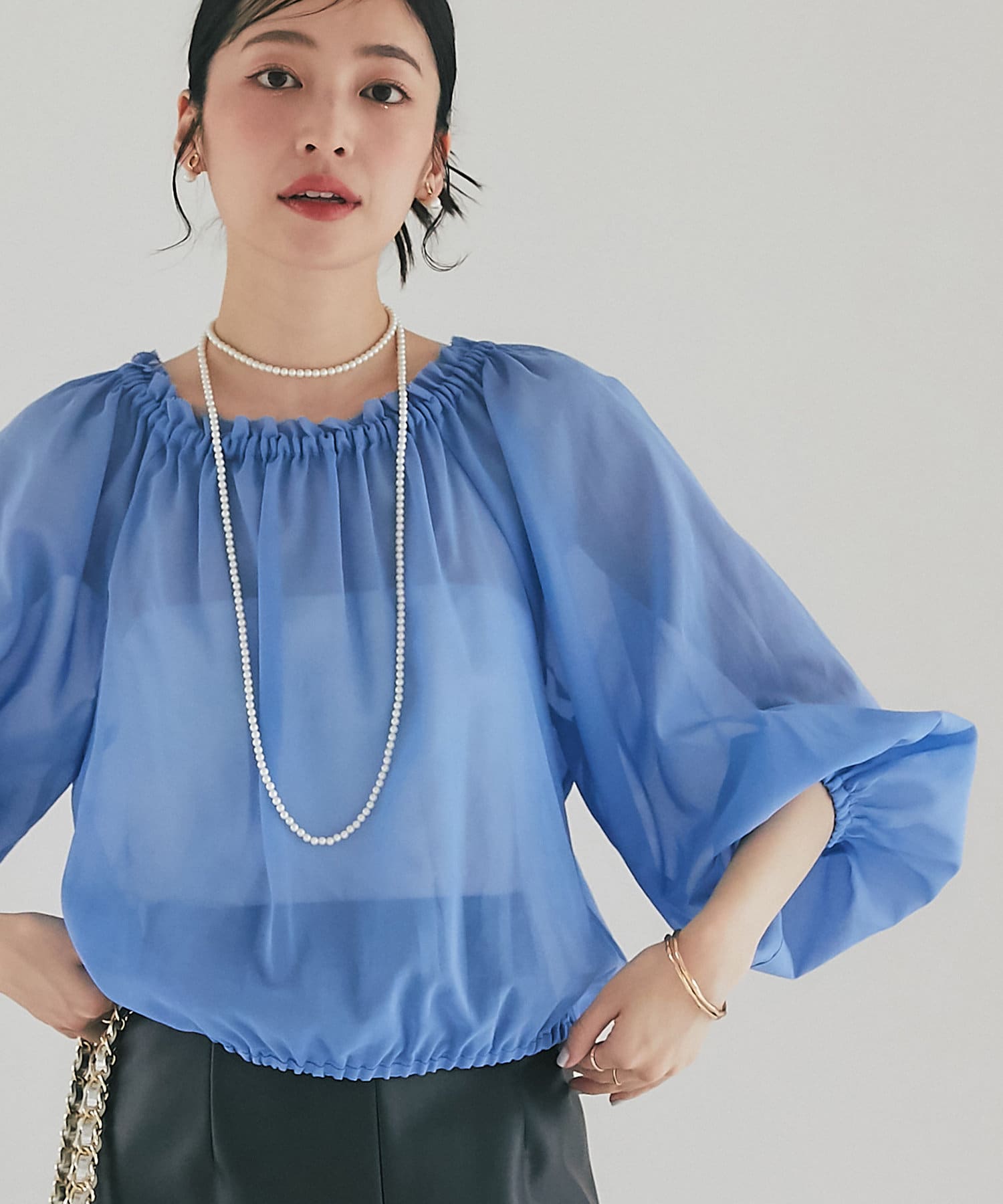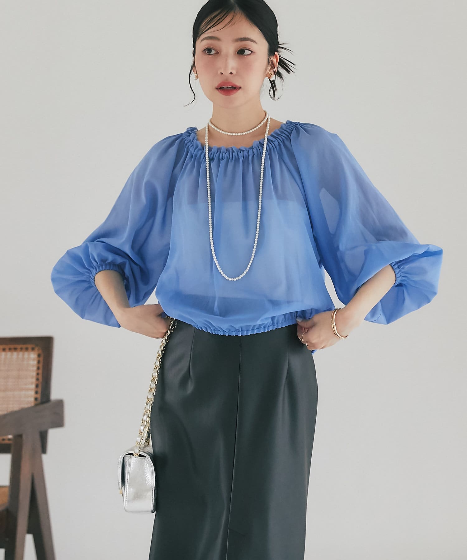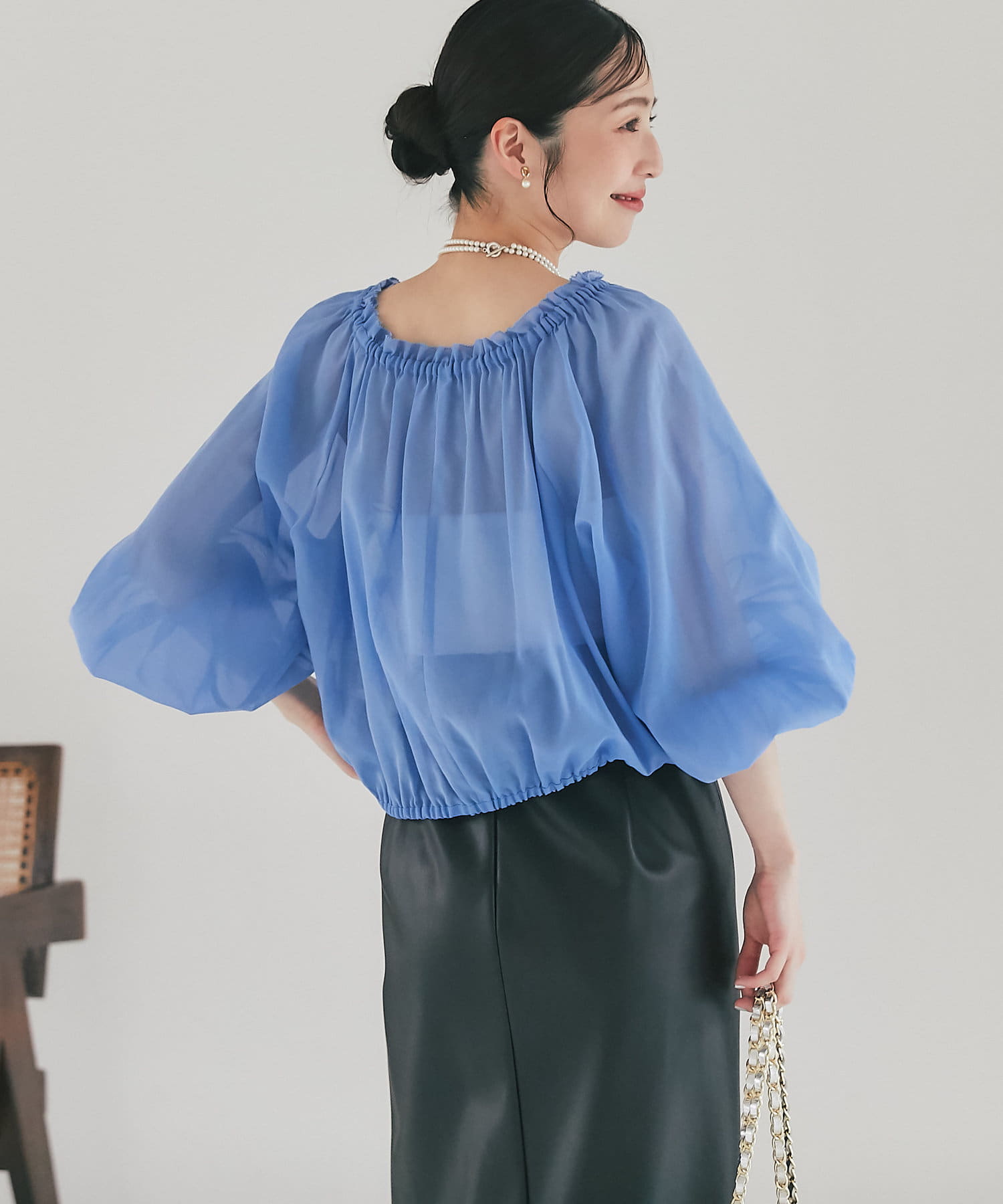 トレンドのシアー素材のバルーンシルエットブラウス。