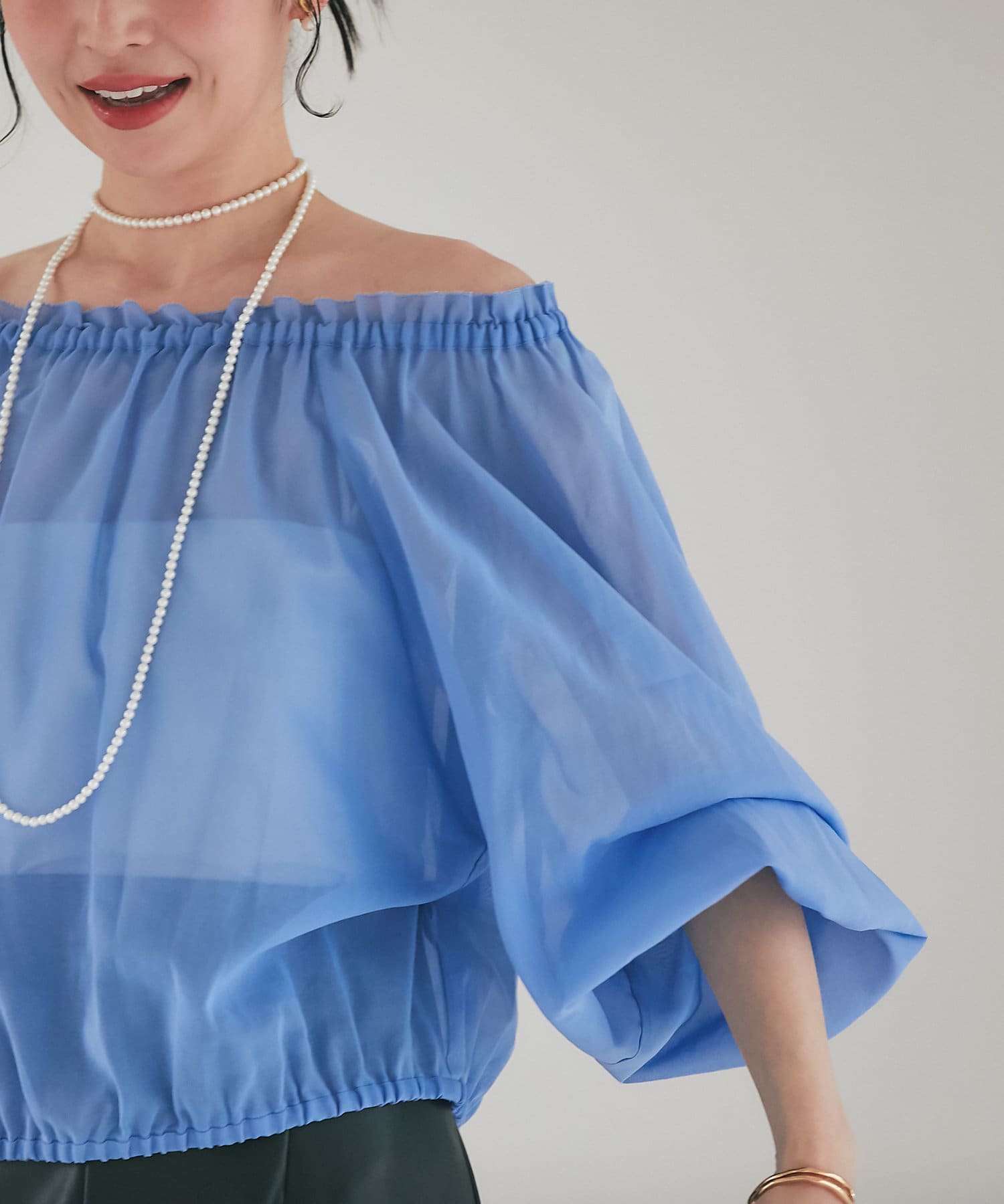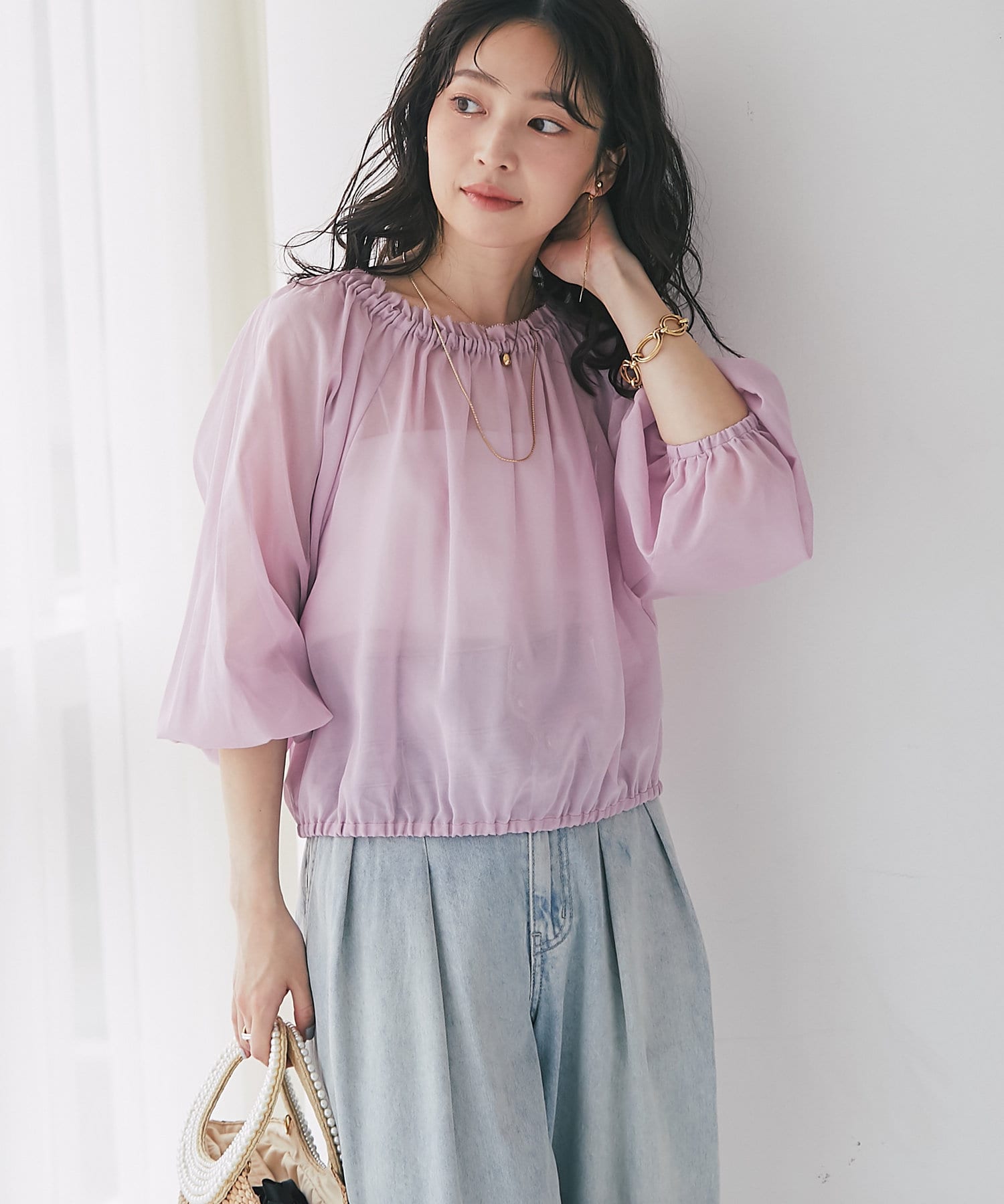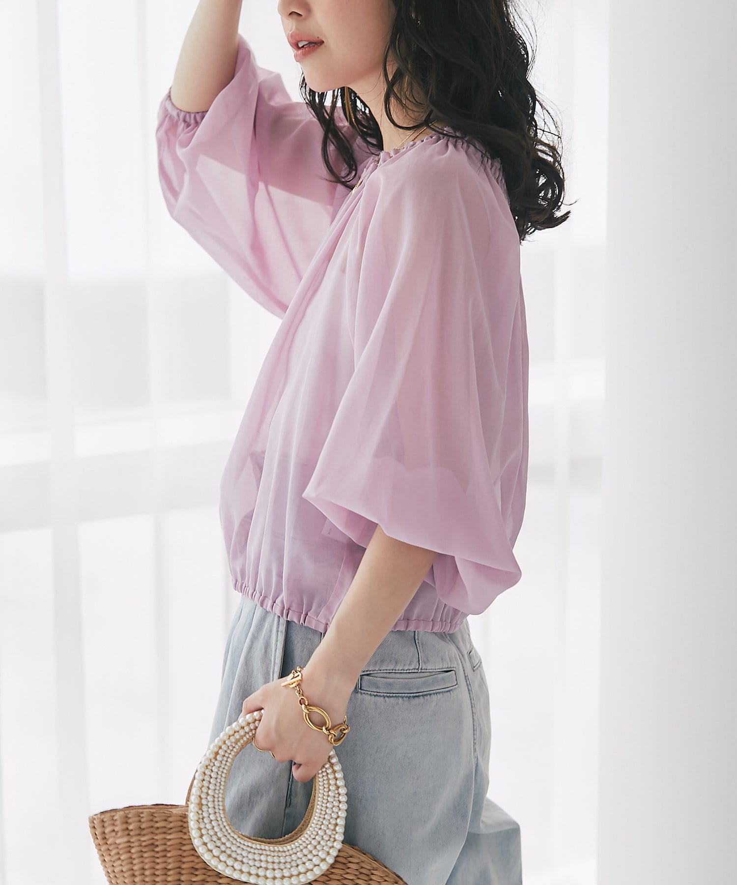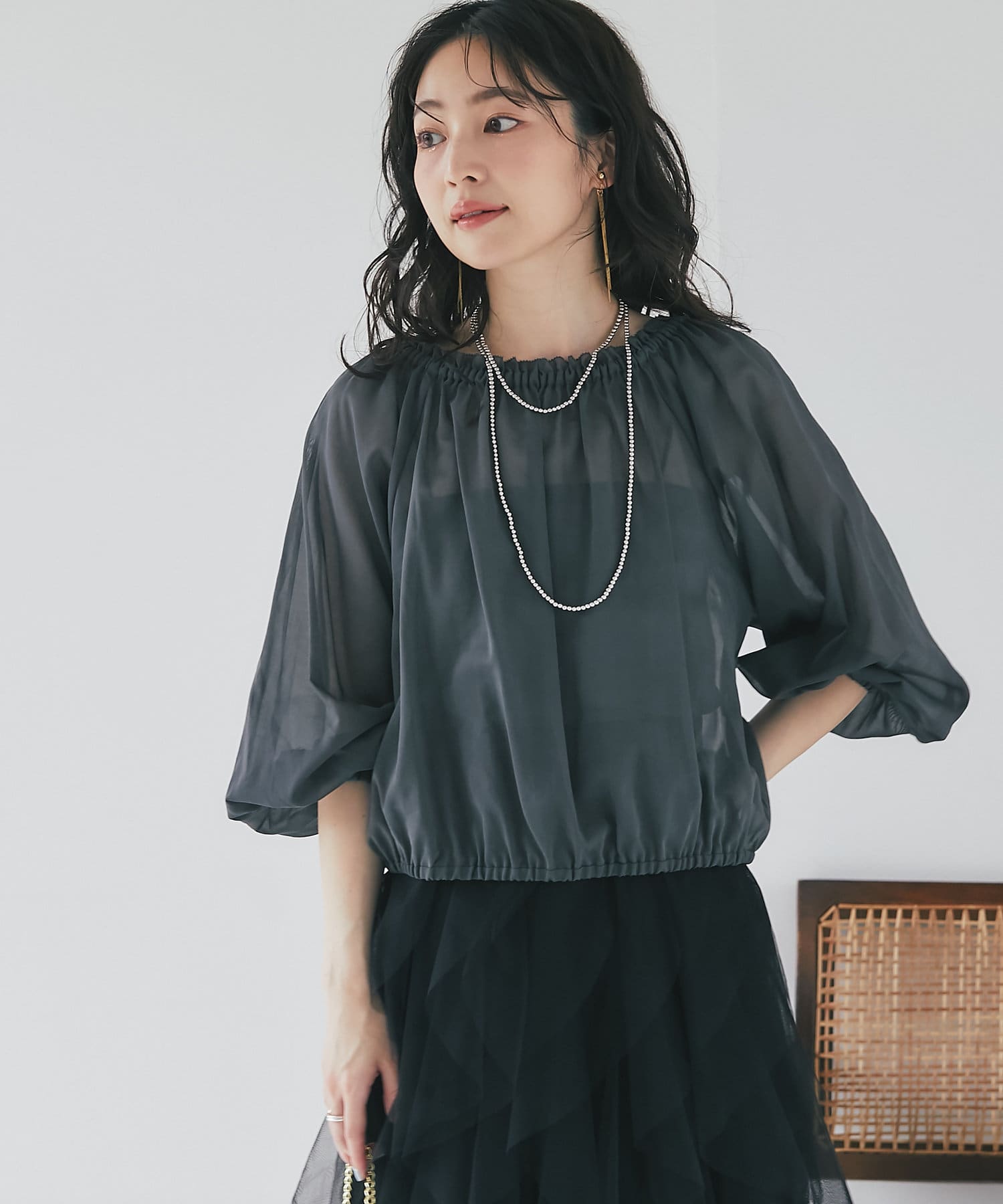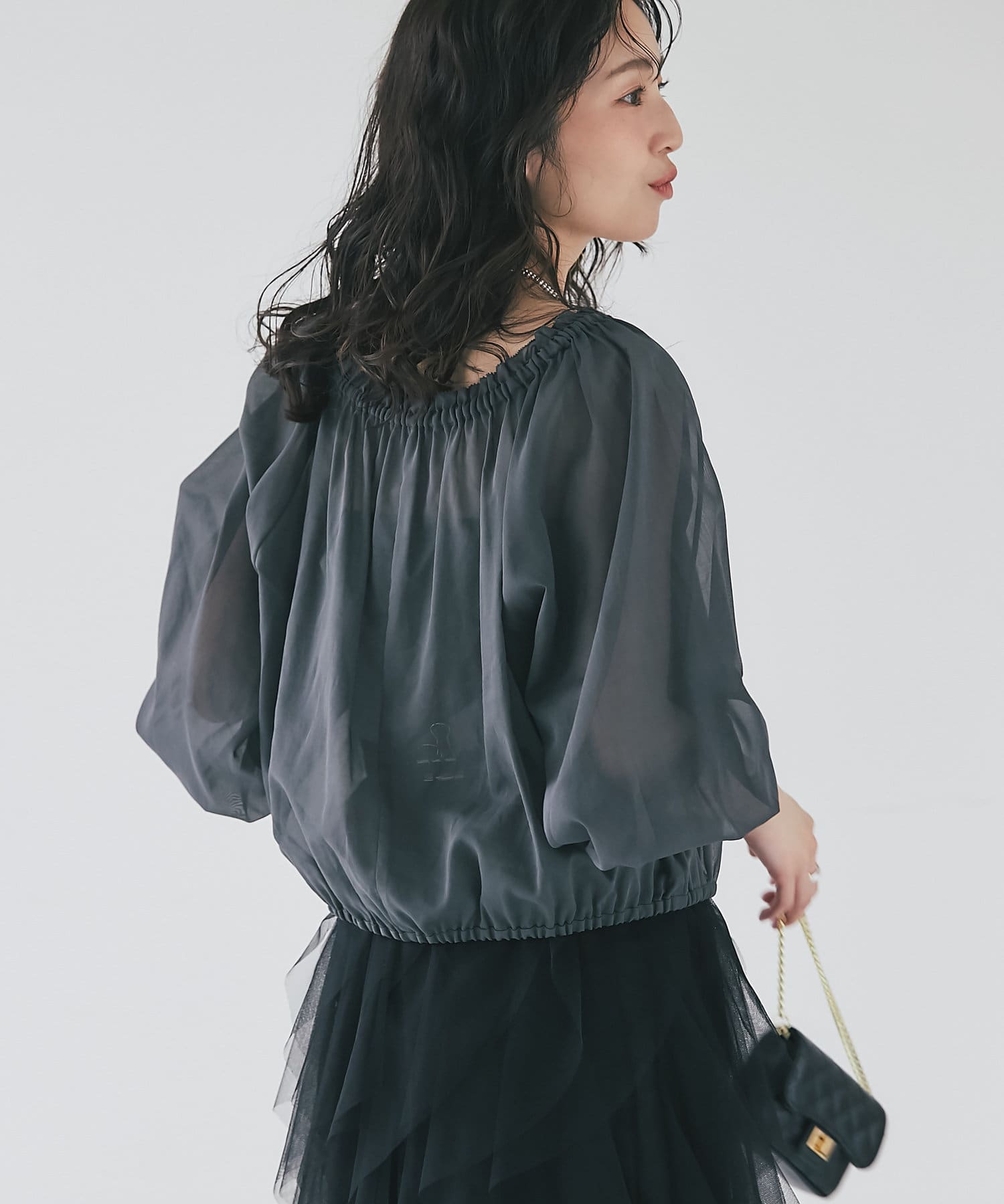 トレンドのシアー素材のバルーンシルエットブラウス。