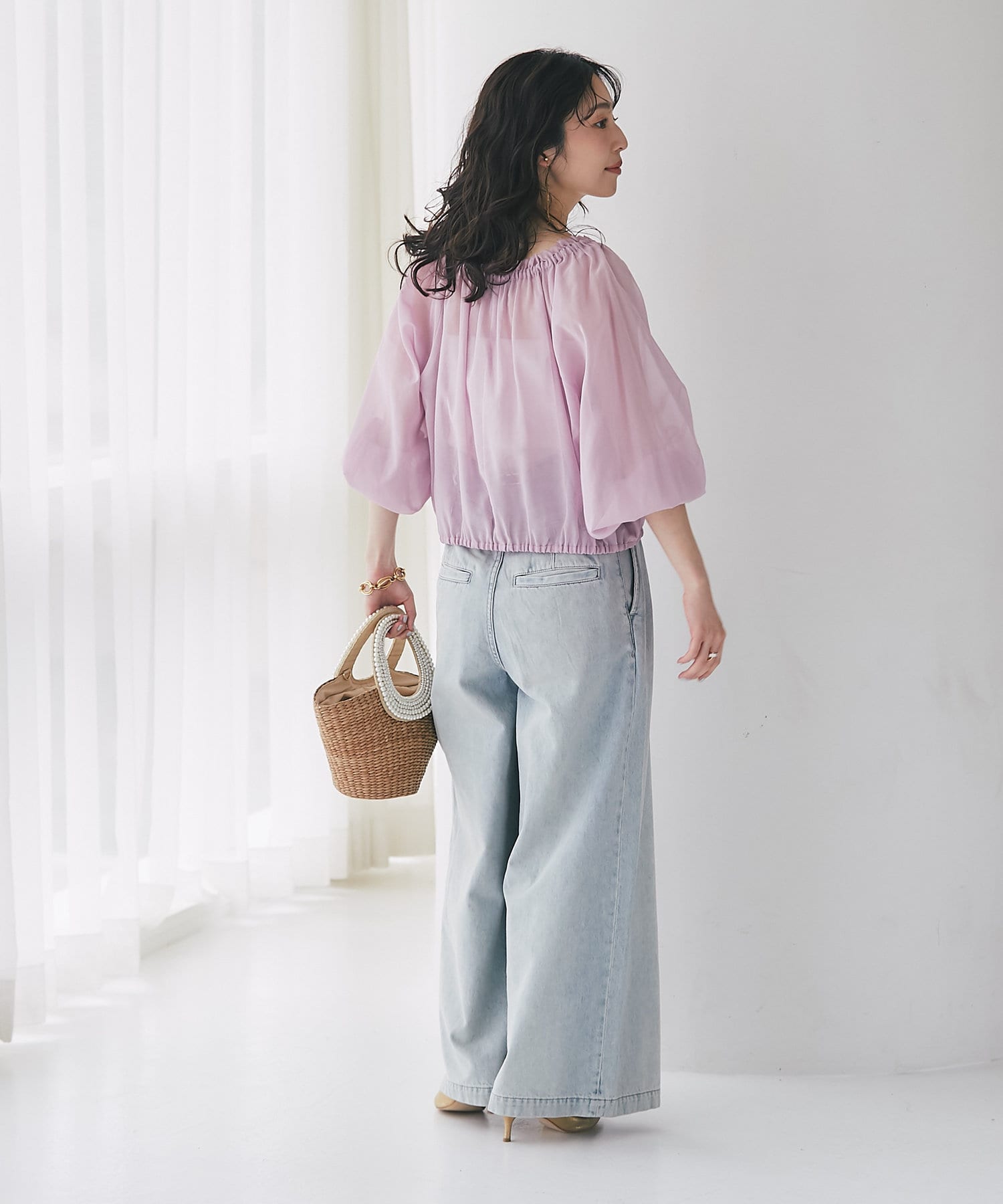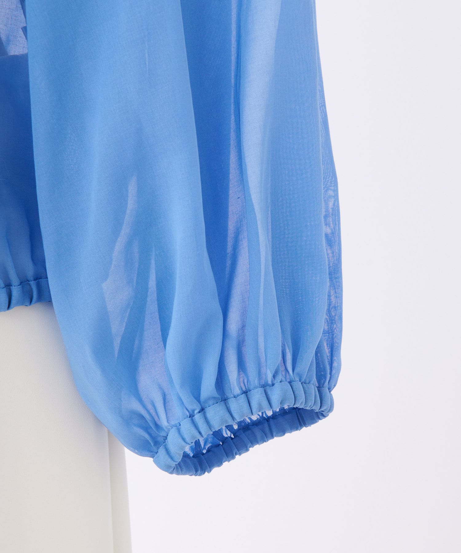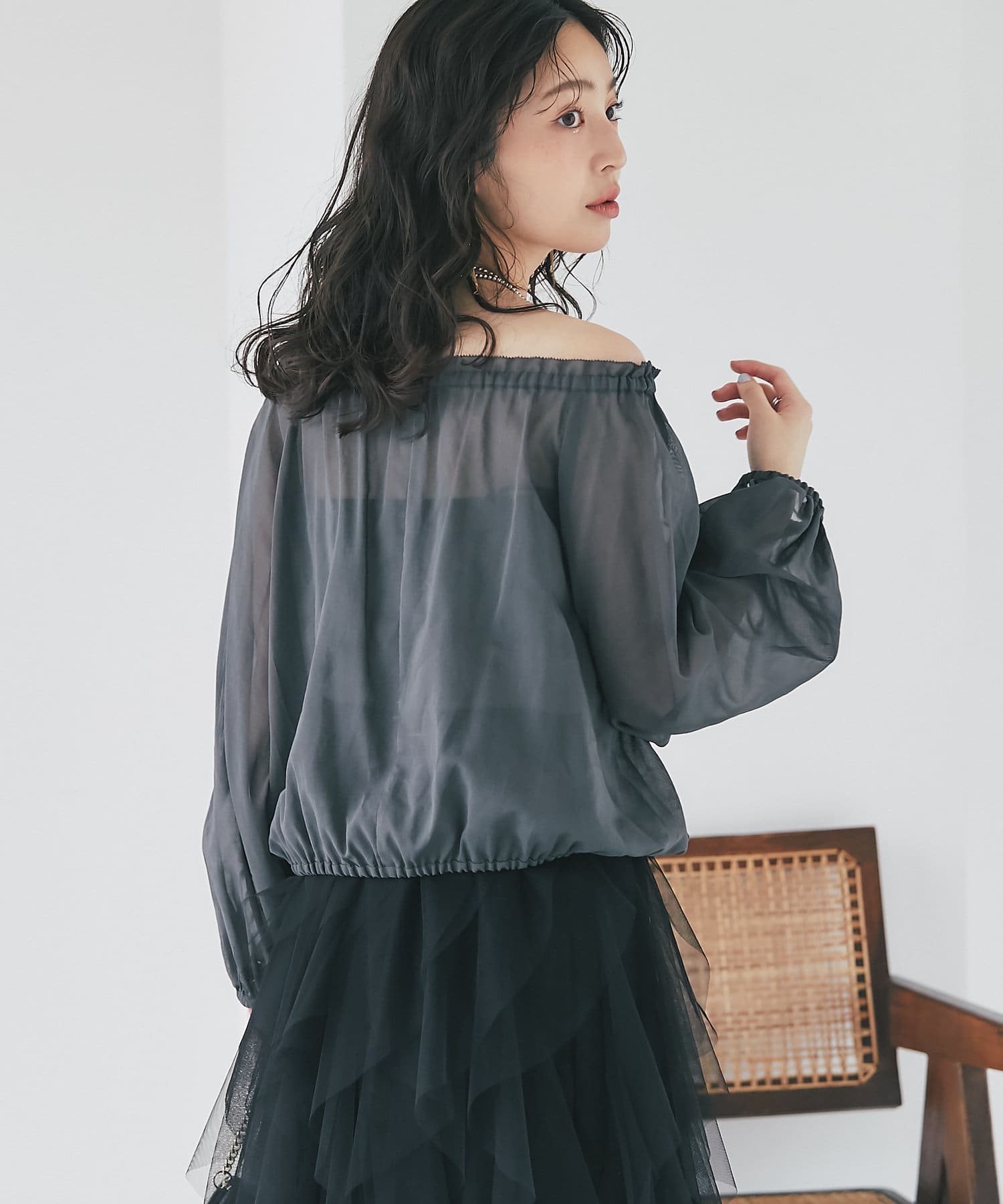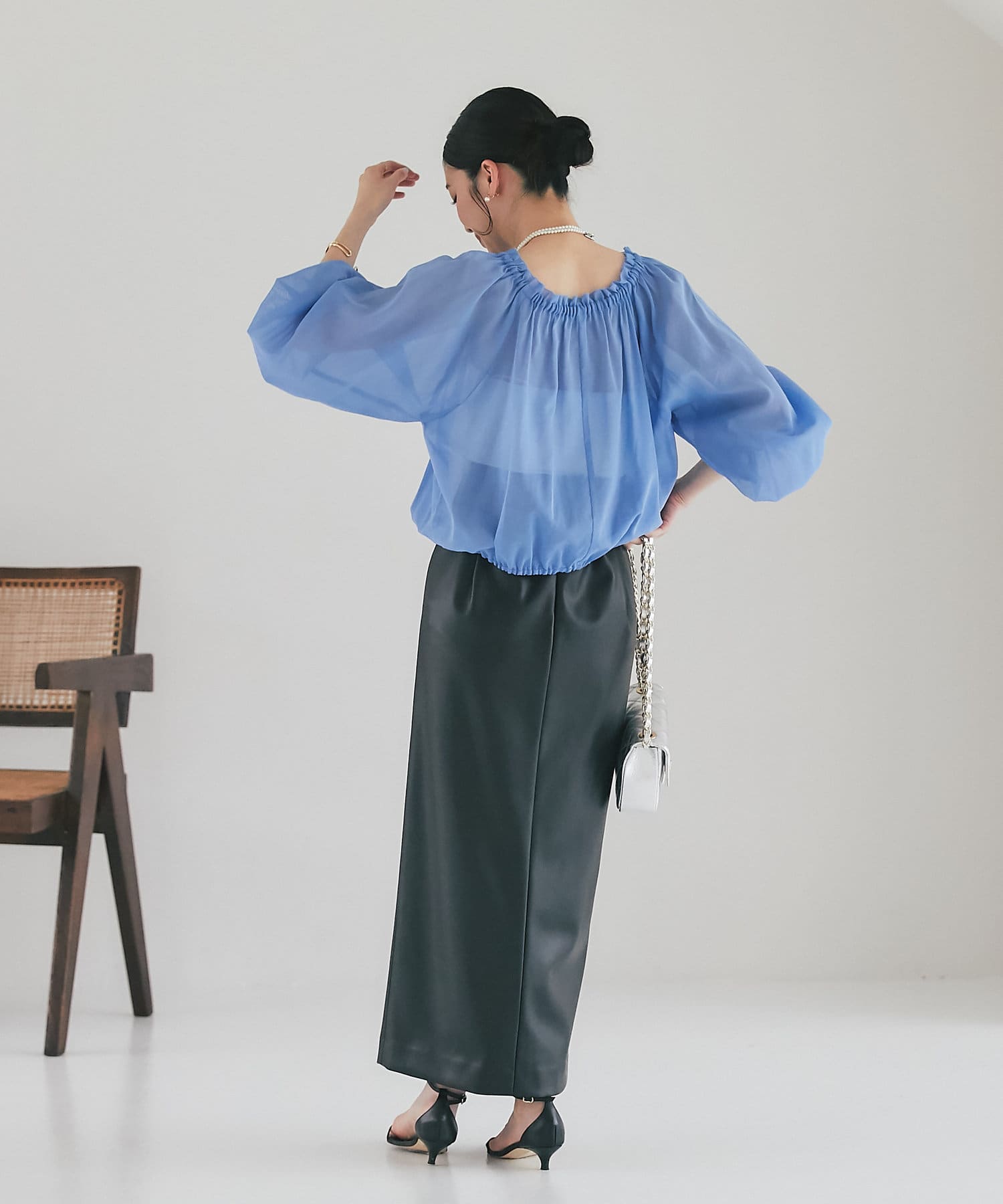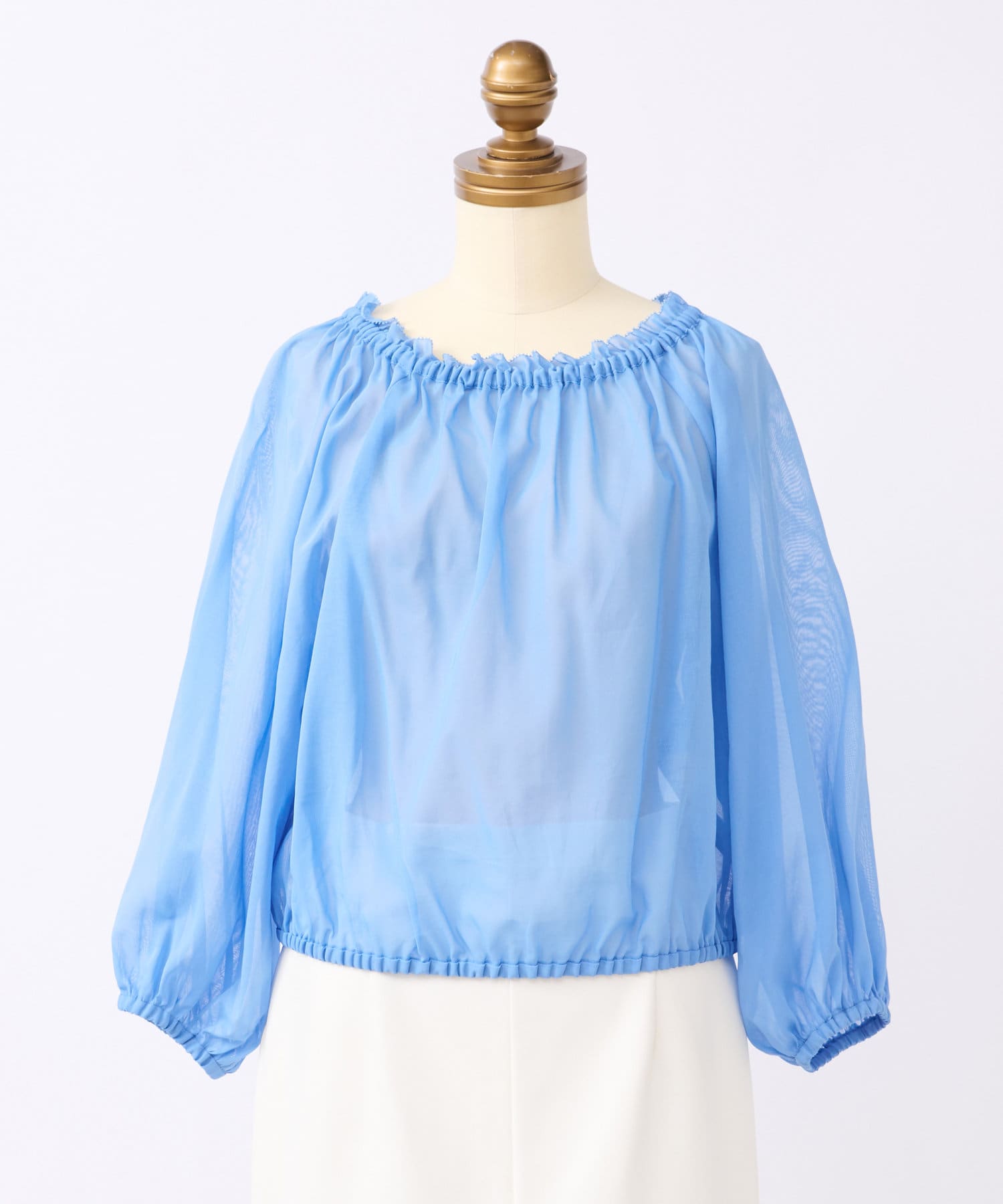 トレンドのシアー素材のバルーンシルエットブラウス。