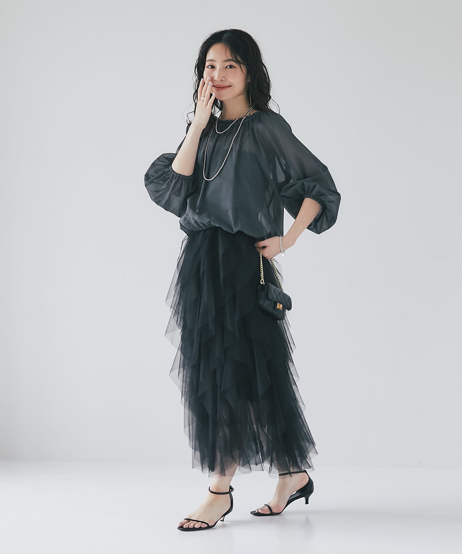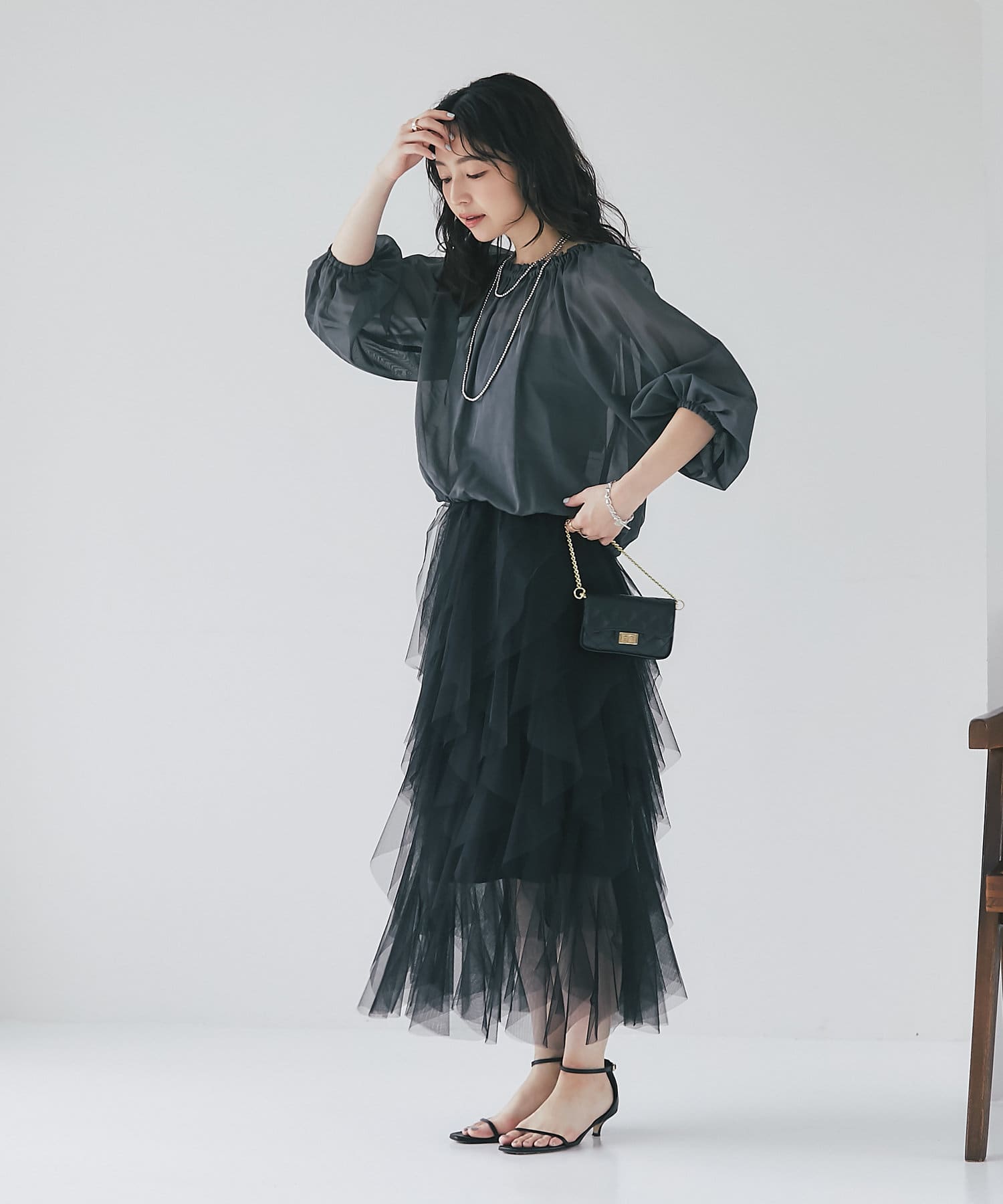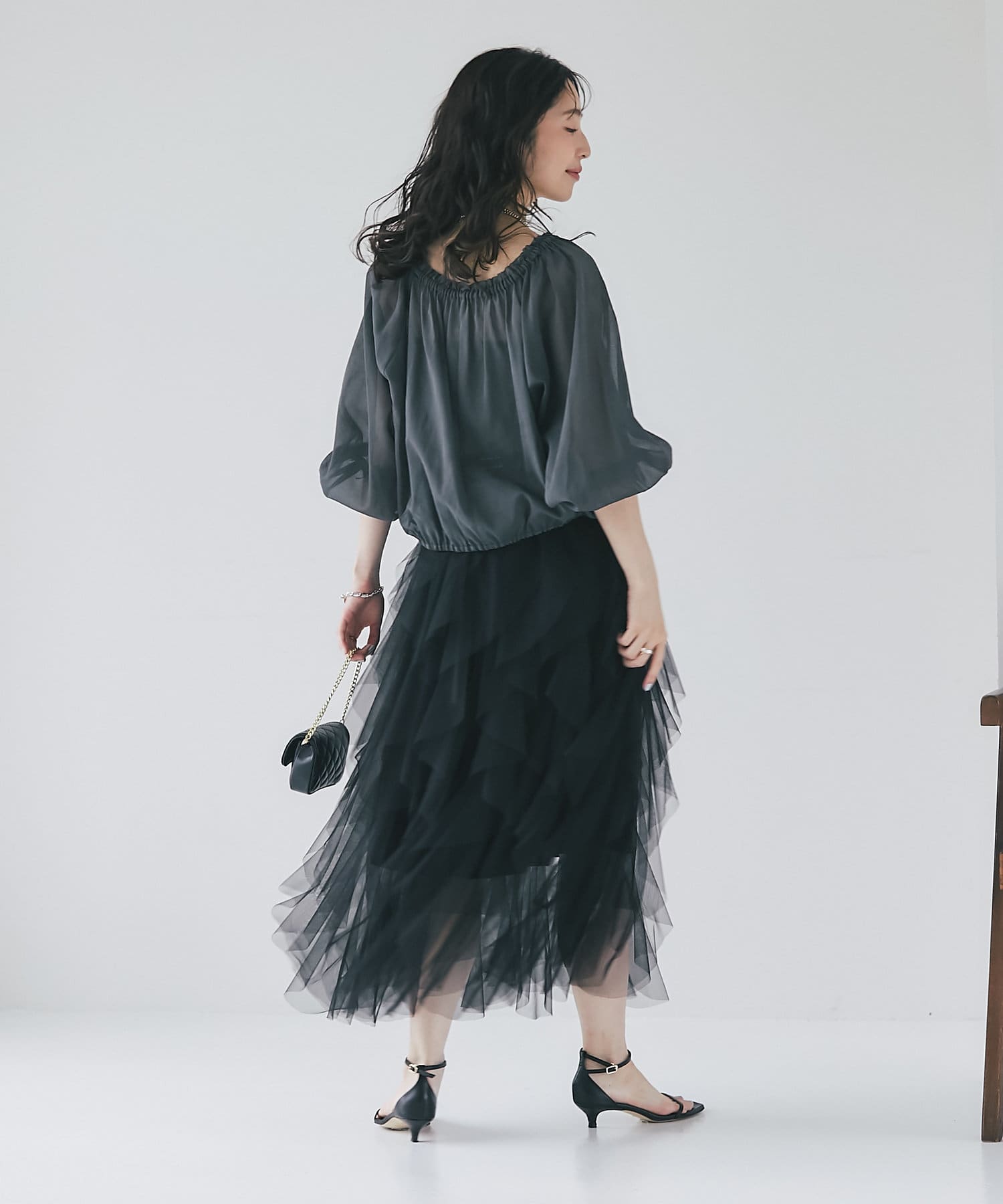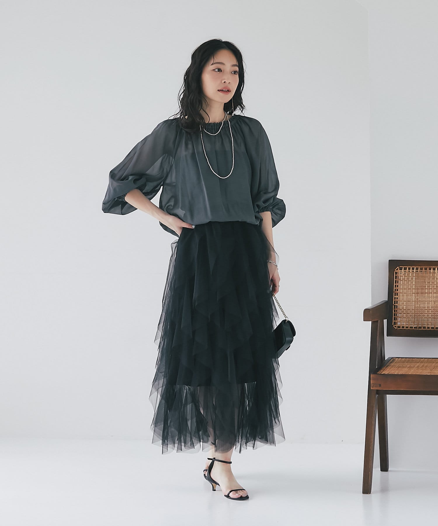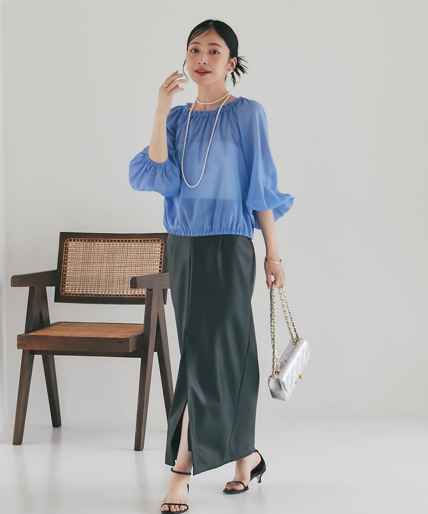 トレンドのシアー素材のバルーンシルエットブラウス。