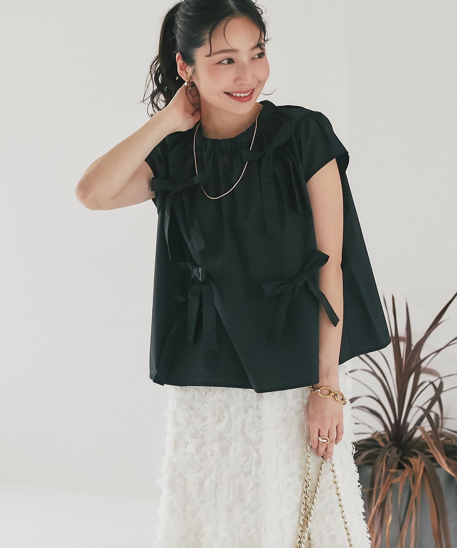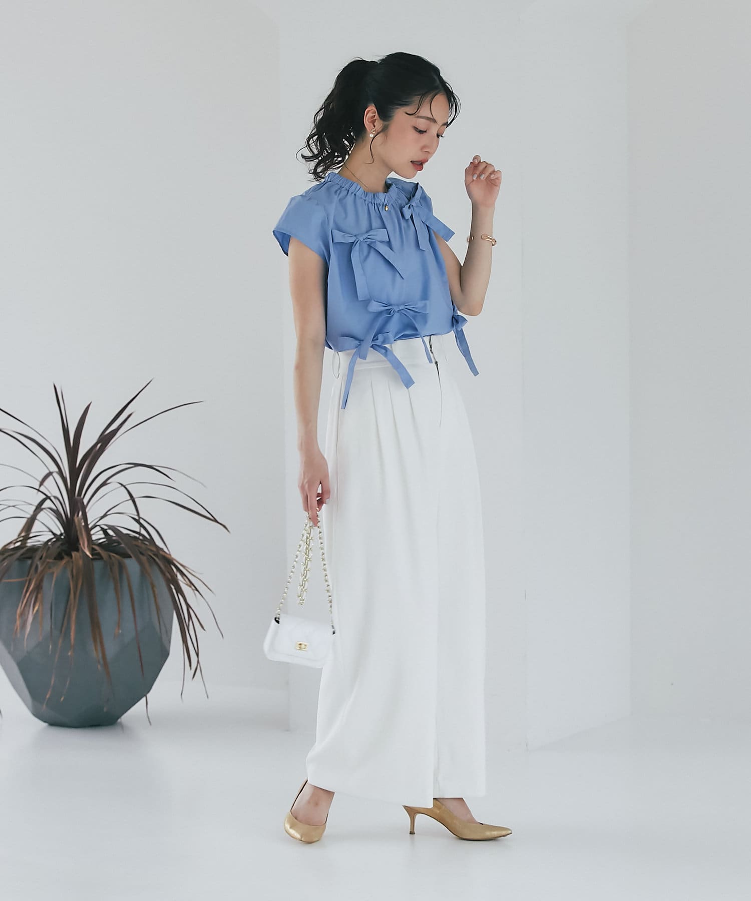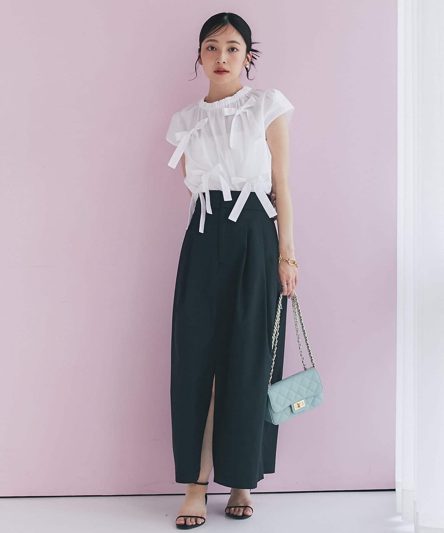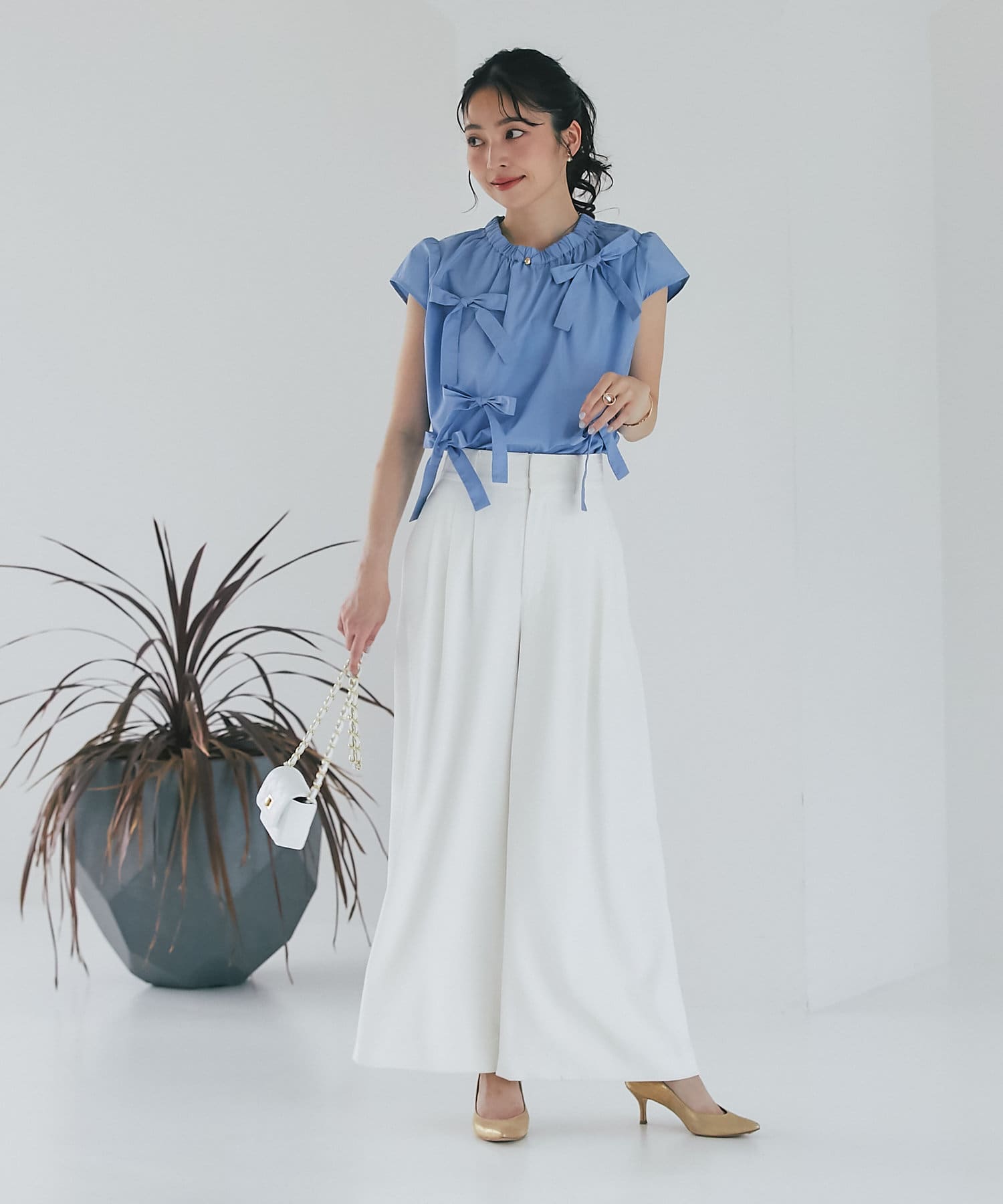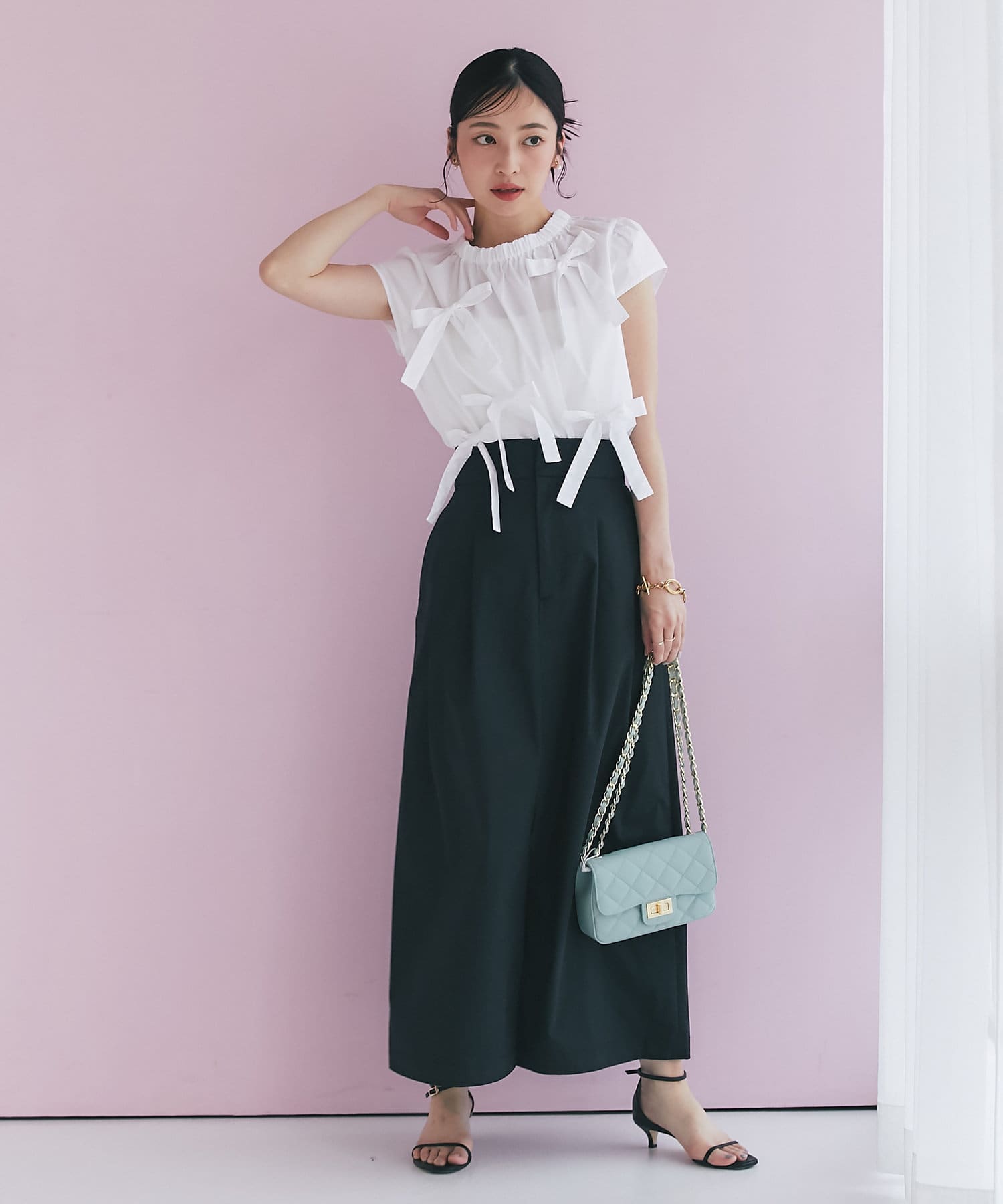 上品なシルエットのブラウスに甘めのリボンで、女性らしさをプラスしてくれます。