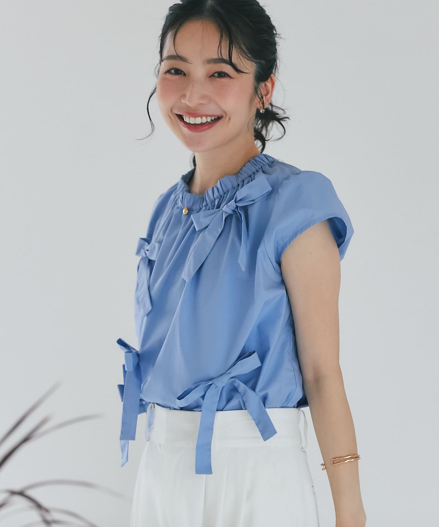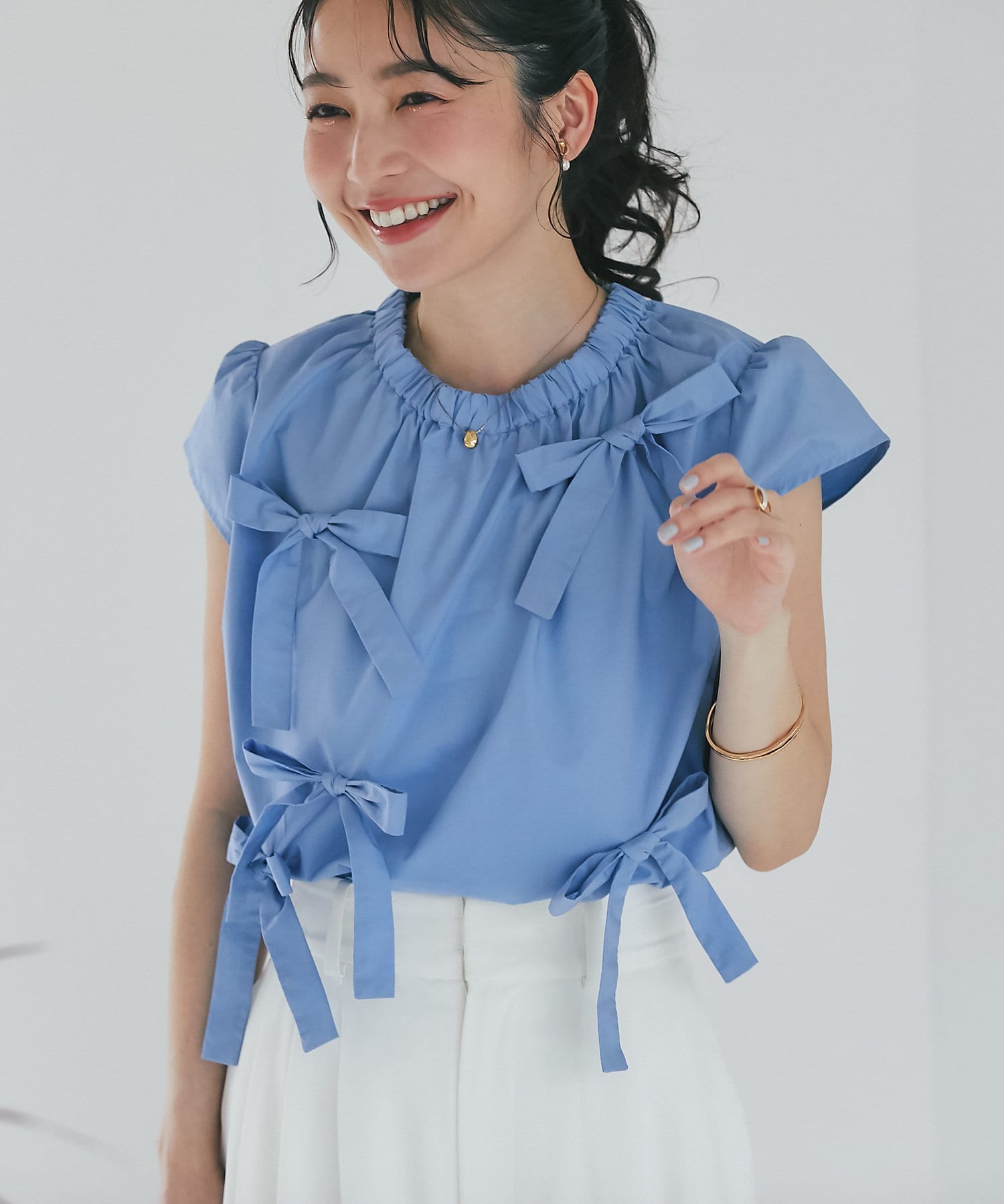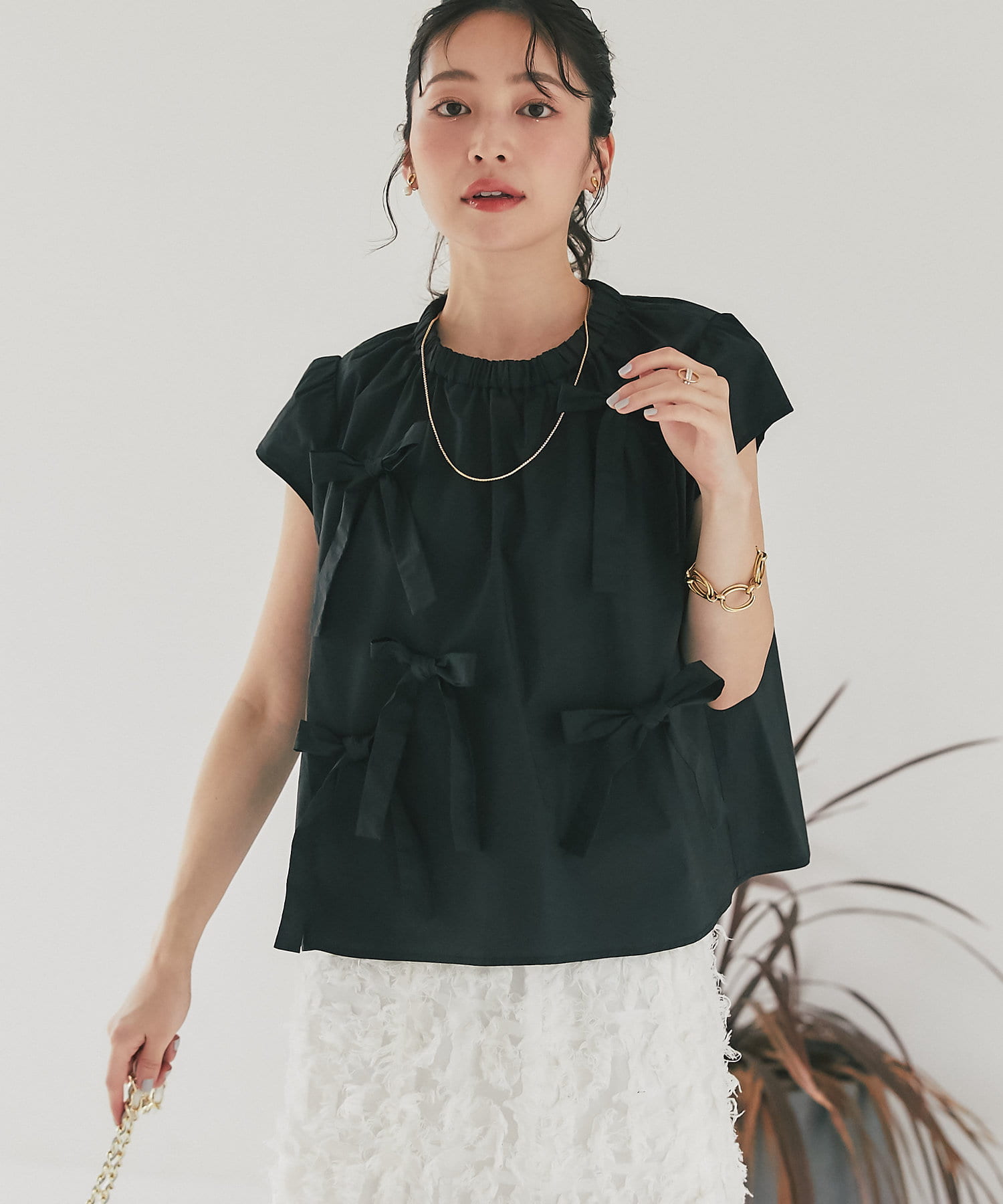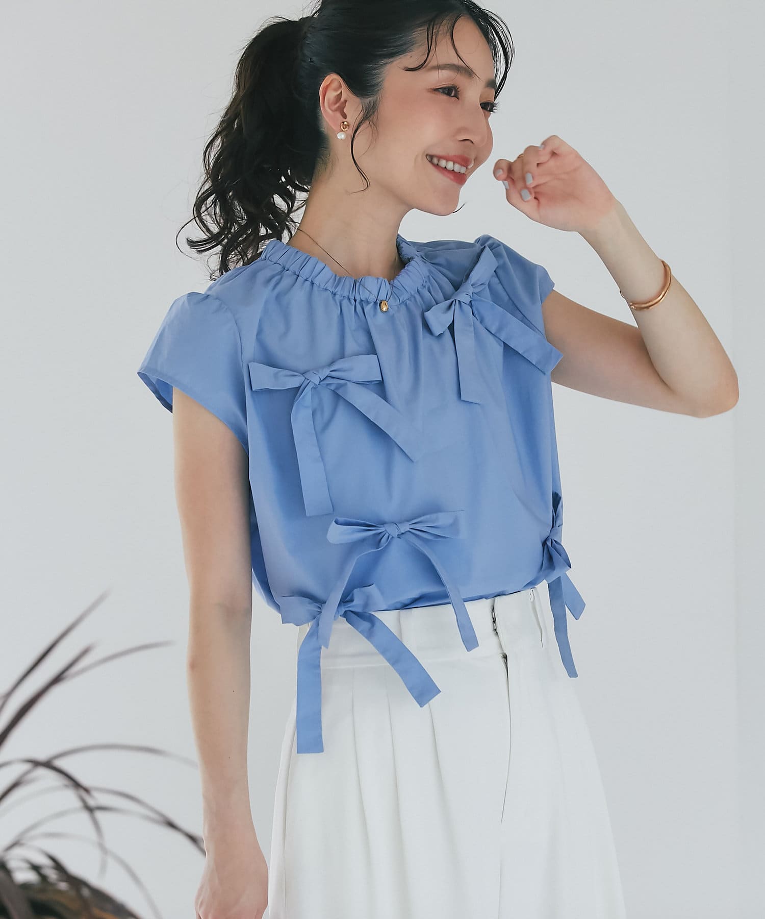 上品なシルエットのブラウスに甘めのリボンで、女性らしさをプラスしてくれます。