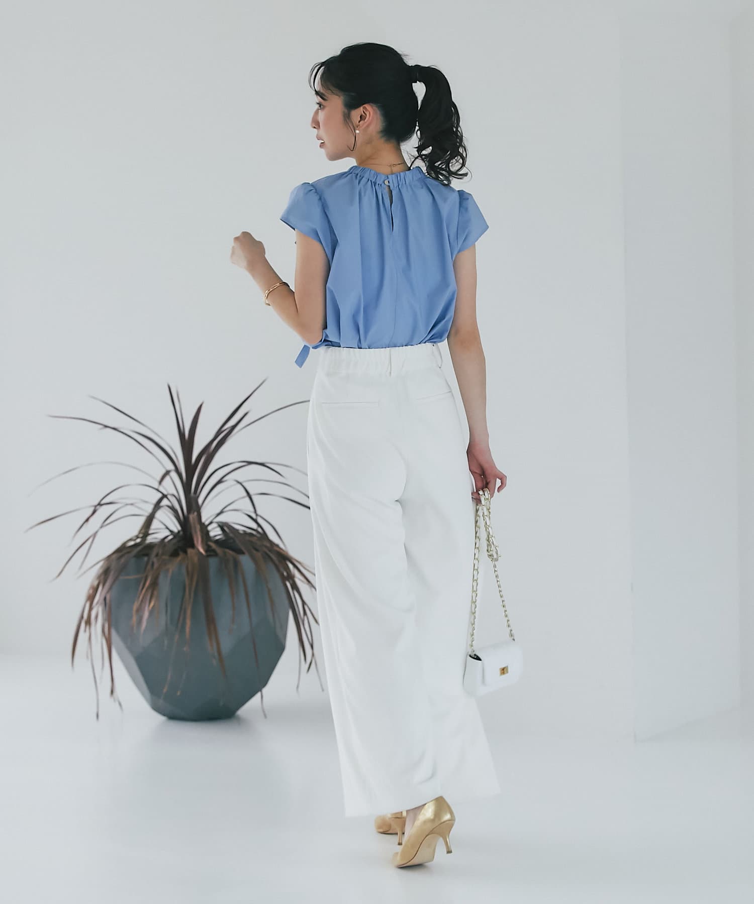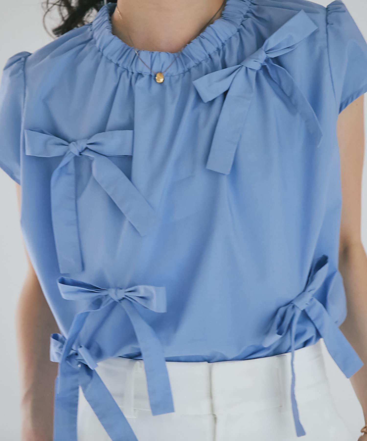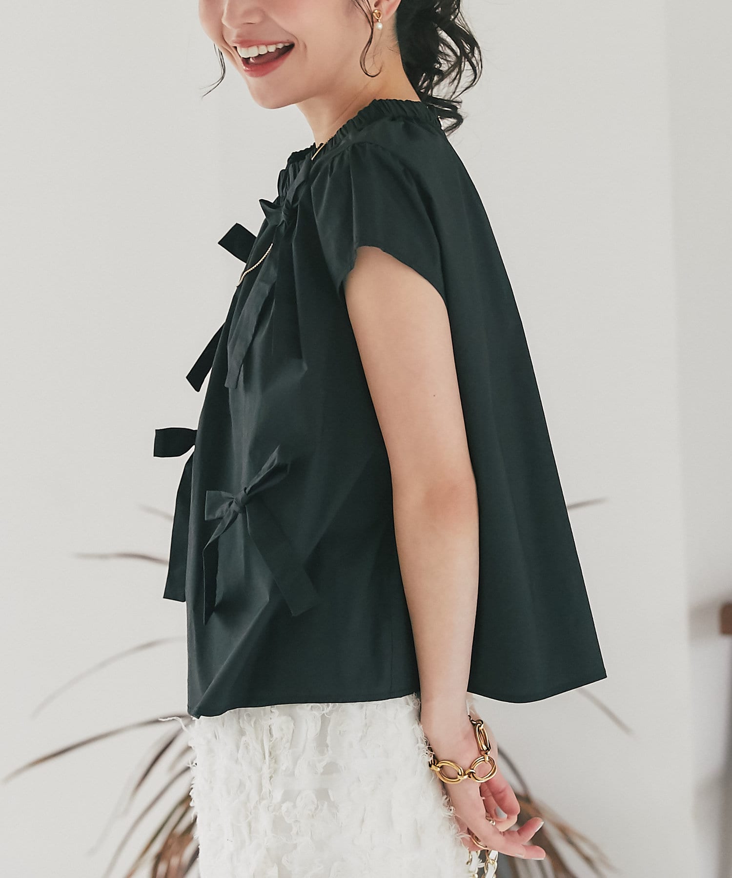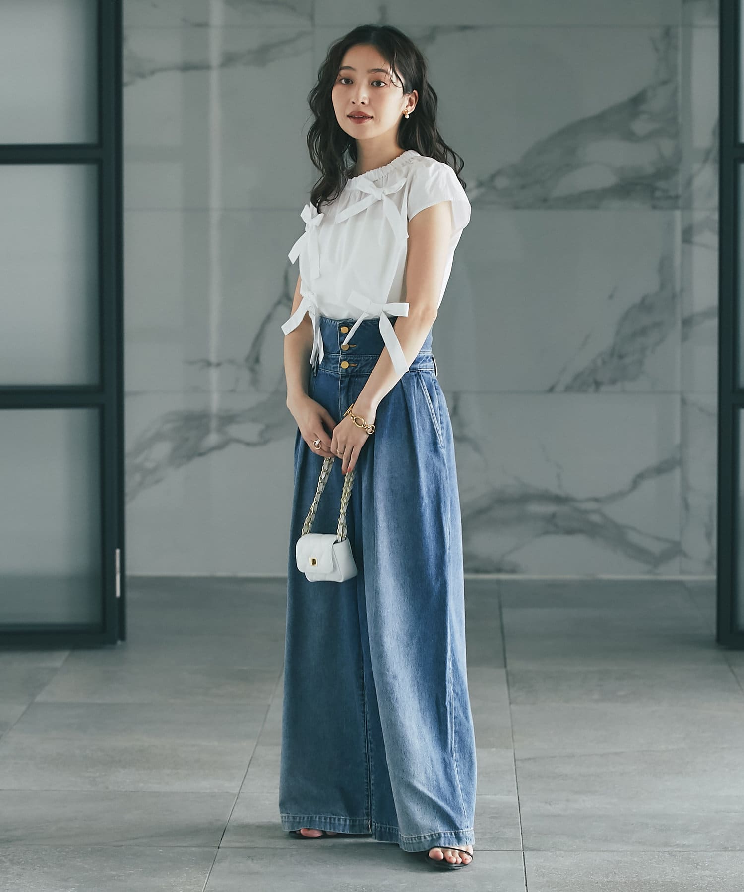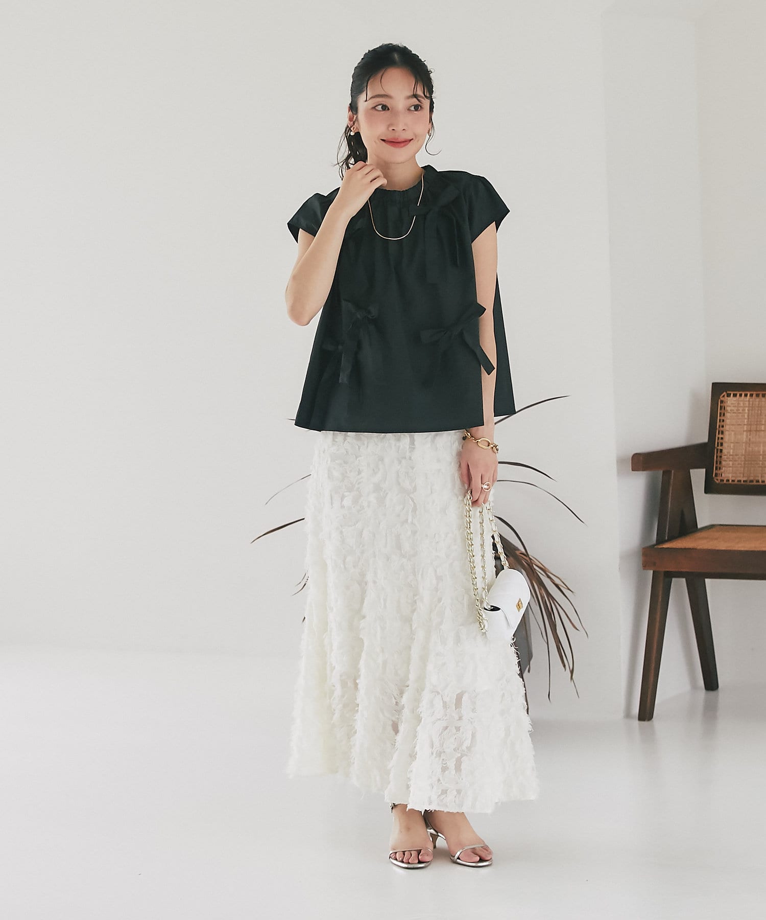 上品なシルエットのブラウスに甘めのリボンで、女性らしさをプラスしてくれます。