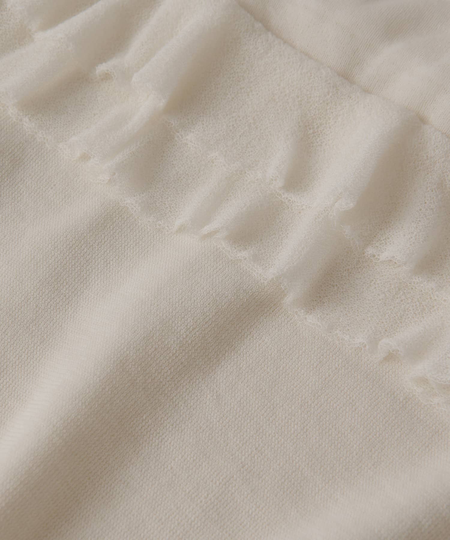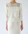 糸の本取りと編地を変えて透け感や、フリルを表現した、フェミニンな印象に仕上げたデザインニットです。