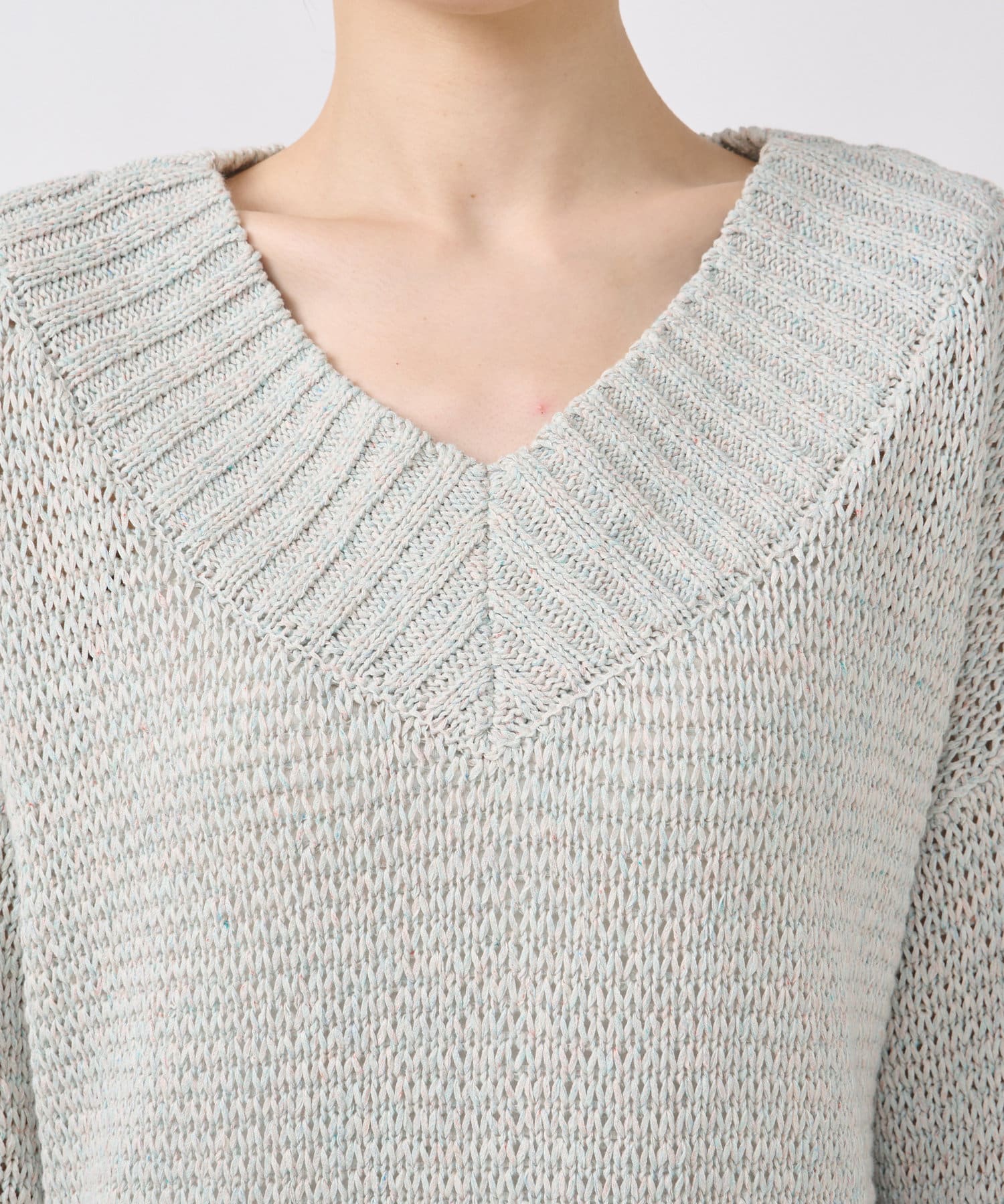 広めのVネックでデコルテを美しく演出し、ほどよい抜け感が女性らしさを引き立てます。