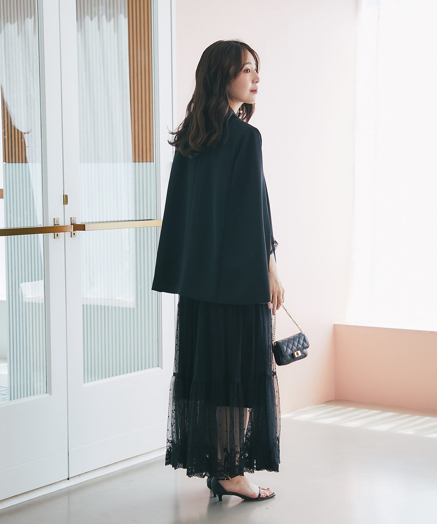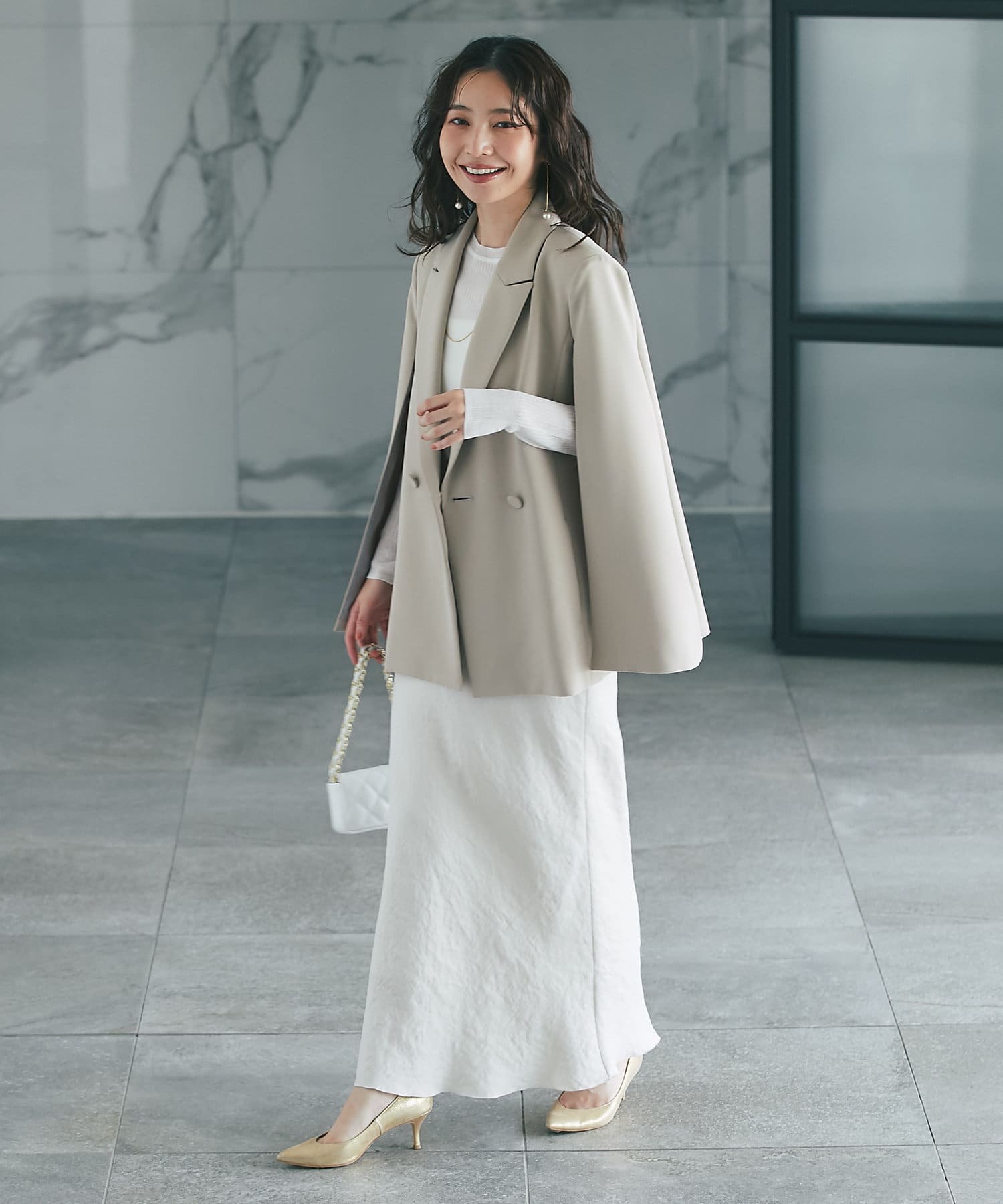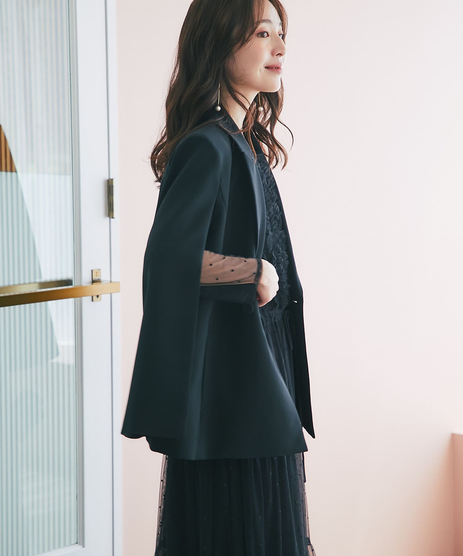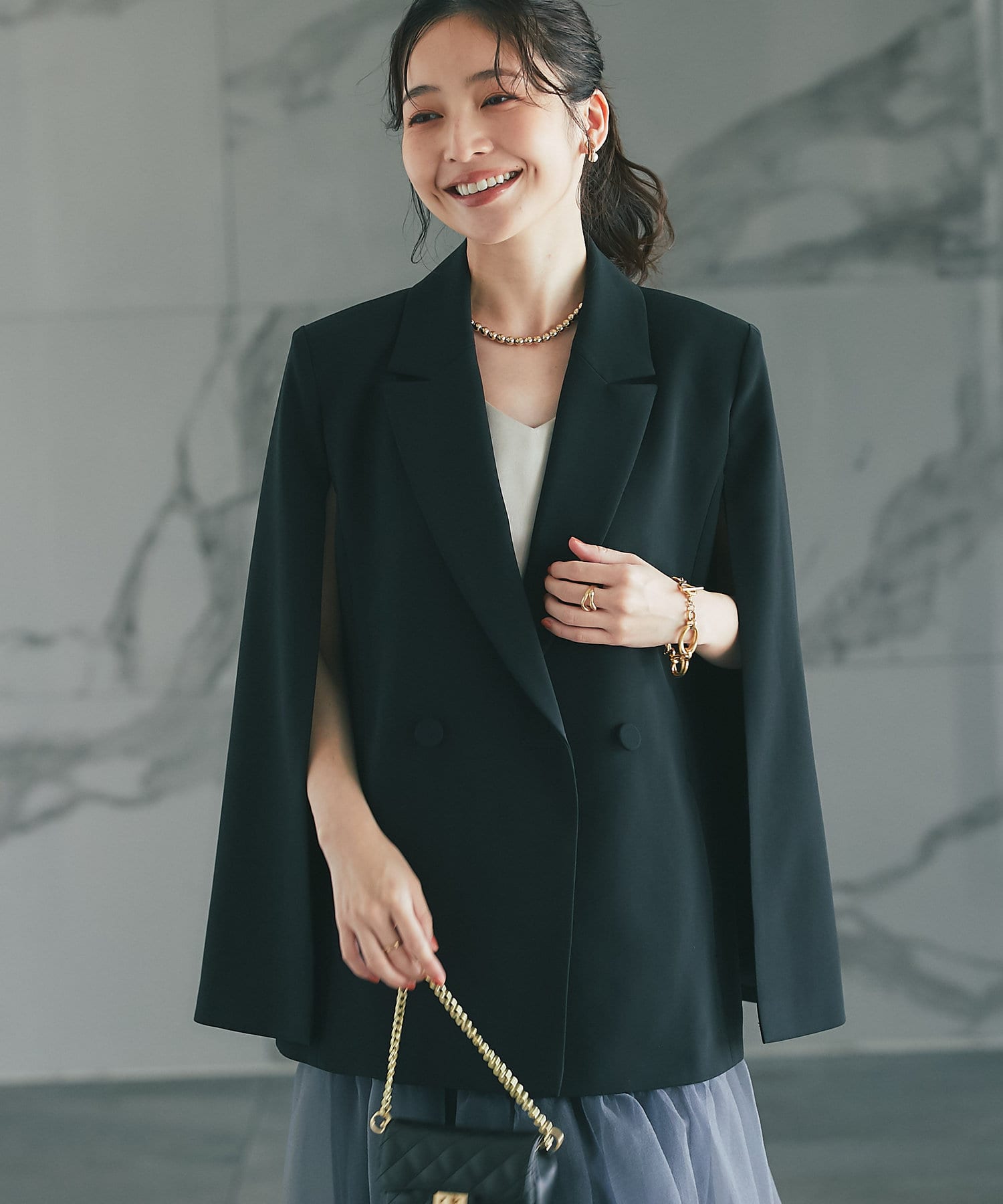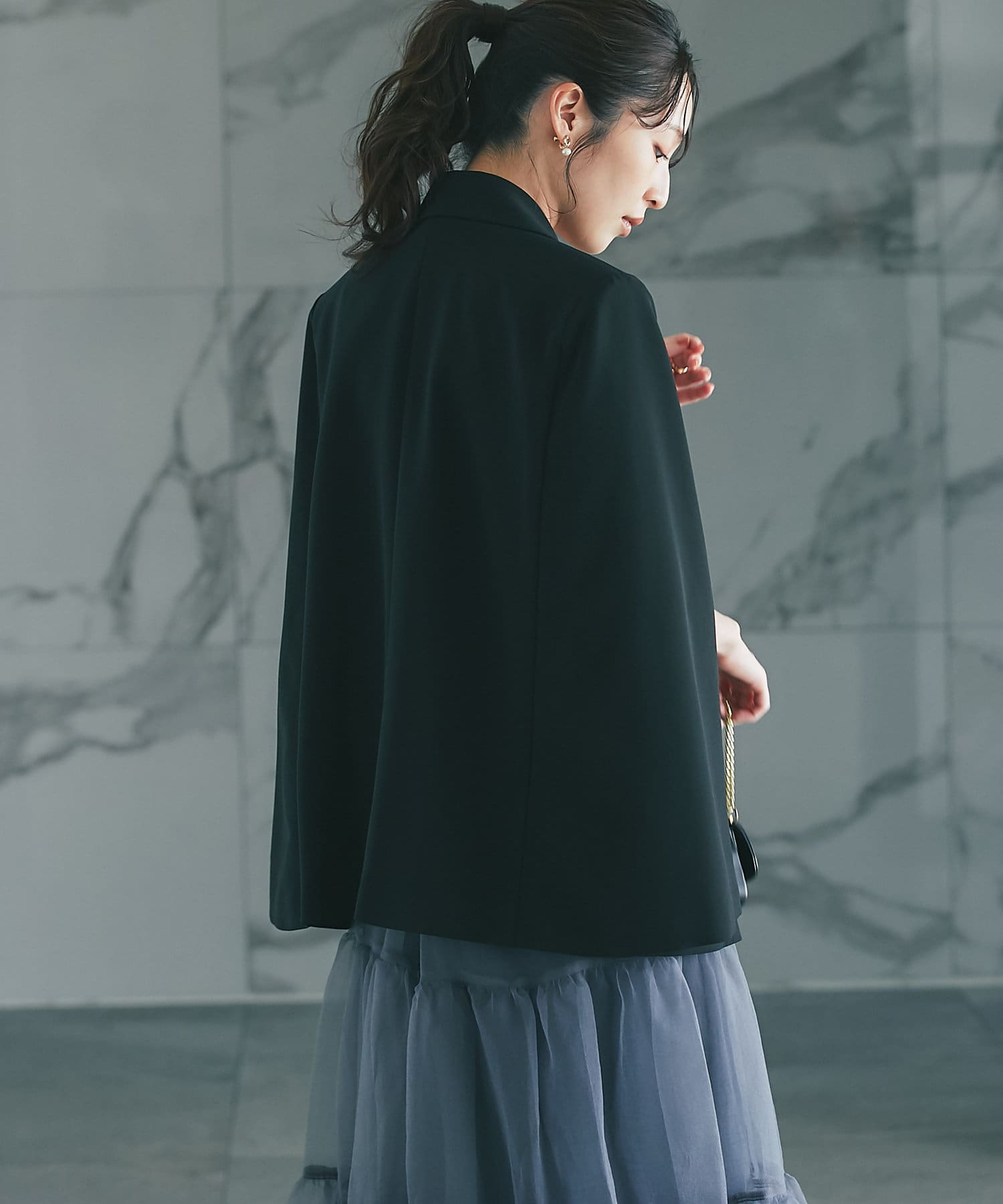 羽織るだけで上品なコーディネートになる、ケープ風デザインジャケット。