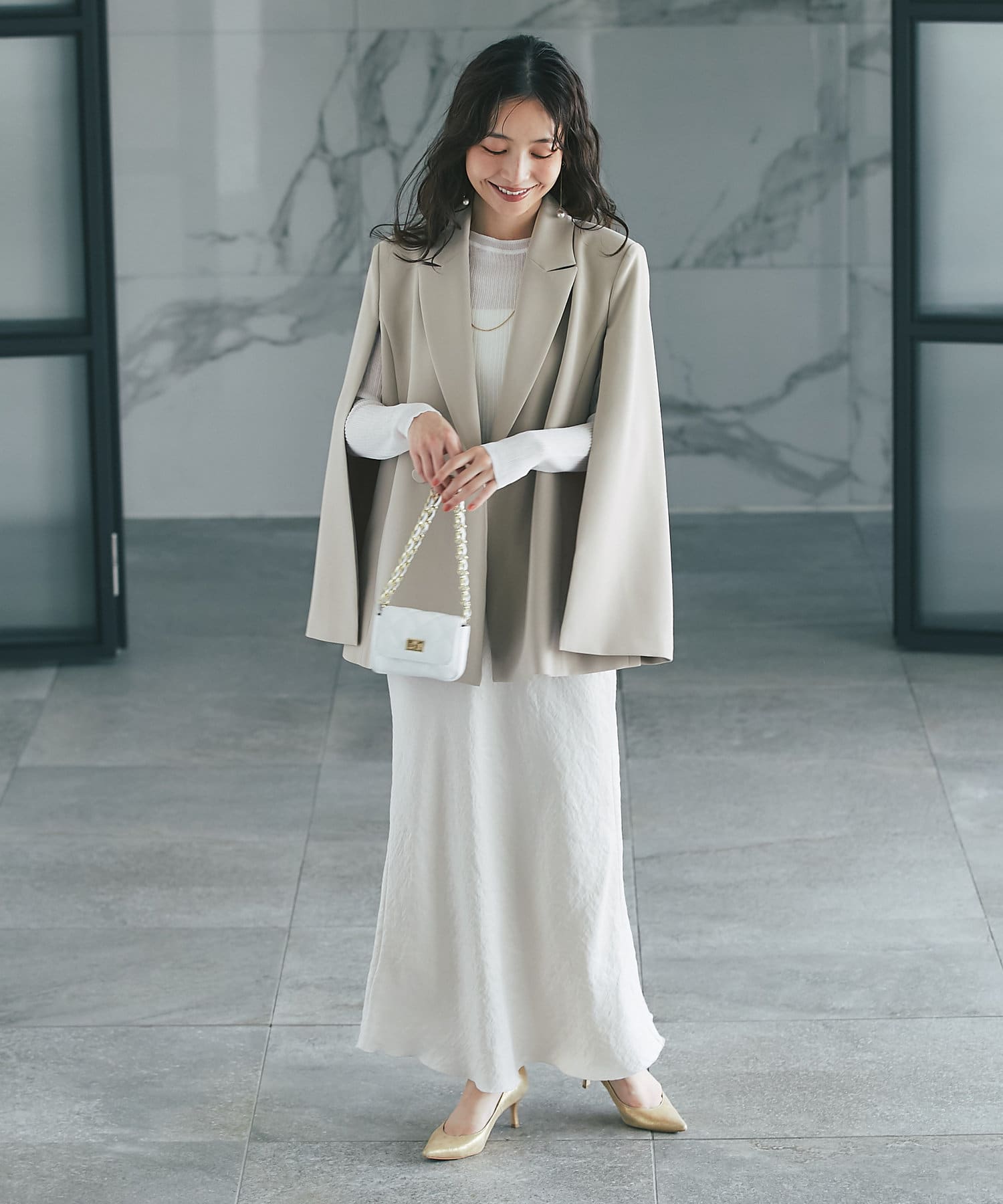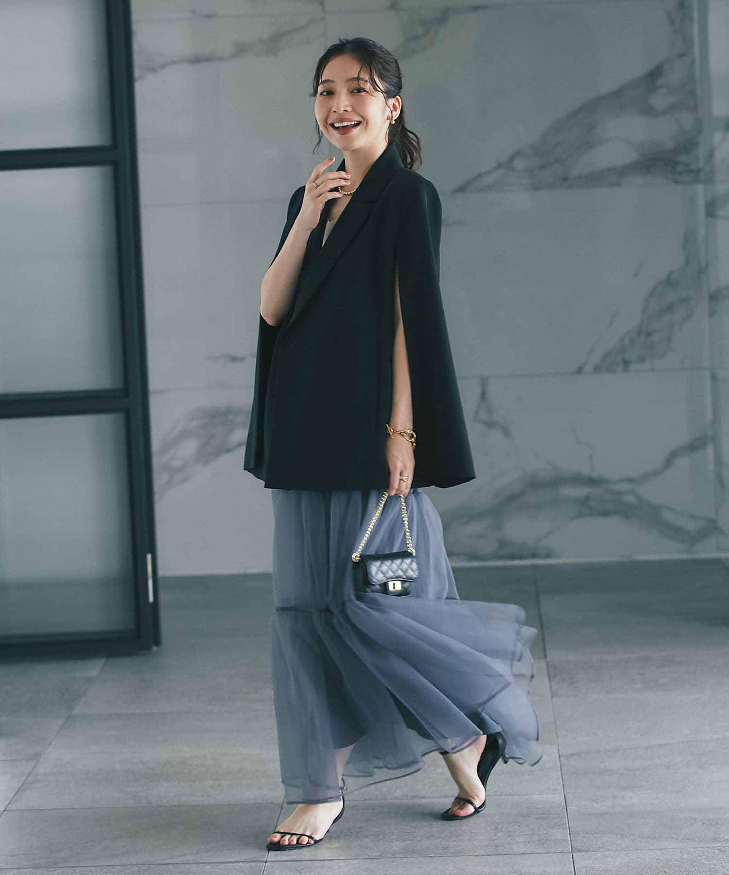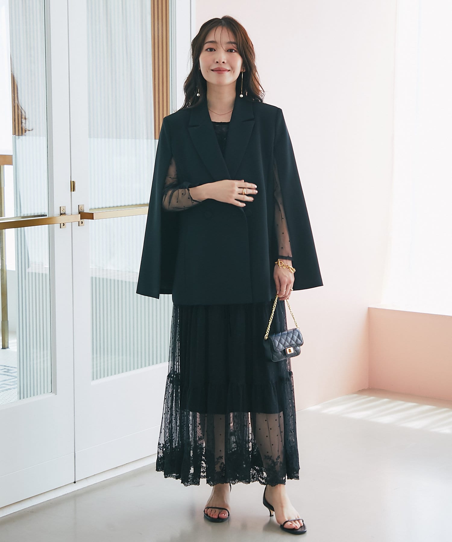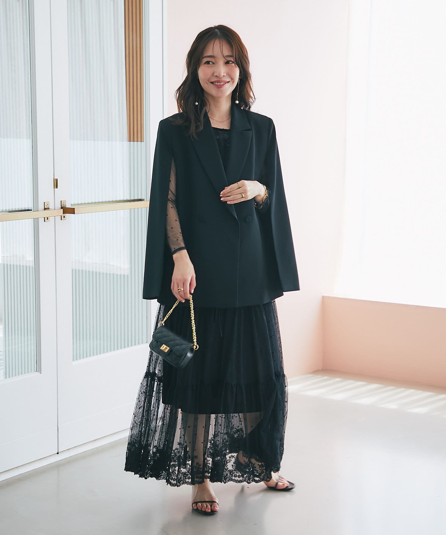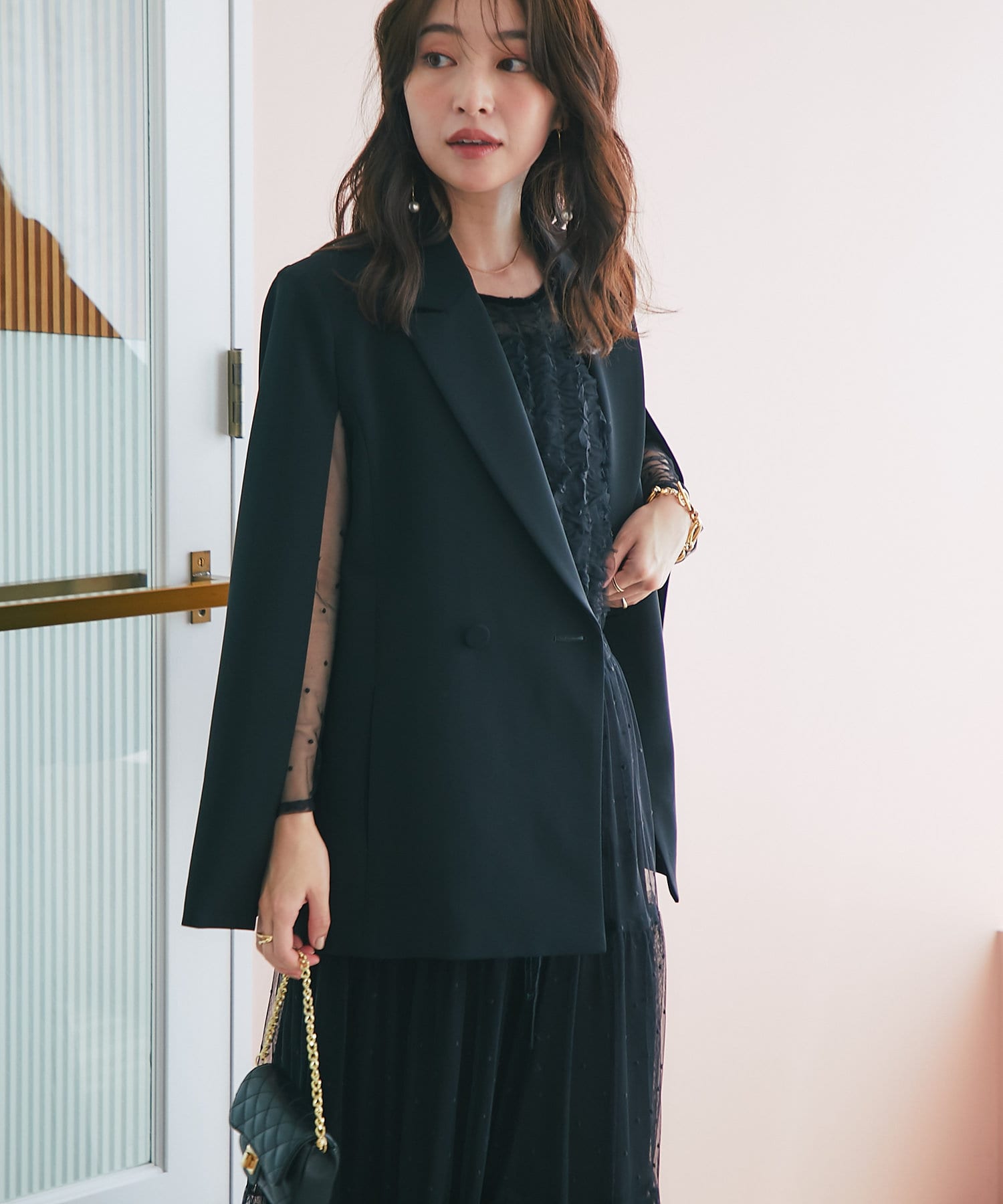 羽織るだけで上品なコーディネートになる、ケープ風デザインジャケット。