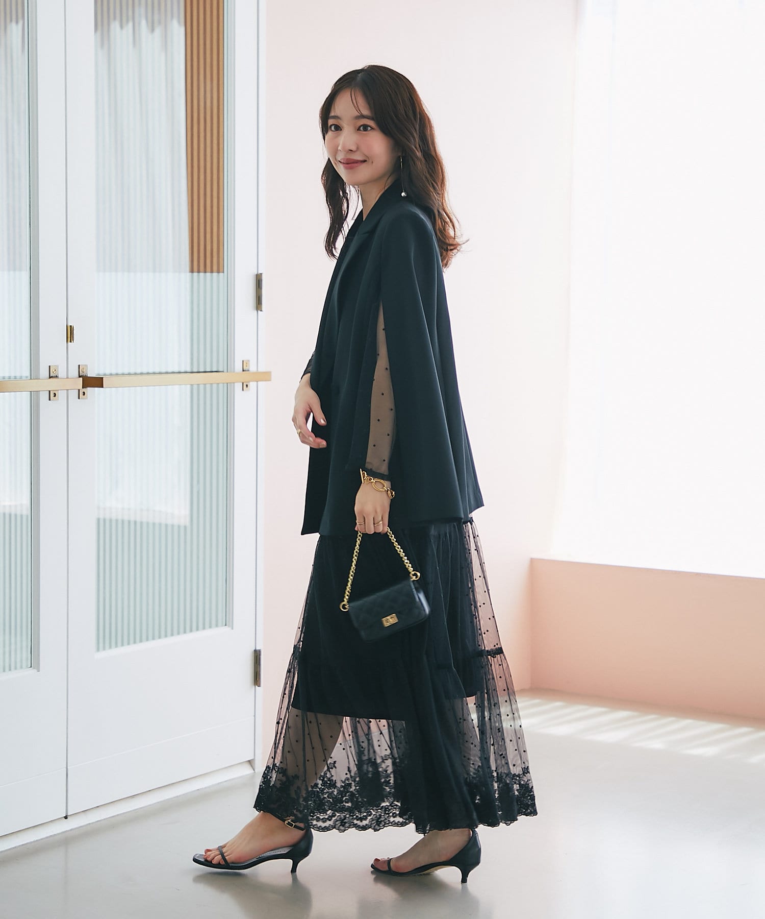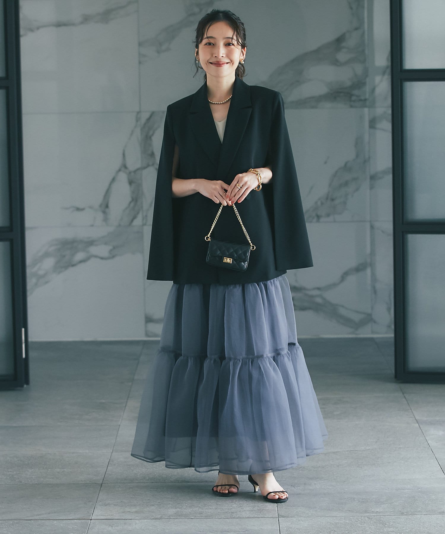 上品でモードな印象に着こなせ、1枚取り入れるだけでコーディネートの主役になり華やかさもプラスされます