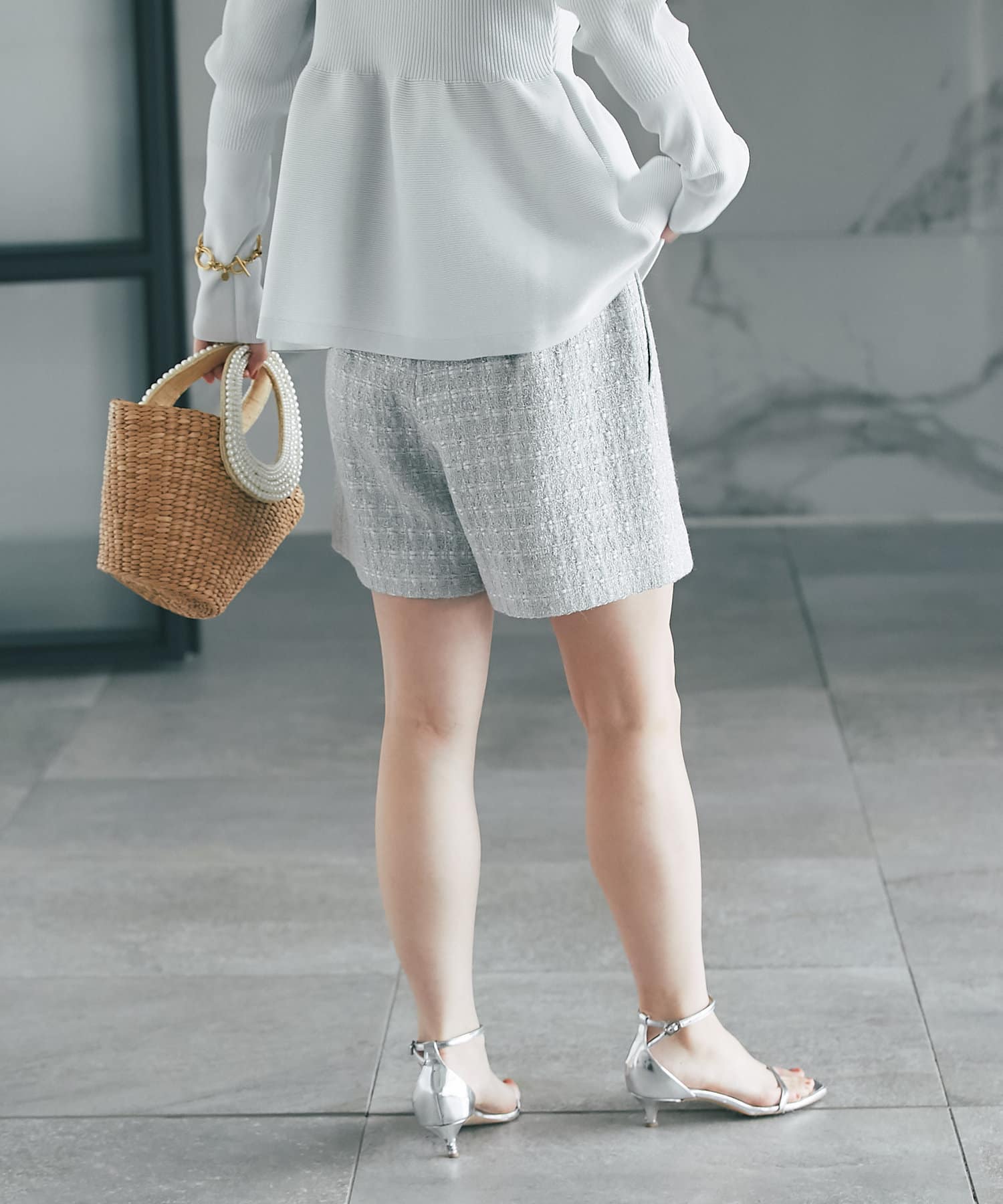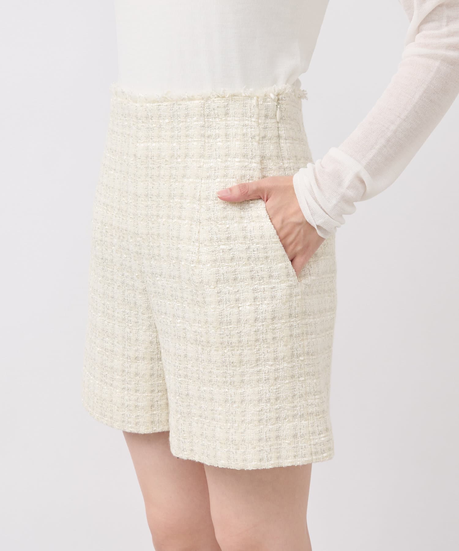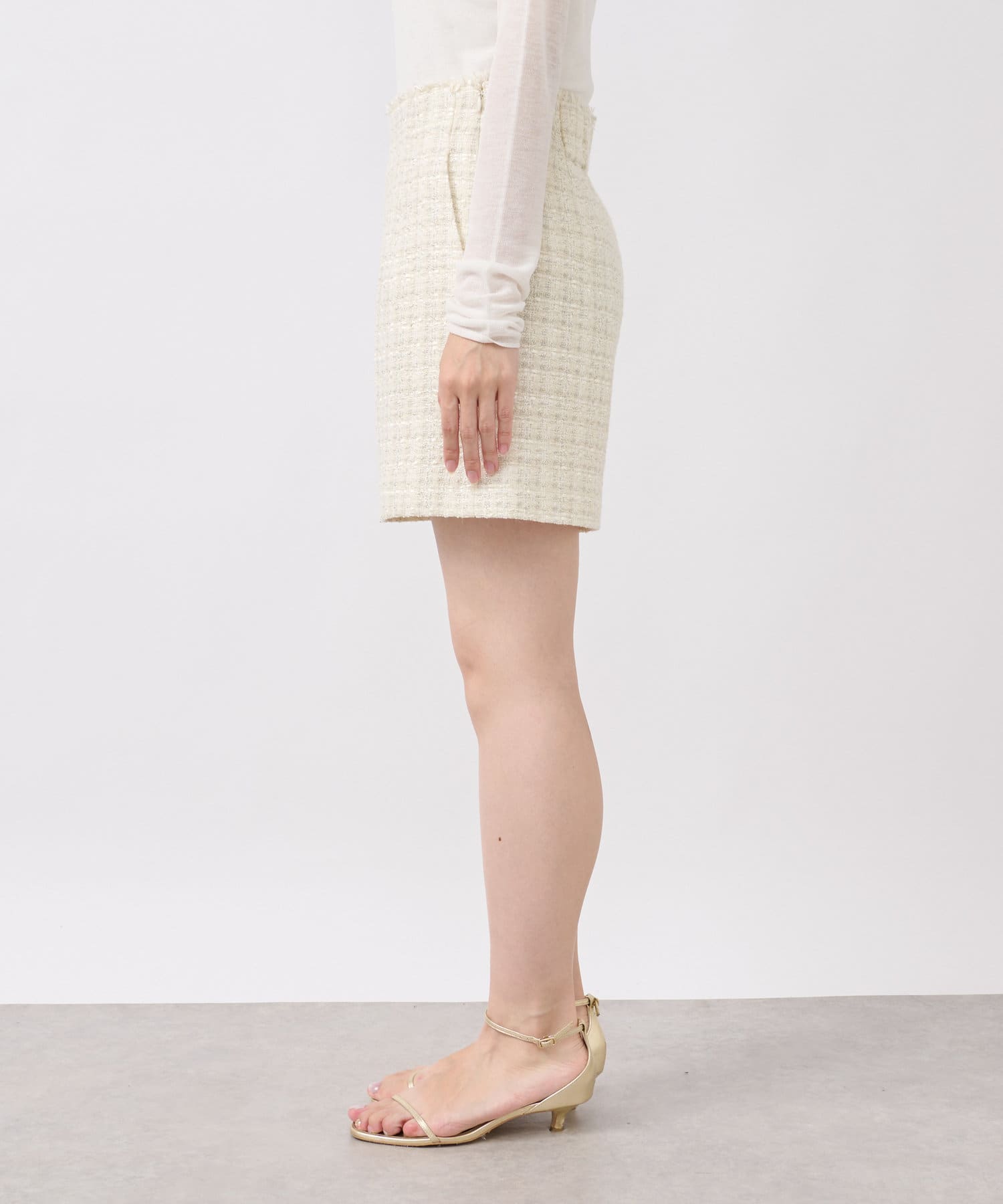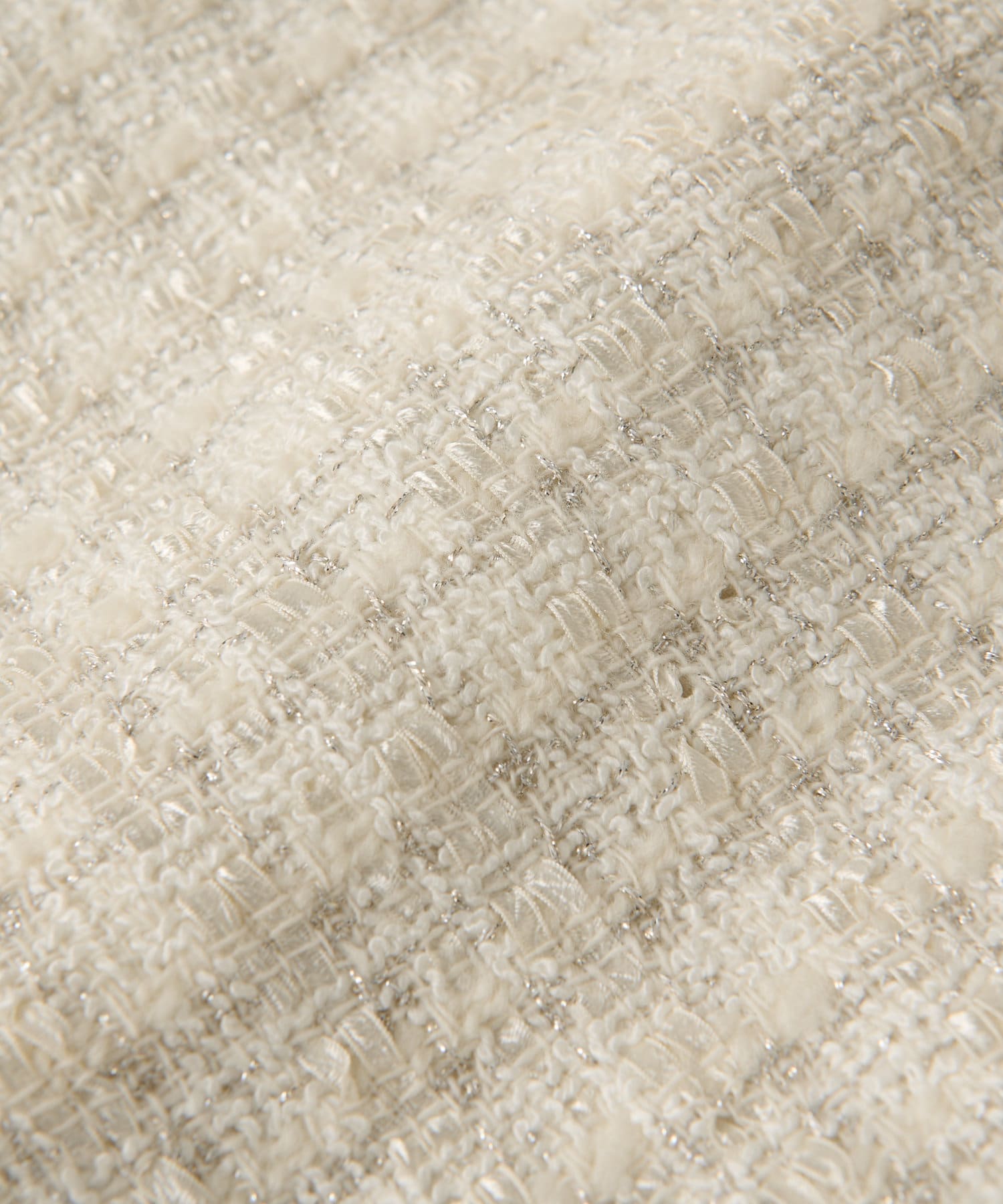 素材は国内の尾州で作ったファンシーツイードの生地を使用しており、ラメと衣装糸を使用した華やかなツイード生地です。