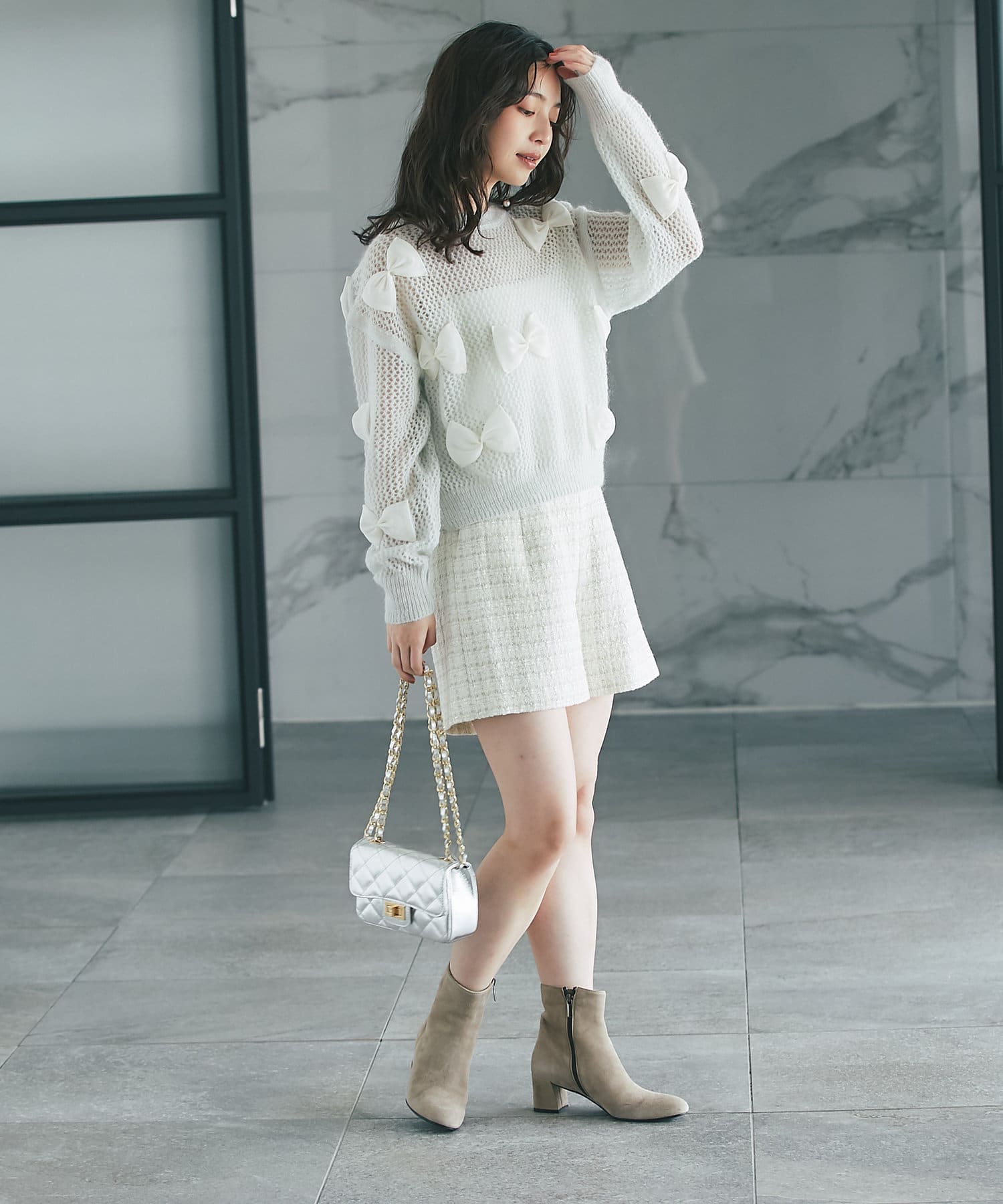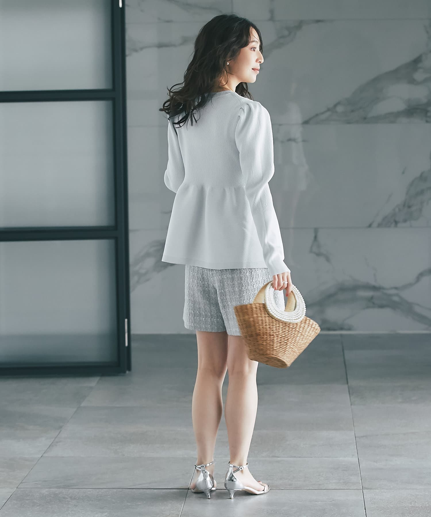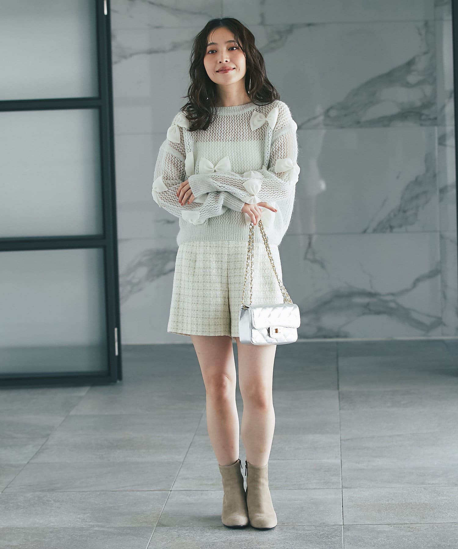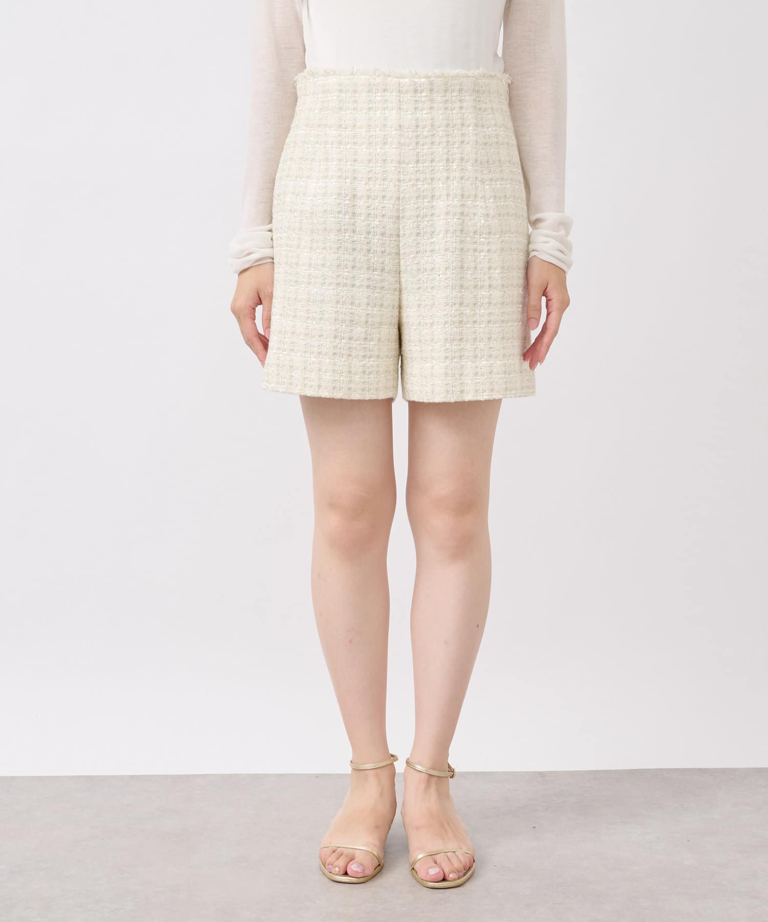 素材は国内の尾州で作ったファンシーツイードの生地を使用しており、ラメと衣装糸を使用した華やかなツイード生地です。