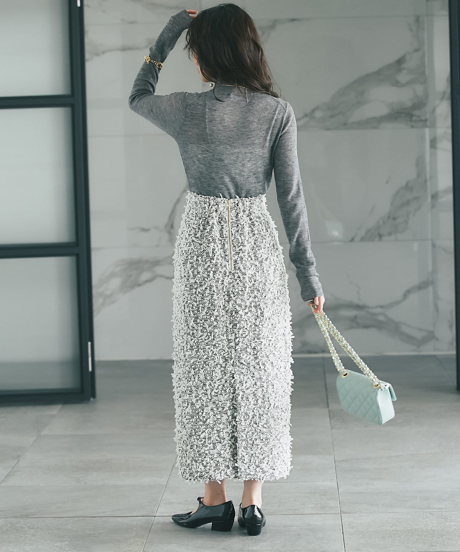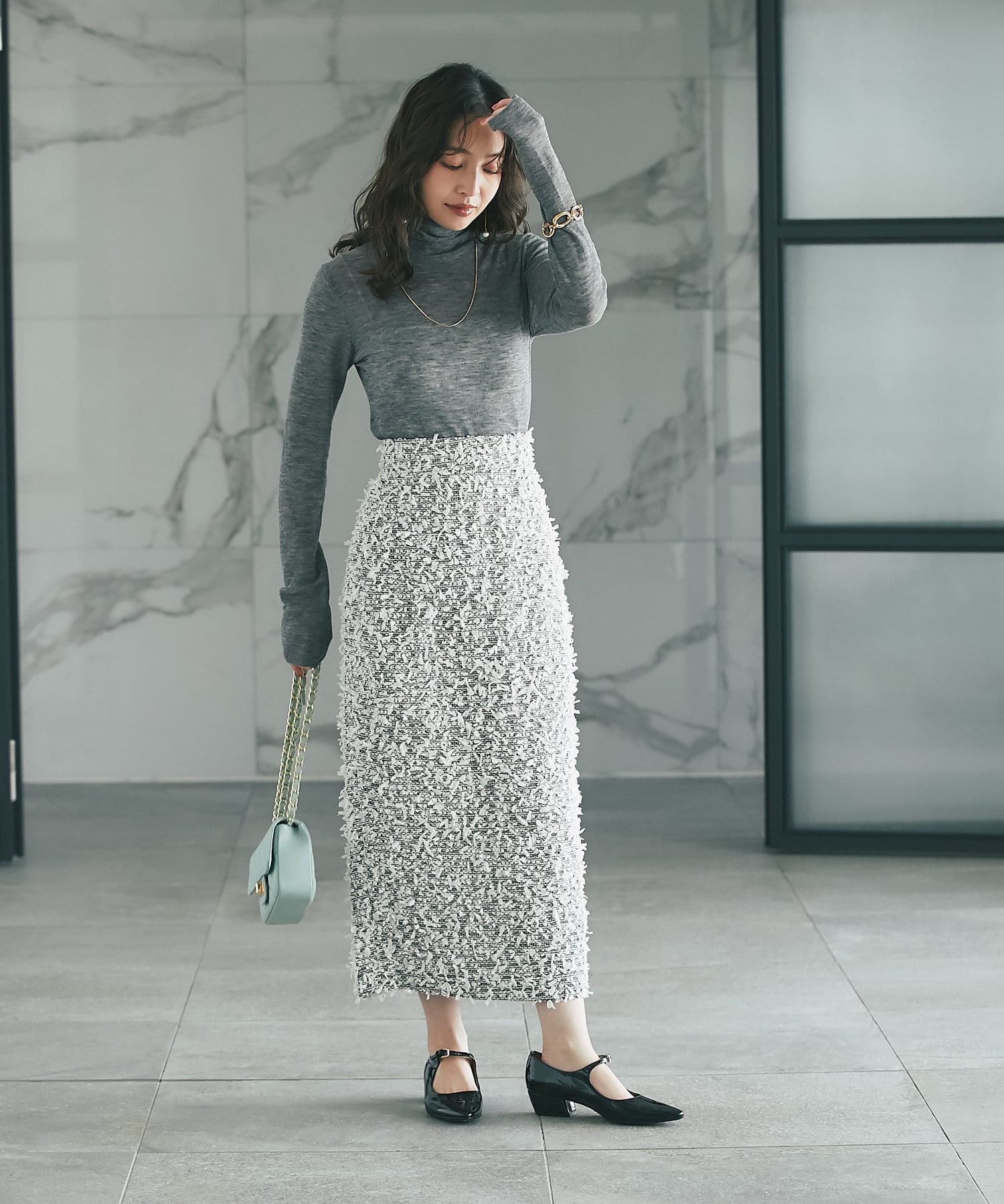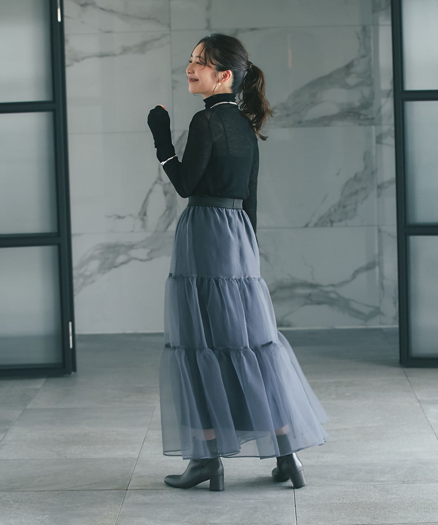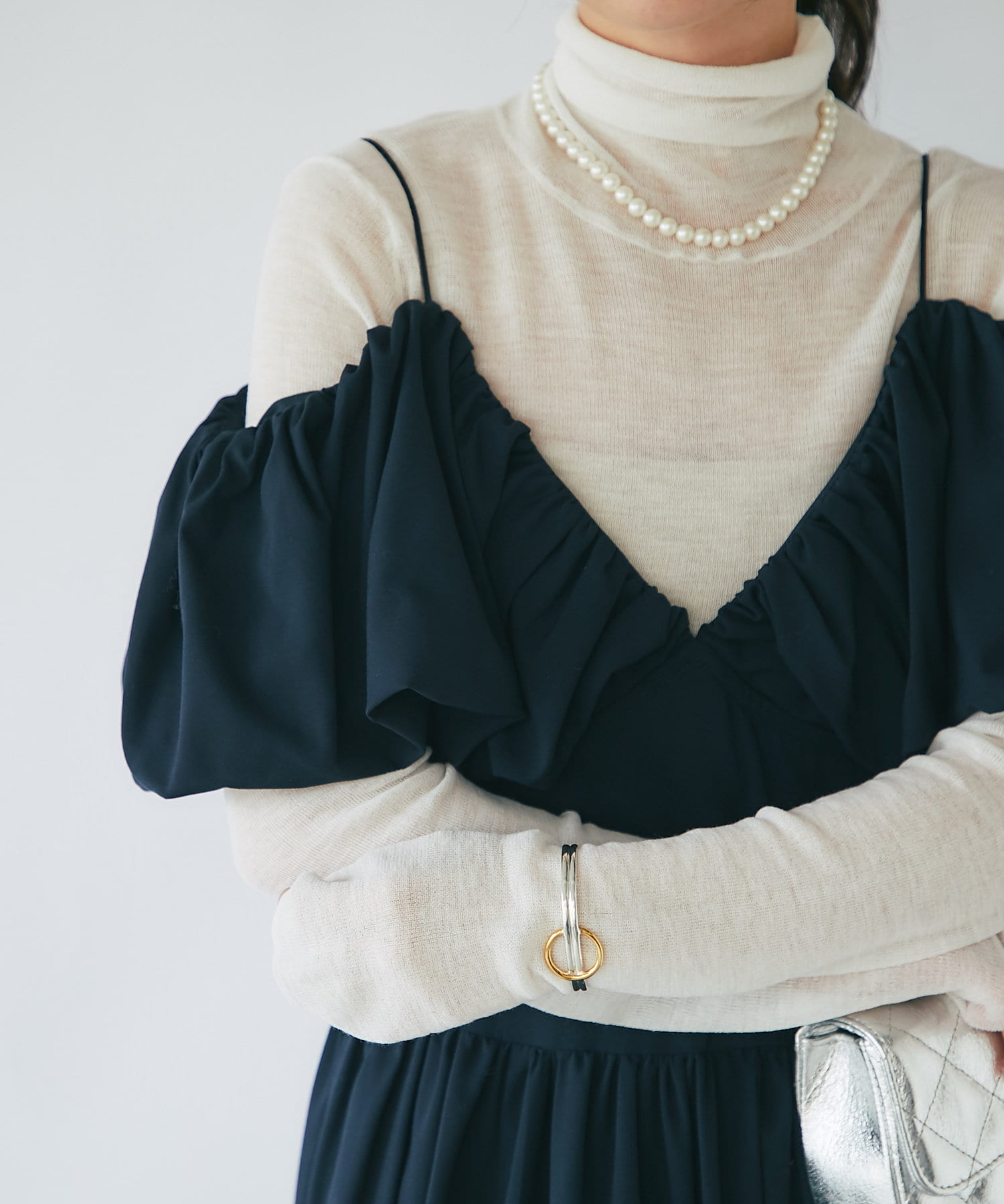 タイトでシアーな軽さがあるので1枚着としてボリュームのあるボトム合わせも相性よくきまります。